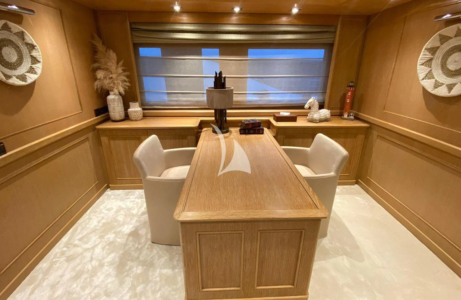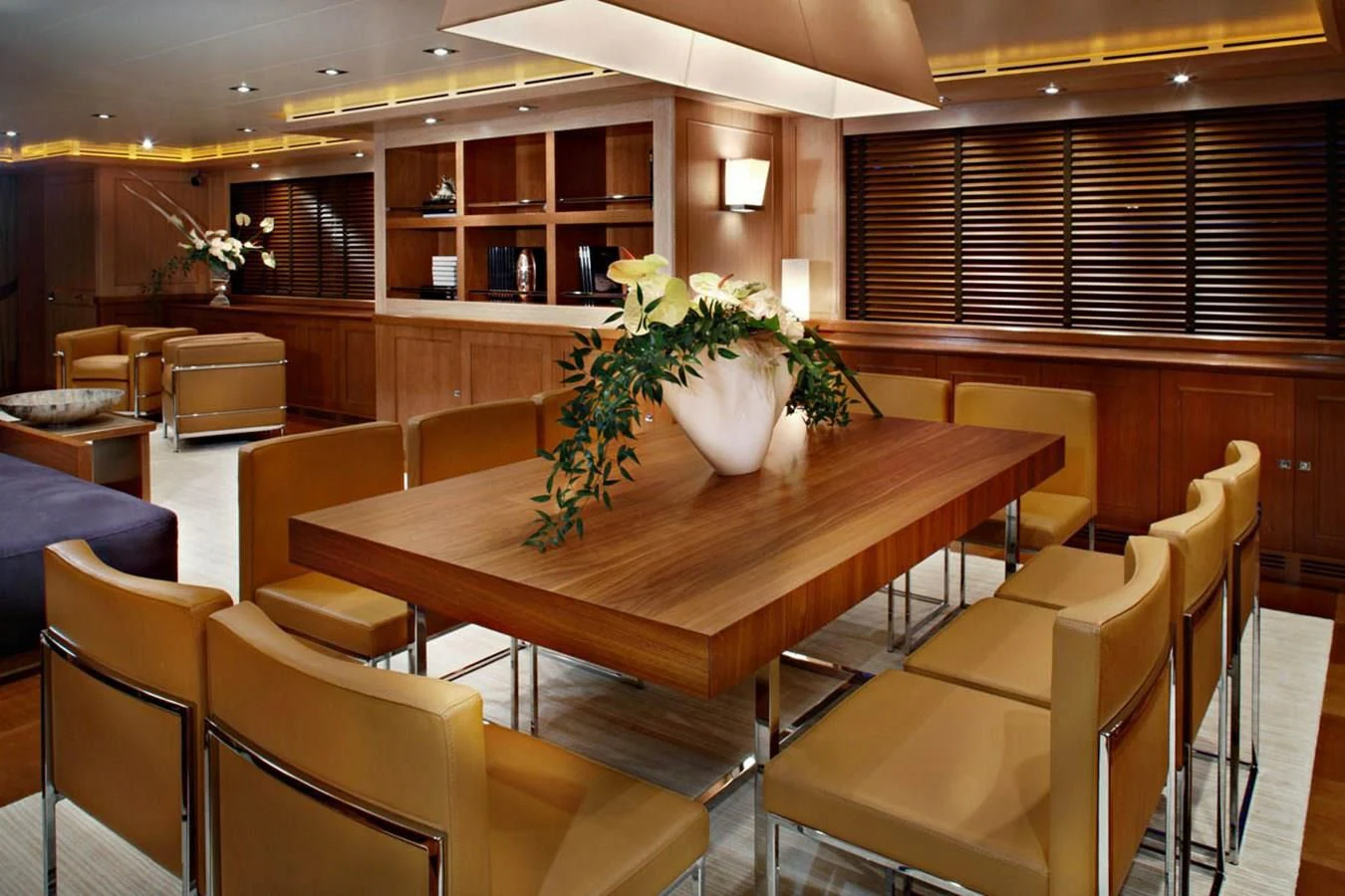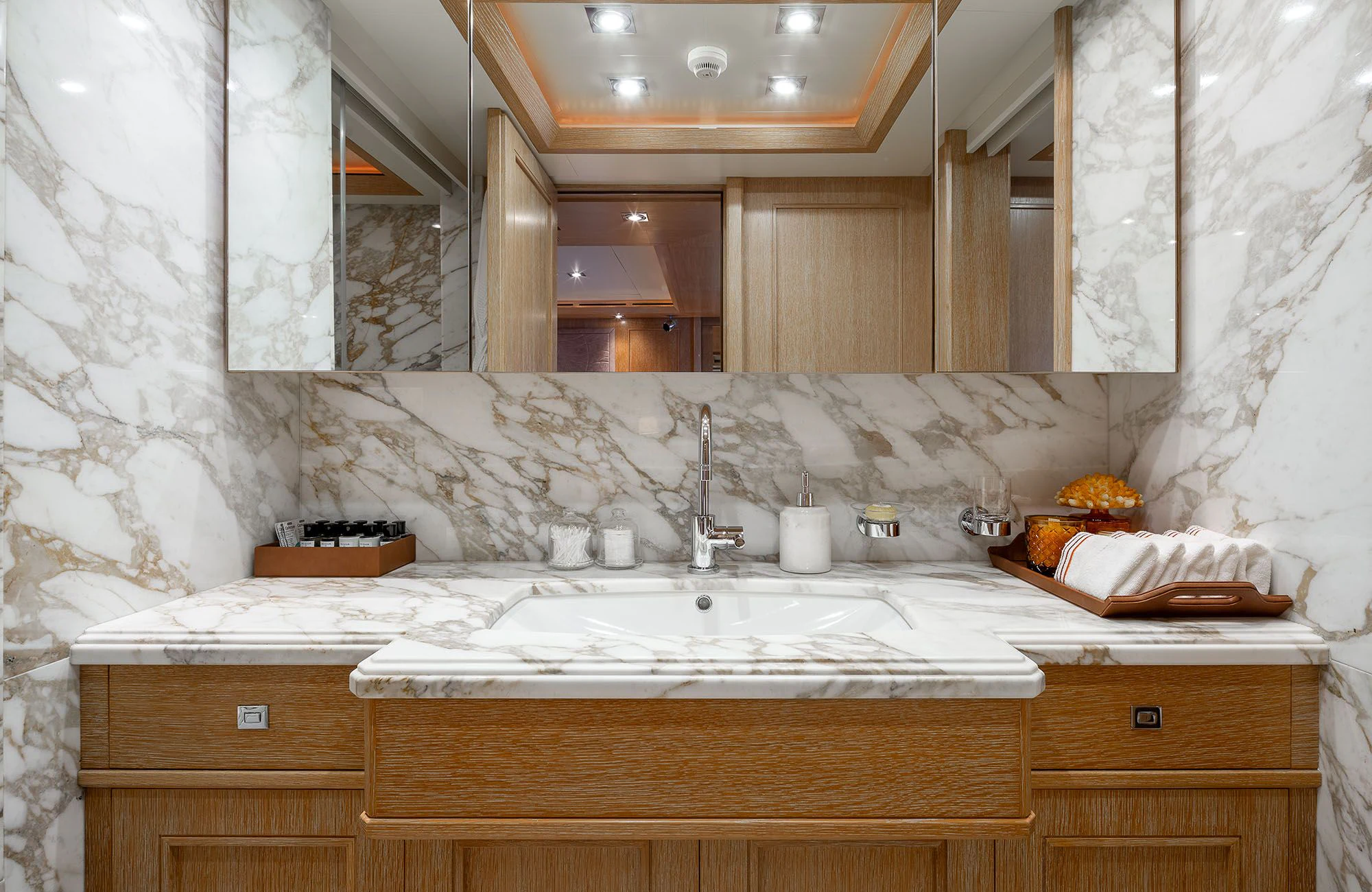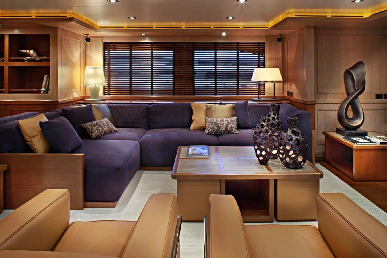 The interiors on LADY I are sophisticated and modern with a stylish art deco sensibility. Zuccon International Project made lavish use of warm-toned walnut paneling and cabinets, striped oak flooring, supple leather, cream marble and sleek metallic detailing throughout to create inviting spaces to relax, entertain, and socialize. The main salon is a stunning open-plan space with plenty of natural light from the surrounding panoramic windows. The aft doors open to a sumptuous lounge with gorgeous bucket armchairs and a deep-cushioned sofa in cream leather and shiny rose gold. There are stunning nested coffee tables topped in white marble with pink-hued veining making this an elegant and inviting space to sip cocktails and share conversation before dinner at the elegant dining table further forward. Seating 12 in beautiful art déco inspired chairs in rose gold and cream leather, this is the perfect spot for elaborate celebration dinners prepared by LADY I’s a talented chef. A more relaxed vibe can be found in LADY I’s stylish upper deck skylounge where there’s a sit-up bar for cocktails and nightcaps, a games table for cards and a huge sofa for nestling back and watching a movie on the widescreen TV.