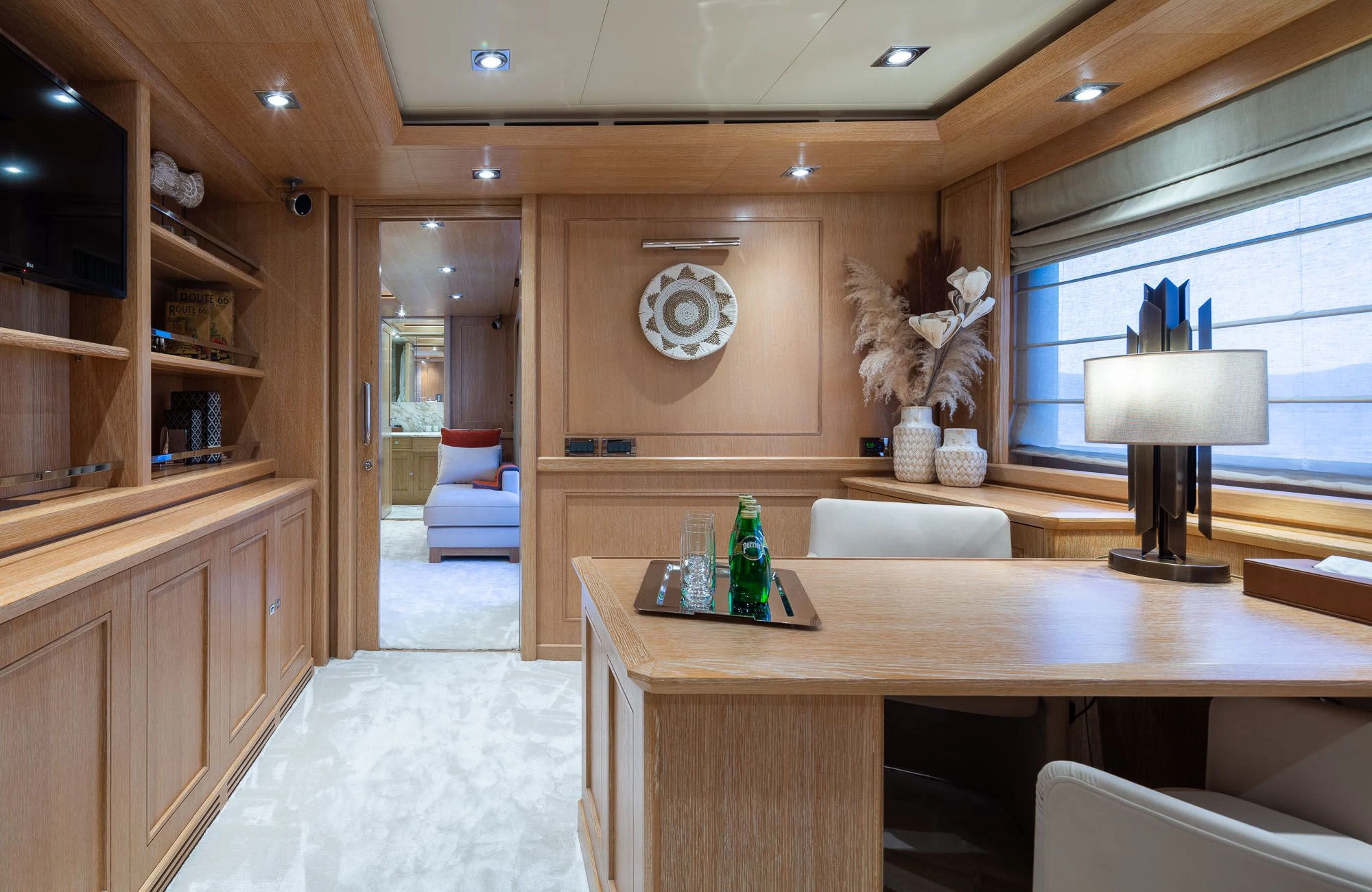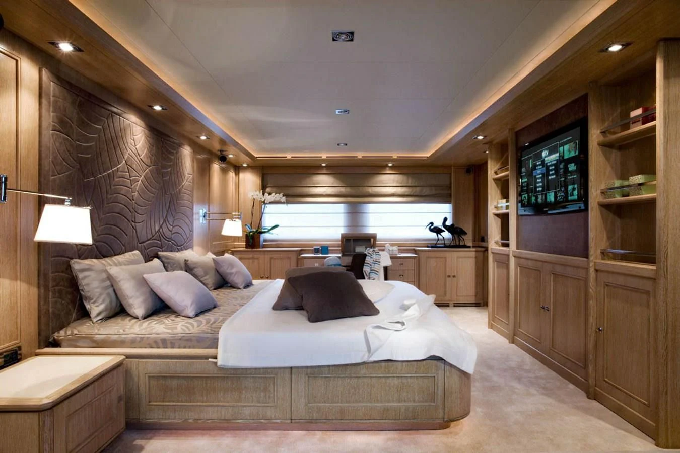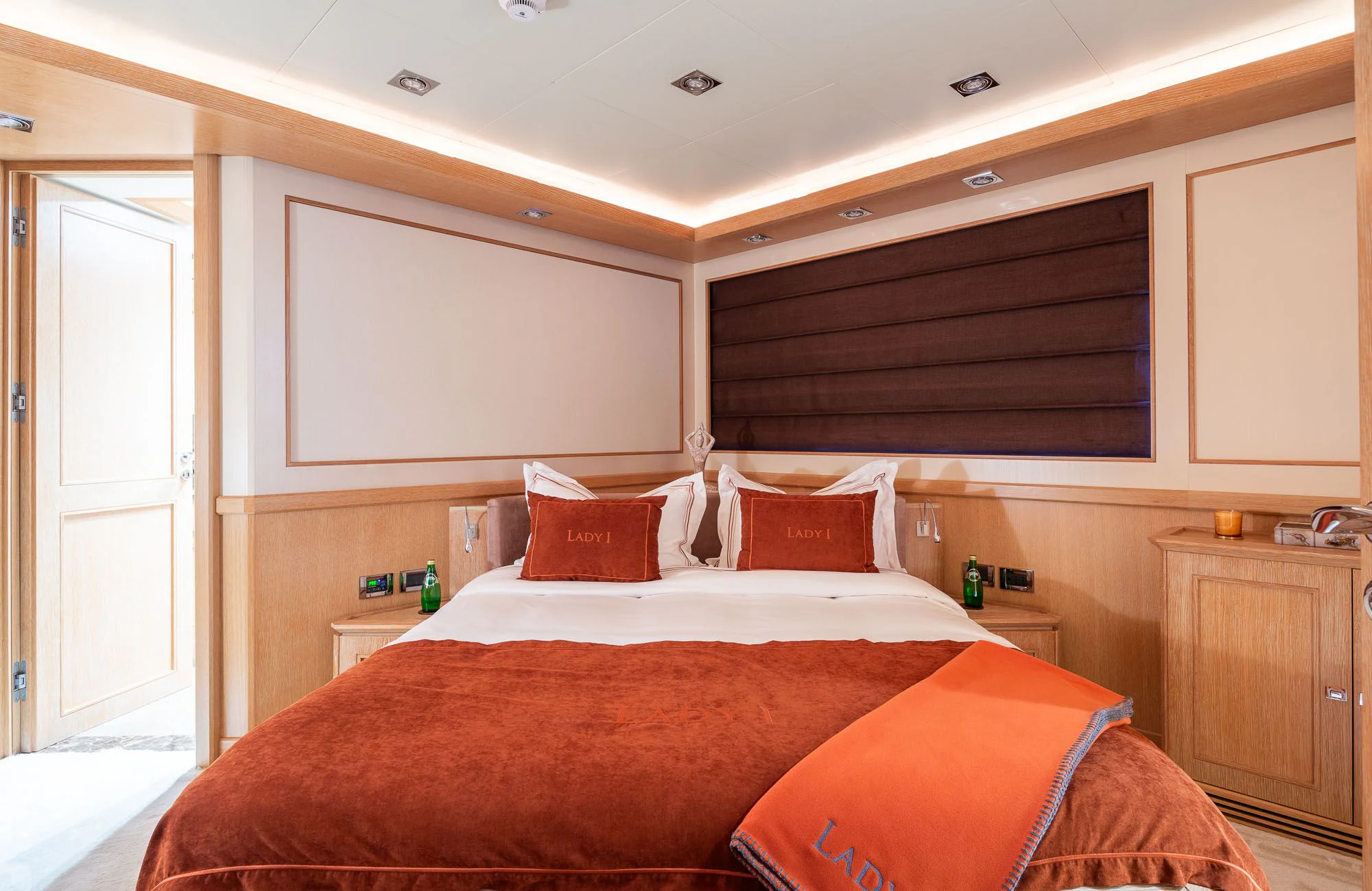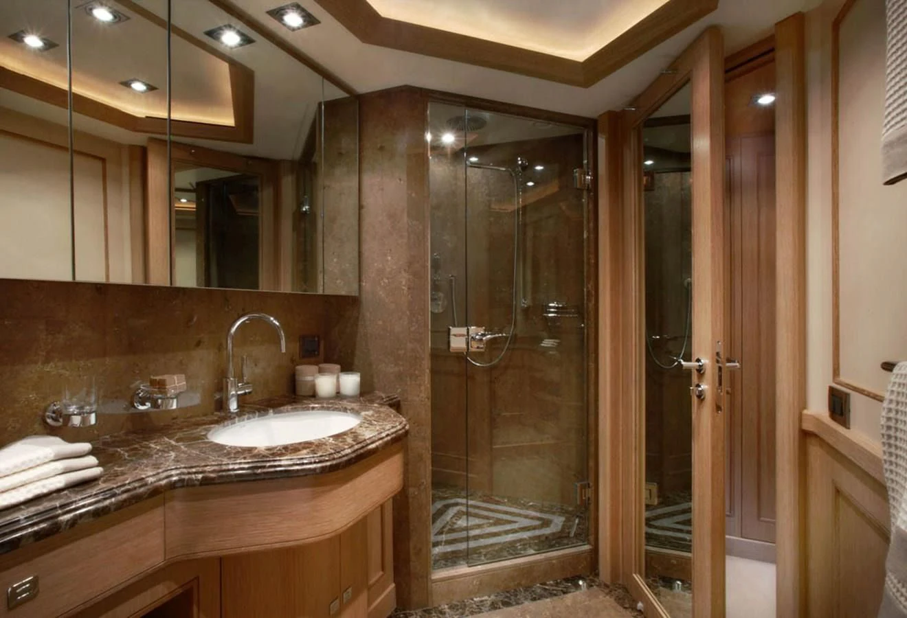 Ten lucky guests will find restful retreats in LADY I’s five spacious staterooms. The master suite spans the full beam and boasts spectacular views thanks to its main-deck location. There is an indulgent king size bed, a lounge area, walk-in dressing room, private office and a beautiful en-suite bathroom. There is also a private balcony ideal for intimate morning coffee or sunset moments with cocktails for two. On the lower deck, there are two mirror-image VIP staterooms with queen-size beds, and two cabins with side-by-side single beds that con be converted to doubles should the need arise. Each stateroom boasts a large en-suite bathroom and access to LADY I’s impressive entertainment system.