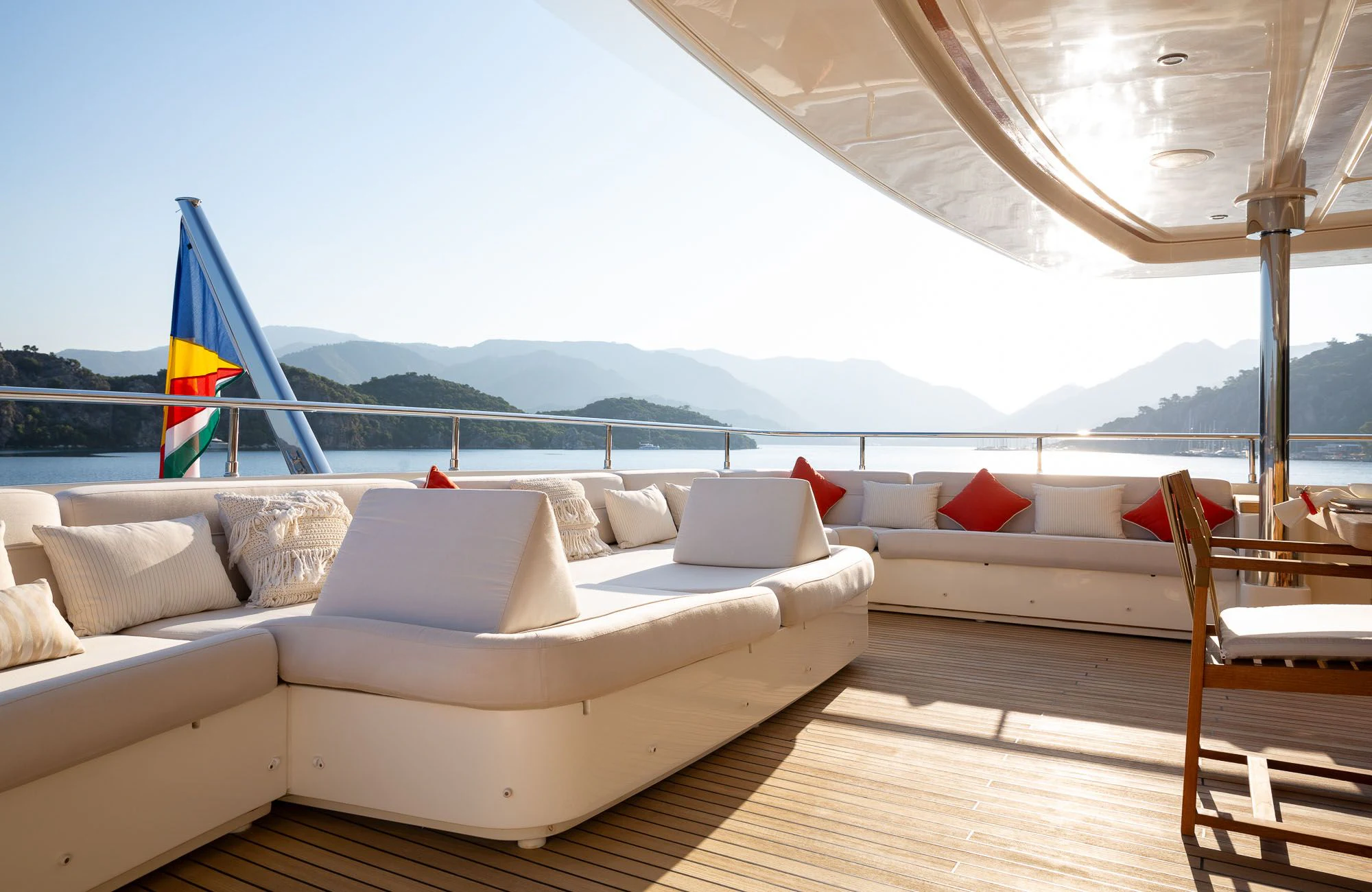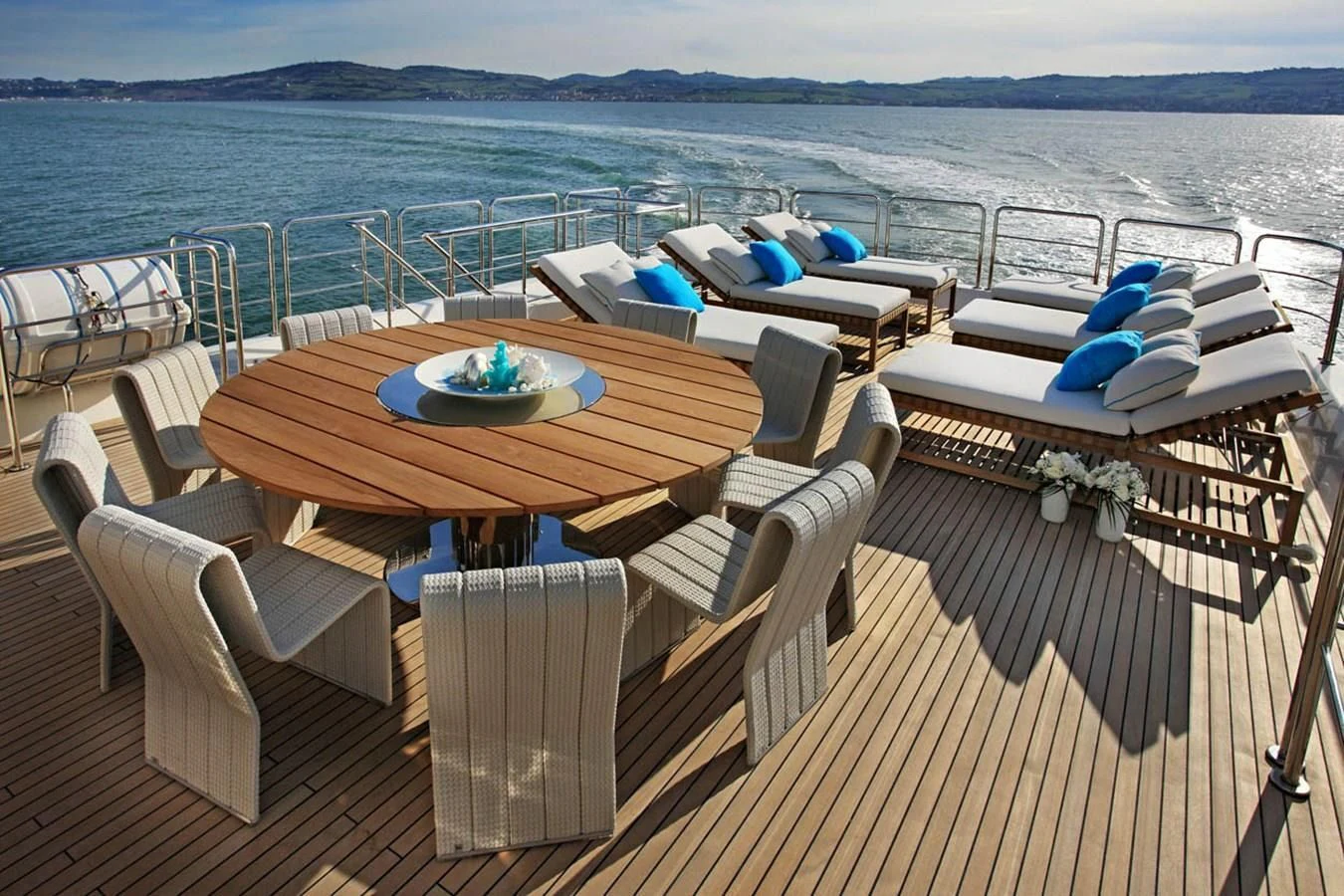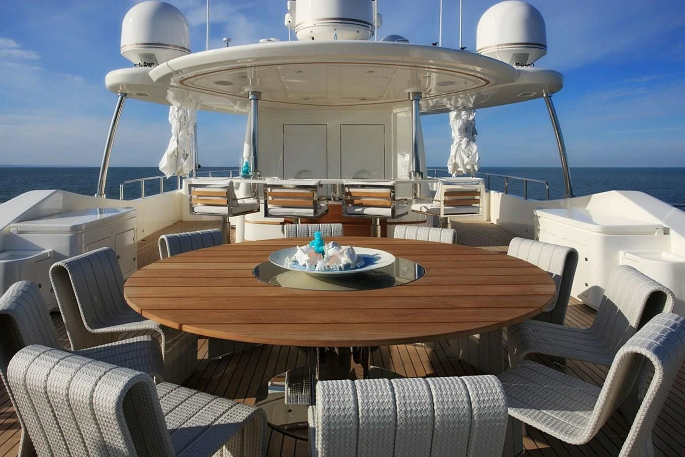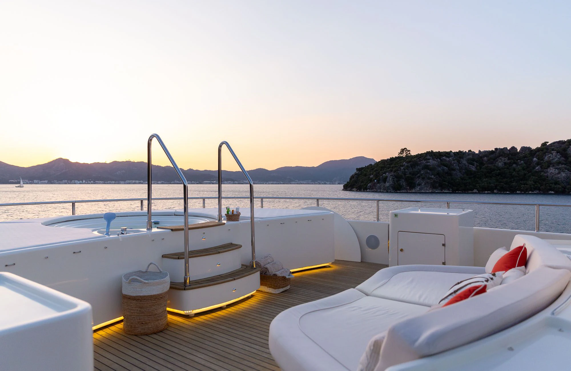 The theme of relaxed glamor is carried across LADY I’s expansive decks where there is a myriad of spots for soaking in the sun and stunning scenery of her popular cruising grounds. The main deck features a specially-designed lounge area that encourages guests to indulge in scenic comfort on the uniquely-shaped sofa—ideal for morning coffee but large enough for some afternoon sunbathing too. The upper deck offers further space for lounging and relaxing in the sun or under the stars, as well as shaded alfresco dining with room enough for her full complement of guests at the handsome teak table. LADY I’s expansive sundeck certainly lives up to its name with a sea of moveable sun loungers and a large Jacvuzzi surrounded by sun pads for bronzing or drying off after a relaxing soak. A large circular dining table, barbecue and fabulous sit-up bar make this the go-to spot for amazing sunset soirees and dining under starry night skies. The space can be left fully exposed to the rays or shaded by moveable umbrellas.