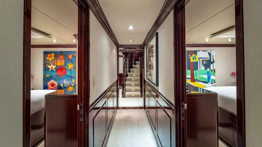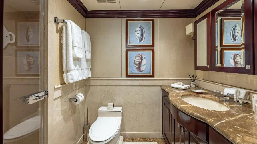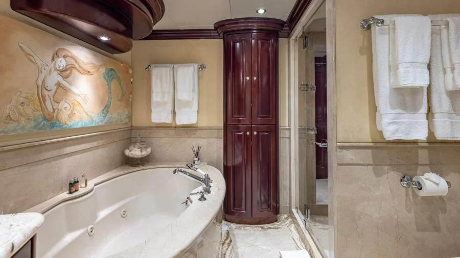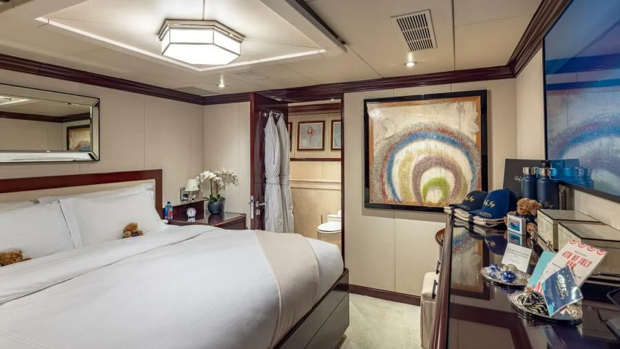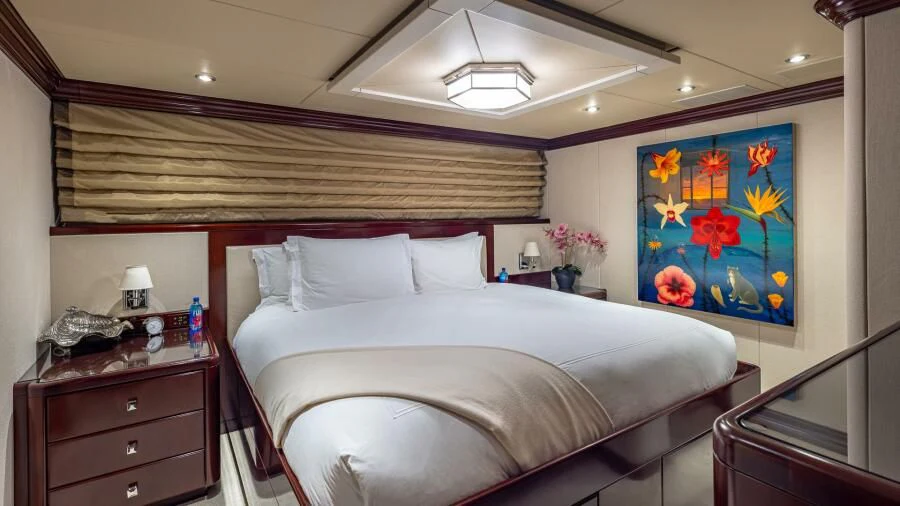 LADY JOY sleeps 12 guests in six cabins. Her master suite, with king-size bed and en-suite his-and-hers bath with separate tub and shower, has a comfortable seating area, walk-in closet and private office. Five additional staterooms with en-suite bath can be found on the lower deck. These include three suites with king-size beds, two versatile suites each with a full-size twins and a Pullman berth.