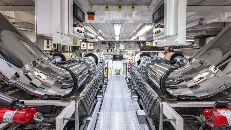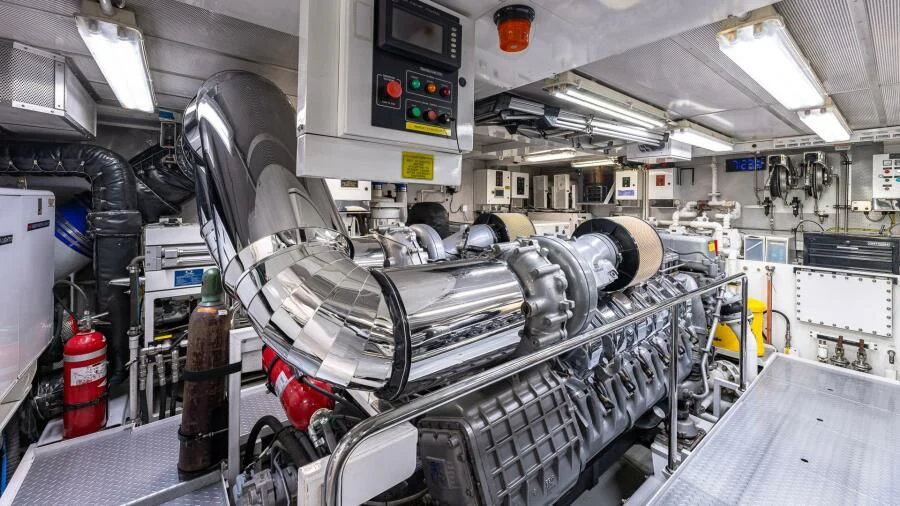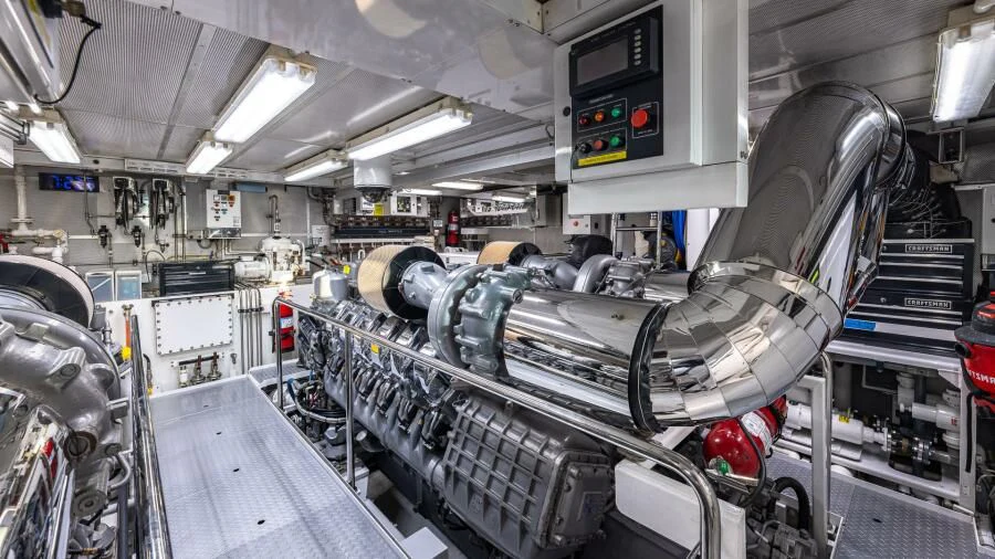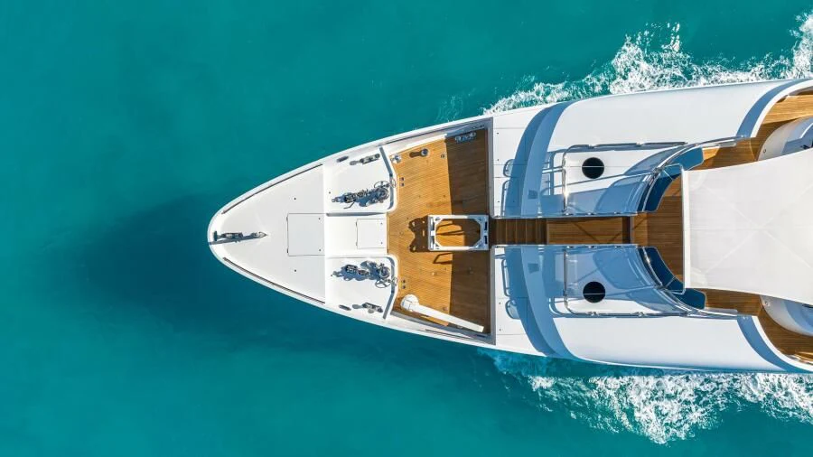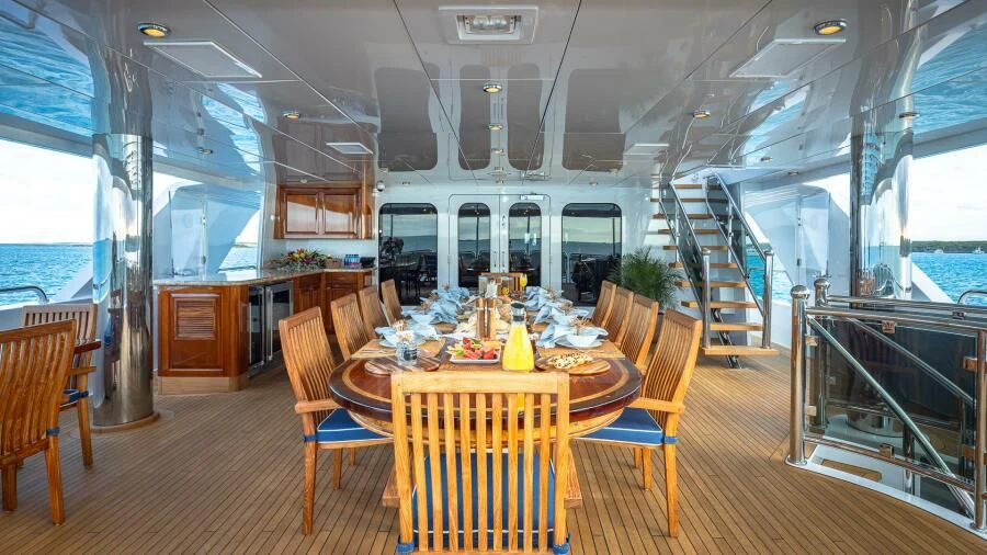 Her bridge deck has a large pilothouse dinette, Portuguese walk -round with large dining table and awning, forward tanning areas, a day head, drop down bar, four-person game table and TV and entertainment center with surround sound. The aft deck has alfresco dining for 12, with ability to set up special function tables and chairs for up to 48 people.