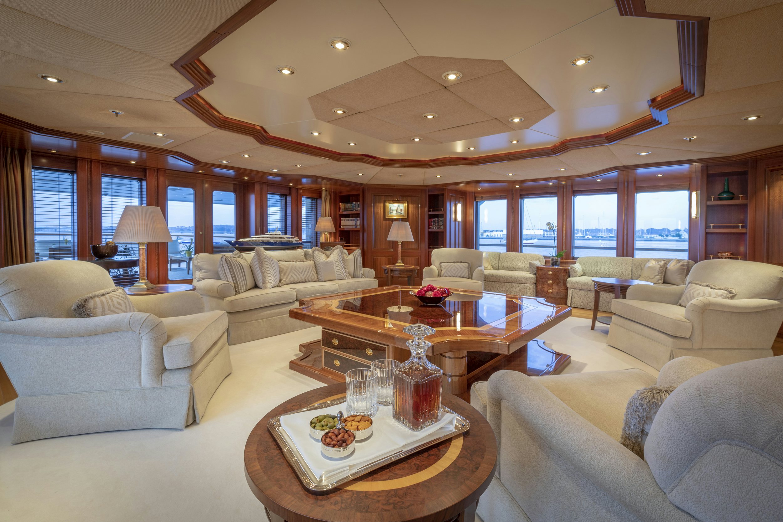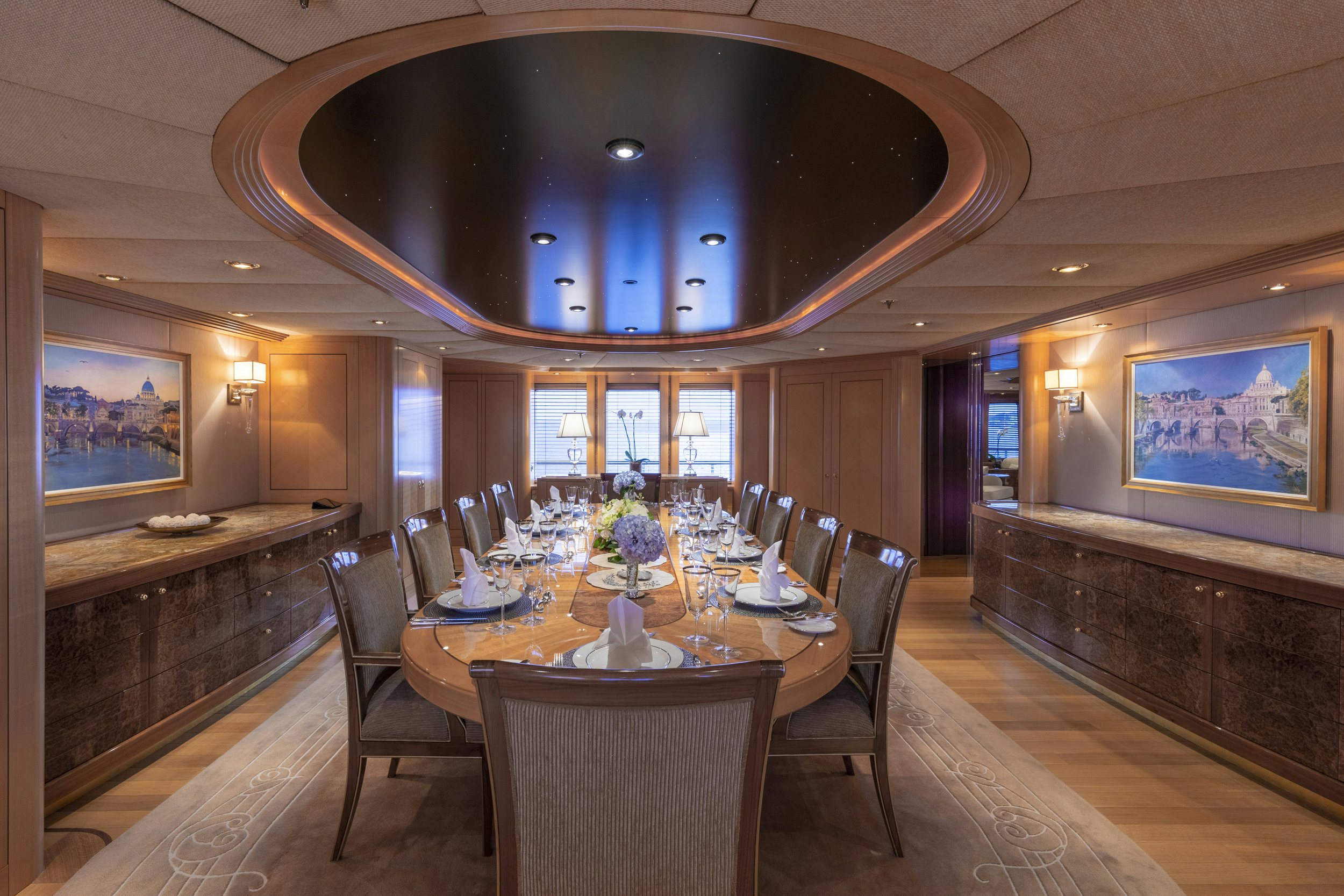 The luxury charter yacht showcases a timeless interior with an earth-tone color palette and beautiful artwork. LAUREL’s main salon is a versatile space ideal for socializing and relaxing with plush sofas and a TV hidden behind artwork. Forward is a private formal dining room with a starlight ceiling where the yacht’s chef will delight guests with bespoke menus. On the upper deck, the yacht’s skylounge is a second salon for guest enjoyments. Elevator access to all guest decks makes for easy movement around the yacht.