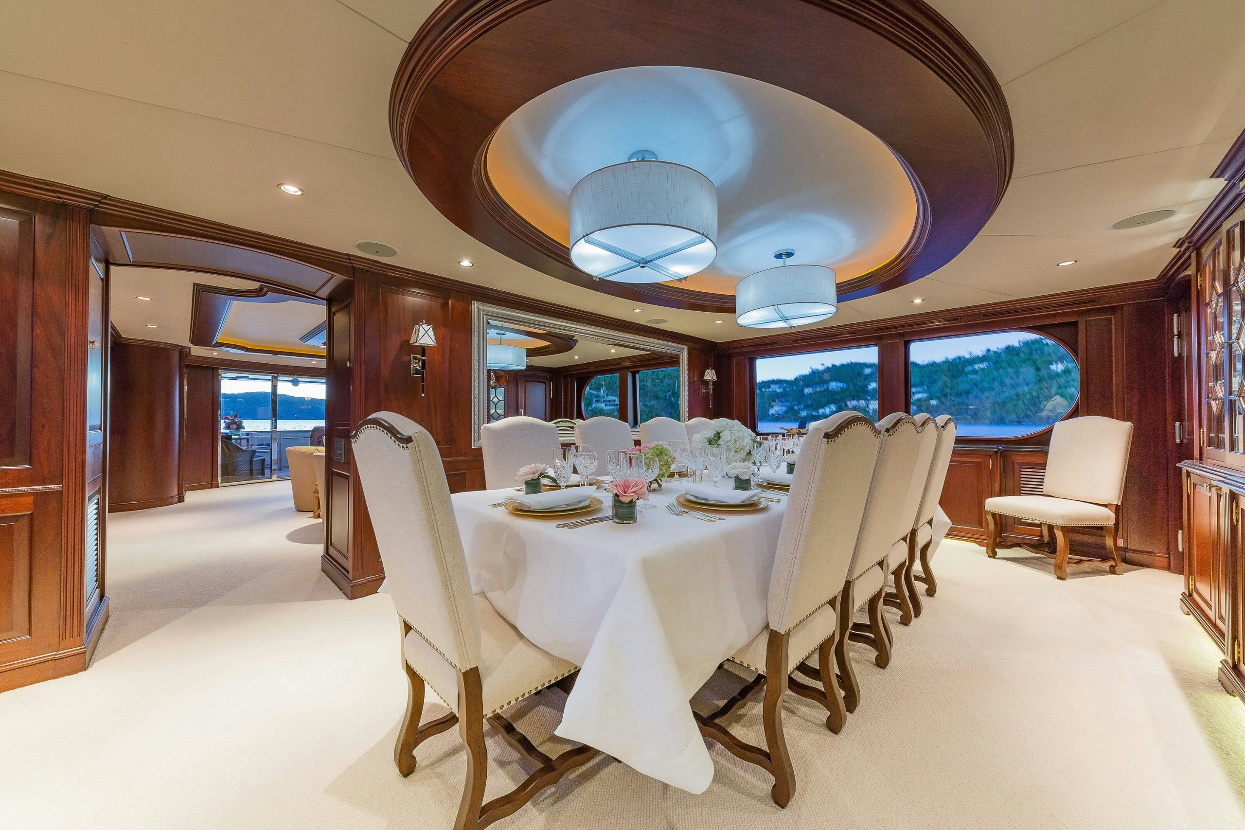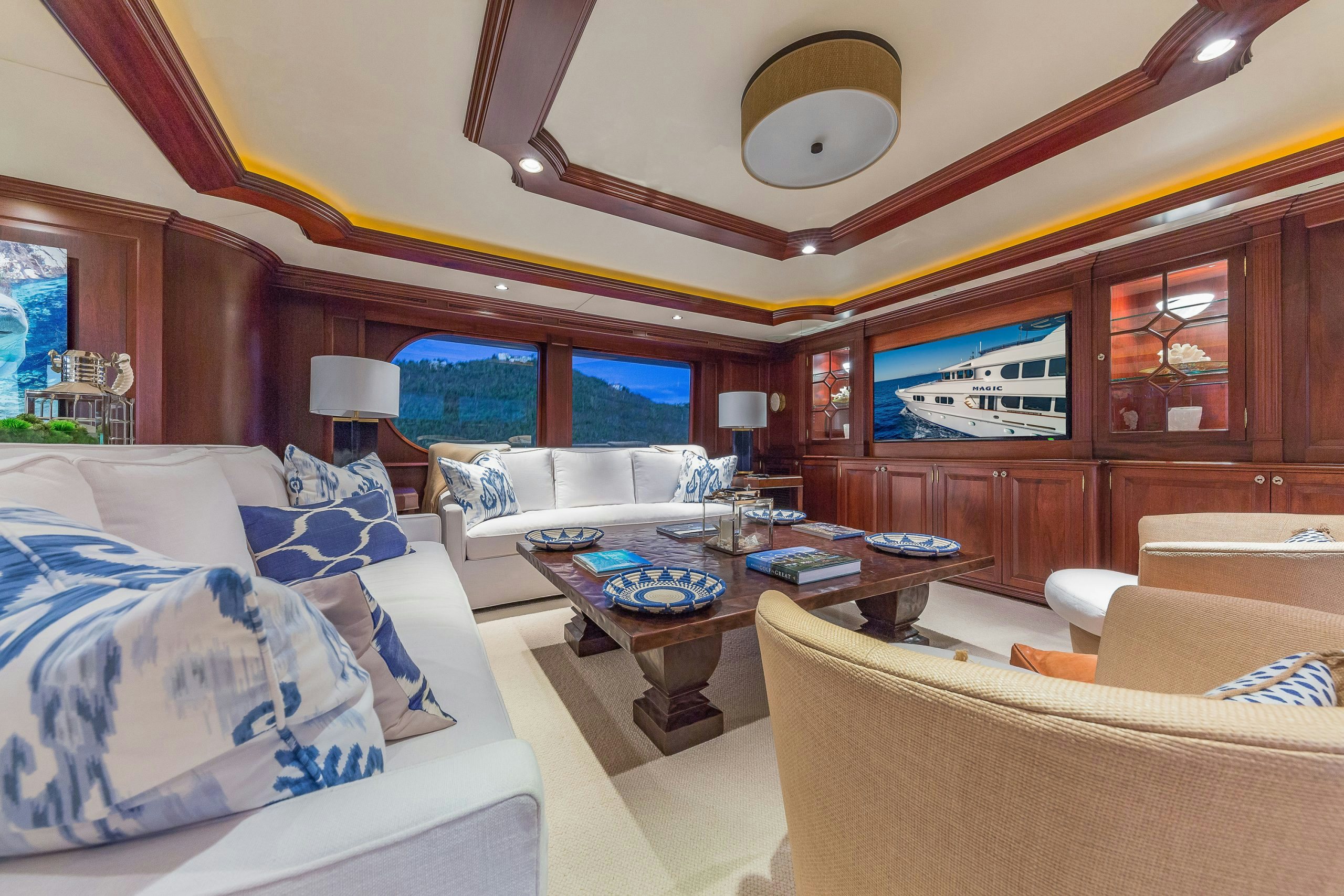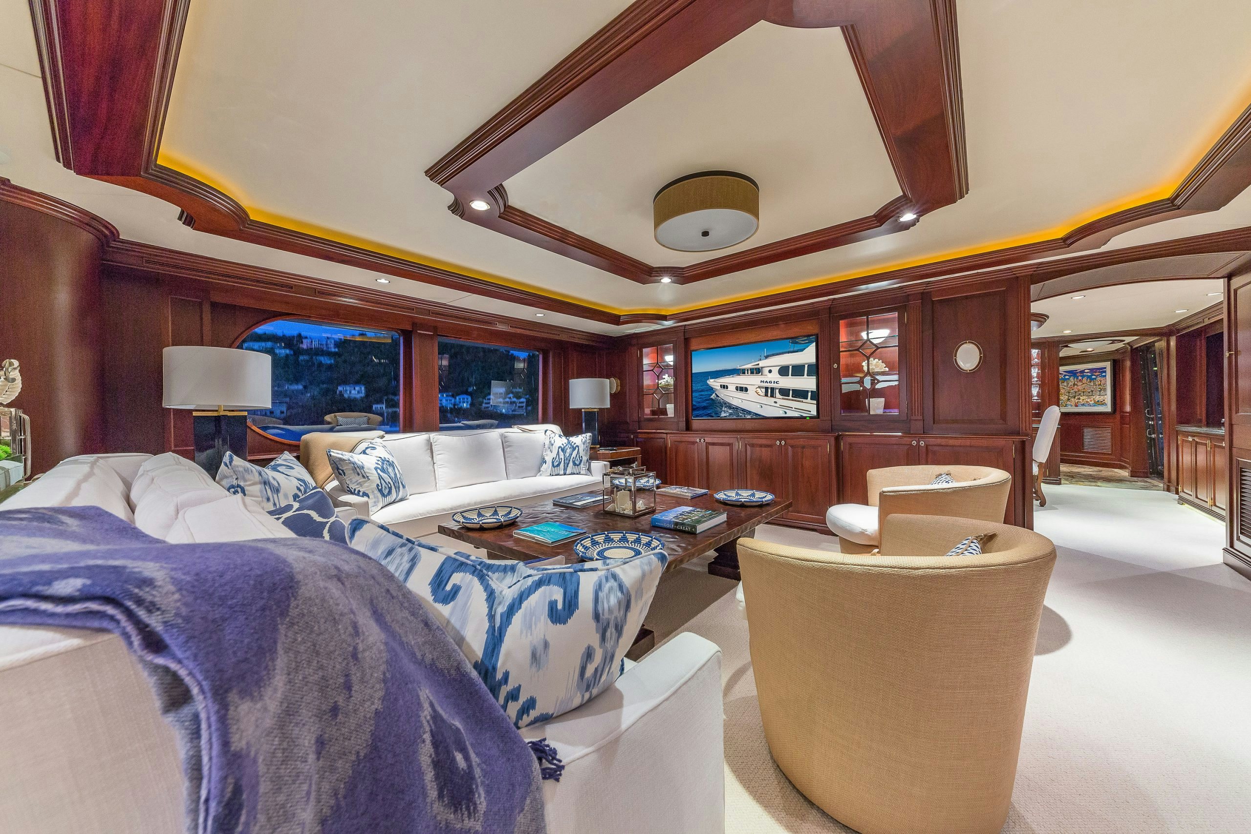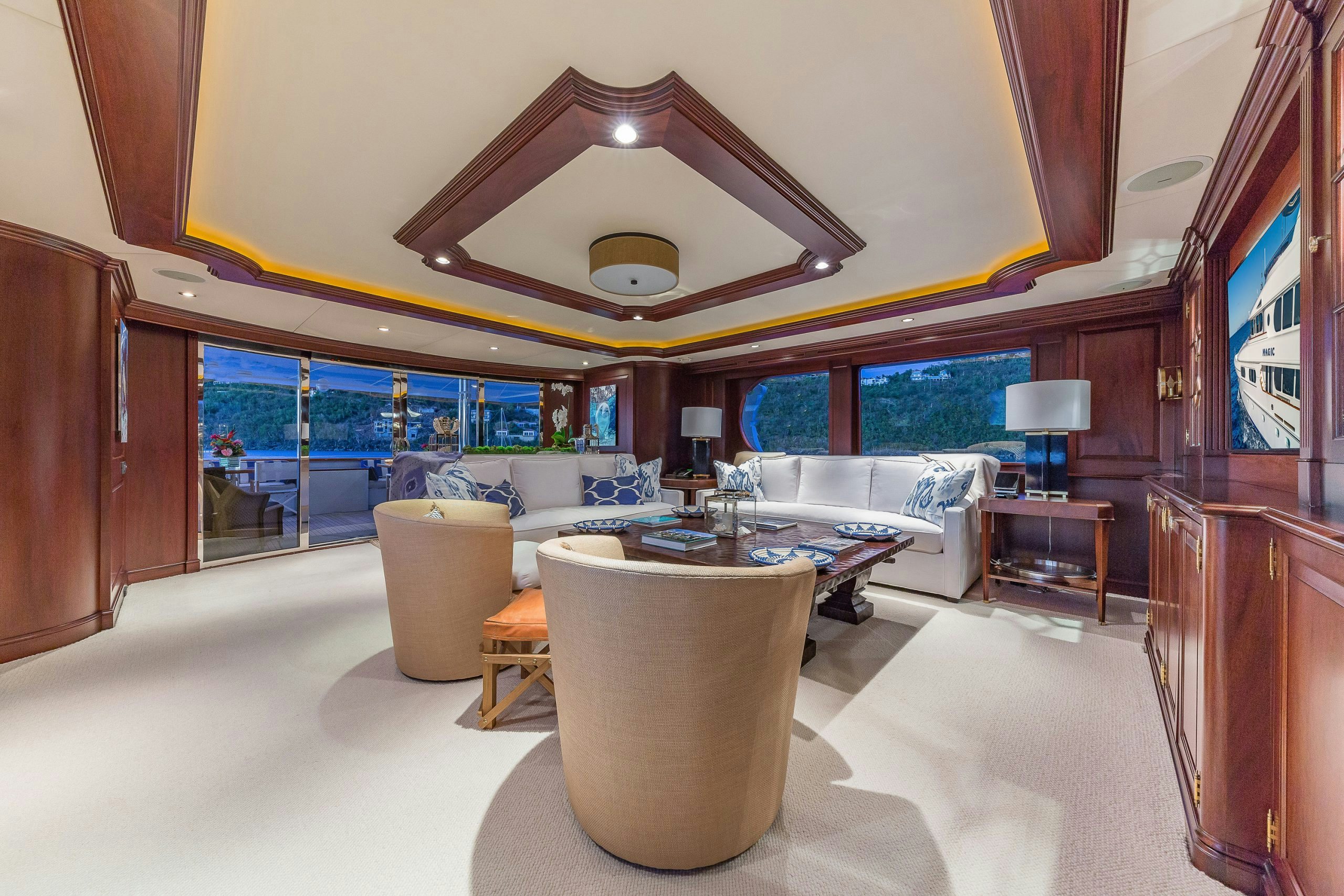 MAGIC showcases a sophisticated and traditional interior. The superyacht interior is filled with light from large deck windows, which beautifully highlight the fluted column details in the satin-finished raised-panel Honduran mahogany, which contrasts beautifully against her light furnishings and marble features.
