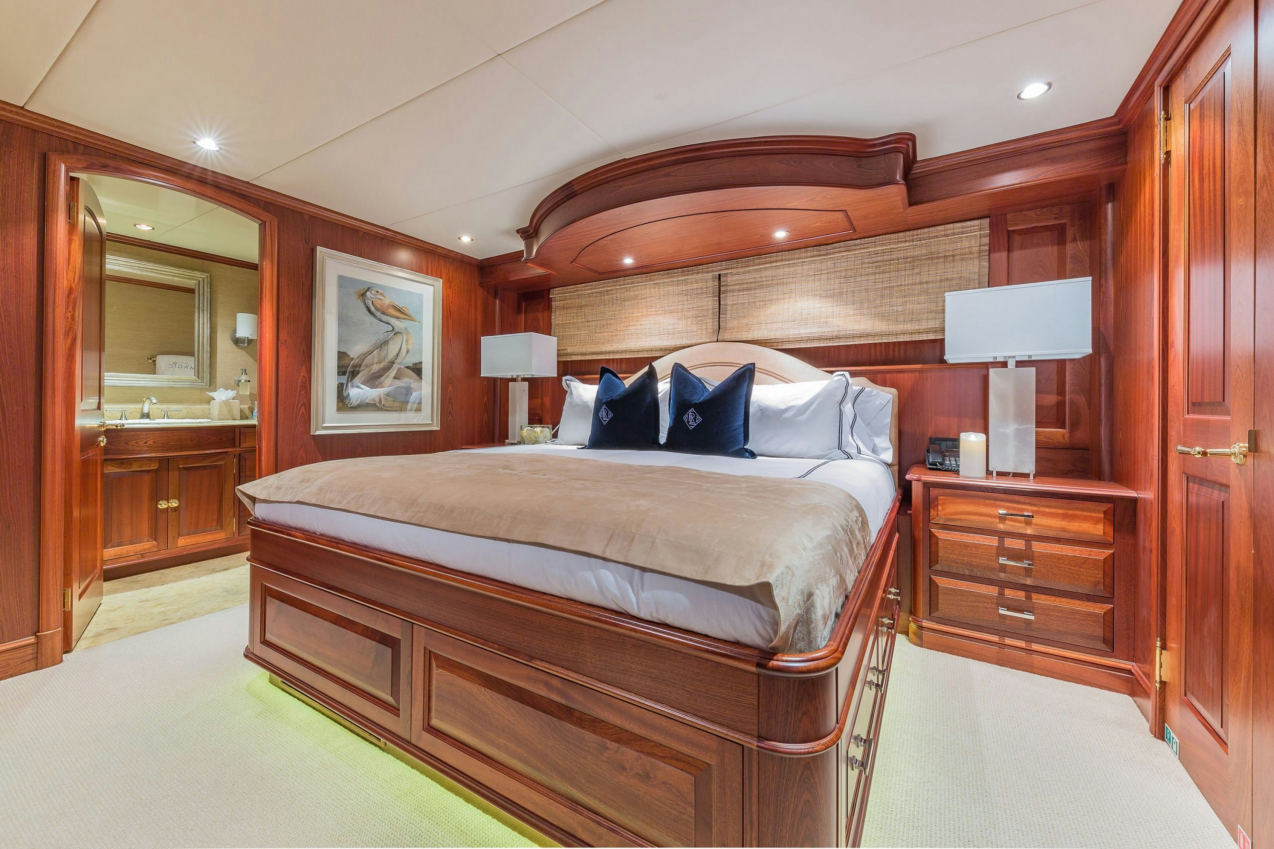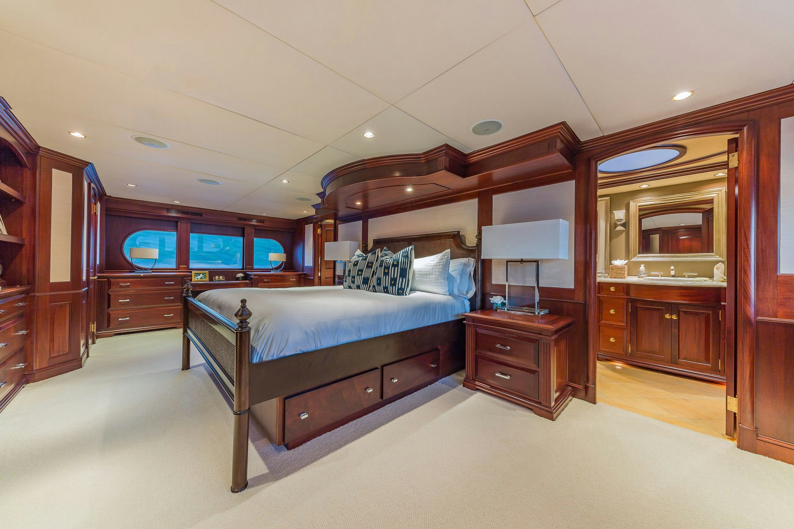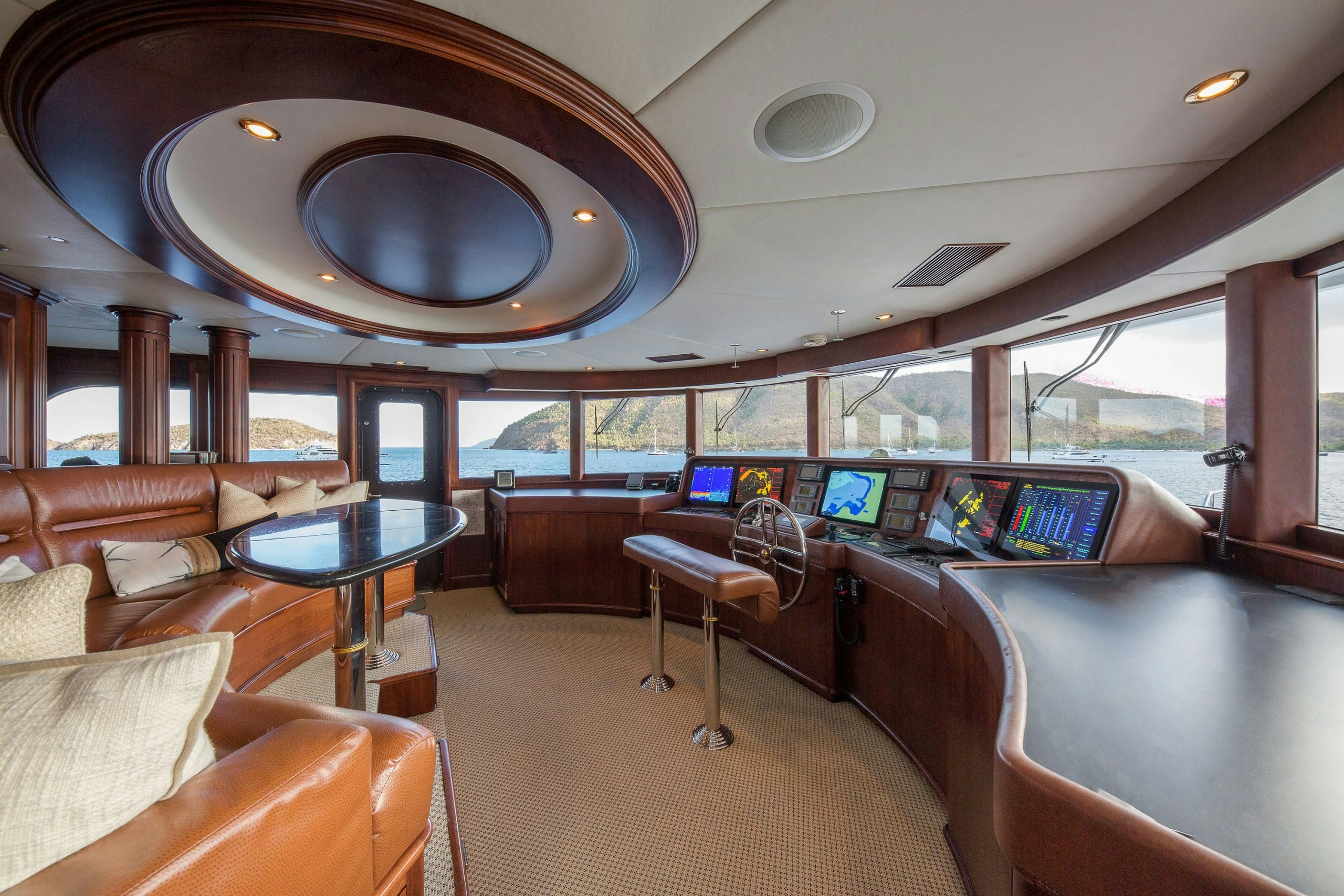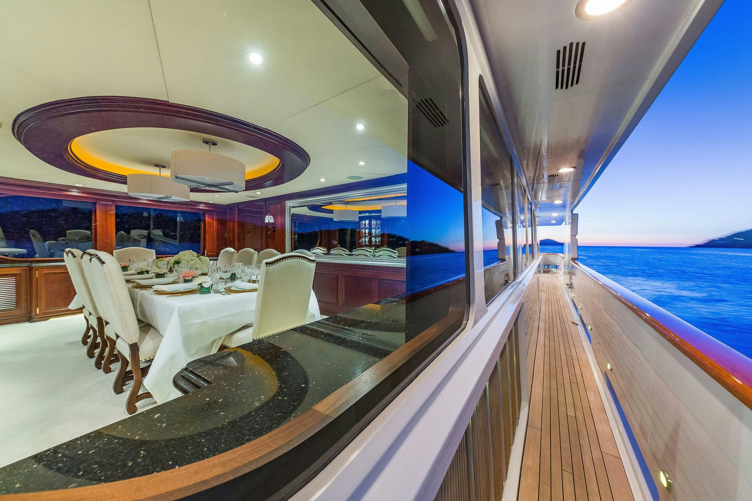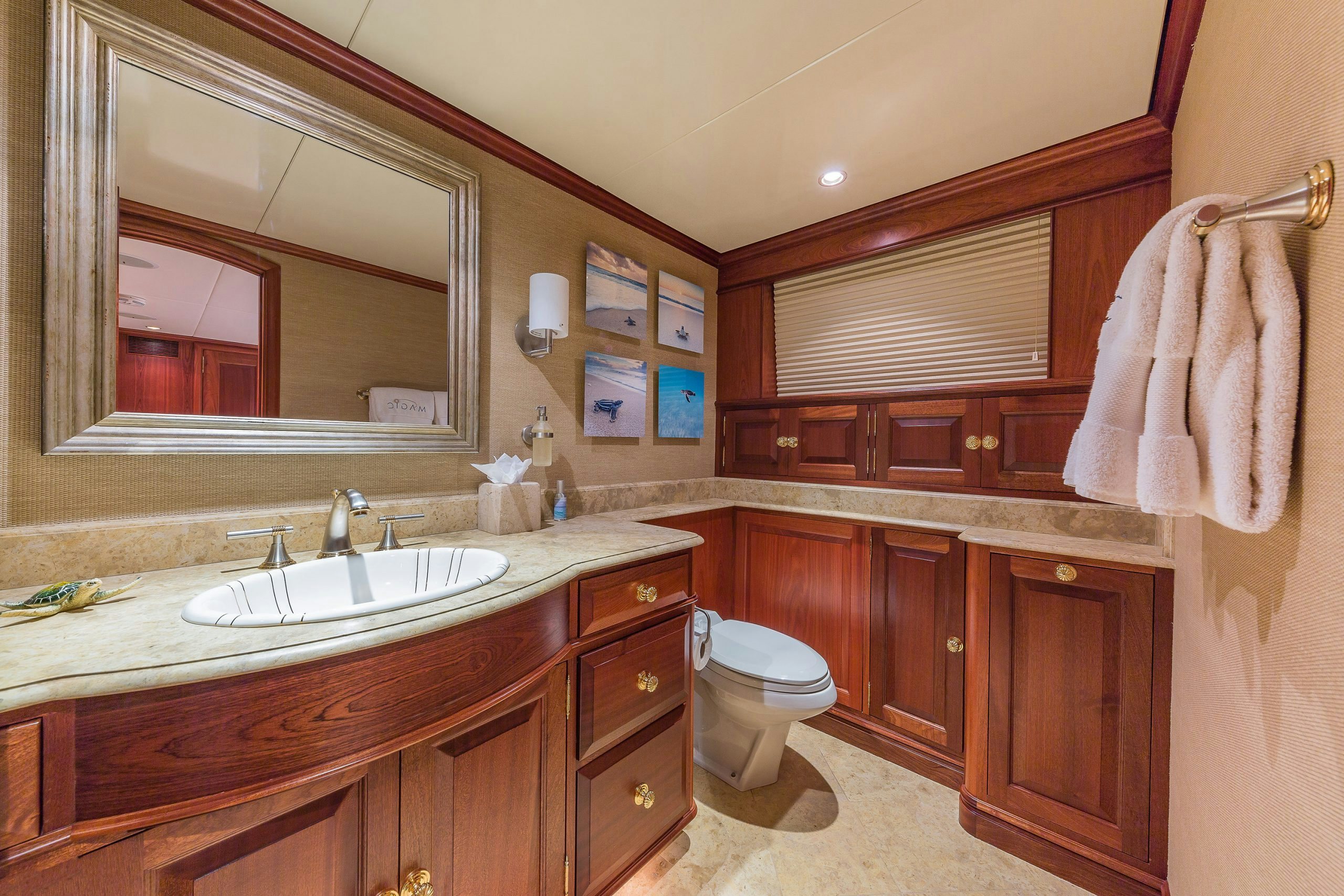 MAGIC showcases a sophisticated and traditional interior. The superyacht interior is filled with light from large deck windows, which beautifully highlight the fluted column details in the satin-finished raised-panel Honduran mahogany, which contrasts beautifully against her light furnishings and marble features.