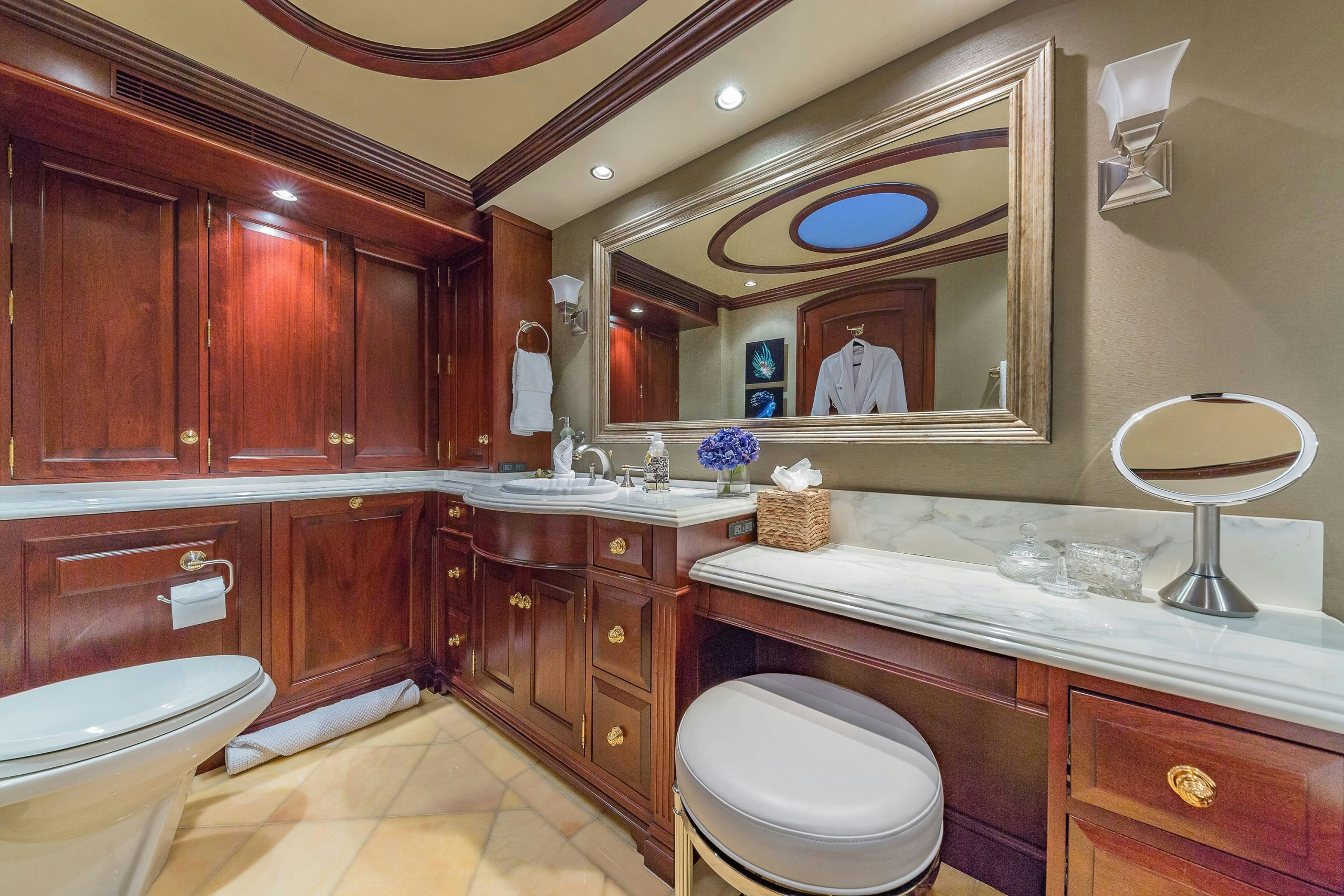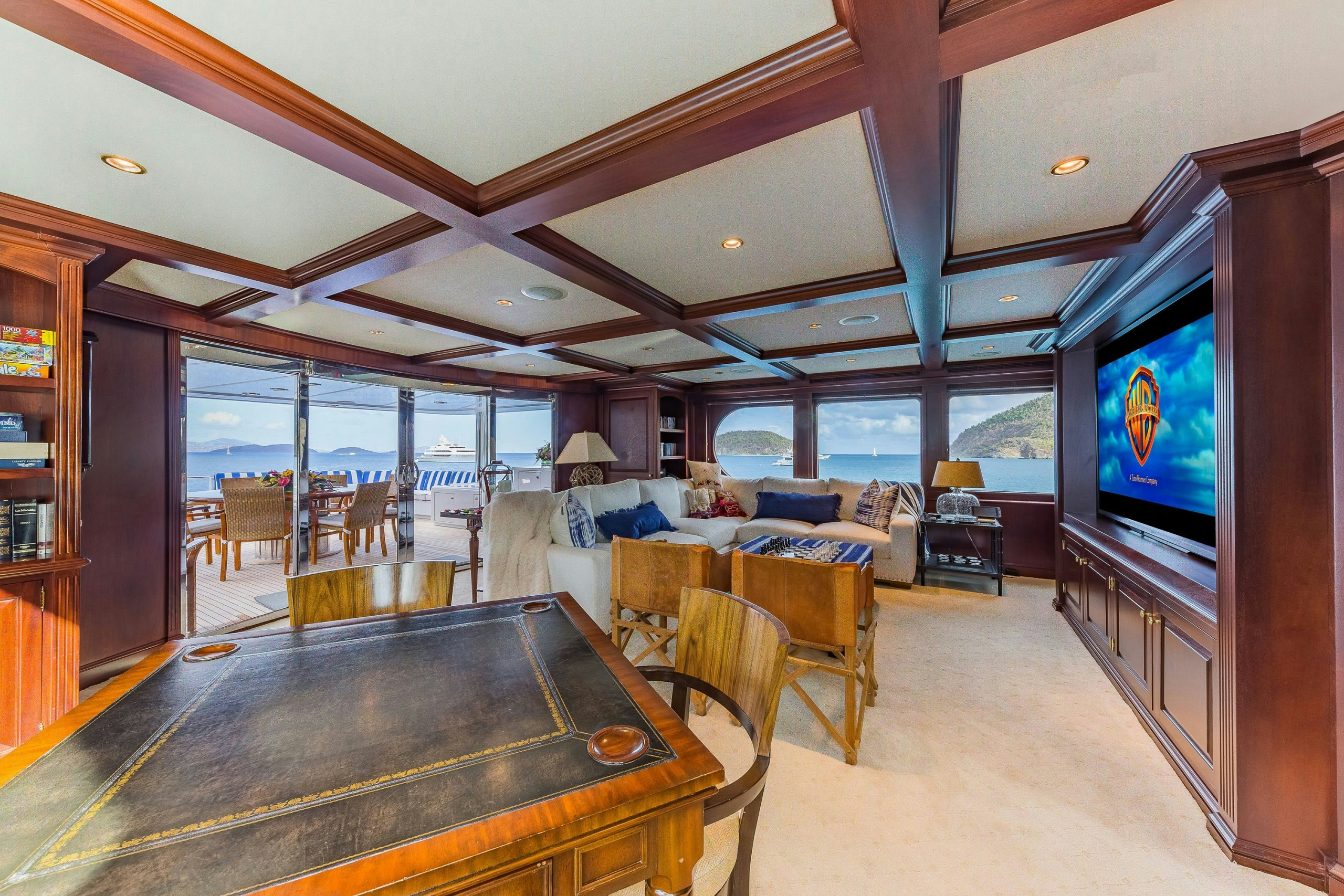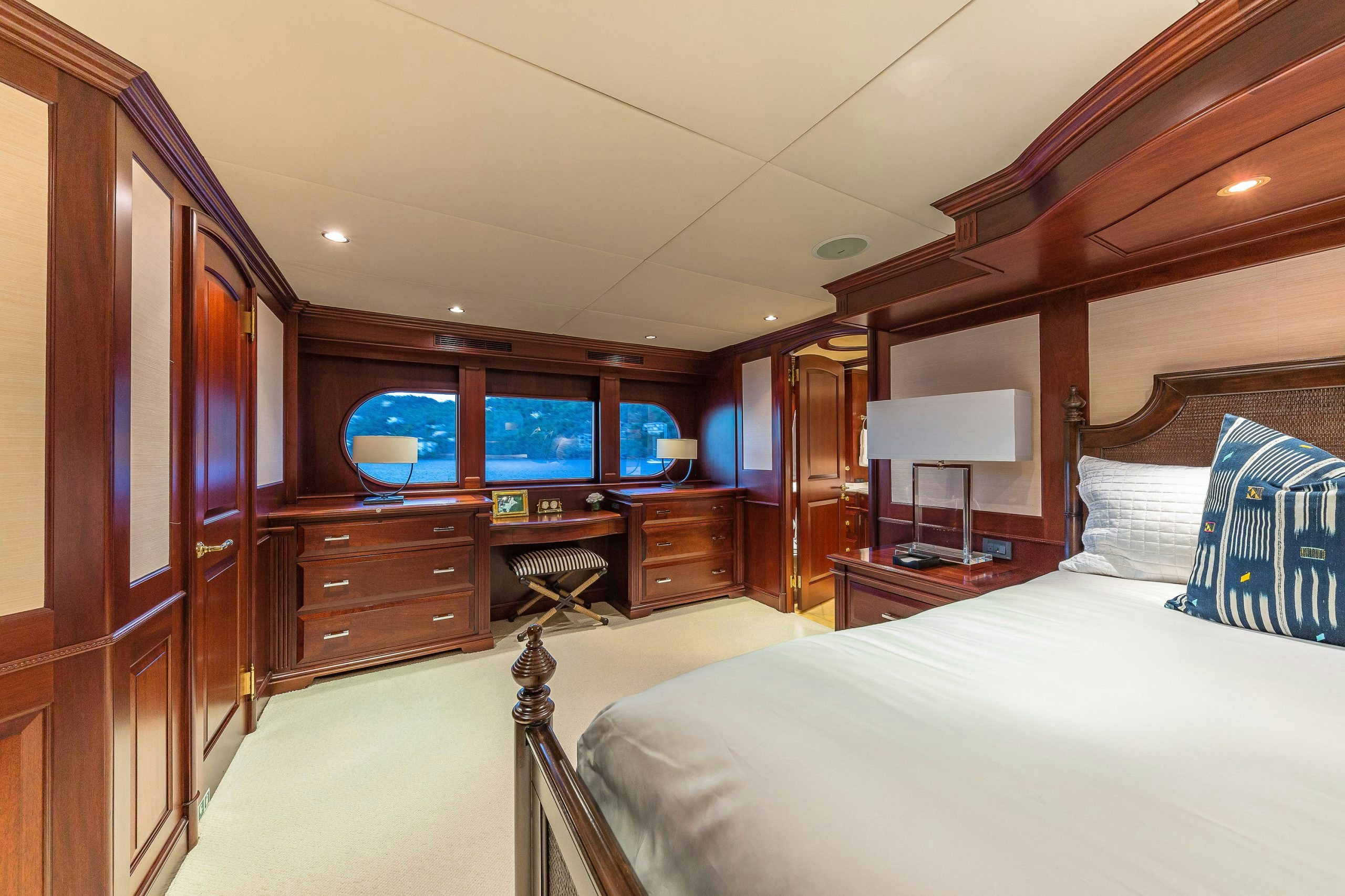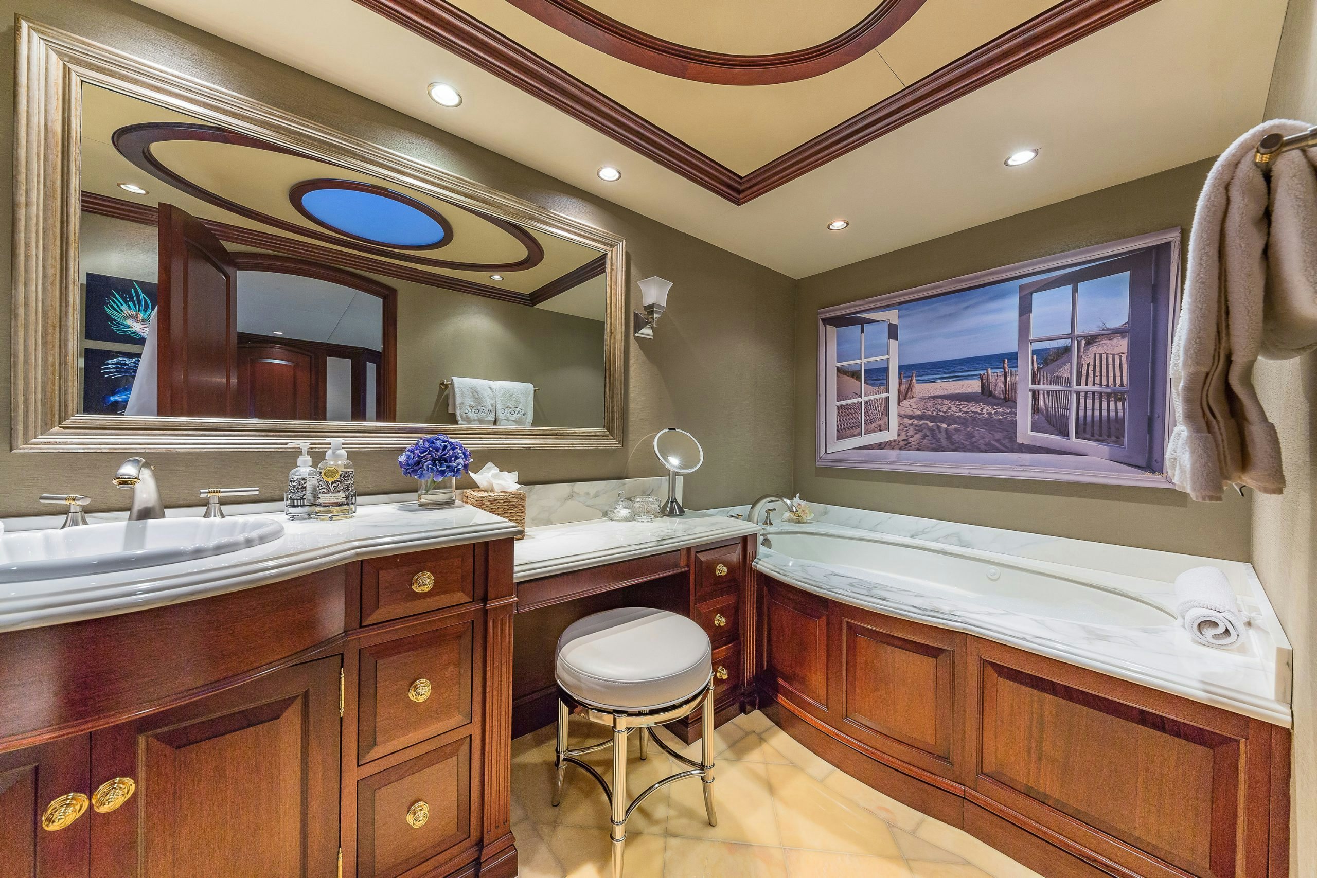 MAGIC showcases a sophisticated and traditional interior. The superyacht interior is filled with light from large deck windows, which beautifully highlight the fluted column details in the satin-finished raised-panel Honduran mahogany, which contrasts beautifully against her light furnishings and marble features.