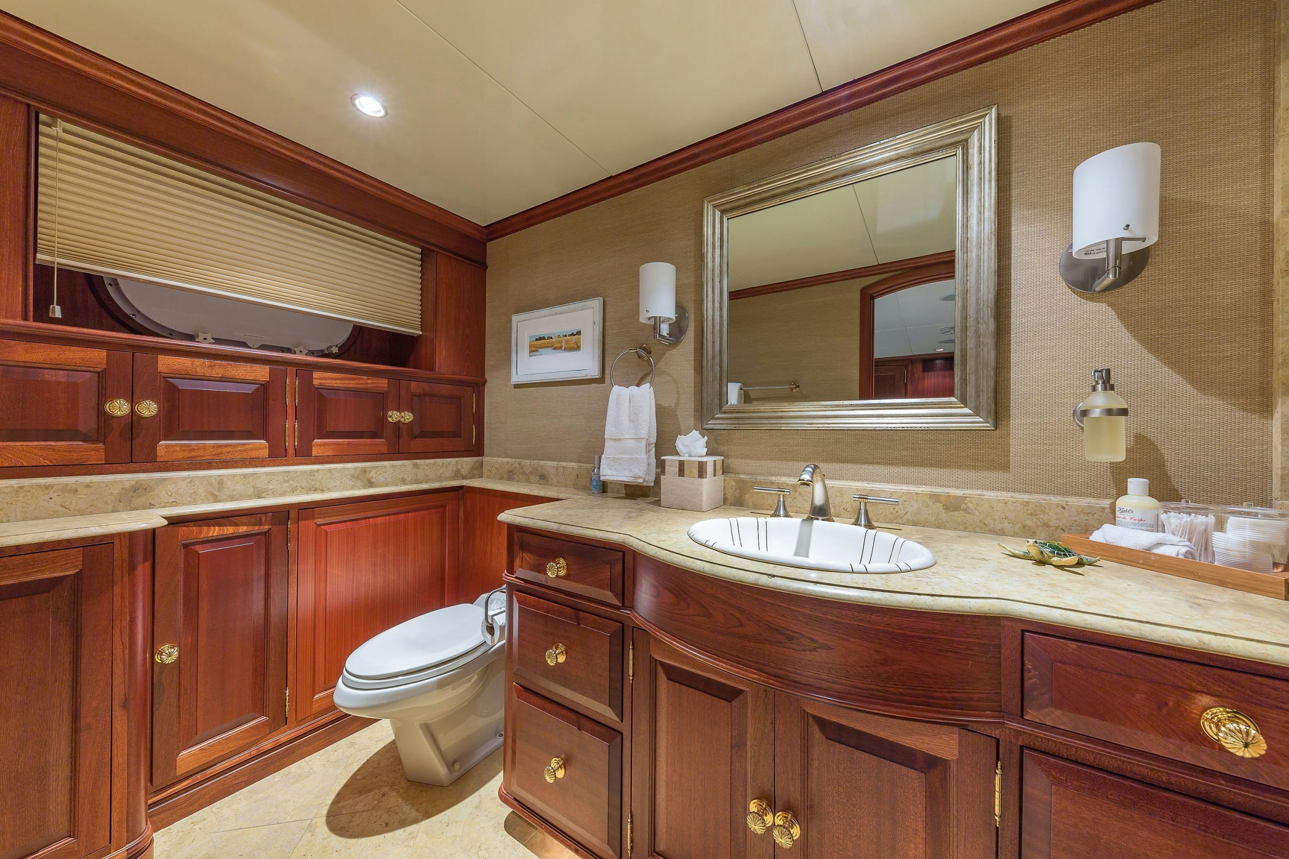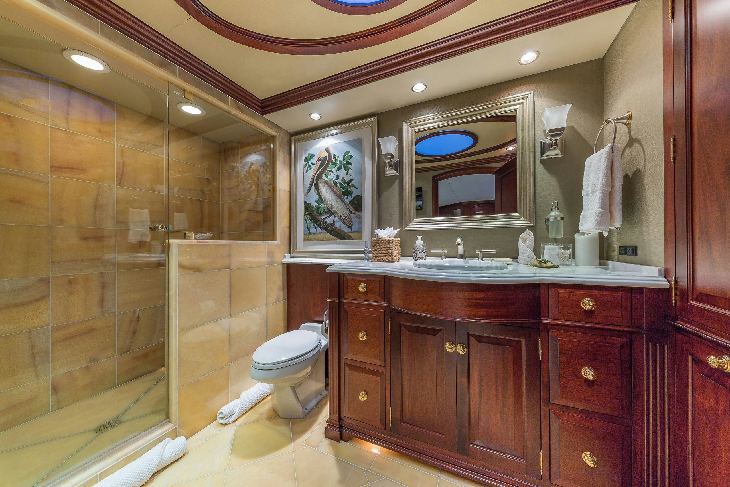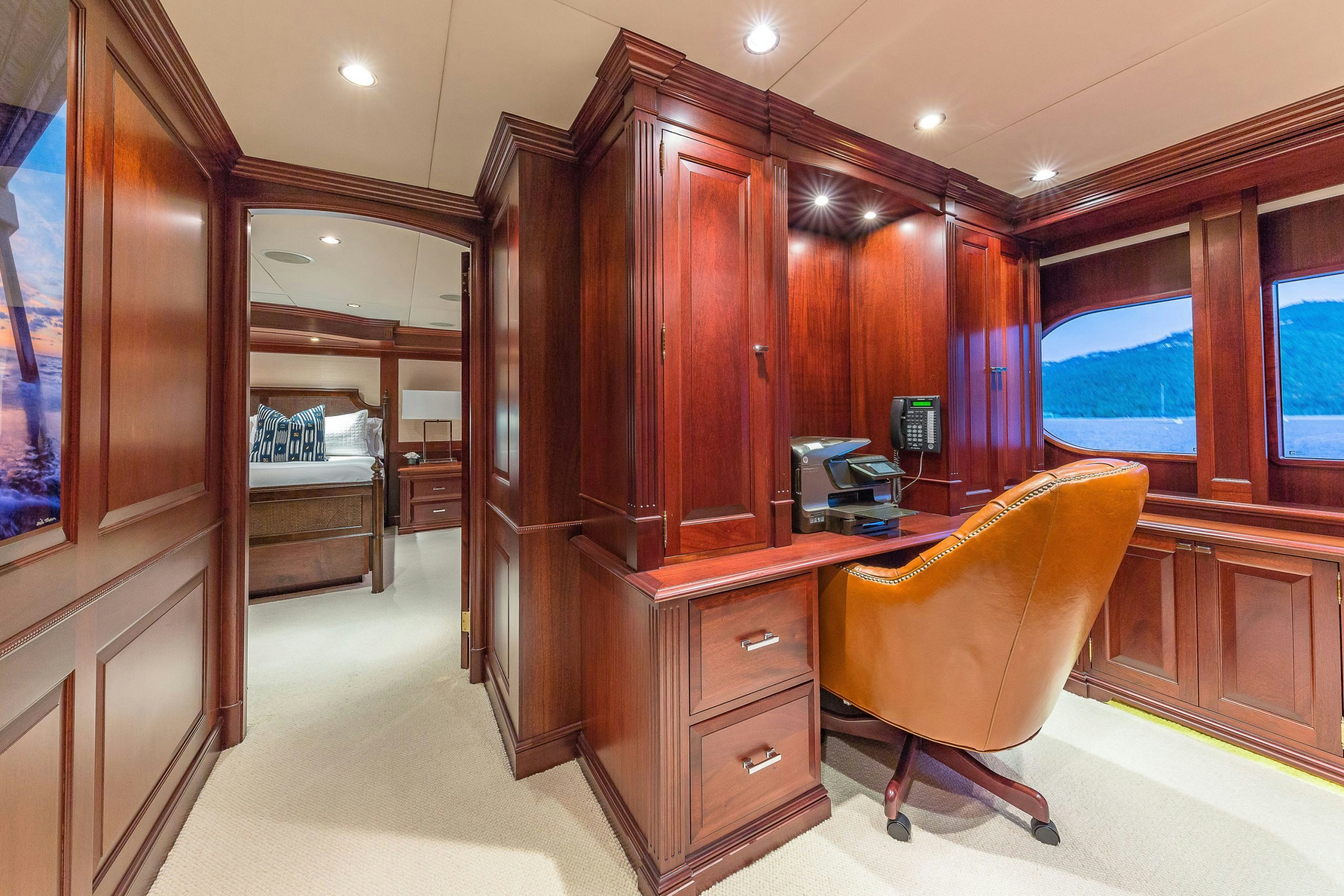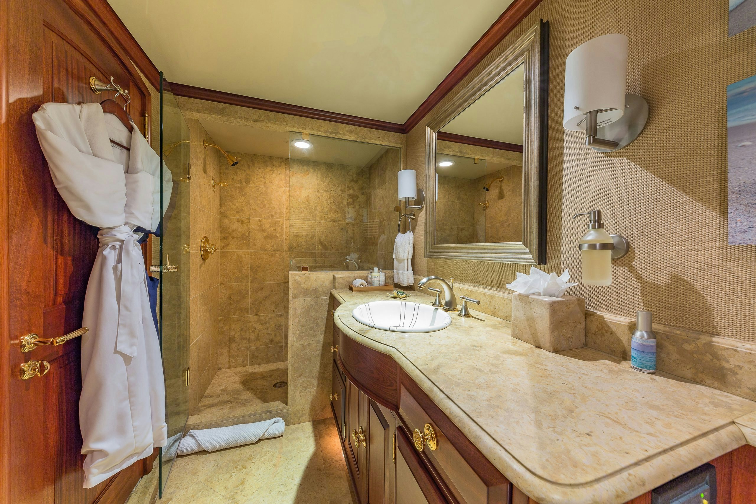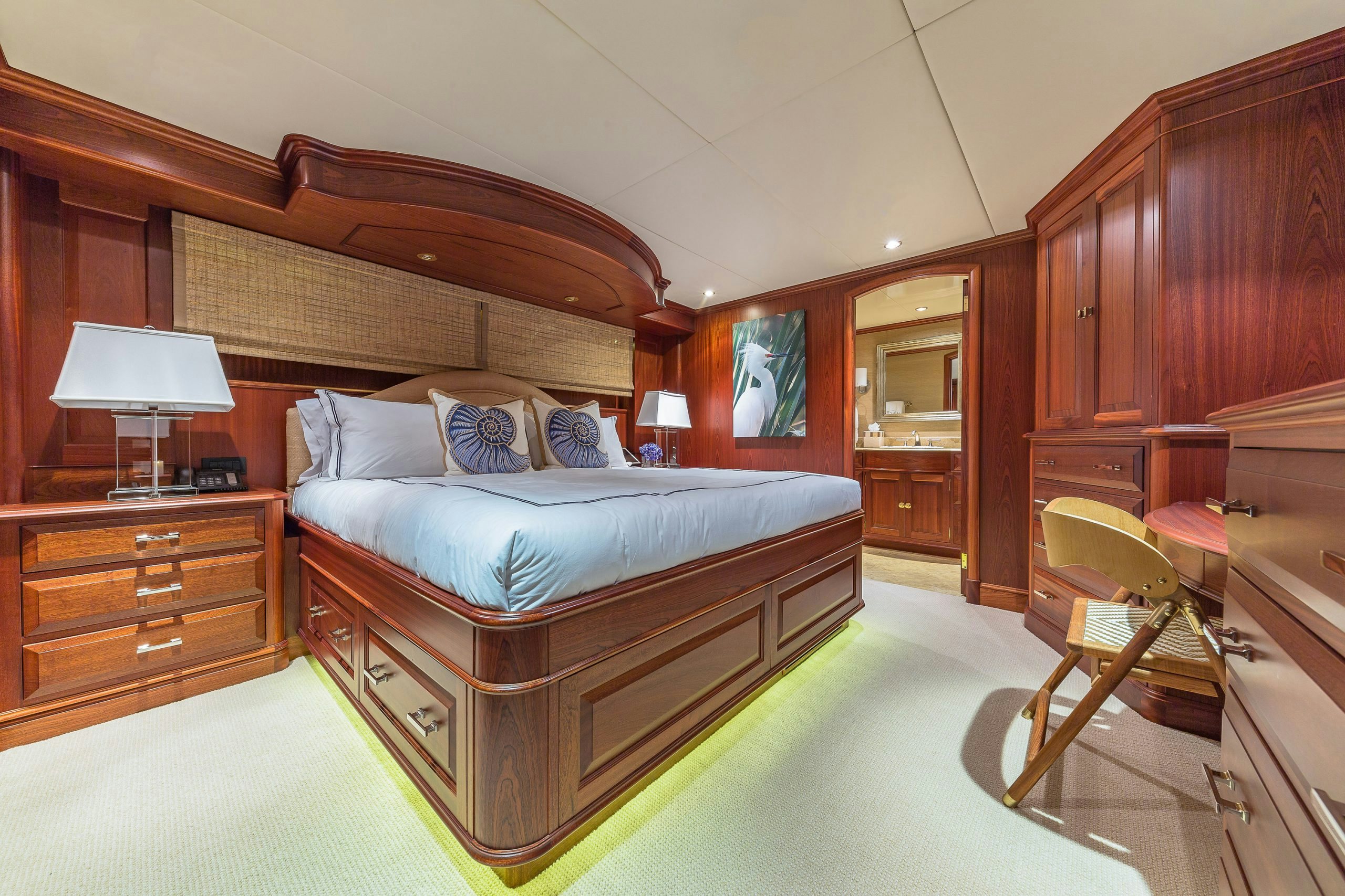 MAGIC showcases a sophisticated and traditional interior. The superyacht interior is filled with light from large deck windows, which beautifully highlight the fluted column details in the satin-finished raised-panel Honduran mahogany, which contrasts beautifully against her light furnishings and marble features.