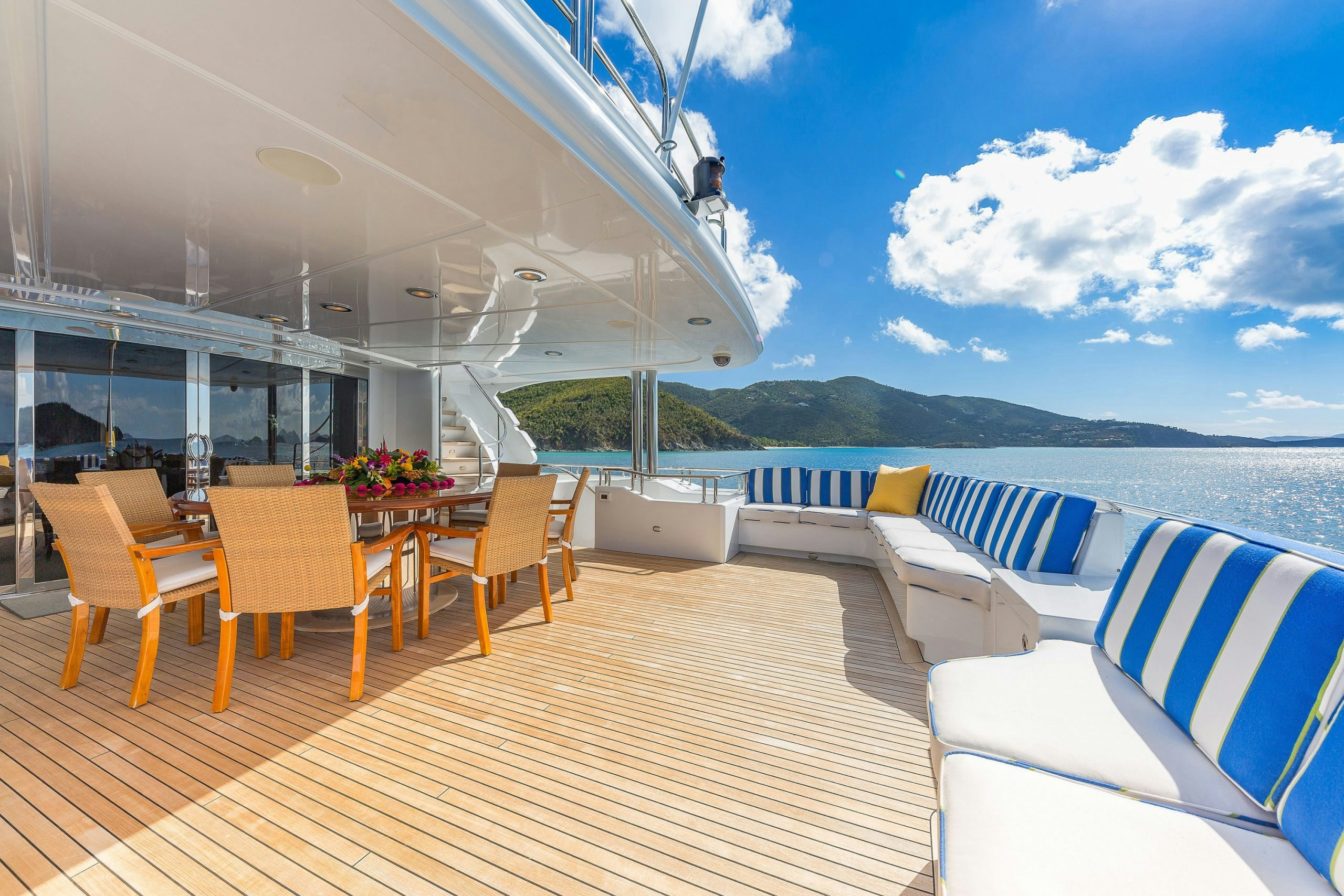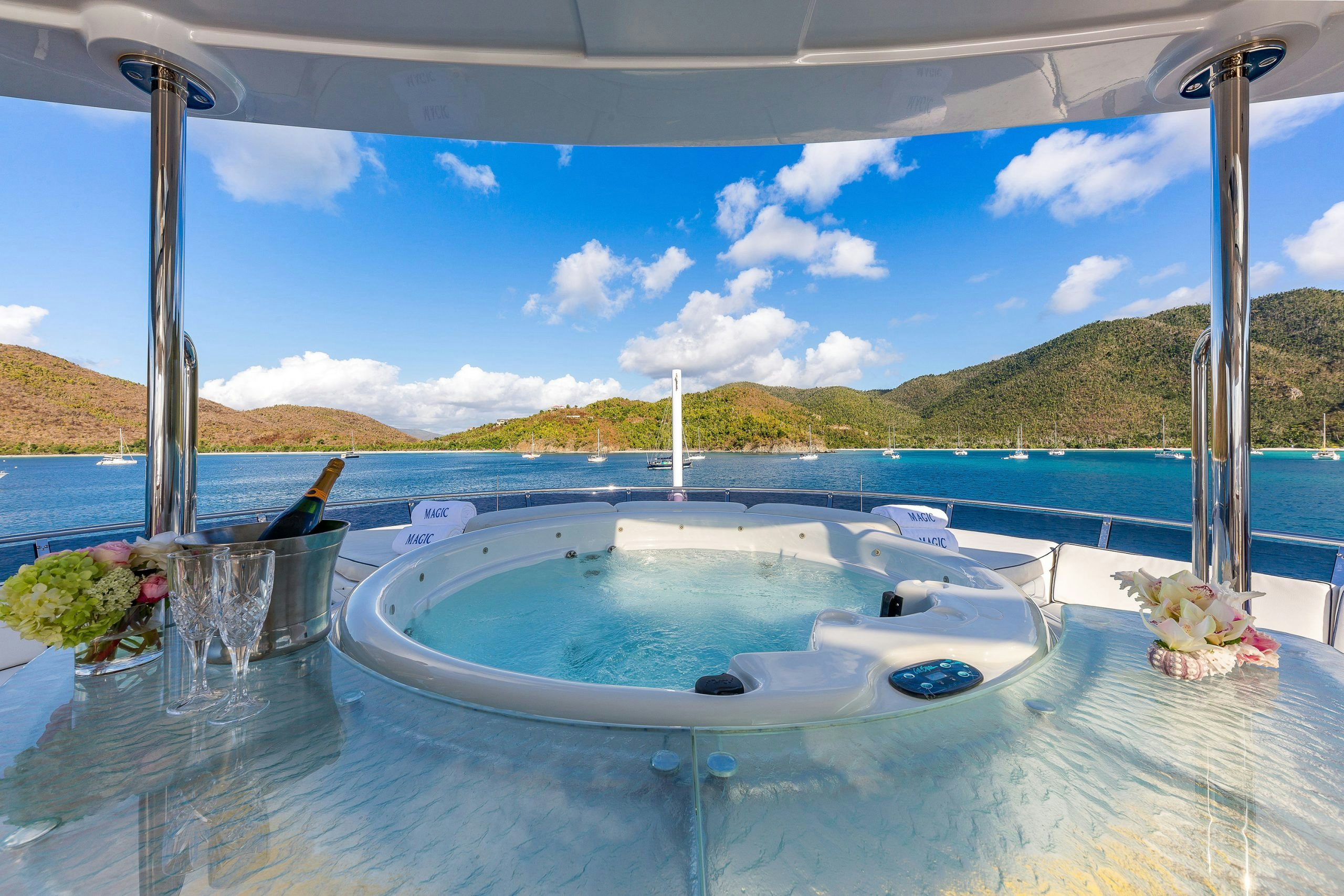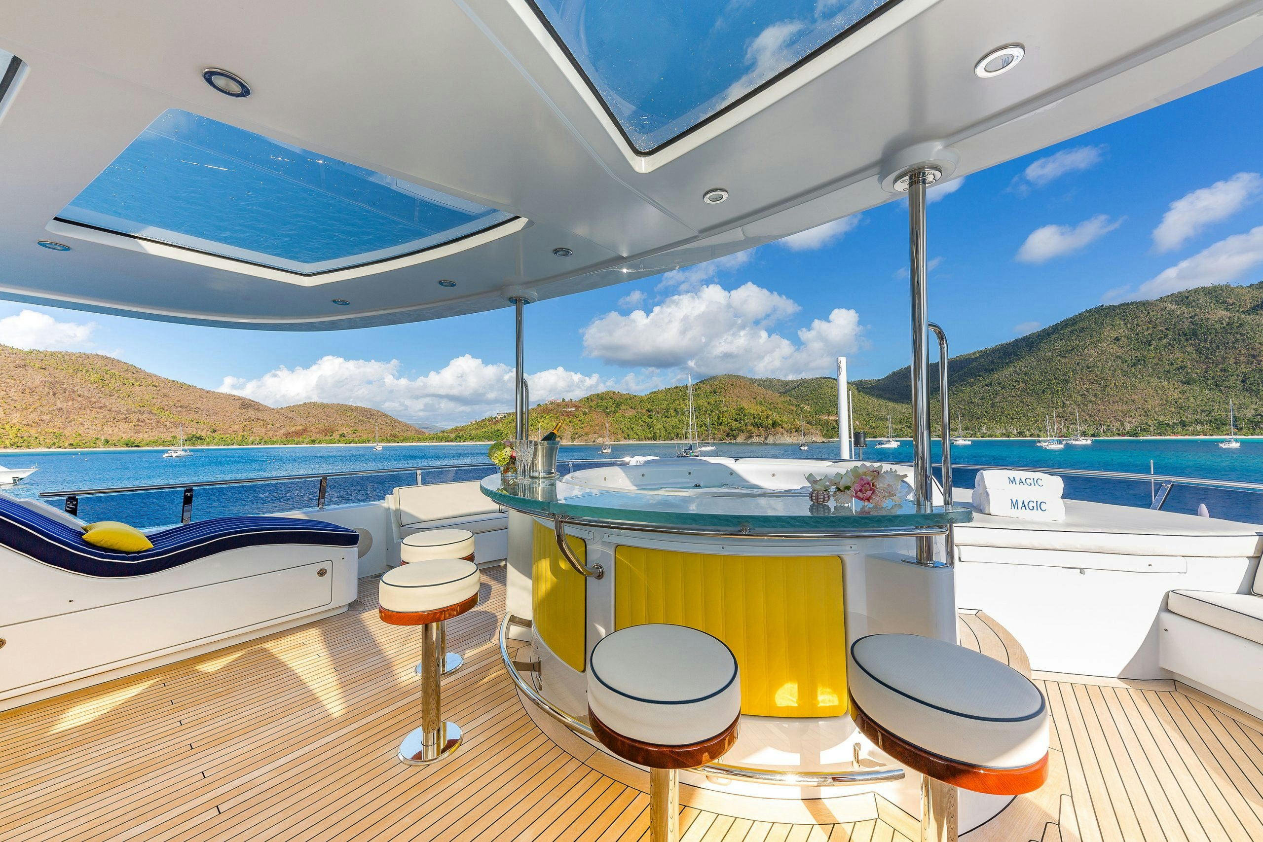 Charter yacht MAGIC was designed for entertaining and her sundeck certainly provides a fantastic space for this. The sundeck features a Jacuzzi surrounded by a glass-topped bar/grill, plenty of cushioned sunpads and loungers.