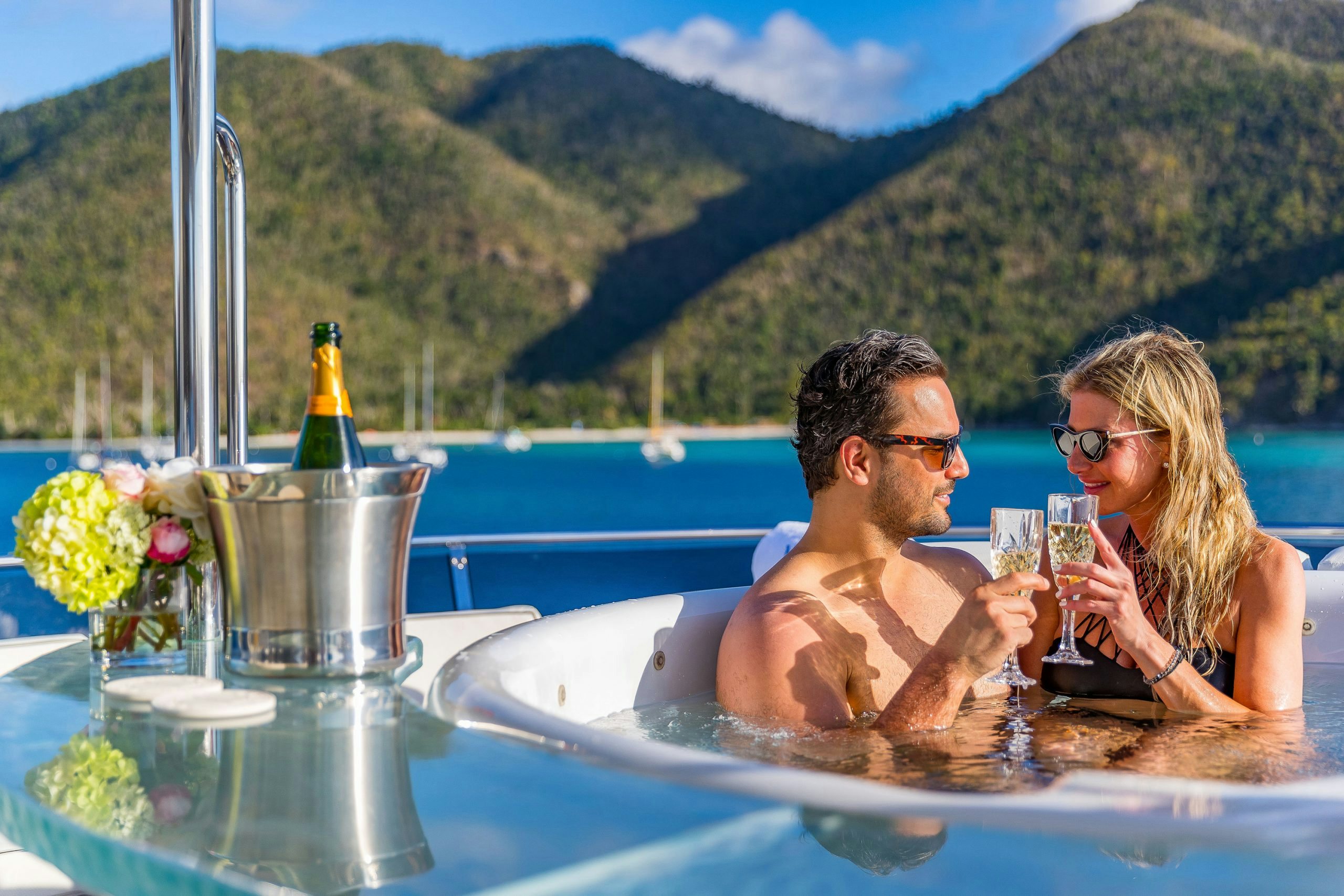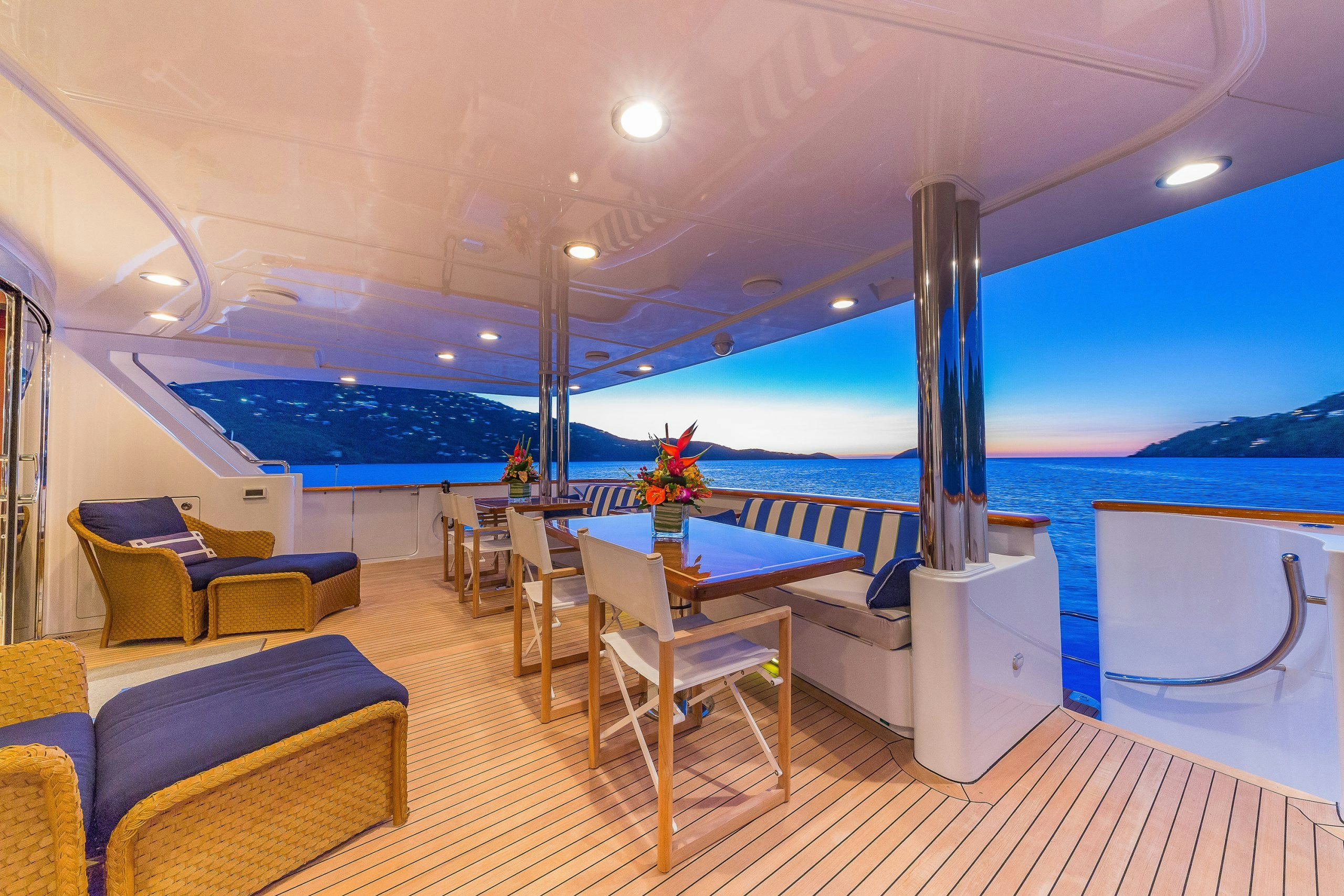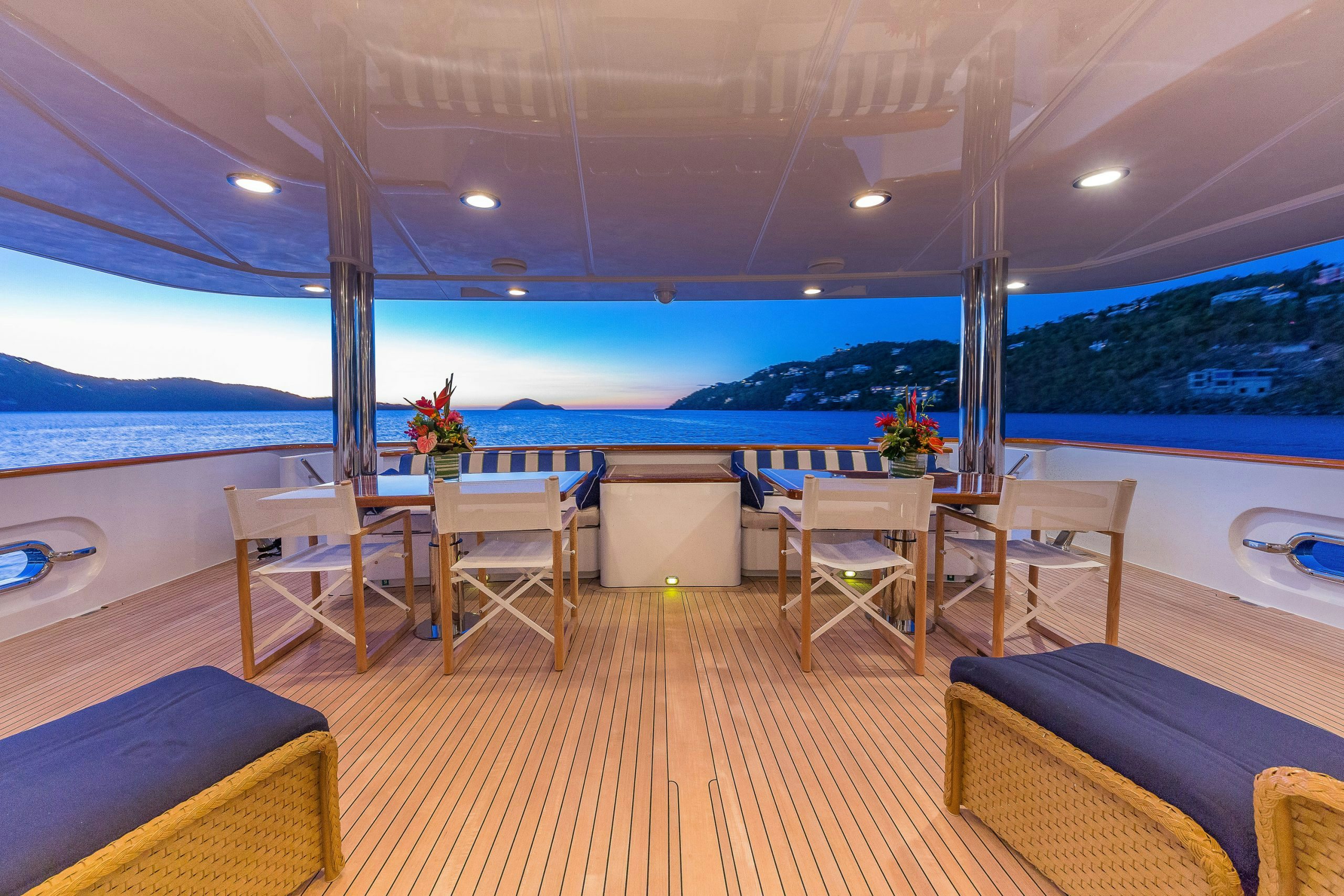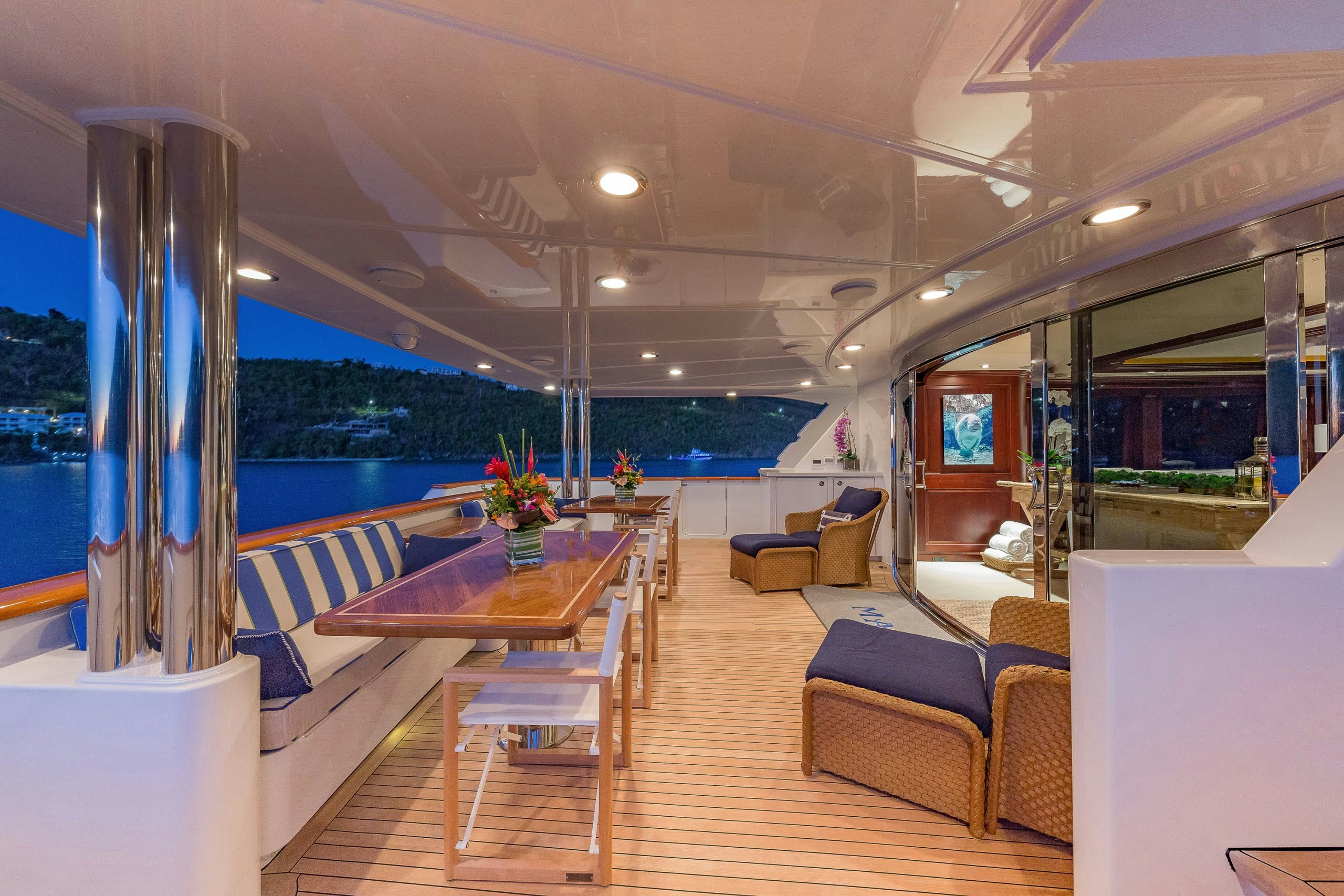 Charter yacht MAGIC was designed for entertaining and her sundeck certainly provides a fantastic space for this. The sundeck features a Jacuzzi surrounded by a glass-topped bar/grill, plenty of cushioned sunpads and loungers.