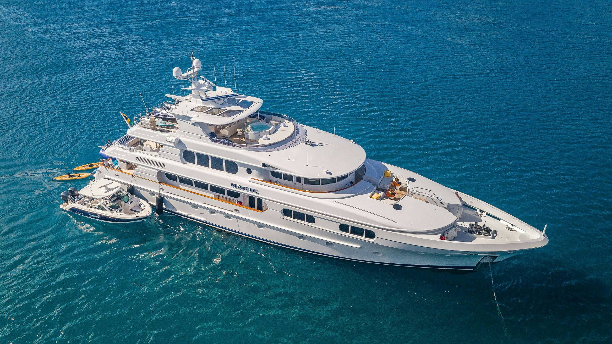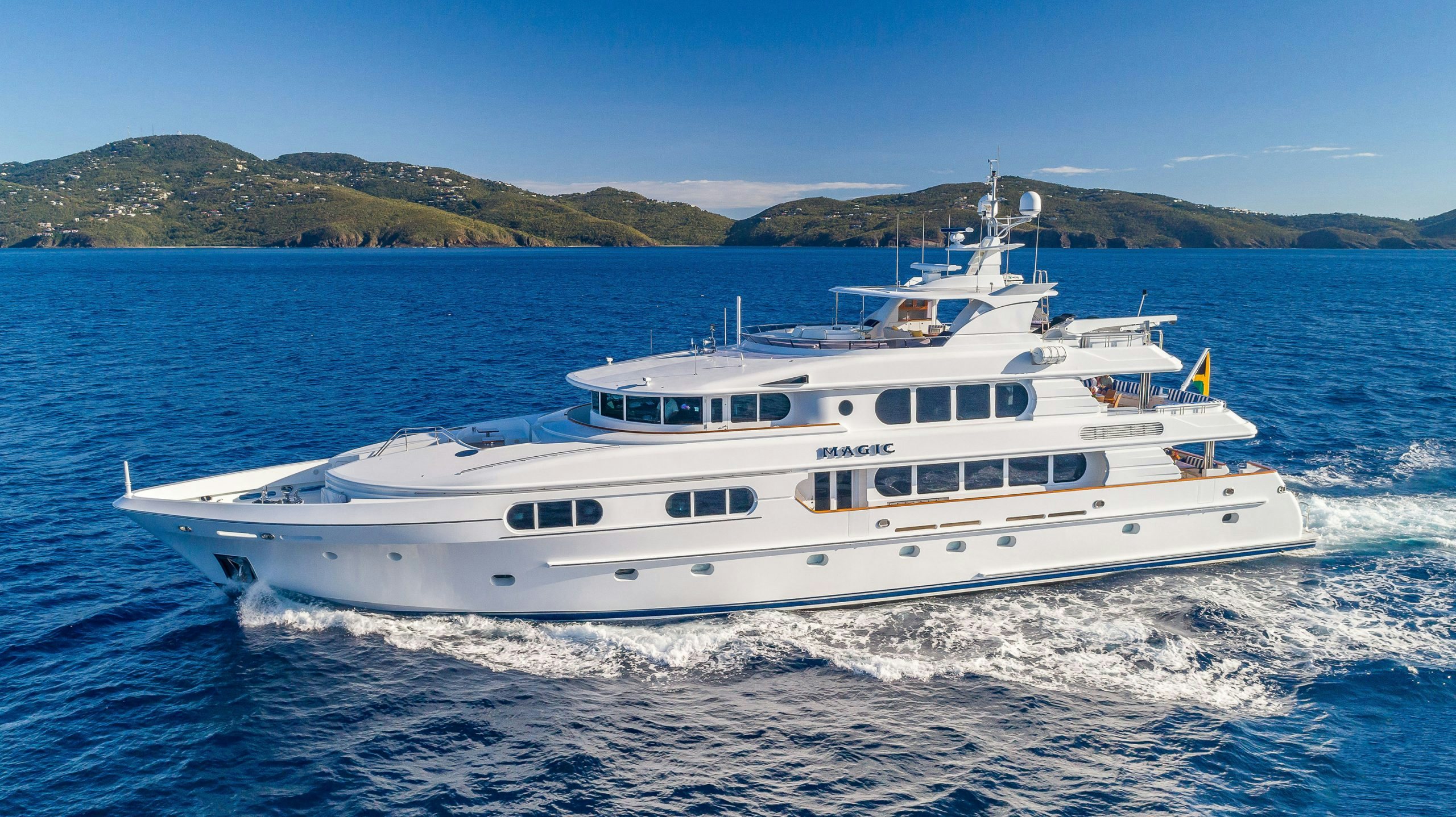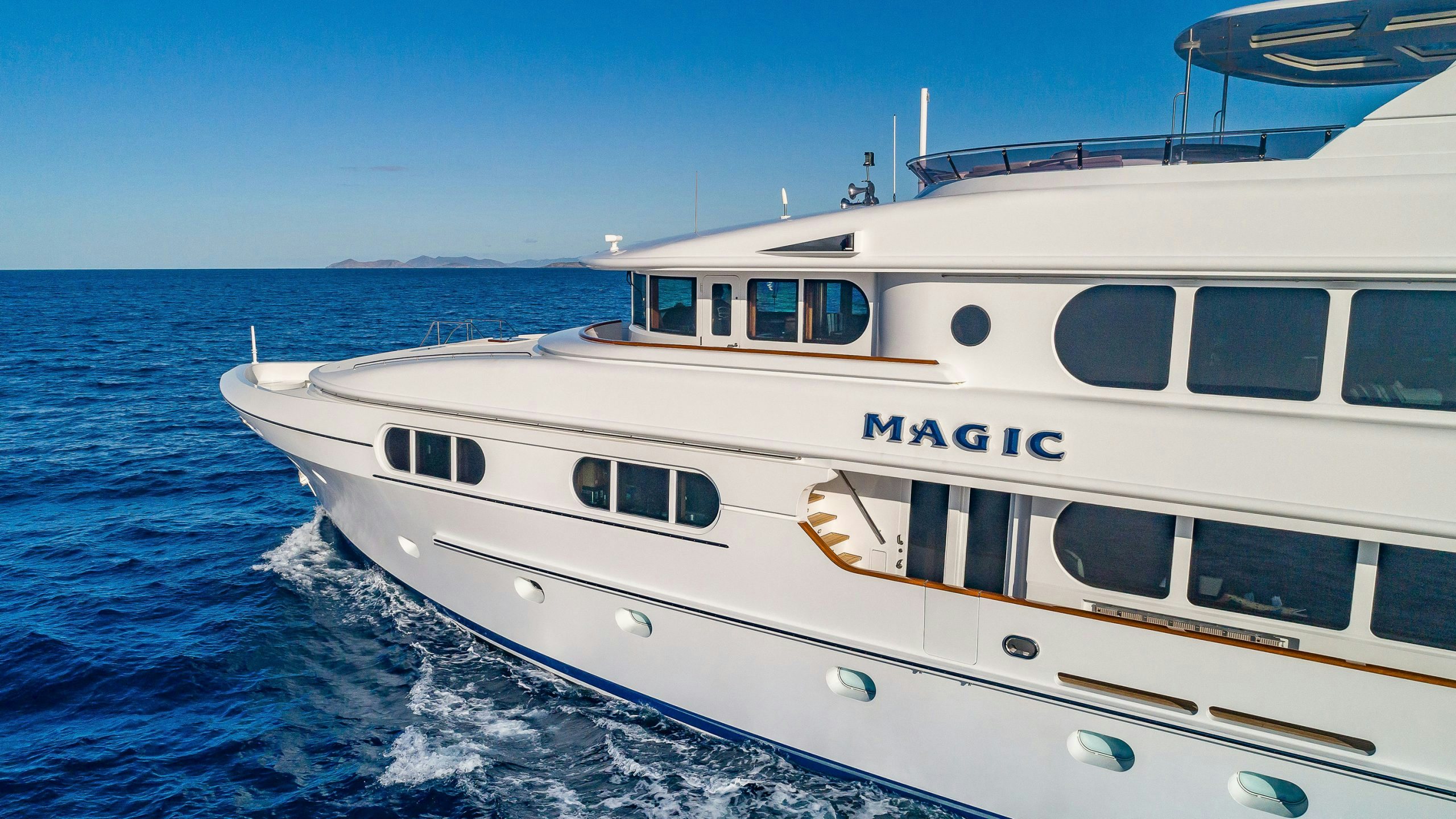 Northern Marine launched MAGIC in 2005 with exterior and Interior design by Ward Setzer. Her 6.6-foot (2m) shallow draft allows this luxury yacht to venture to the most beautiful islands. During her 2018 refit, MAGIC had stabilizers installed to provide her guests with a smooth passage or while at anchor.