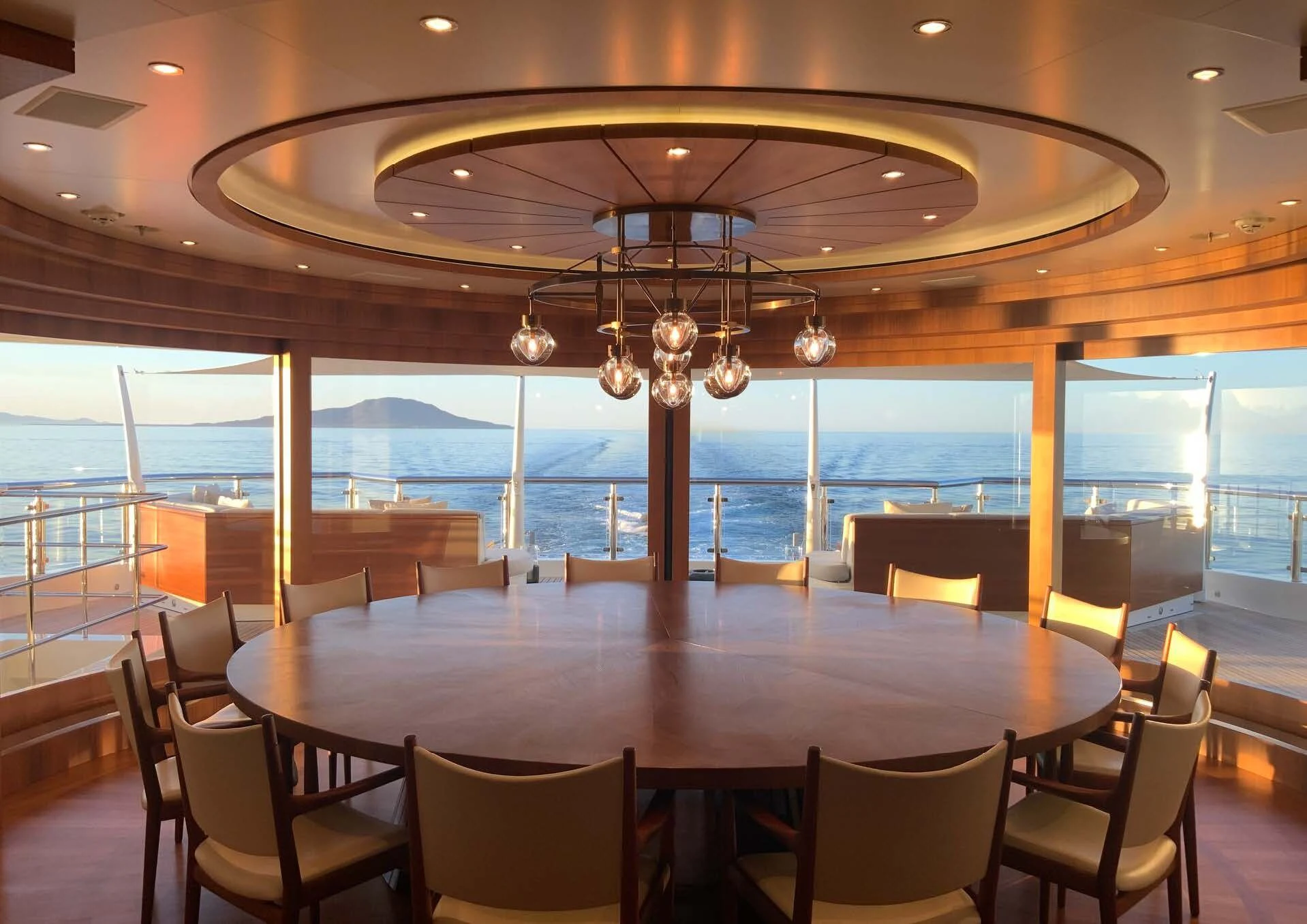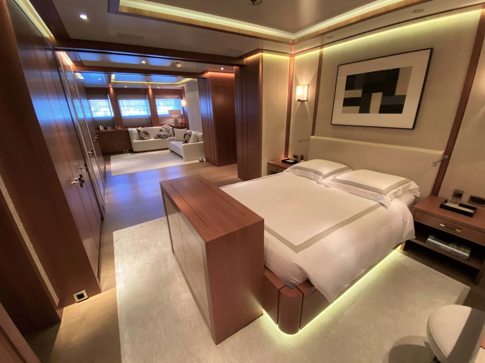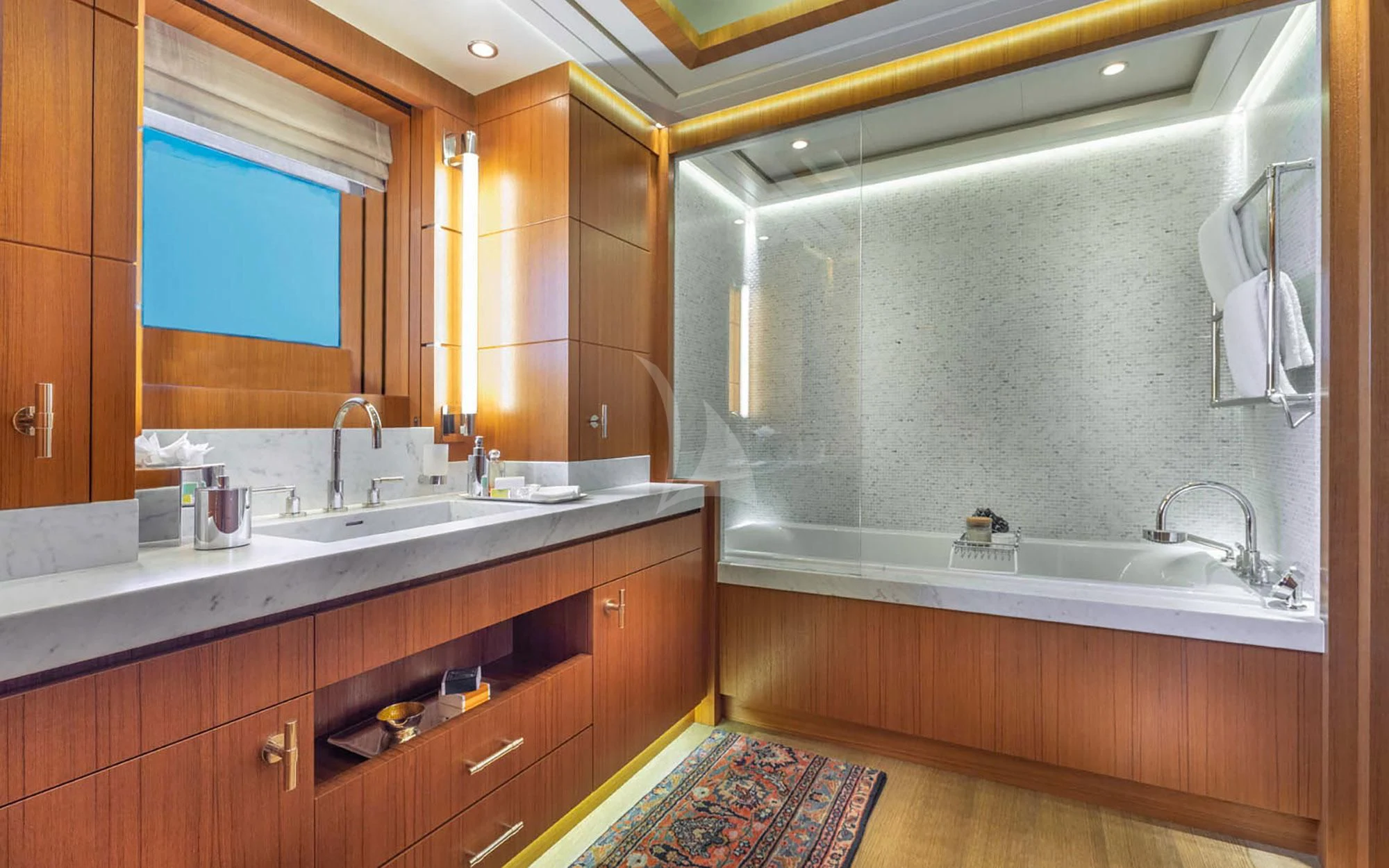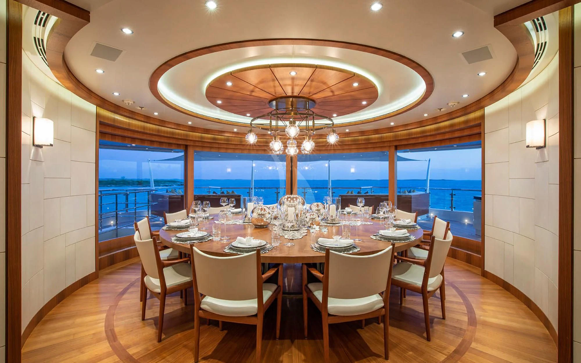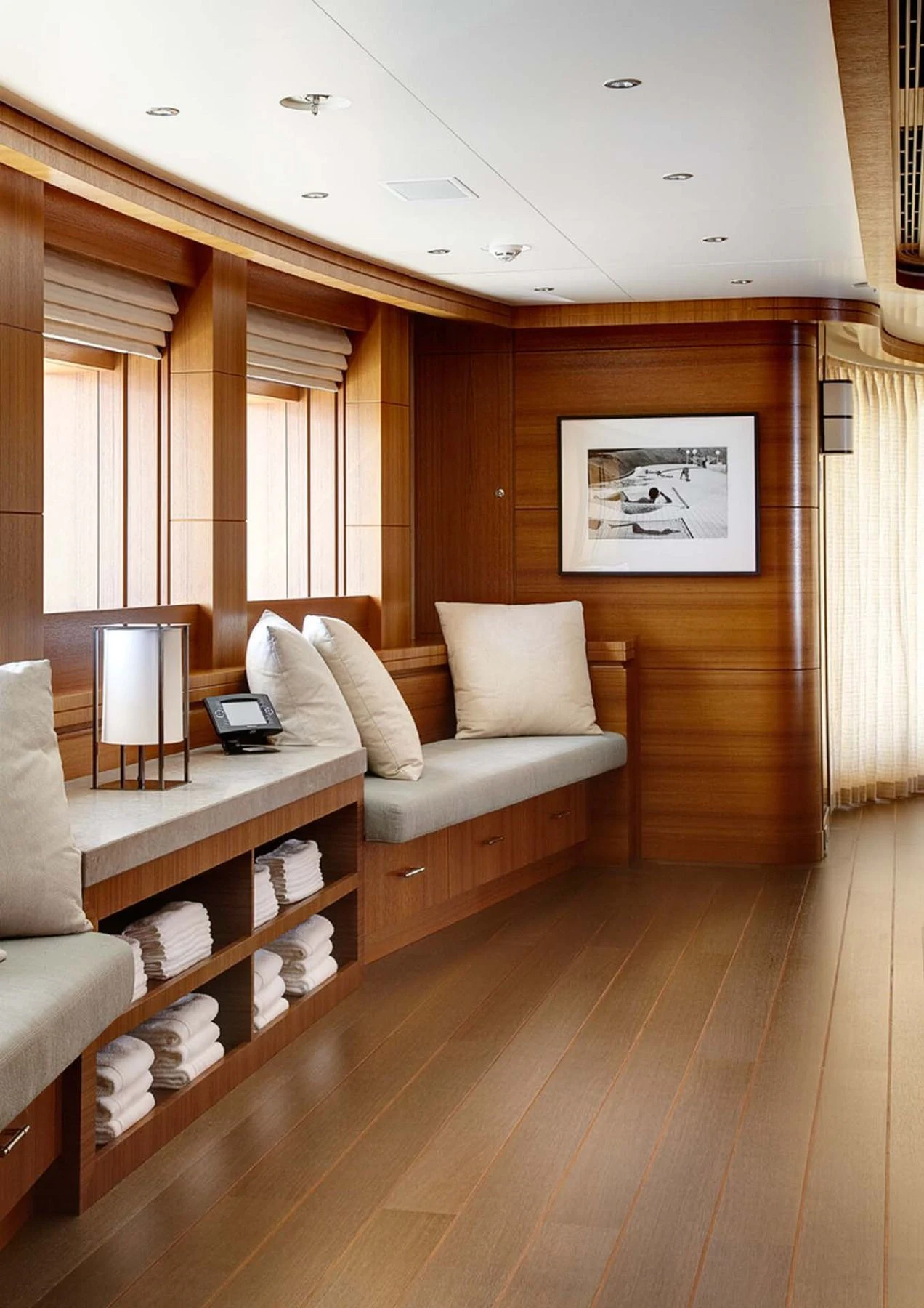 MAN OF STEEL’s gorgeous interiors are a study in elegant contemporary design. Created in collaboration between Nuvolari & Lenard and Molly Isaksen, the interiors feature walnut, teak and rosewood furnishing and finishes interspersed with natural materials, fabrics and colors. The main deck salon is a stunning space for relaxing and entertaining, while the upper deck is the place for formal dining at the impressive circular dining table—surrounded by windows and positioned for the views. There is also a sit-up bar for sipping cocktails while watching the passing vistas. After dinner, guests can dance the night away on the dedicated dancefloor or head to the state-of-the-art professional cinema with two tiers of seating for the ultimate onboard movie experience. A fully equipped gym is sure to keep the fitness fanatics happy, while the spa, with its sauna, hammam and treatment room, is ideal for rejuvenating tired limbs. An elevator ensures seamless access to the yacht’s four levels.