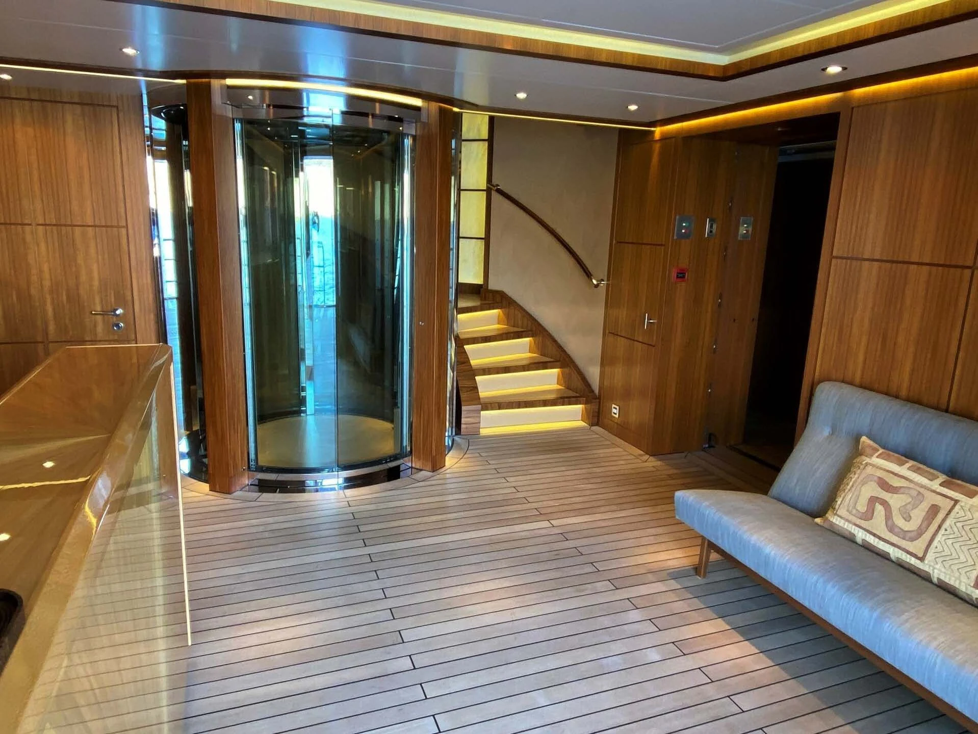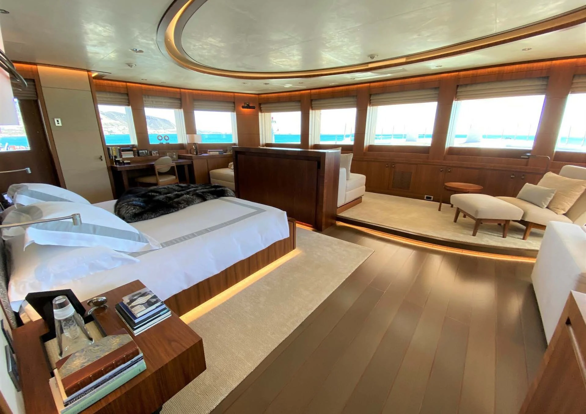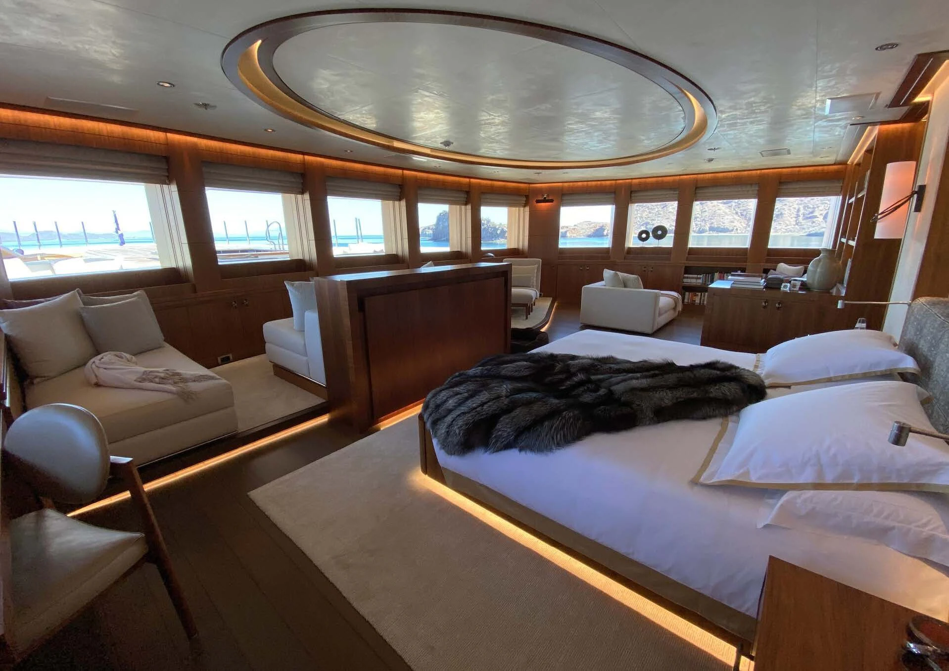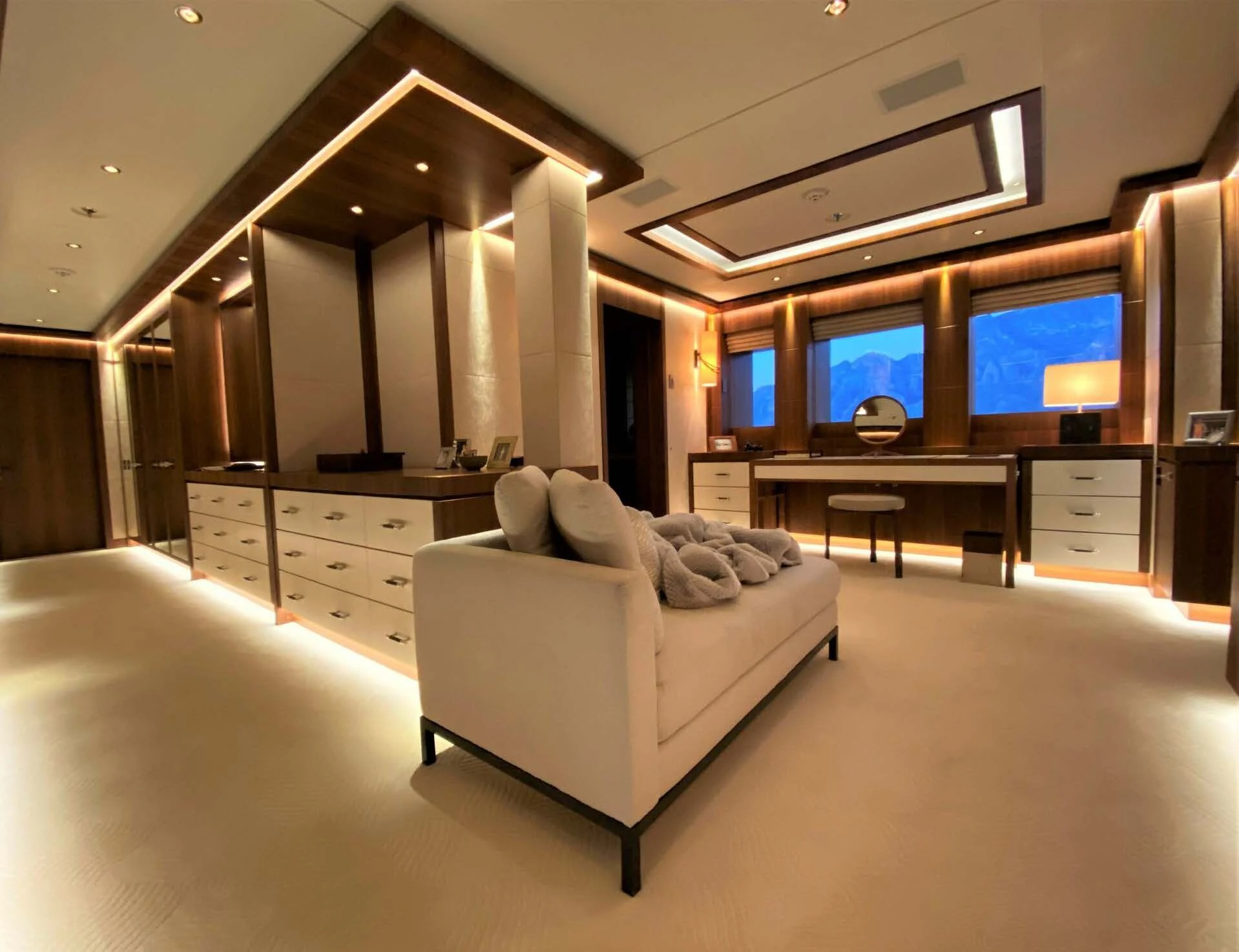 MAN OF STEEL’s gorgeous interiors are a study in elegant contemporary design. Created in collaboration between Nuvolari & Lenard and Molly Isaksen, the interiors feature walnut, teak and rosewood furnishing and finishes interspersed with natural materials, fabrics and colors. The main deck salon is a stunning space for relaxing and entertaining, while the upper deck is the place for formal dining at the impressive circular dining table—surrounded by windows and positioned for the views. There is also a sit-up bar for sipping cocktails while watching the passing vistas. After dinner, guests can dance the night away on the dedicated dancefloor or head to the state-of-the-art professional cinema with two tiers of seating for the ultimate onboard movie experience. A fully equipped gym is sure to keep the fitness fanatics happy, while the spa, with its sauna, hammam and treatment room, is ideal for rejuvenating tired limbs. An elevator ensures seamless access to the yacht’s four levels.