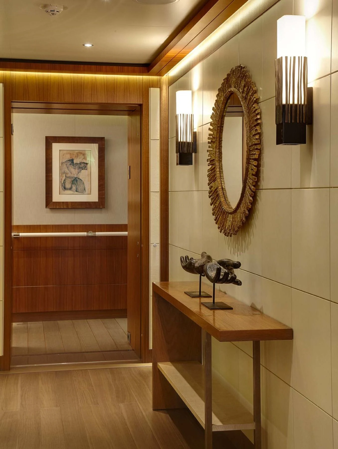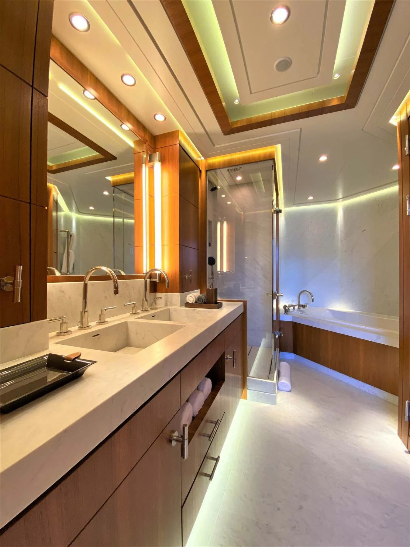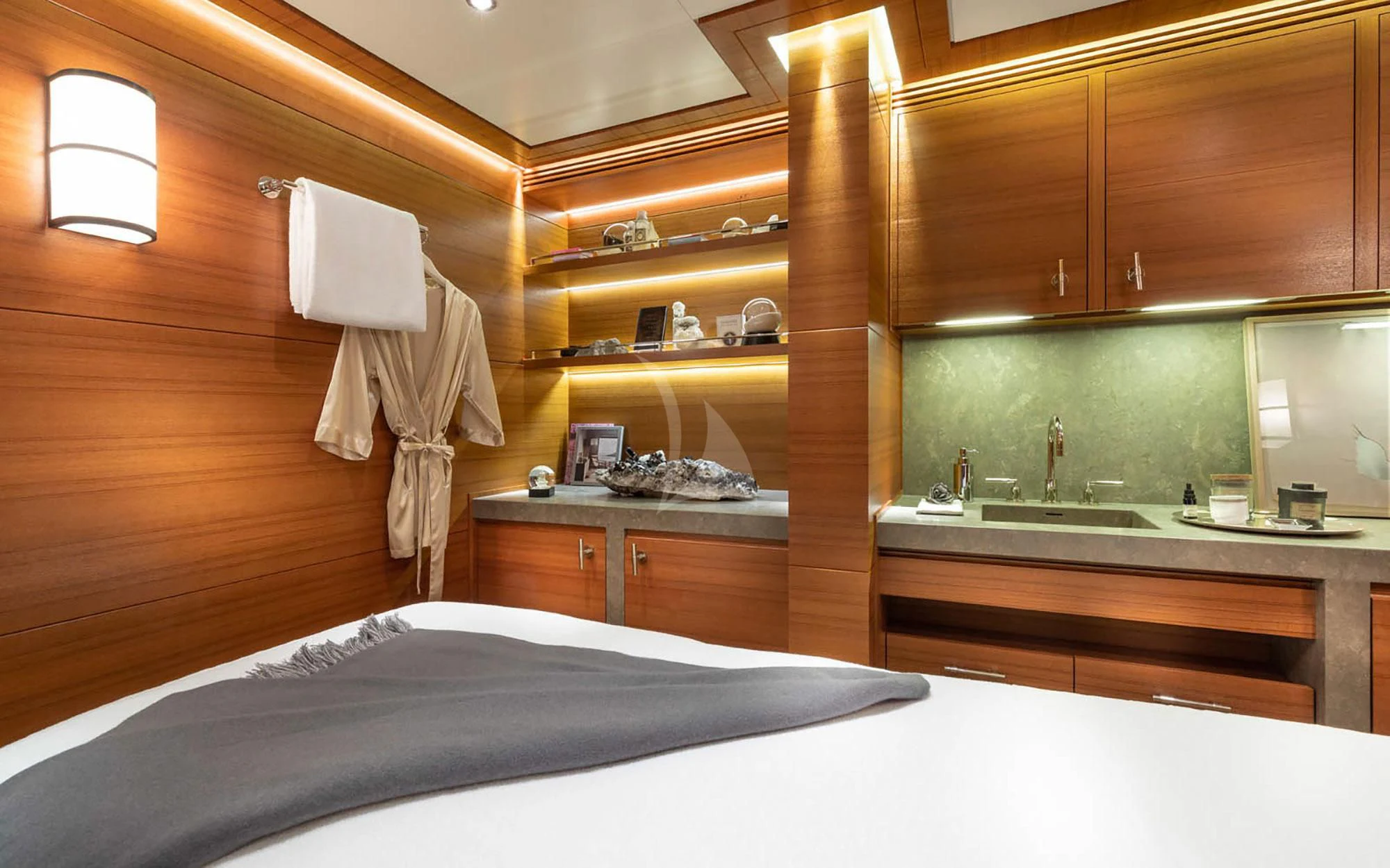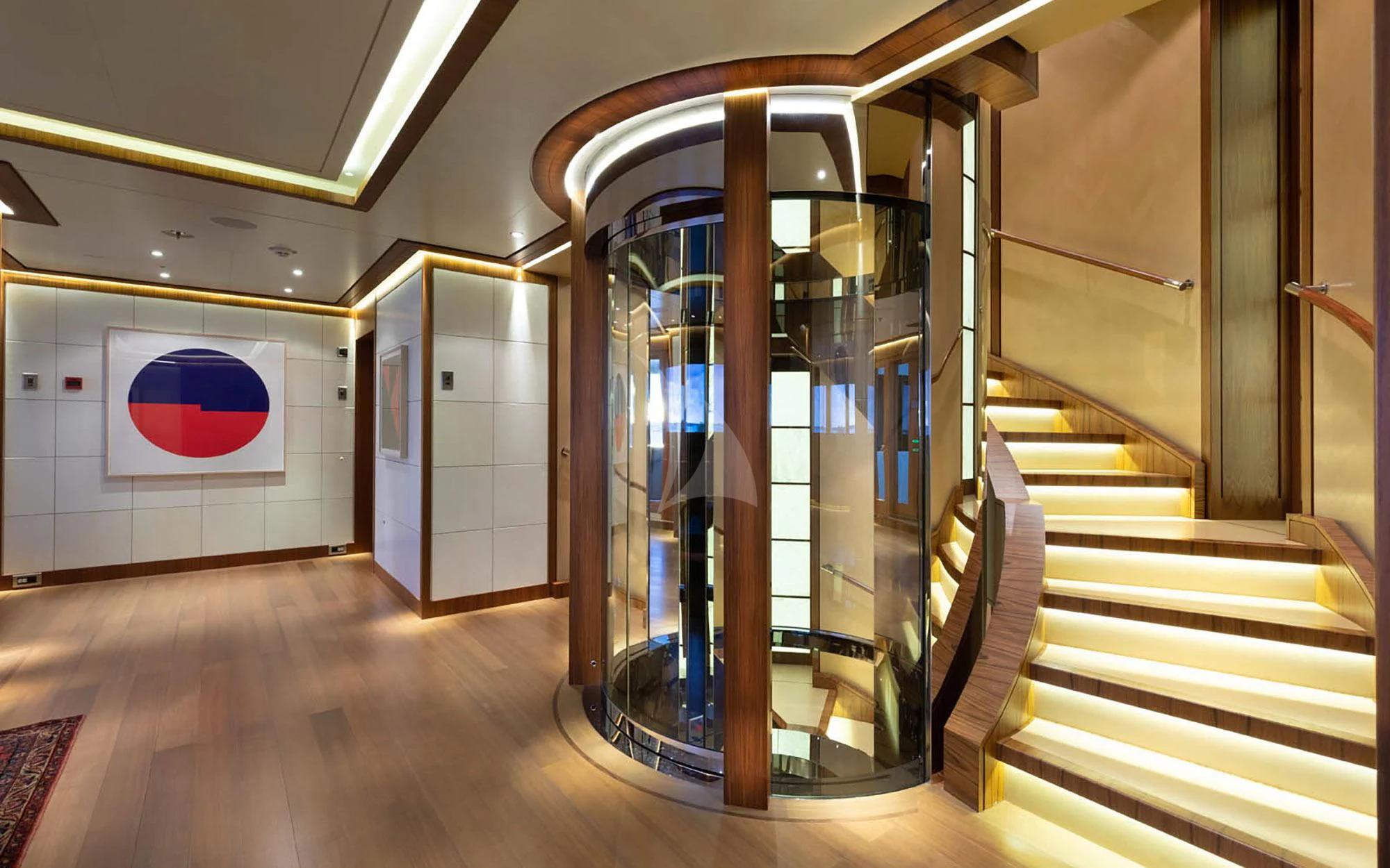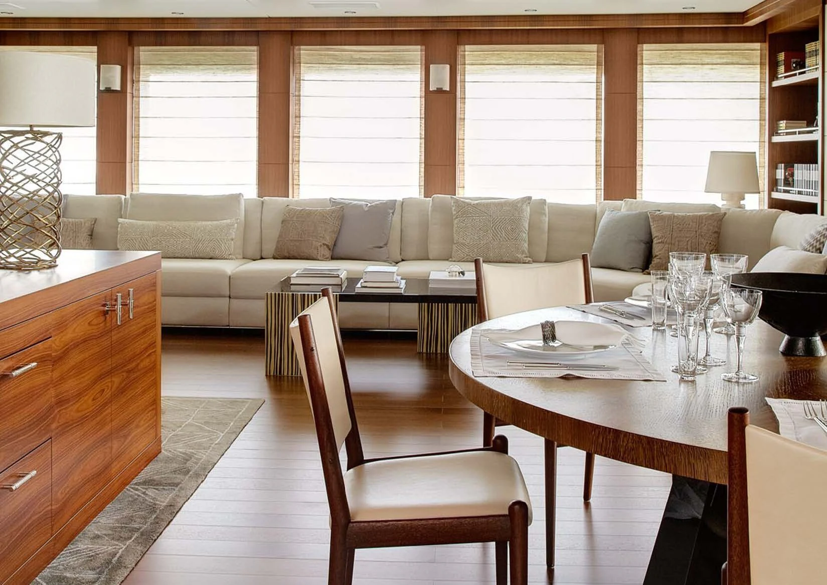 MAN OF STEEL’s gorgeous interiors are a study in elegant contemporary design. Created in collaboration between Nuvolari & Lenard and Molly Isaksen, the interiors feature walnut, teak and rosewood furnishing and finishes interspersed with natural materials, fabrics and colors. The main deck salon is a stunning space for relaxing and entertaining, while the upper deck is the place for formal dining at the impressive circular dining table—surrounded by windows and positioned for the views. There is also a sit-up bar for sipping cocktails while watching the passing vistas. After dinner, guests can dance the night away on the dedicated dancefloor or head to the state-of-the-art professional cinema with two tiers of seating for the ultimate onboard movie experience. A fully equipped gym is sure to keep the fitness fanatics happy, while the spa, with its sauna, hammam and treatment room, is ideal for rejuvenating tired limbs. An elevator ensures seamless access to the yacht’s four levels.