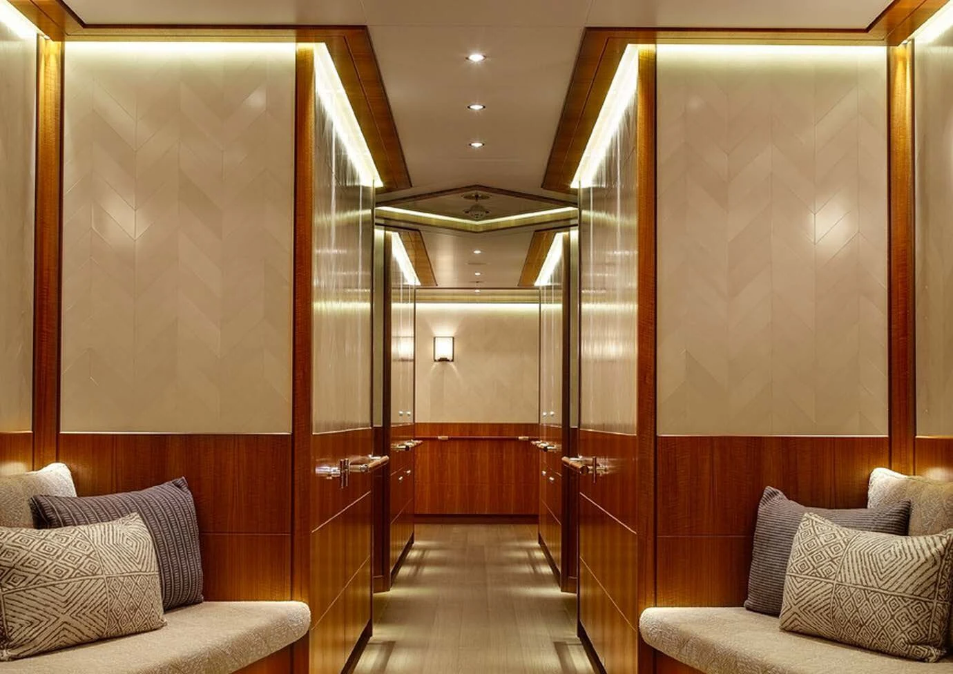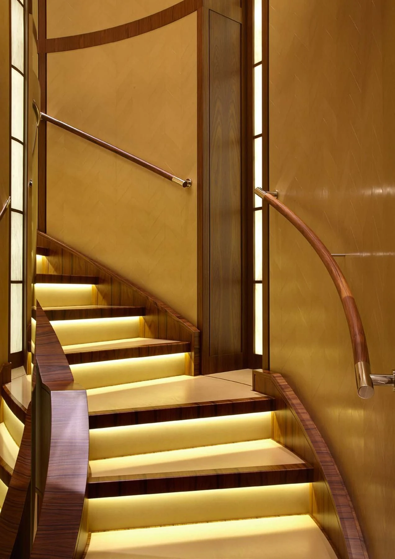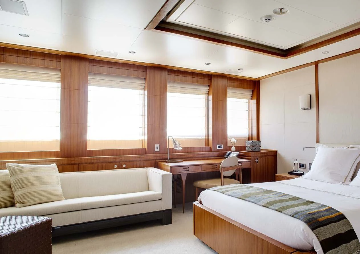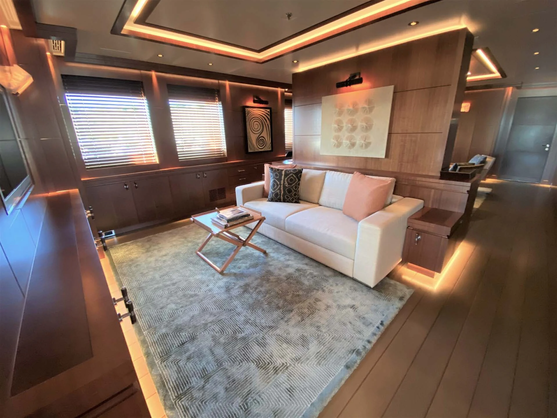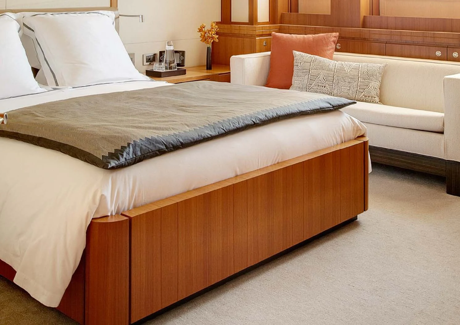 MAN OF STEEL’s gorgeous interiors are a study in elegant contemporary design. Created in collaboration between Nuvolari & Lenard and Molly Isaksen, the interiors feature walnut, teak and rosewood furnishing and finishes interspersed with natural materials, fabrics and colors. The main deck salon is a stunning space for relaxing and entertaining, while the upper deck is the place for formal dining at the impressive circular dining table—surrounded by windows and positioned for the views. There is also a sit-up bar for sipping cocktails while watching the passing vistas. After dinner, guests can dance the night away on the dedicated dancefloor or head to the state-of-the-art professional cinema with two tiers of seating for the ultimate onboard movie experience. A fully equipped gym is sure to keep the fitness fanatics happy, while the spa, with its sauna, hammam and treatment room, is ideal for rejuvenating tired limbs. An elevator ensures seamless access to the yacht’s four levels.
