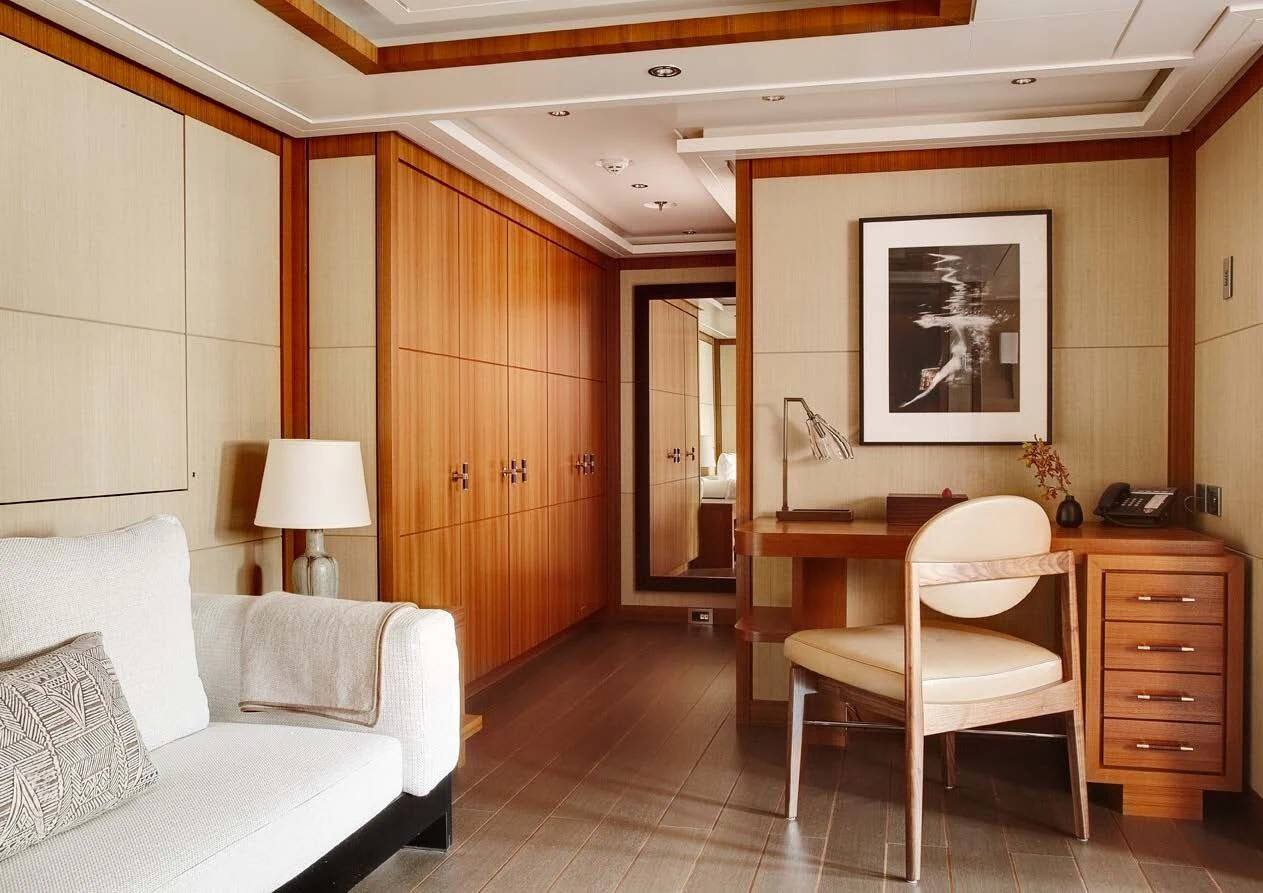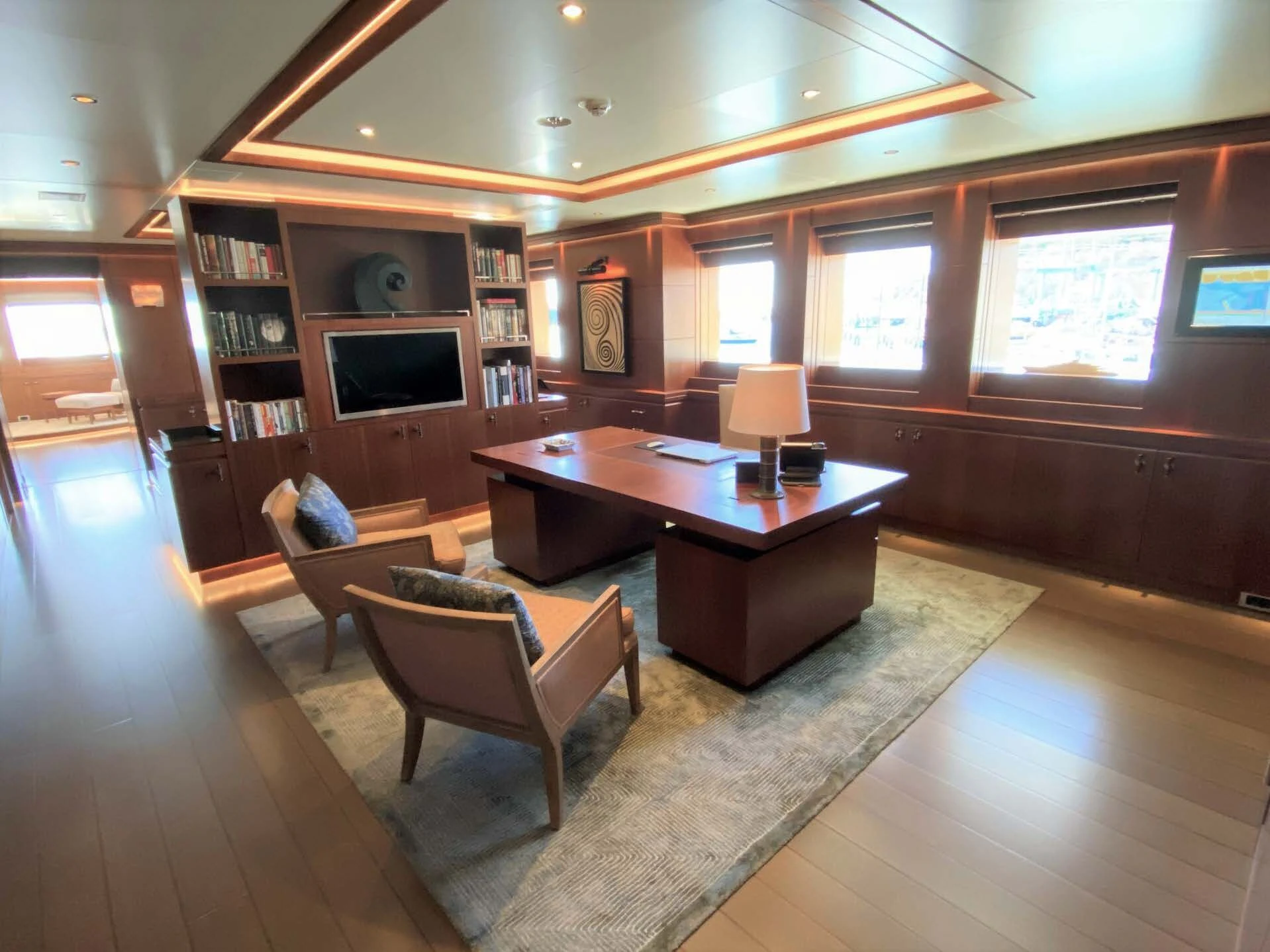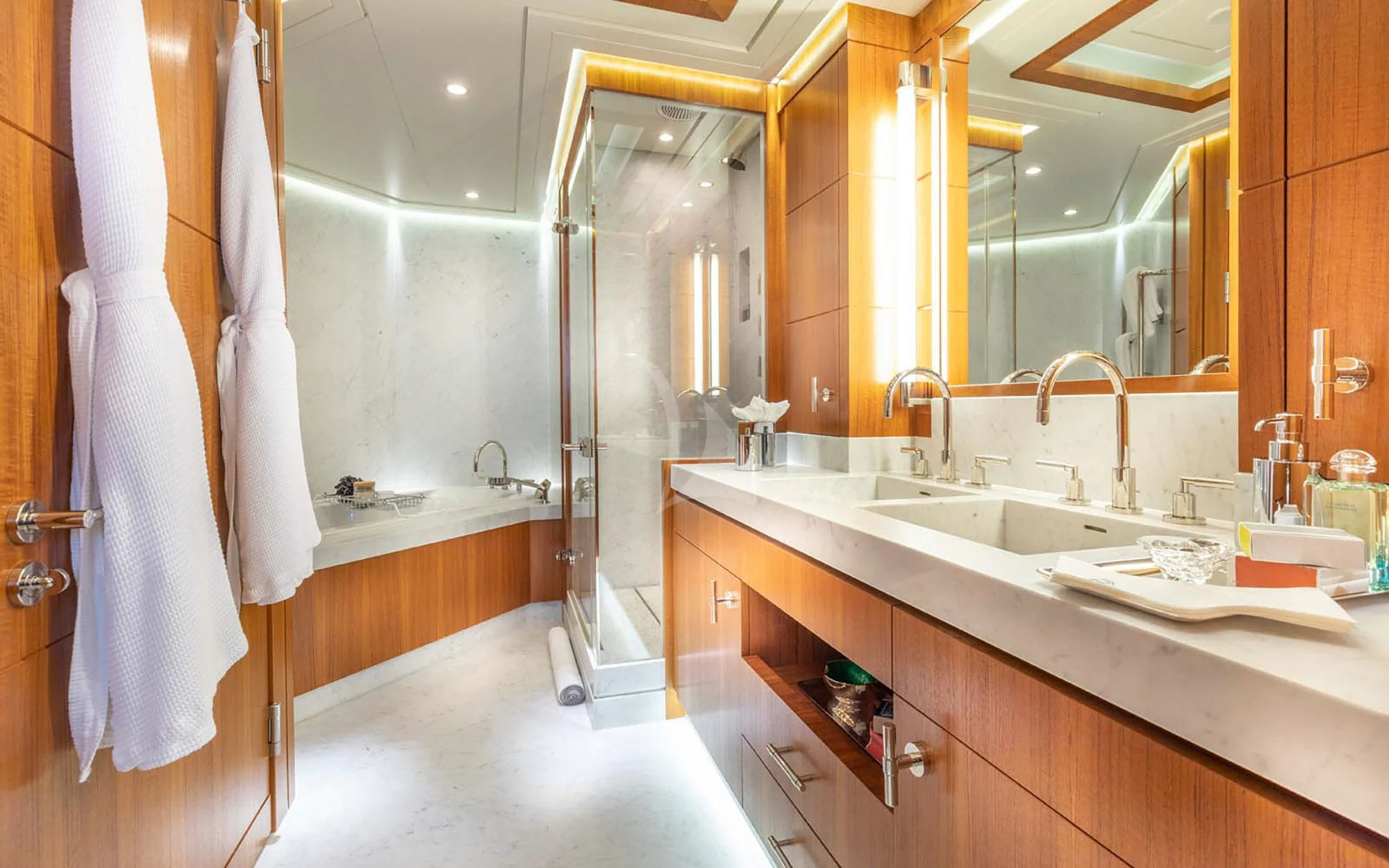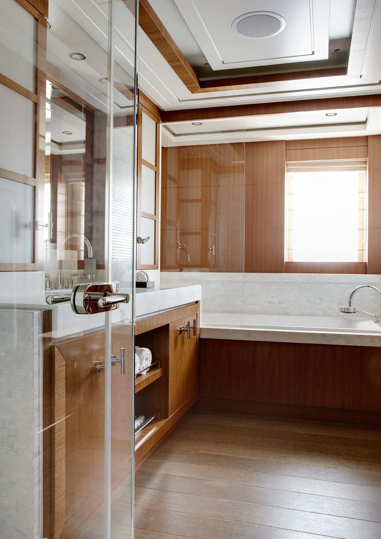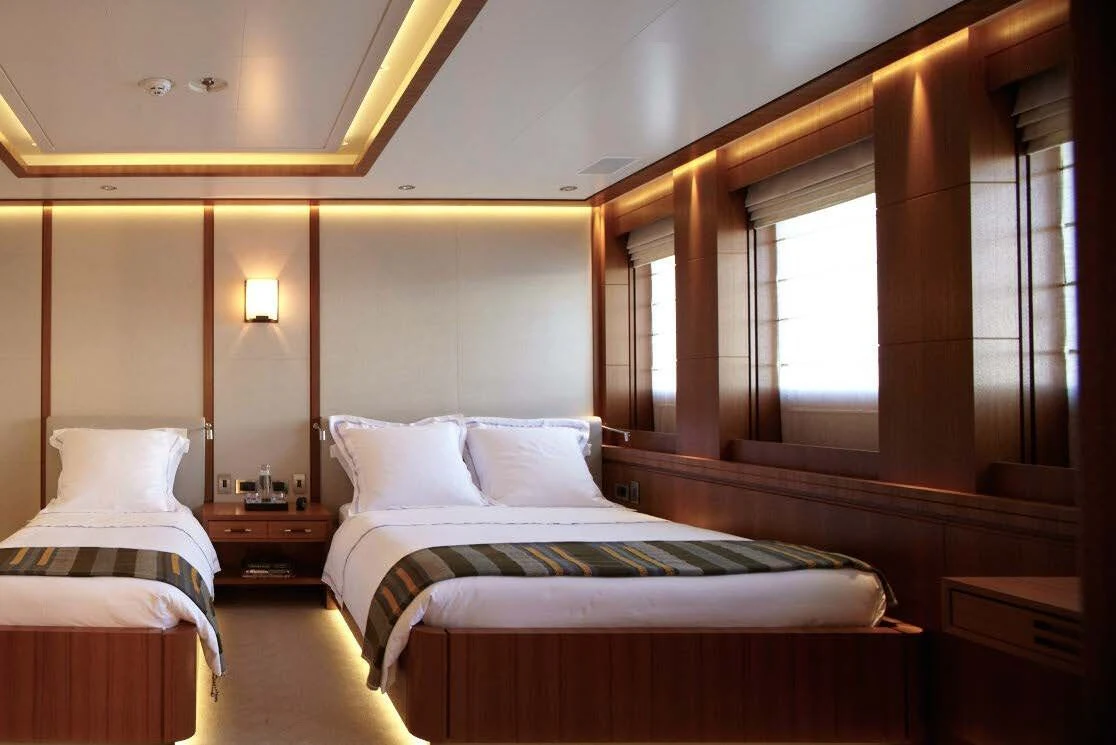 MAN OF STEEL’s gorgeous interiors are a study in elegant contemporary design. Created in collaboration between Nuvolari & Lenard and Molly Isaksen, the interiors feature walnut, teak and rosewood furnishing and finishes interspersed with natural materials, fabrics and colors. The main deck salon is a stunning space for relaxing and entertaining, while the upper deck is the place for formal dining at the impressive circular dining table—surrounded by windows and positioned for the views. There is also a sit-up bar for sipping cocktails while watching the passing vistas. After dinner, guests can dance the night away on the dedicated dancefloor or head to the state-of-the-art professional cinema with two tiers of seating for the ultimate onboard movie experience. A fully equipped gym is sure to keep the fitness fanatics happy, while the spa, with its sauna, hammam and treatment room, is ideal for rejuvenating tired limbs. An elevator ensures seamless access to the yacht’s four levels.