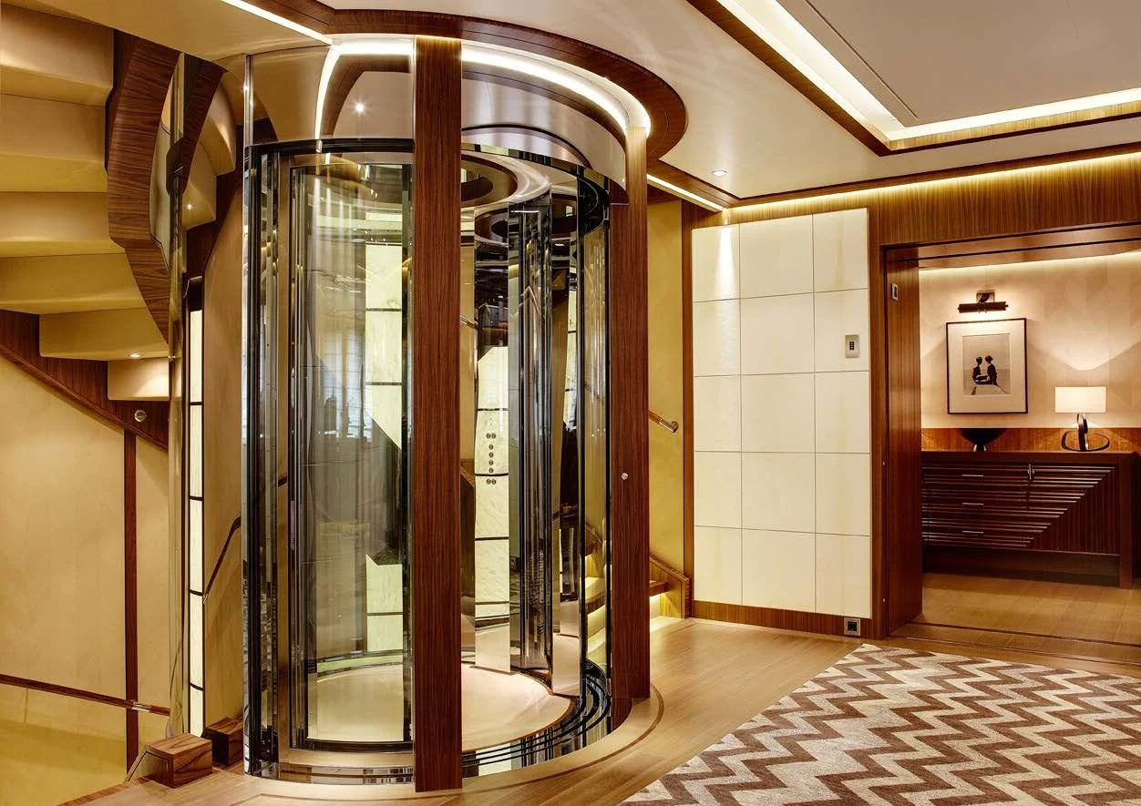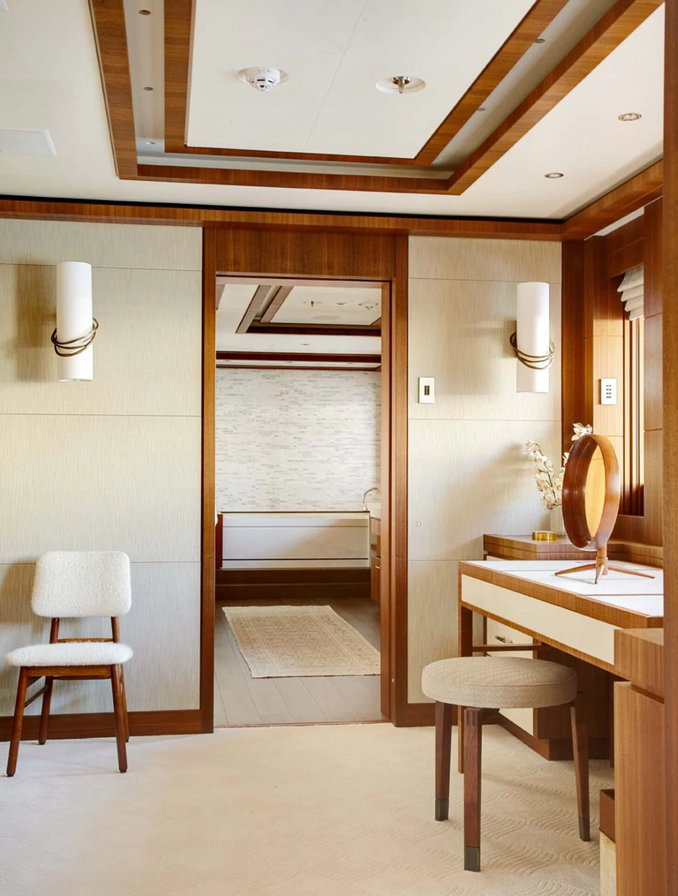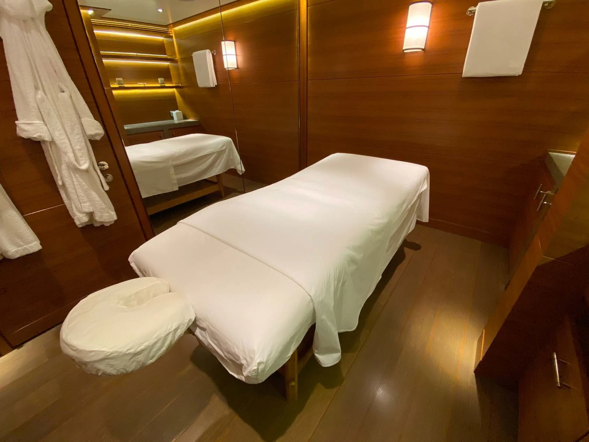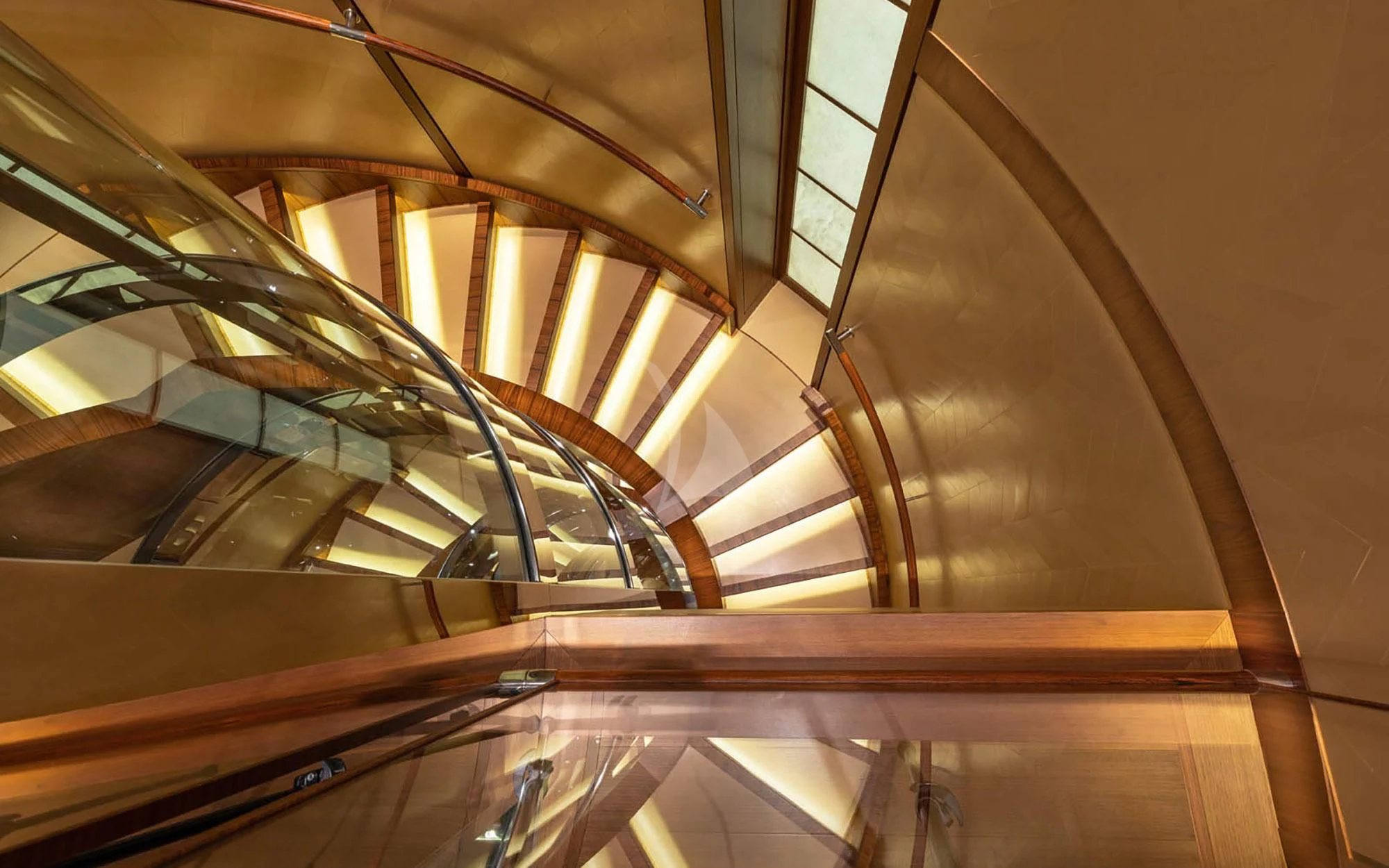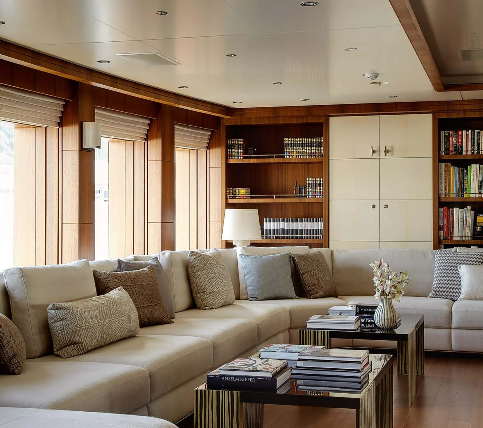 MAN OF STEEL’s gorgeous interiors are a study in elegant contemporary design. Created in collaboration between Nuvolari & Lenard and Molly Isaksen, the interiors feature walnut, teak and rosewood furnishing and finishes interspersed with natural materials, fabrics and colors. The main deck salon is a stunning space for relaxing and entertaining, while the upper deck is the place for formal dining at the impressive circular dining table—surrounded by windows and positioned for the views. There is also a sit-up bar for sipping cocktails while watching the passing vistas. After dinner, guests can dance the night away on the dedicated dancefloor or head to the state-of-the-art professional cinema with two tiers of seating for the ultimate onboard movie experience. A fully equipped gym is sure to keep the fitness fanatics happy, while the spa, with its sauna, hammam and treatment room, is ideal for rejuvenating tired limbs. An elevator ensures seamless access to the yacht’s four levels.