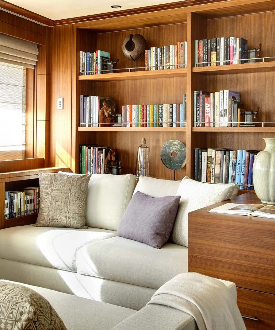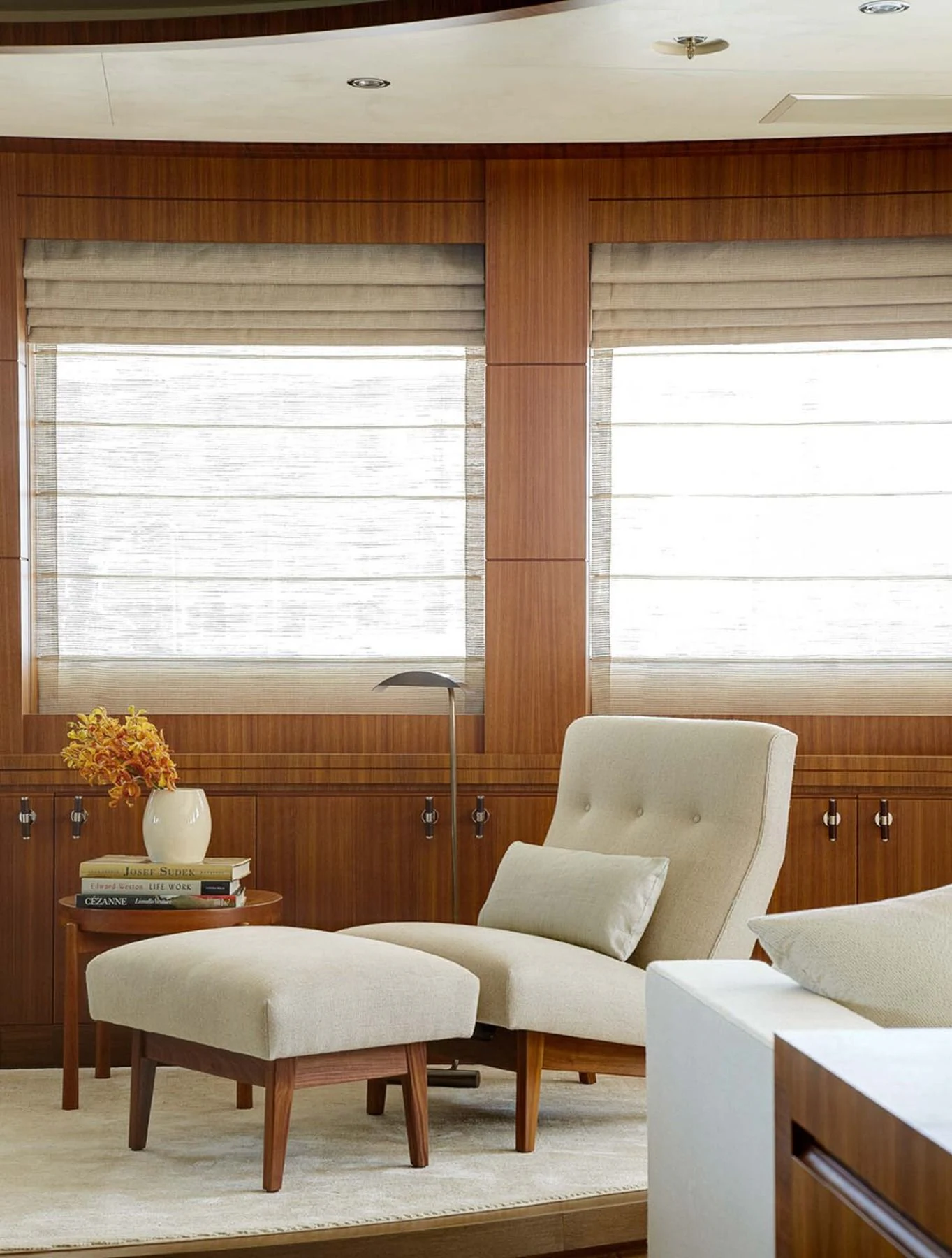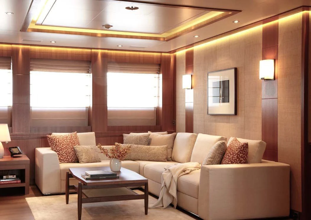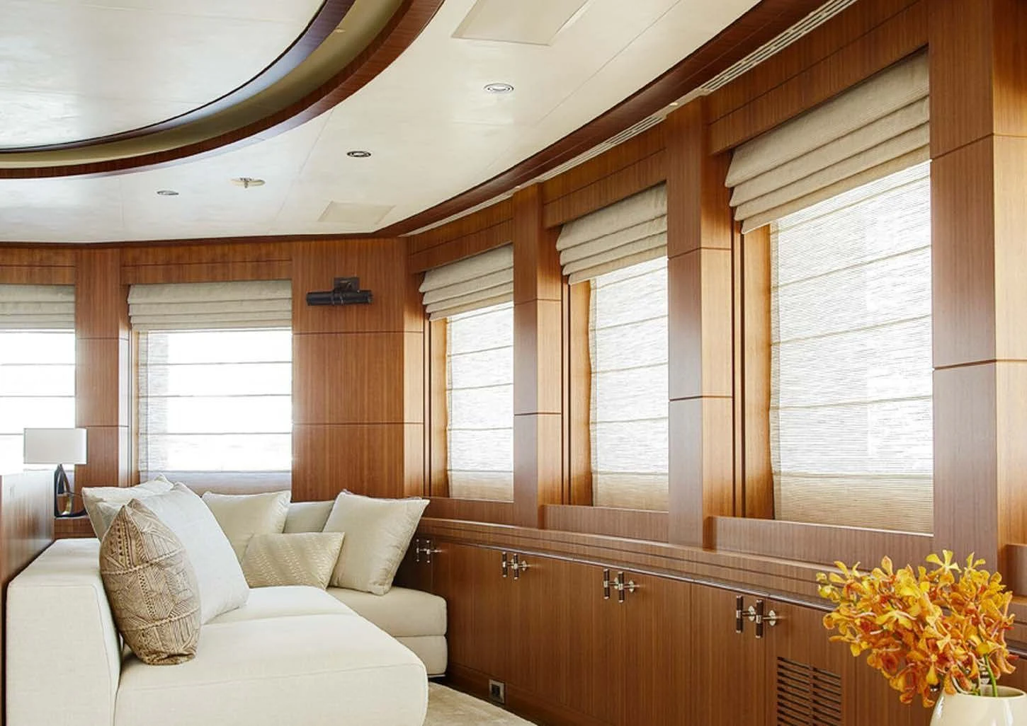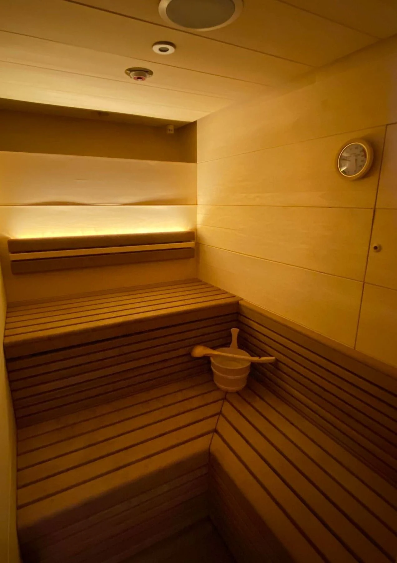 MAN OF STEEL’s gorgeous interiors are a study in elegant contemporary design. Created in collaboration between Nuvolari & Lenard and Molly Isaksen, the interiors feature walnut, teak and rosewood furnishing and finishes interspersed with natural materials, fabrics and colors. The main deck salon is a stunning space for relaxing and entertaining, while the upper deck is the place for formal dining at the impressive circular dining table—surrounded by windows and positioned for the views. There is also a sit-up bar for sipping cocktails while watching the passing vistas. After dinner, guests can dance the night away on the dedicated dancefloor or head to the state-of-the-art professional cinema with two tiers of seating for the ultimate onboard movie experience. A fully equipped gym is sure to keep the fitness fanatics happy, while the spa, with its sauna, hammam and treatment room, is ideal for rejuvenating tired limbs. An elevator ensures seamless access to the yacht’s four levels.