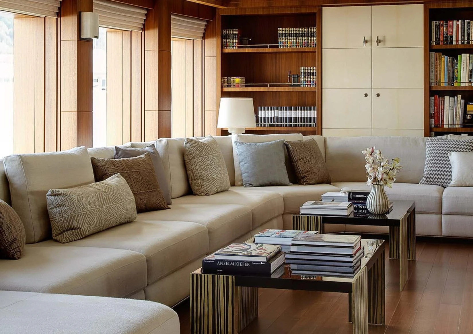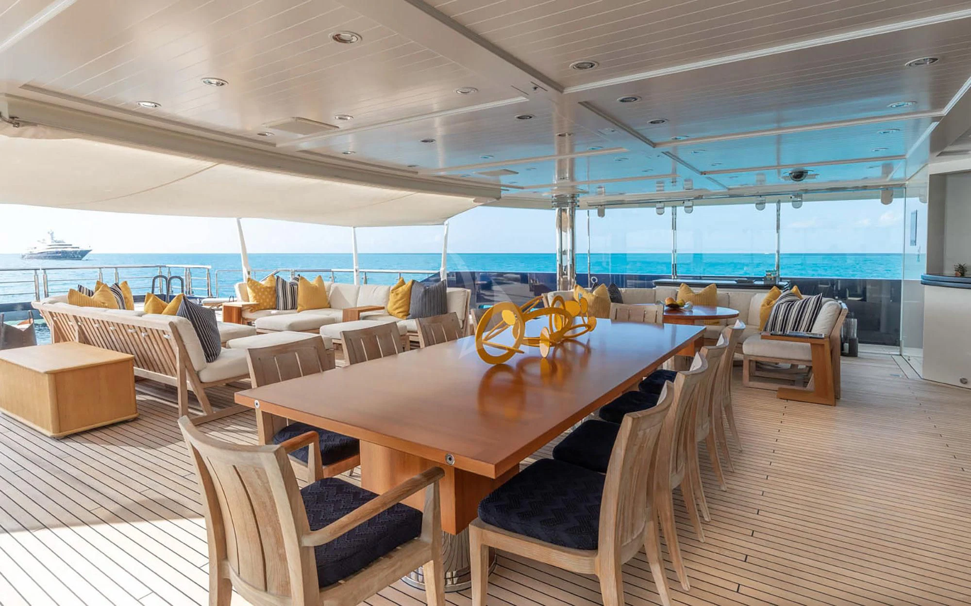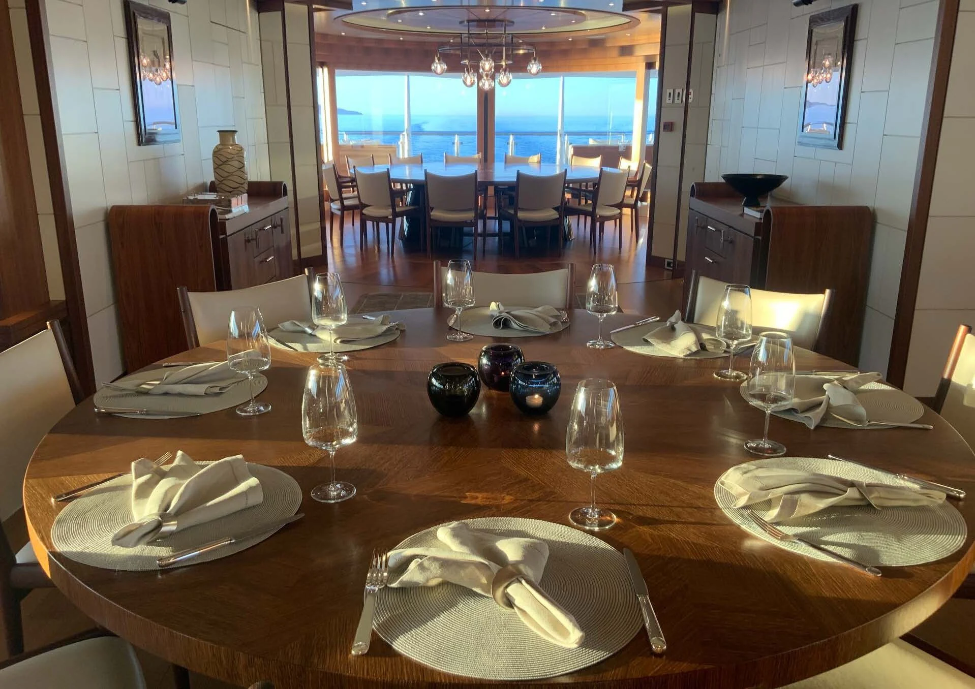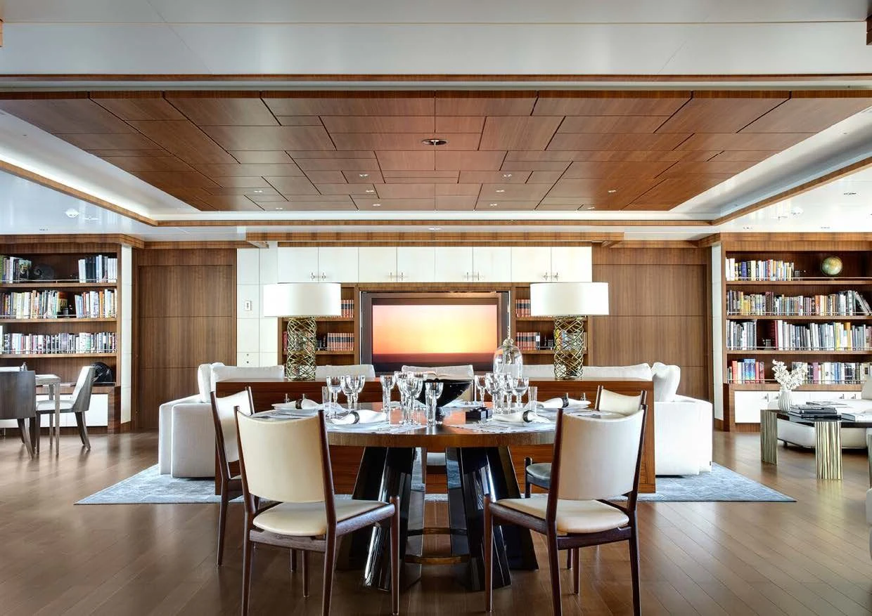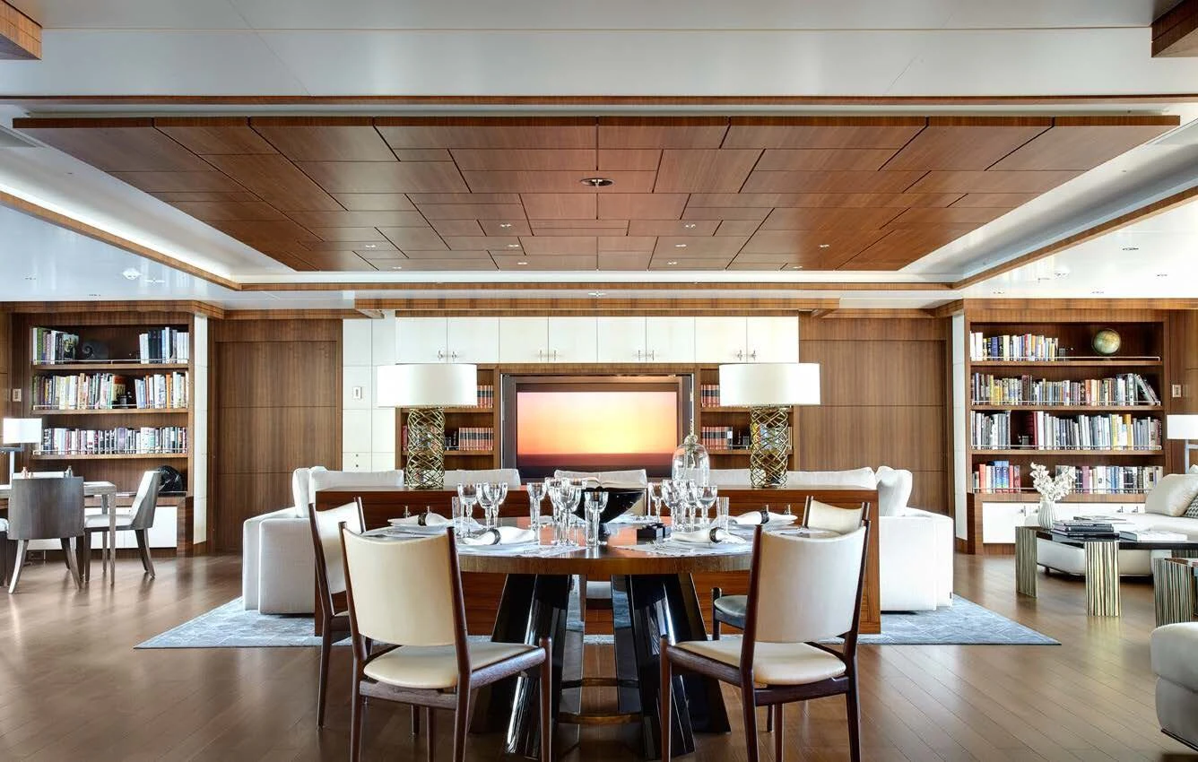 Decks on MAN OF STEEL are expansive, offering endless options for dining, relaxing and soaking in the rays. During the day, guests are bound to gravitate to the vast aft deck with its stunning infinity edge pool and uninterrupted sea views. This 820-square-foot space can be used for everything from relaxed al fresco dining to the most formal black-tie events. The pool can be covered for dancing under the stars or be left open and lit from below to create a fabulous ambiance. There is also a special projector that can screen a movie on the glass wall of the pool so guests can watch a film while in the water.