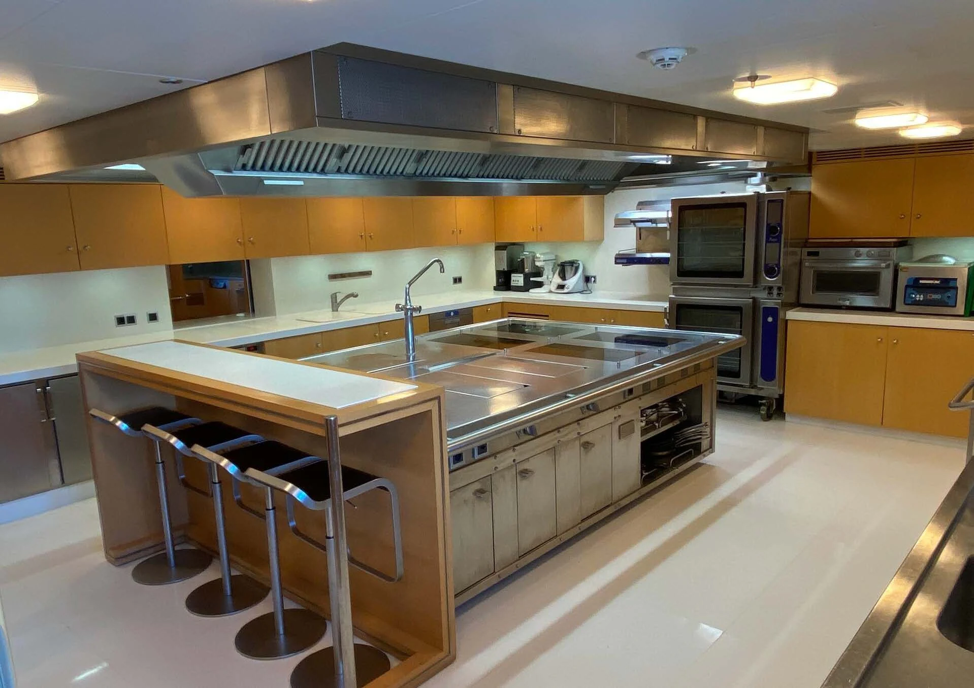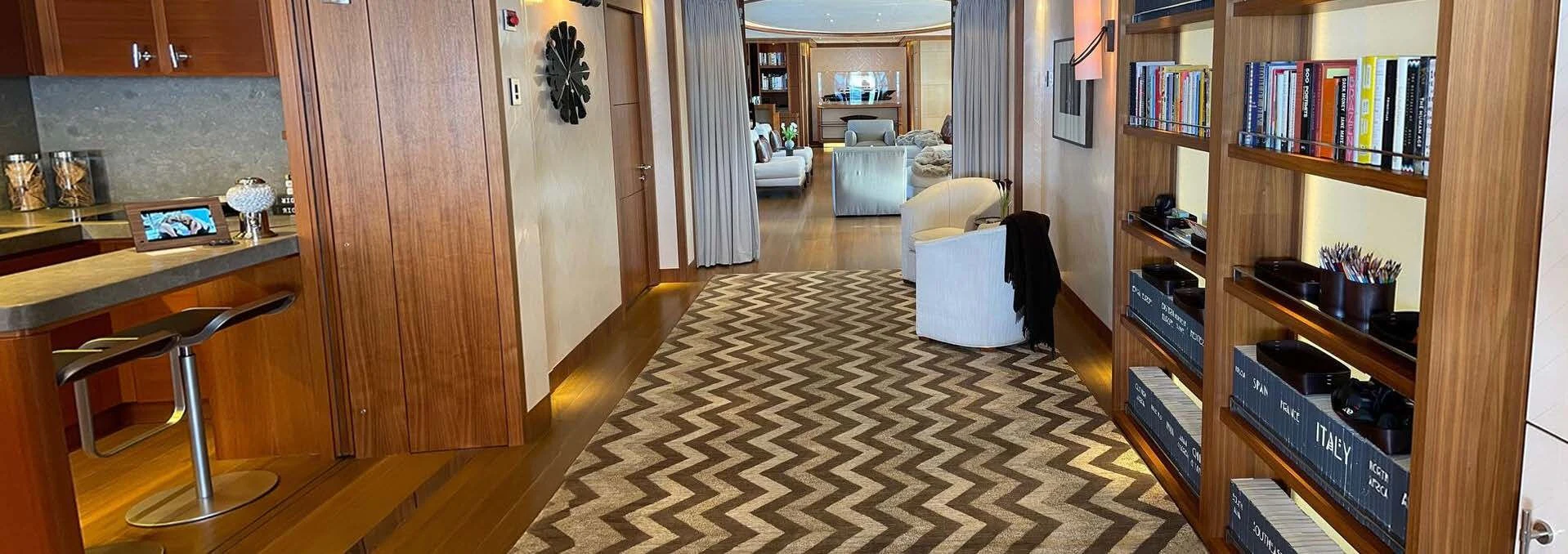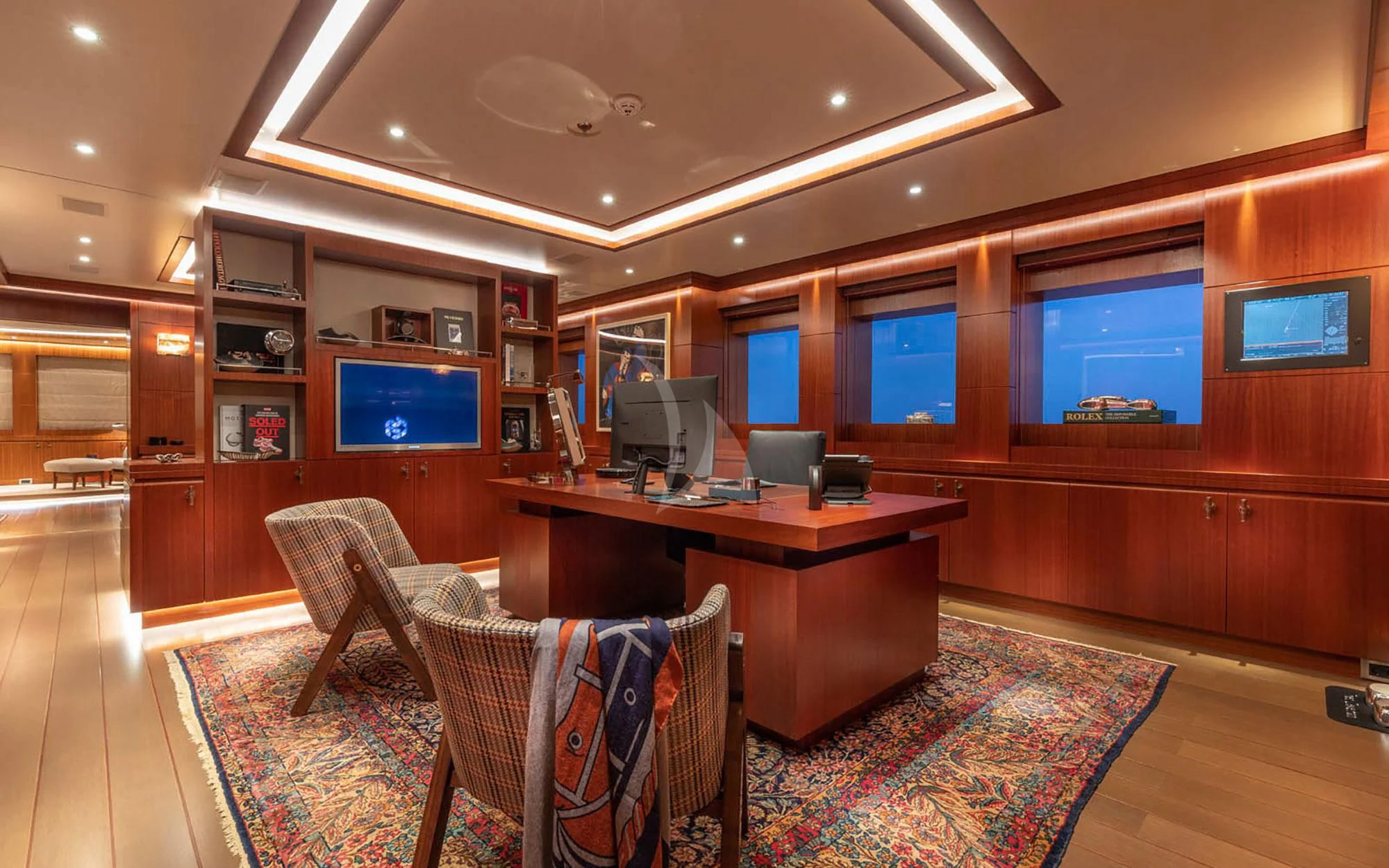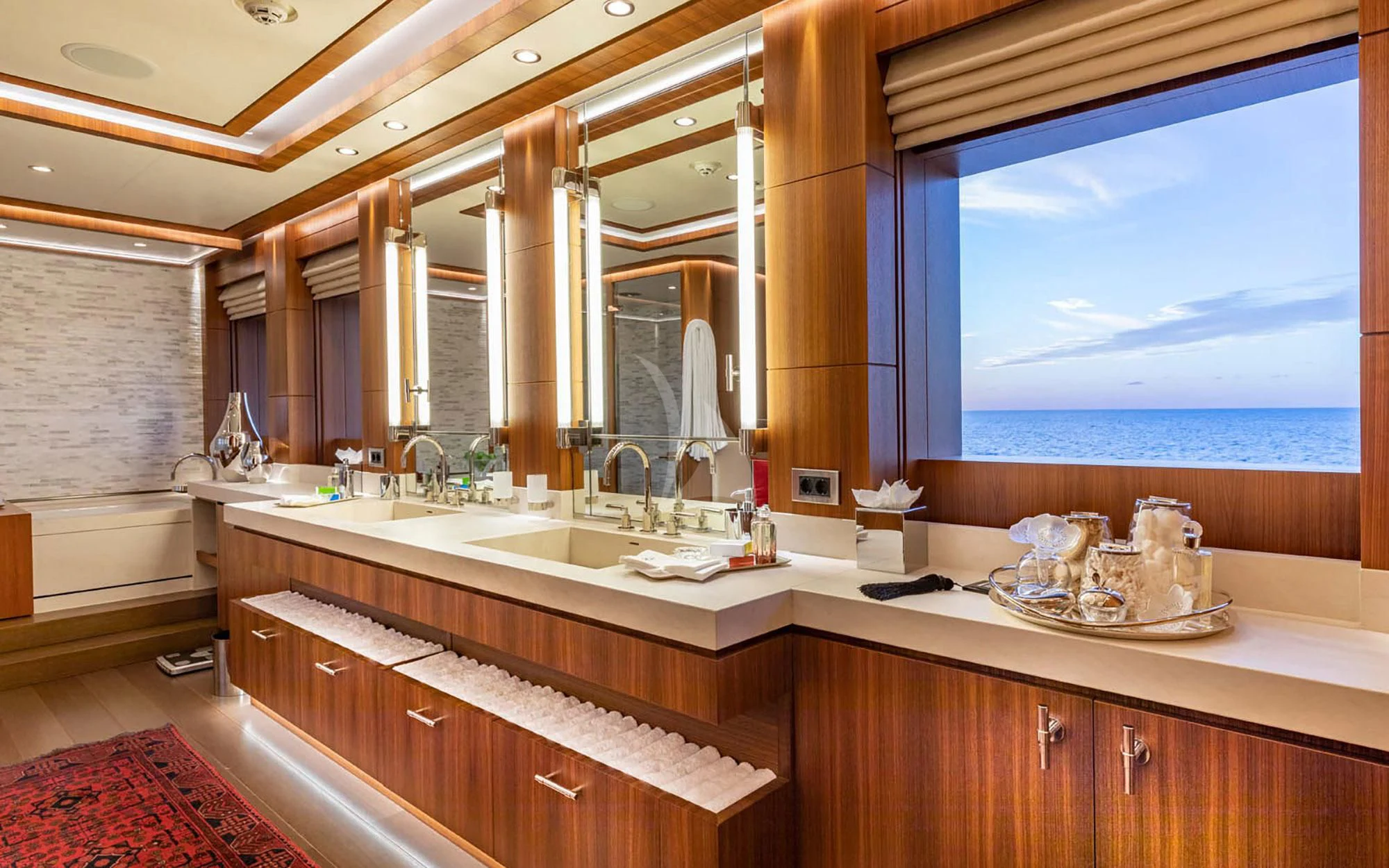 At the end of a long day, MAN OF STEEL’s 12 guests can choose from seven restful retreats. The real scene-stealer has to be the owner’s suite, which features a full-beam stateroom with 180-degree views, en-suite and dressing room, along with an office and a terrace with its own private jacuzzi and space for lounging and sunbathing. There’s a full beam VIP stateroom and an additional three double cabins and one triple on the main deck all with dedicated en-suite facilities and luxurious amenities. A further ‘sea cabin’ can be found on the lower deck also with dedicated en-suite facilities that’s big enough for three people.