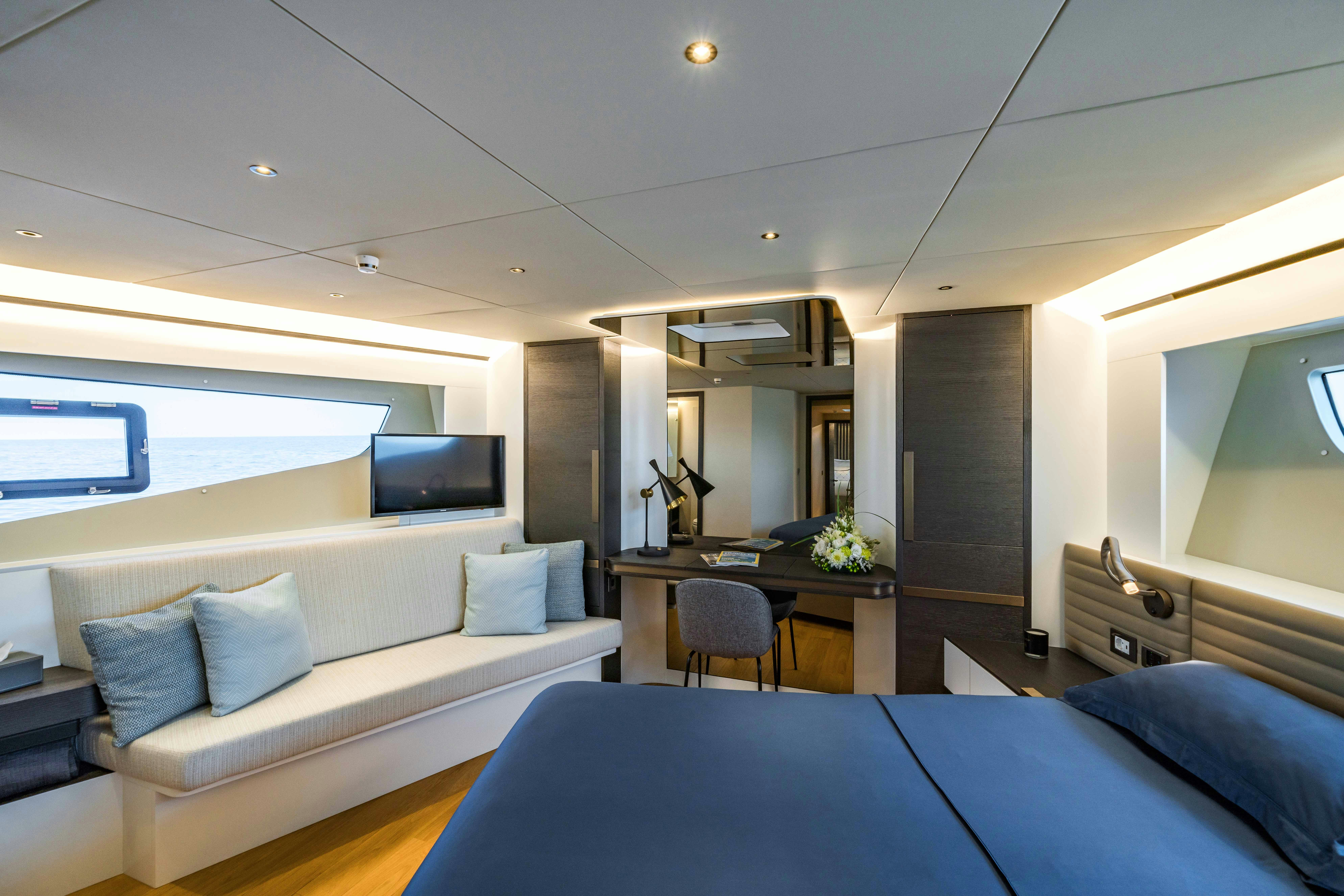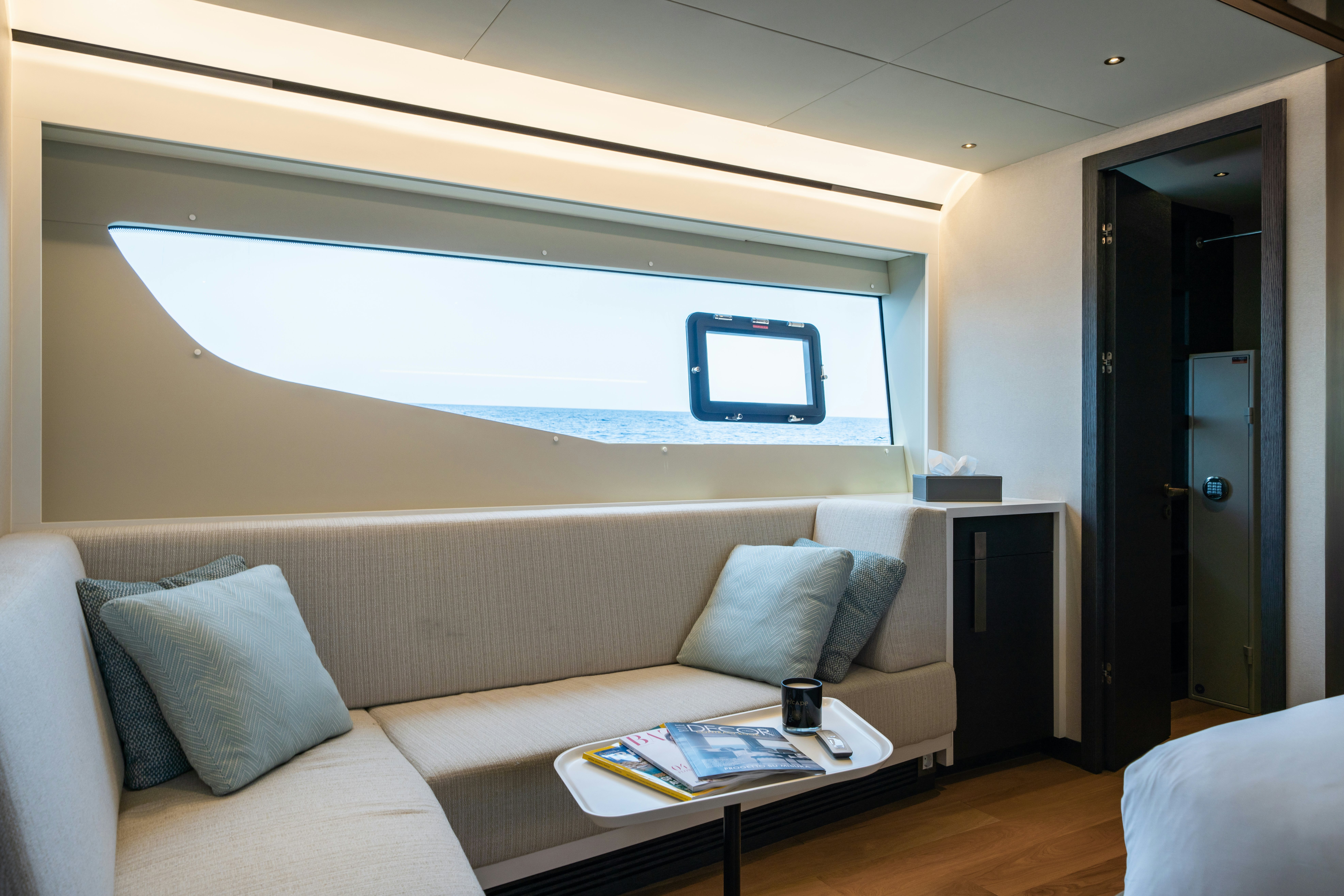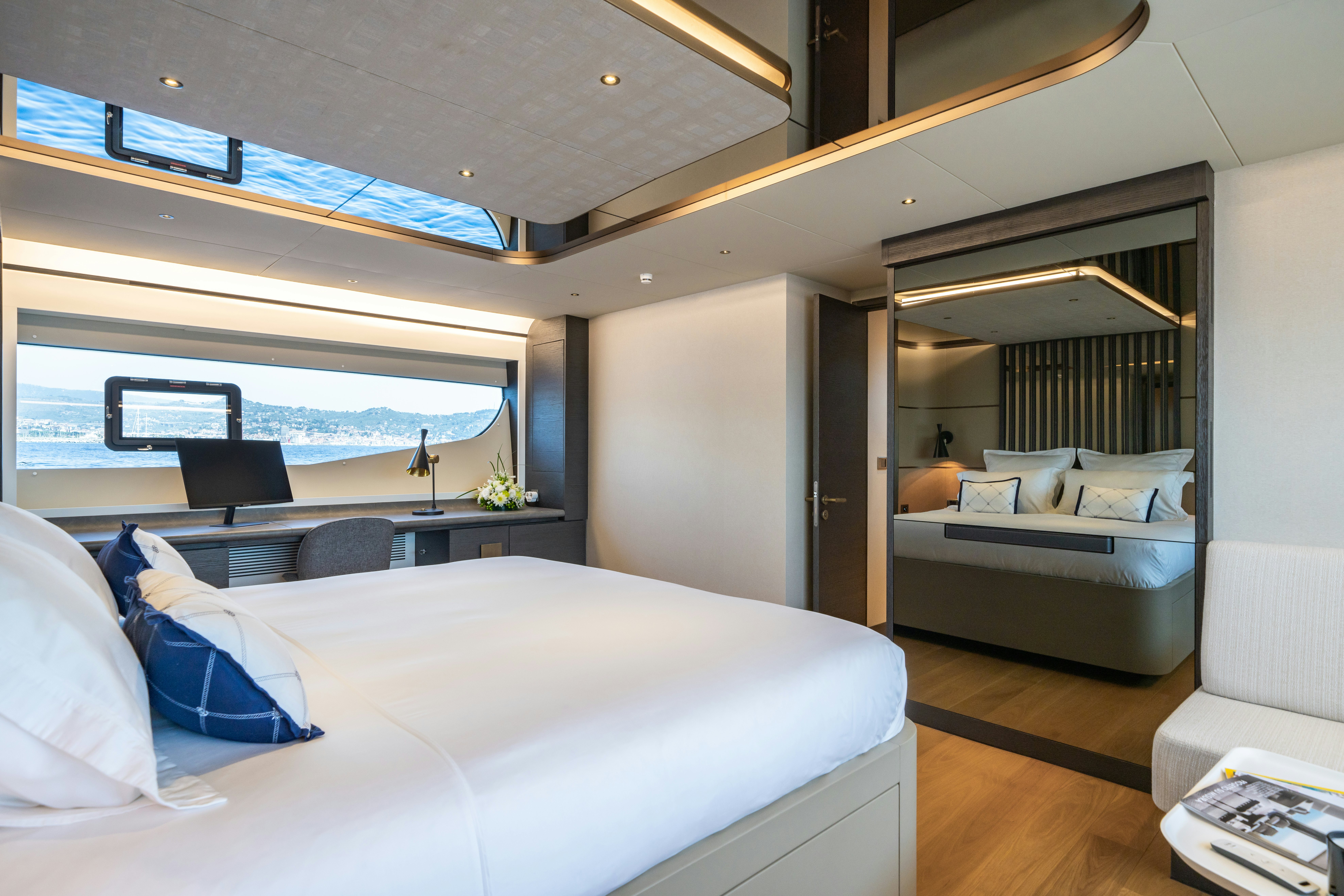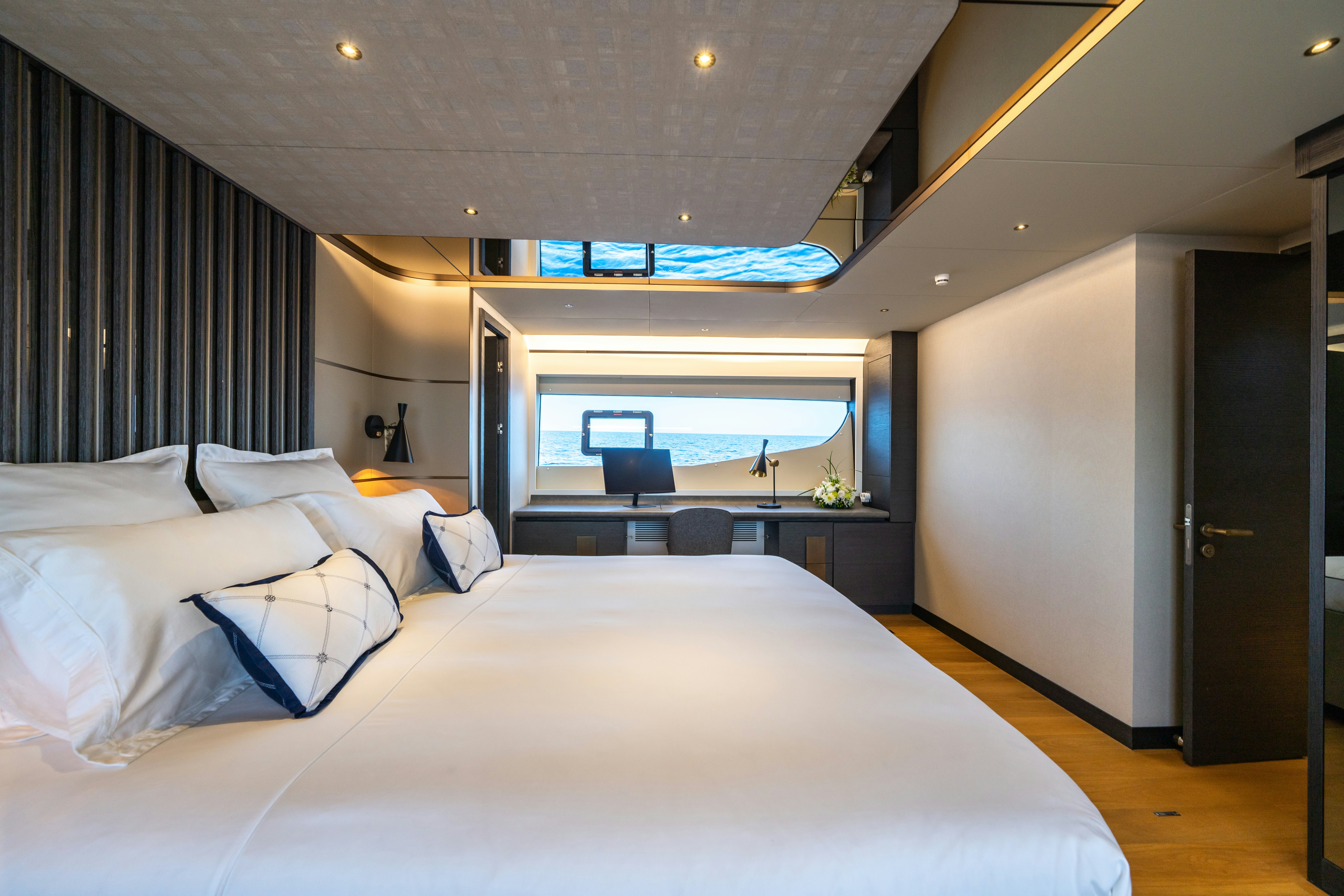 MAORIA can comfortably sleep six guests in three luxurious staterooms, including a full-beam master cabin, a large VIP double cabin, and a double cabin. The full-beam master stateroom is located aft and features a spacious double bed, a walk-in wardrobe with a safe, and a large L-shaped sofa and desk. The VIP double cabin is located forward and boasts a full-beam layout, a double bed, good storage, a sofa, and a desk. The double cabin is located port side and features a double bed and a wardrobe. All staterooms come with their own en-suite shower rooms and plenty of amenities to ensure guests feel right at home.