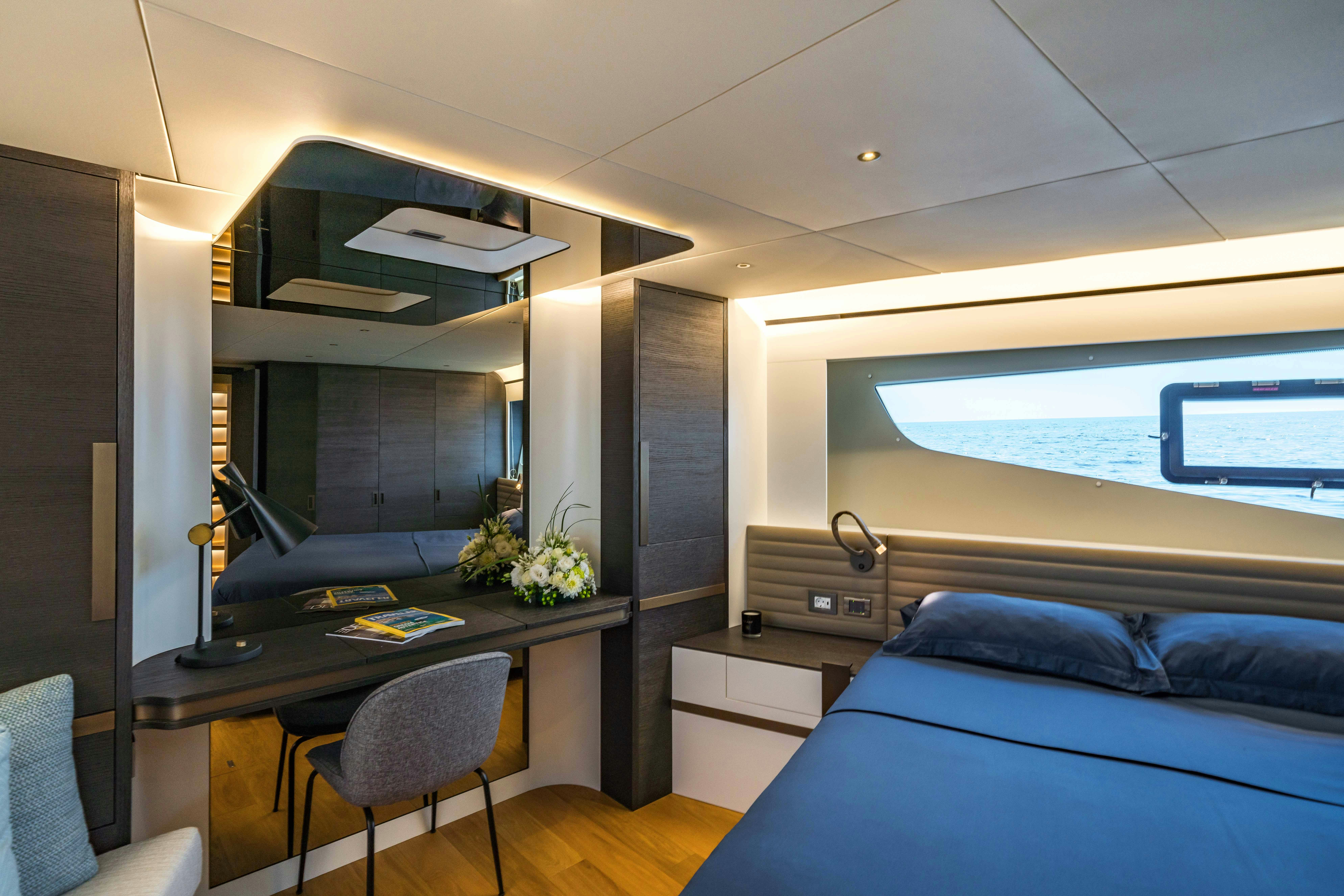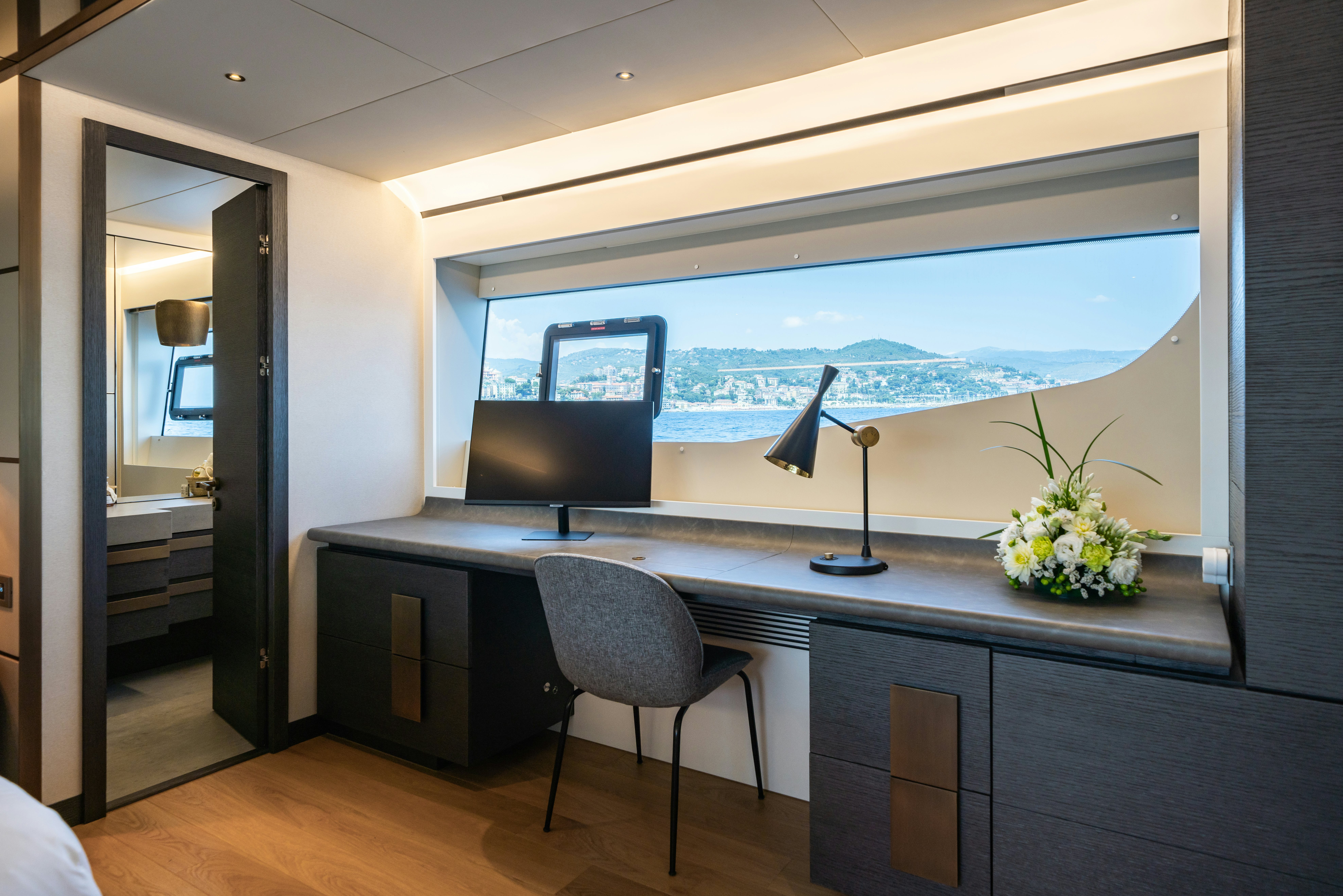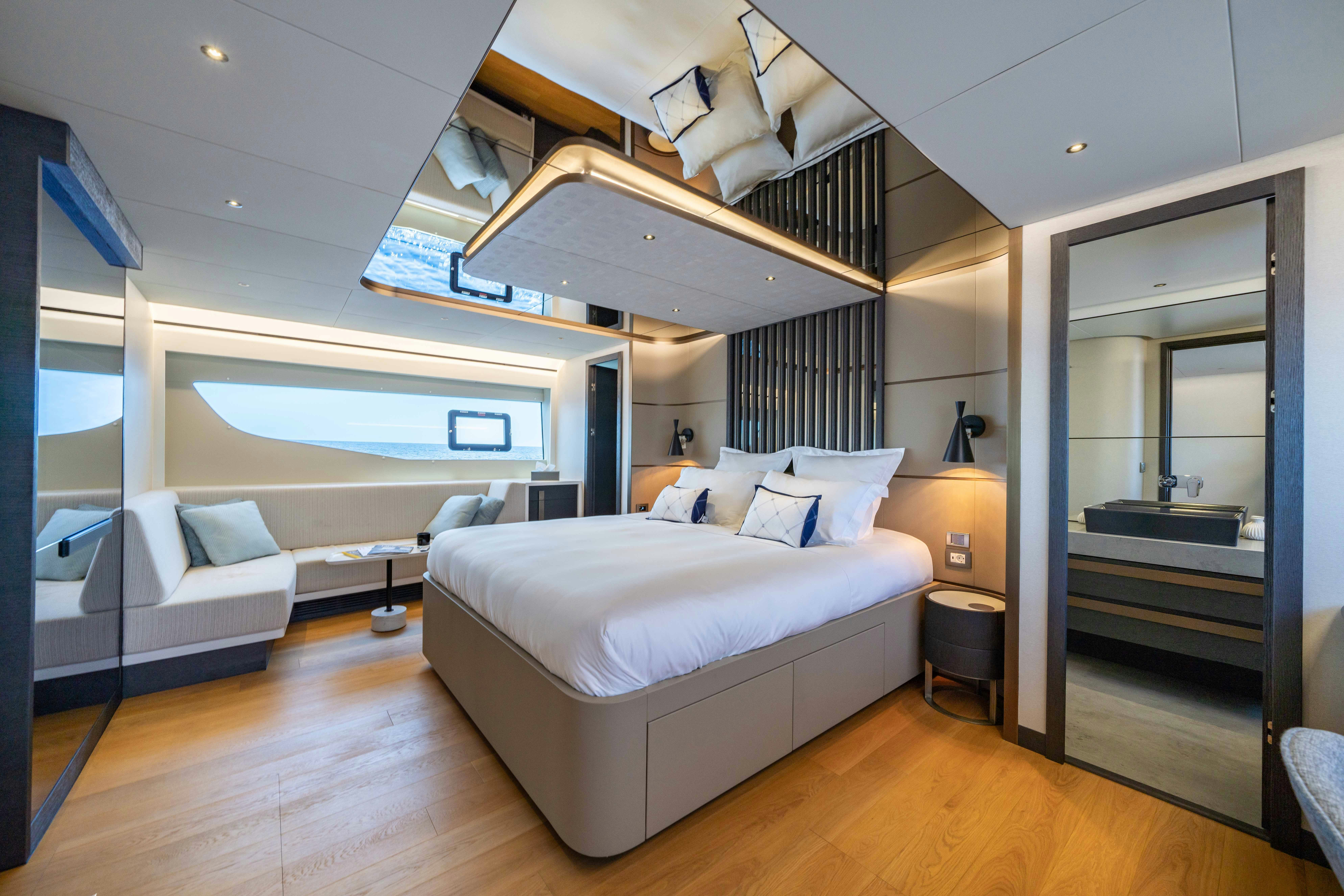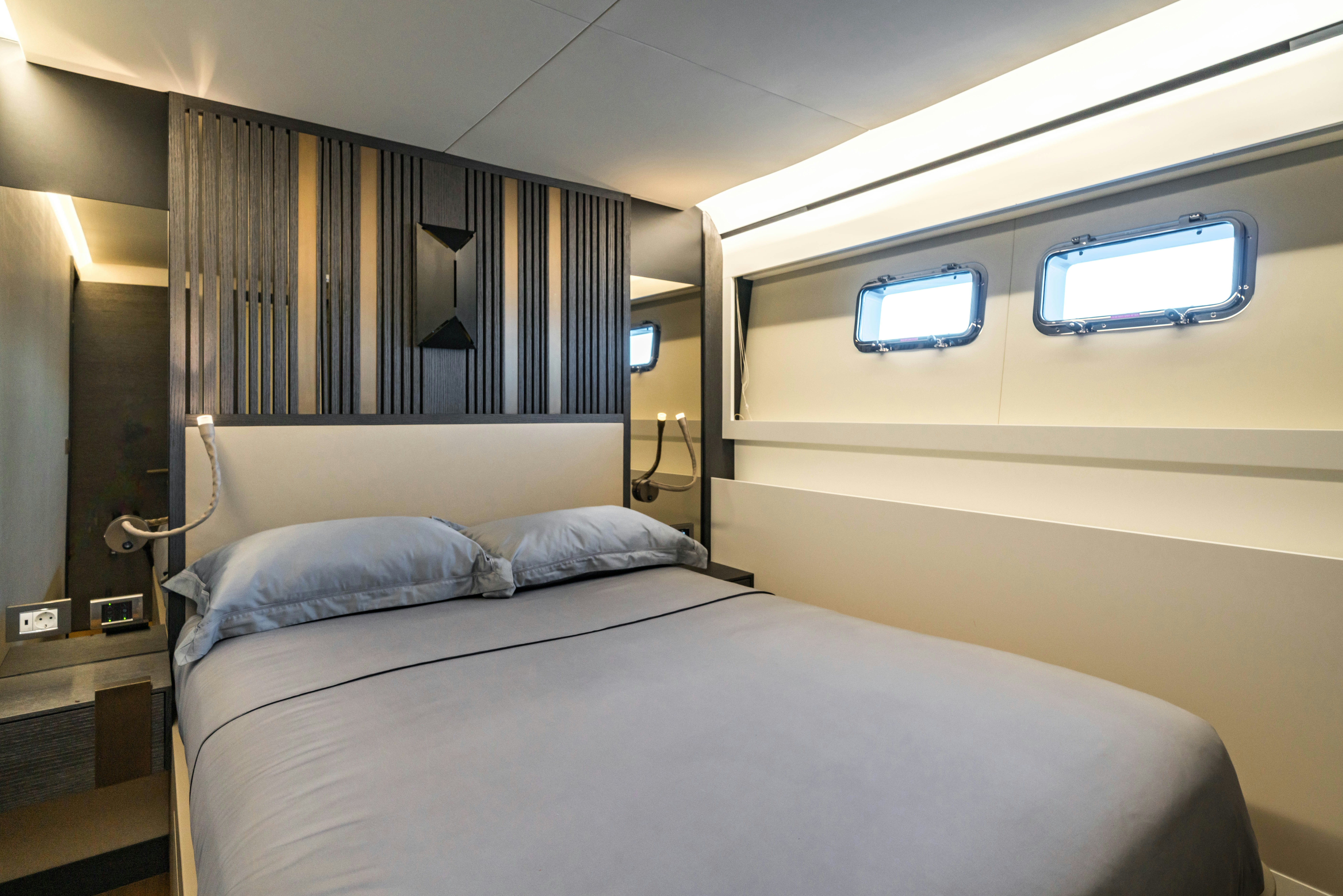 MAORIA can comfortably sleep six guests in three luxurious staterooms, including a full-beam master cabin, a large VIP double cabin, and a double cabin. The full-beam master stateroom is located aft and features a spacious double bed, a walk-in wardrobe with a safe, and a large L-shaped sofa and desk. The VIP double cabin is located forward and boasts a full-beam layout, a double bed, good storage, a sofa, and a desk. The double cabin is located port side and features a double bed and a wardrobe. All staterooms come with their own en-suite shower rooms and plenty of amenities to ensure guests feel right at home.