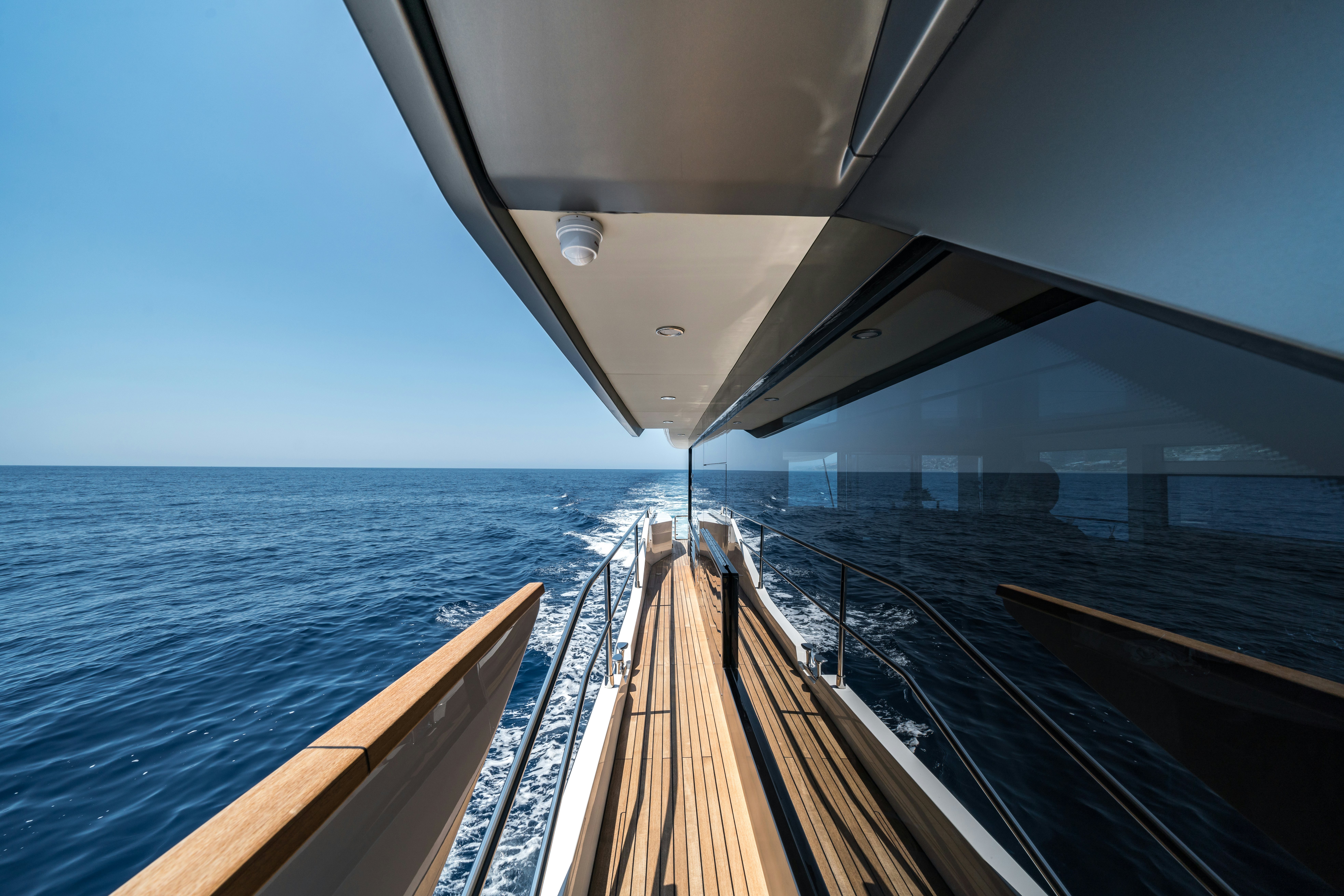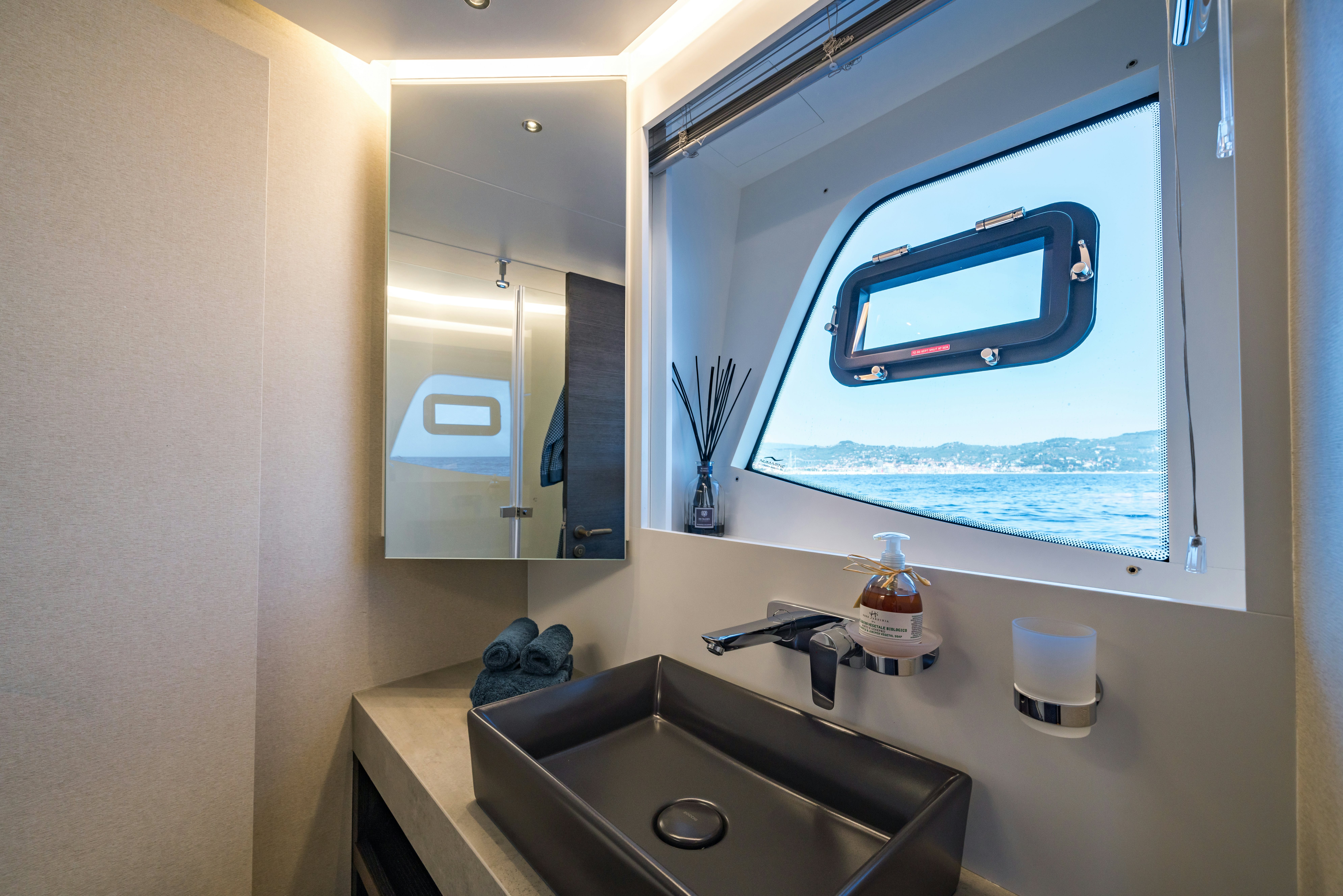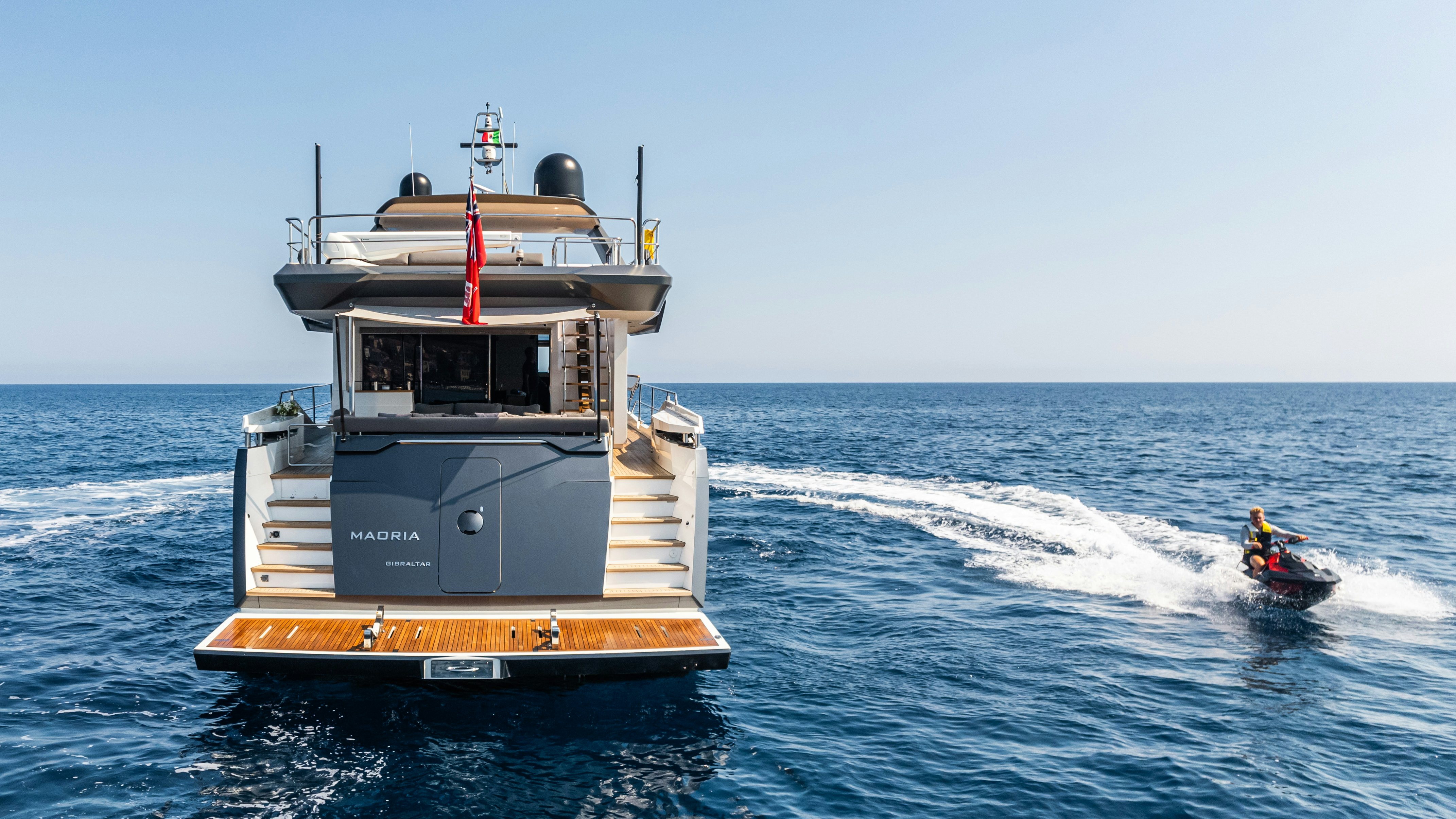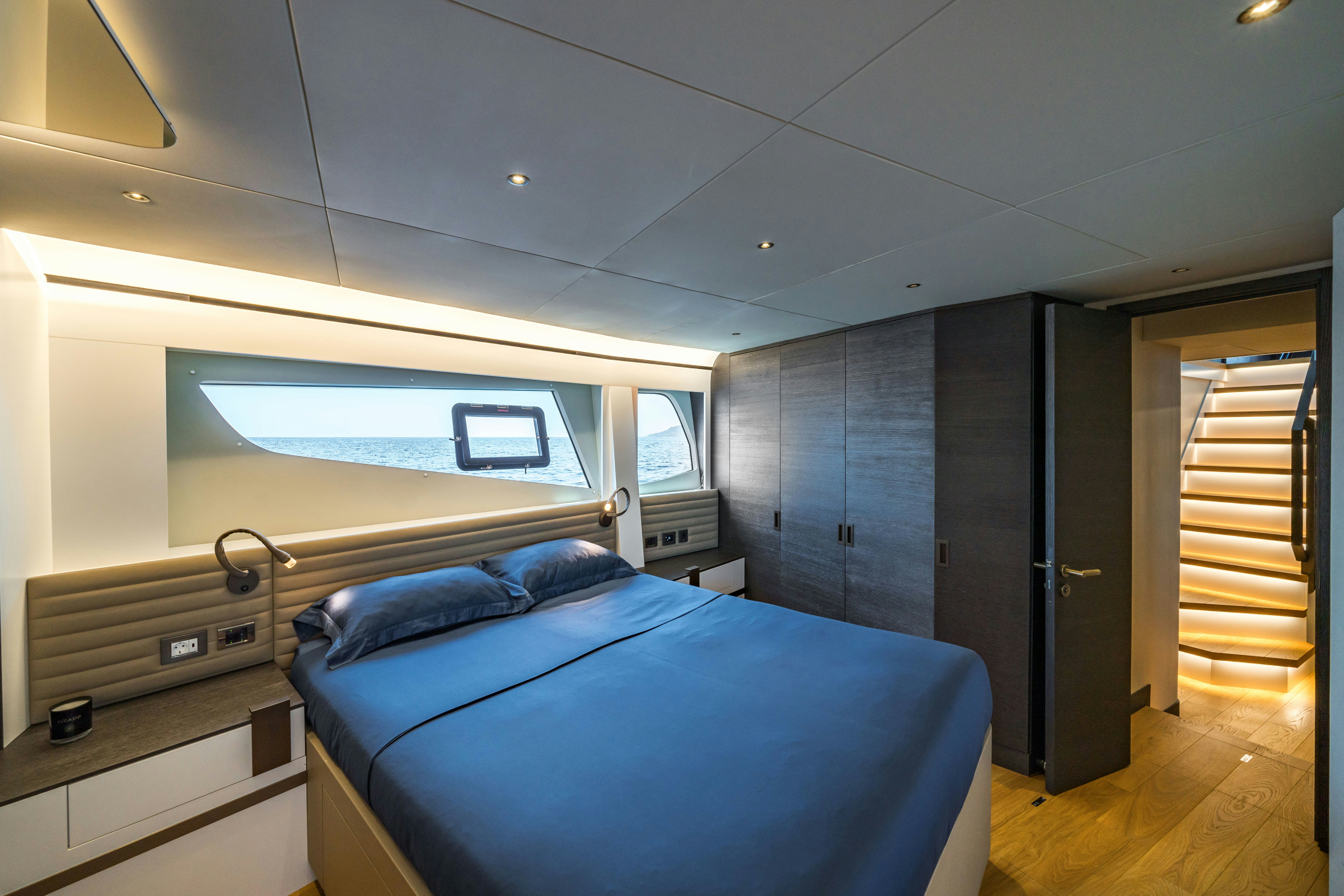 MAORIA can comfortably sleep six guests in three luxurious staterooms, including a full-beam master cabin, a large VIP double cabin, and a double cabin. The full-beam master stateroom is located aft and features a spacious double bed, a walk-in wardrobe with a safe, and a large L-shaped sofa and desk. The VIP double cabin is located forward and boasts a full-beam layout, a double bed, good storage, a sofa, and a desk. The double cabin is located port side and features a double bed and a wardrobe. All staterooms come with their own en-suite shower rooms and plenty of amenities to ensure guests feel right at home.