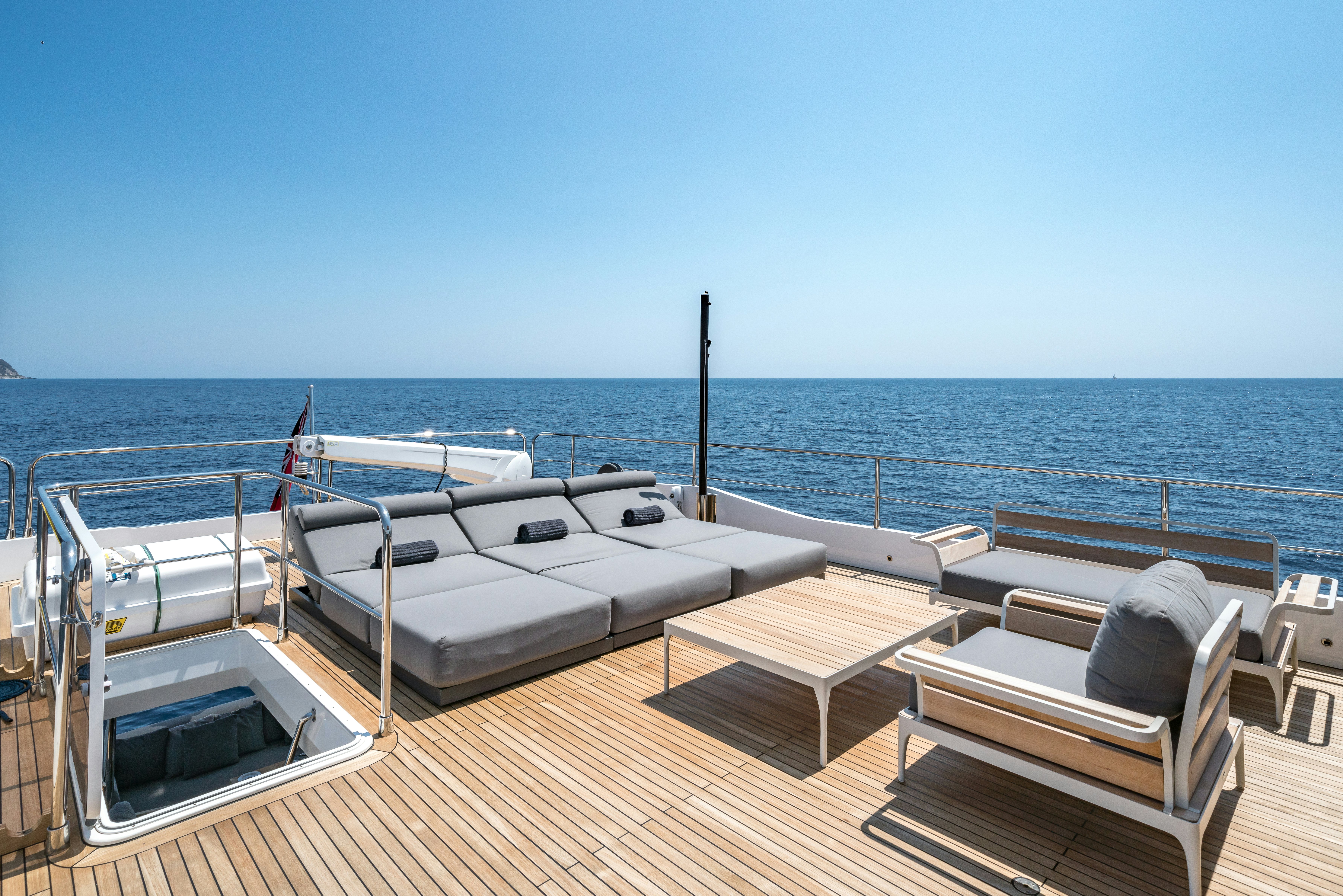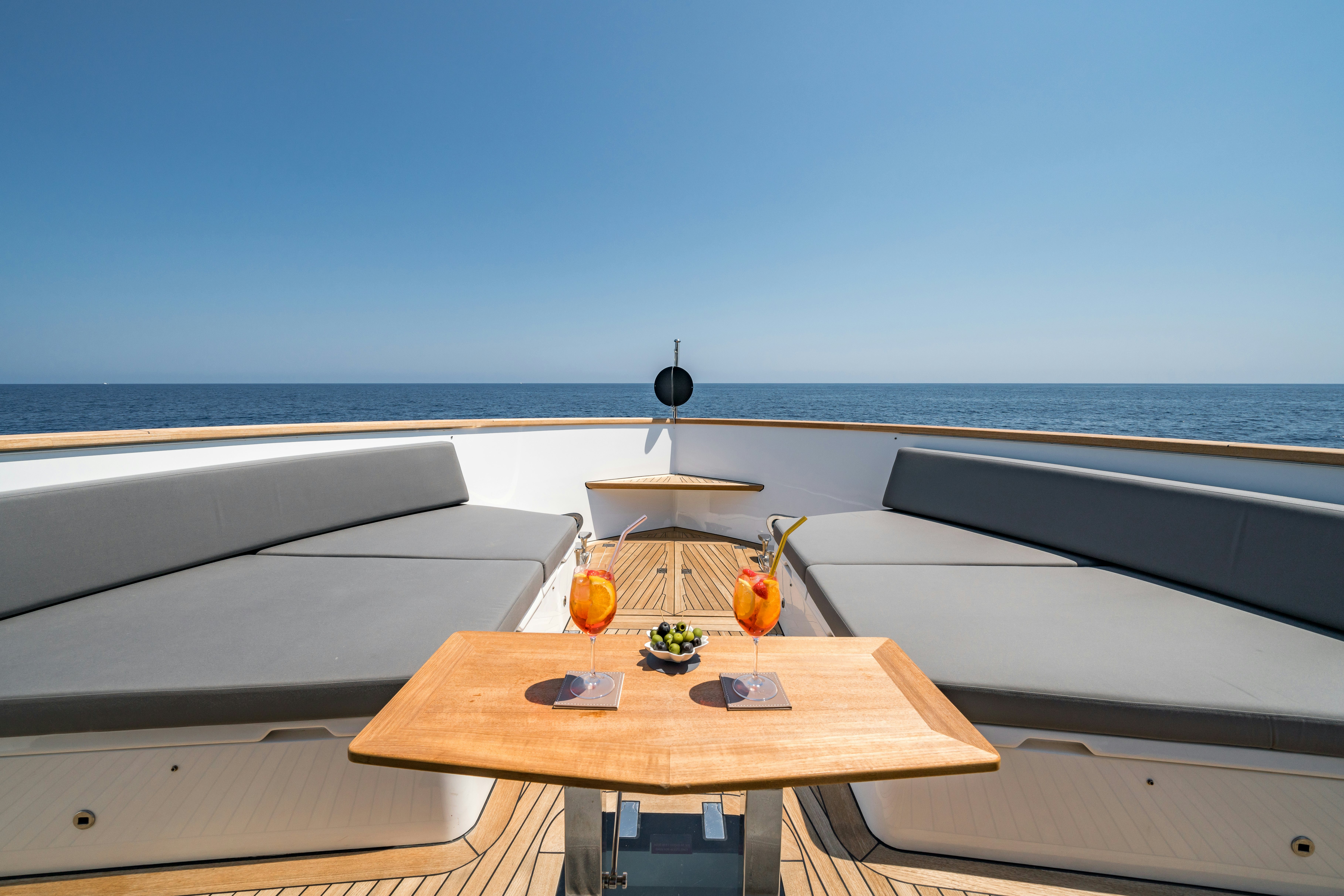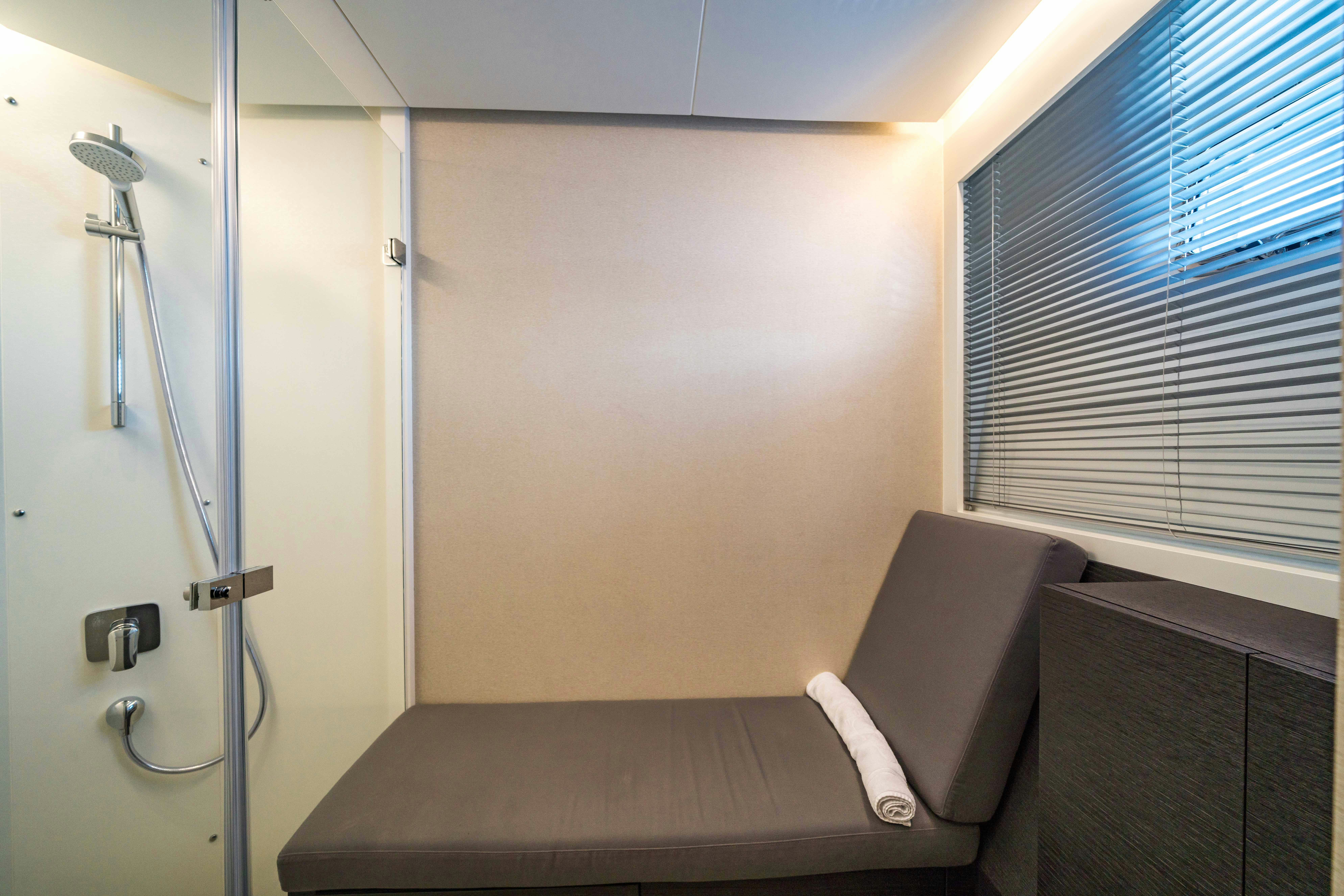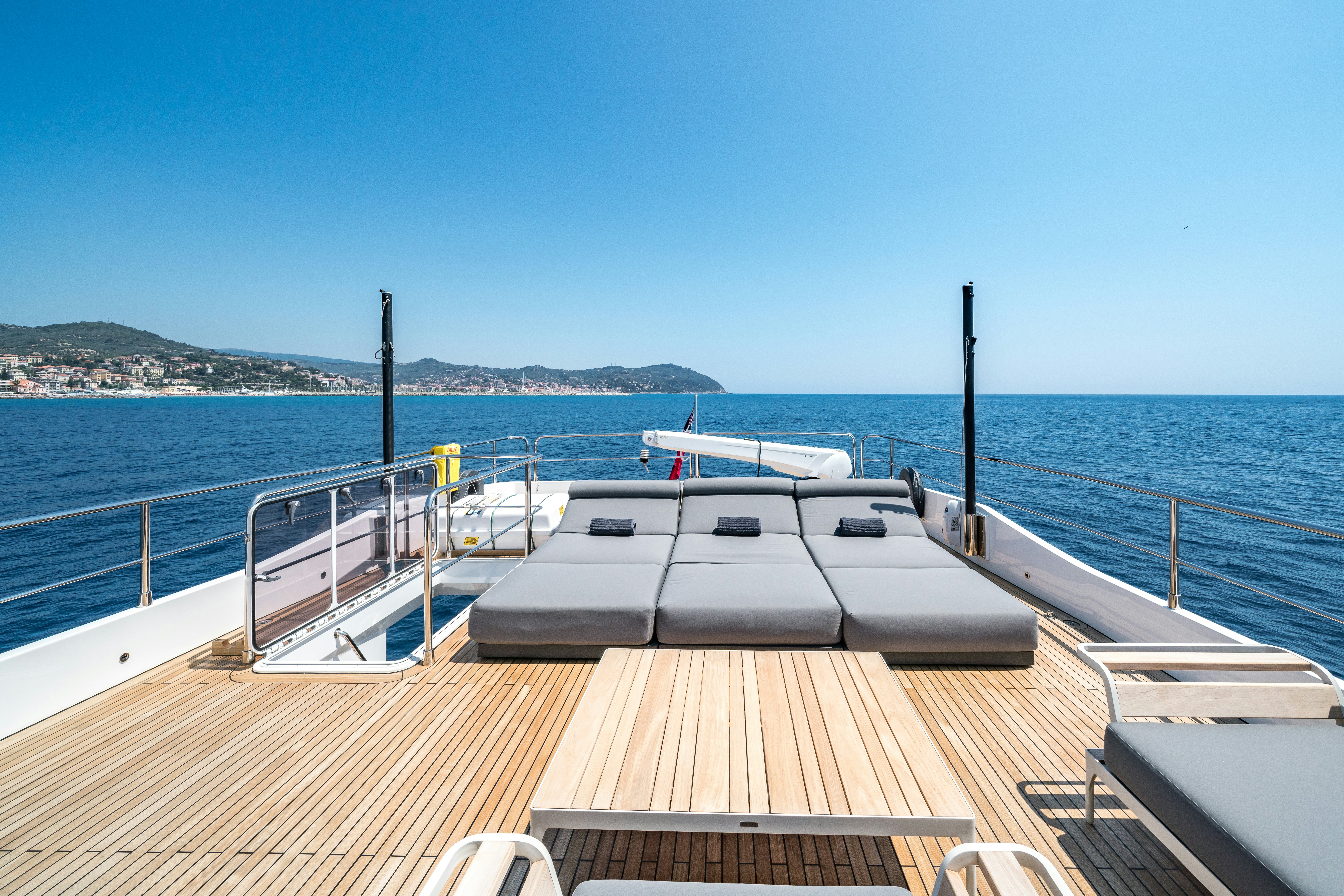 Moving up to the sundeck, guests will find a spacious area that can be used for relaxation or entertainment. It features a large dining table that seats eight guests, a barbecue, fridges, an ice machine, and comfortable sunbeds and sofas for lounging. The foredeck offers additional seating for six guests and a small retractable table, while the swim platform can be lowered into the water for easy access to the sea. Guests can also take advantage of the lower deck sauna, which seats up to six guests and has a shower and changing room with a sofa.