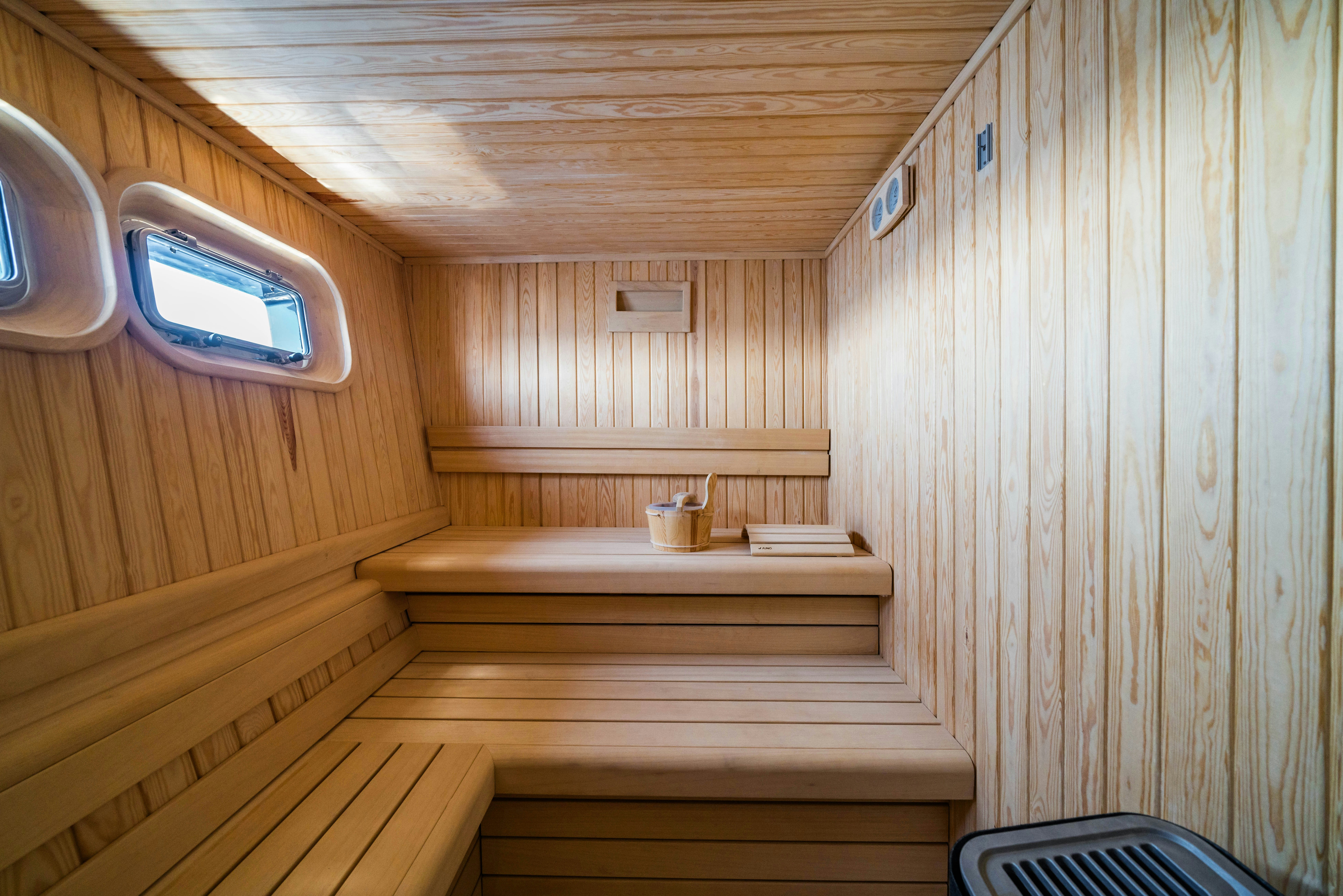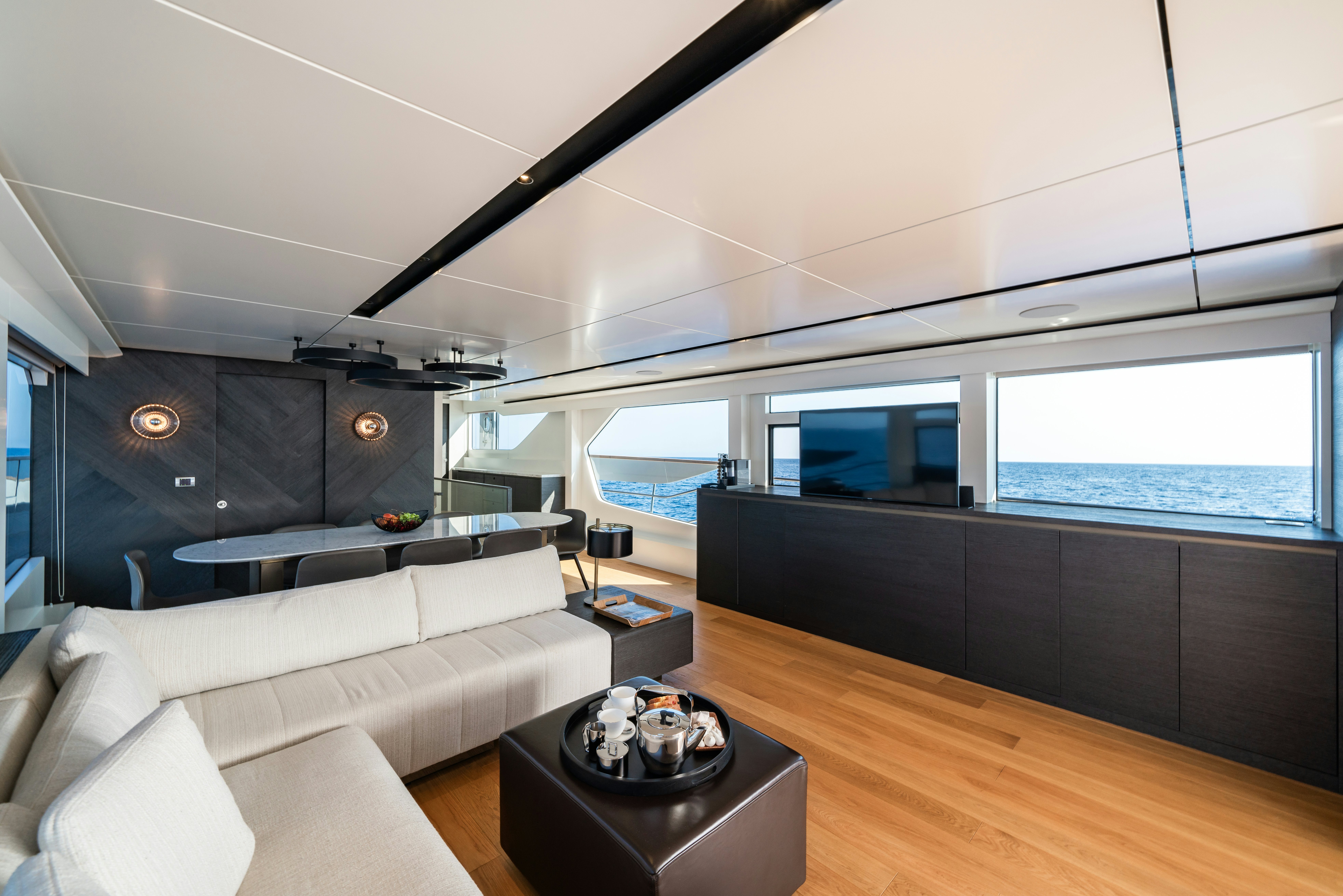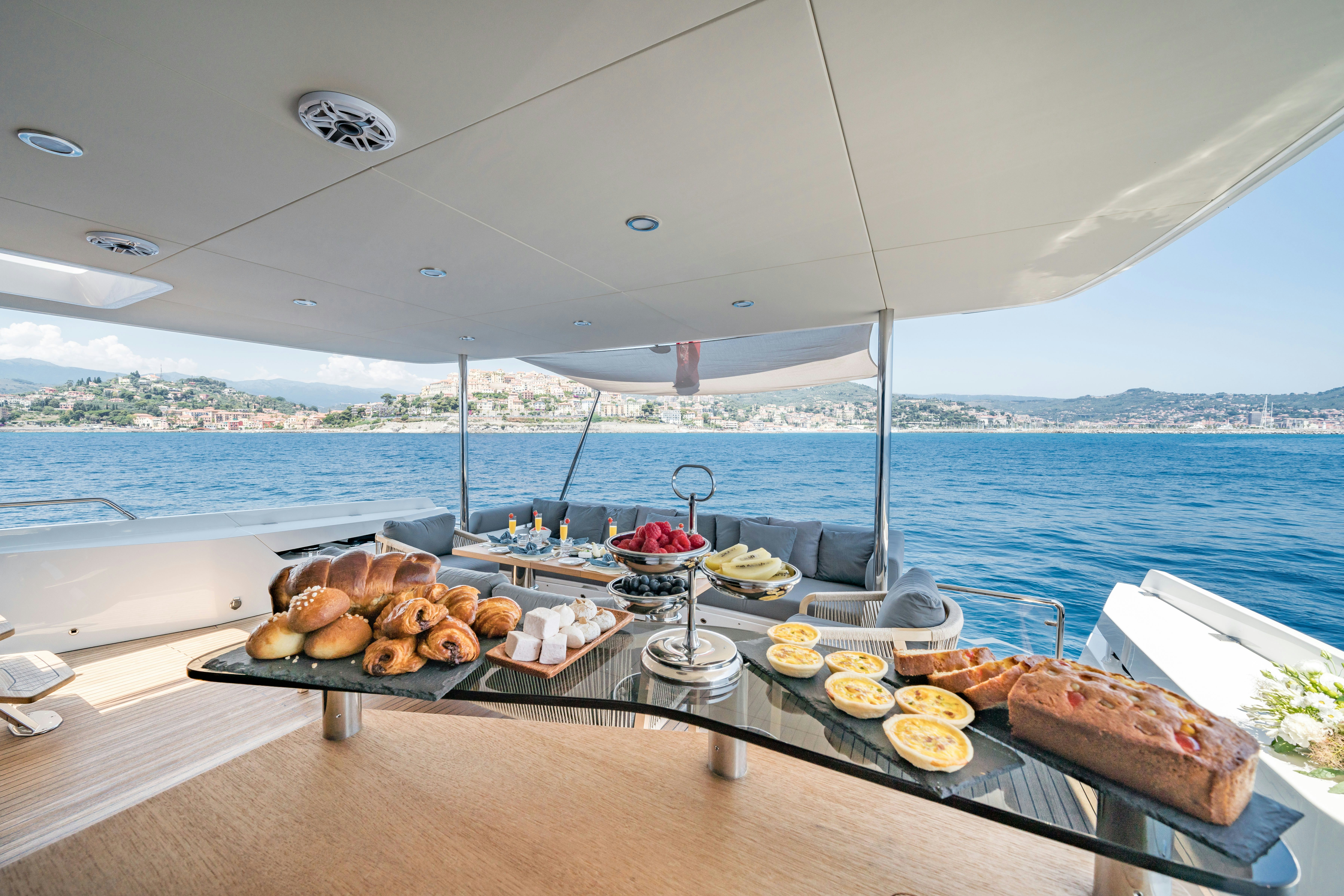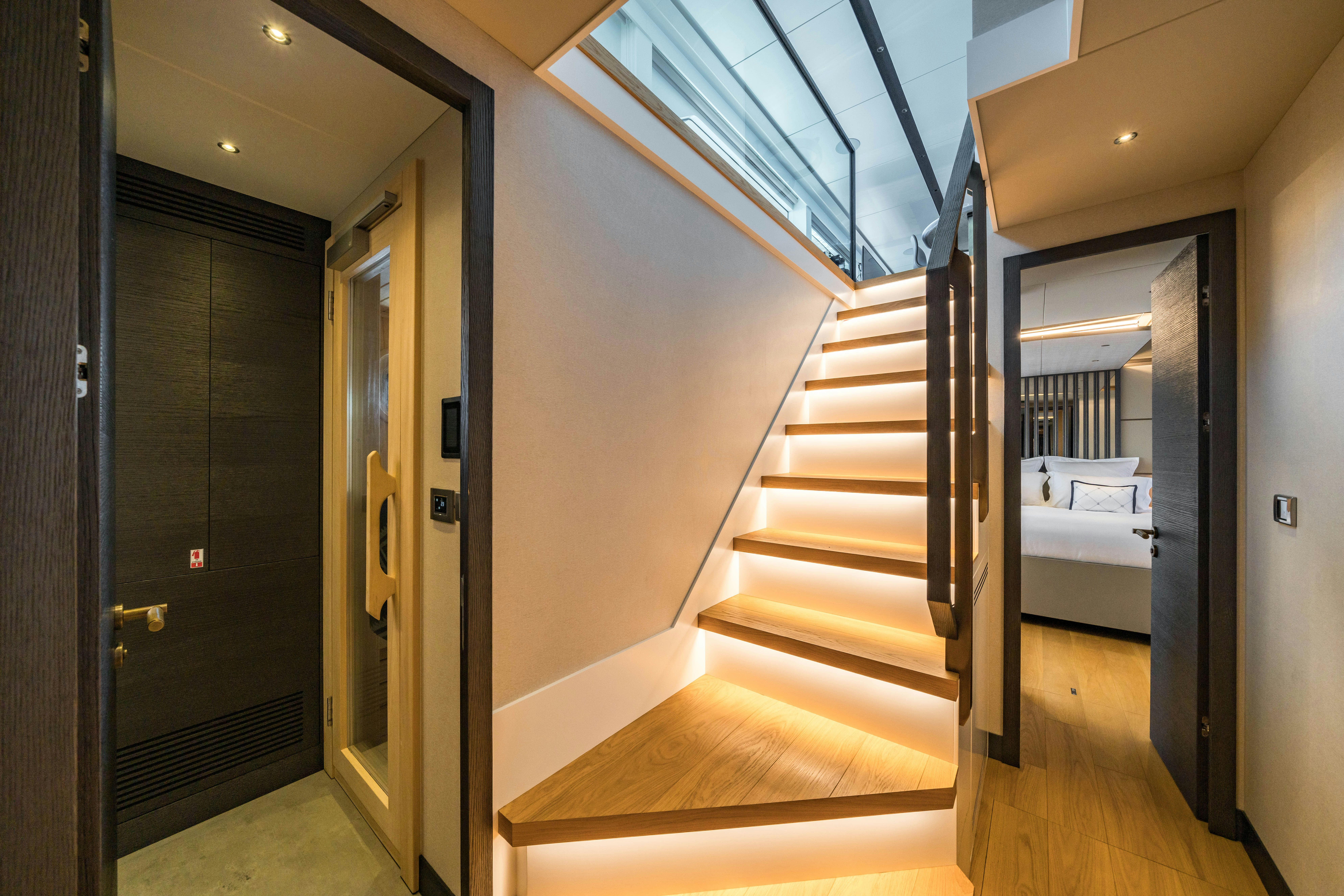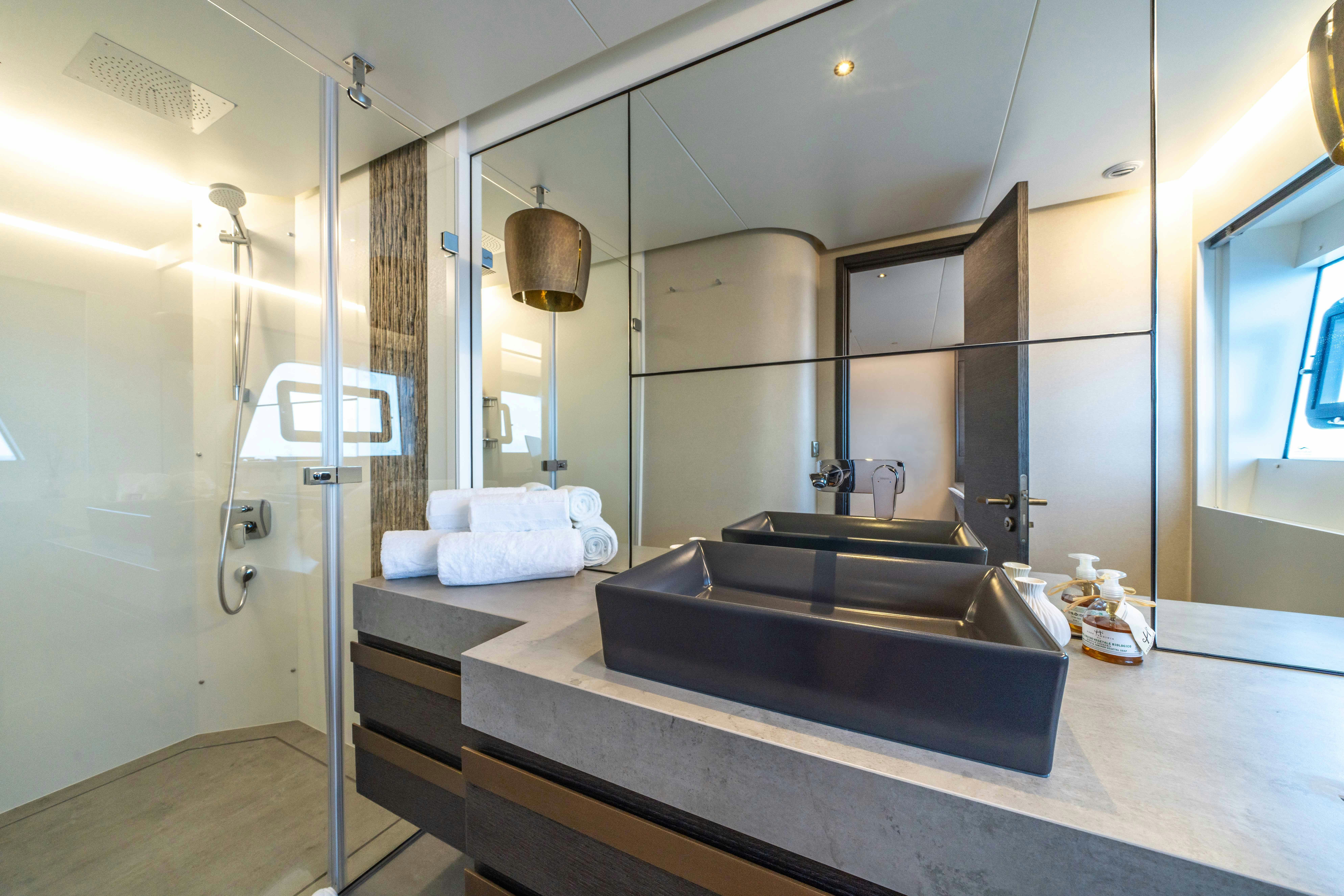 Moving up to the sundeck, guests will find a spacious area that can be used for relaxation or entertainment. It features a large dining table that seats eight guests, a barbecue, fridges, an ice machine, and comfortable sunbeds and sofas for lounging. The foredeck offers additional seating for six guests and a small retractable table, while the swim platform can be lowered into the water for easy access to the sea. Guests can also take advantage of the lower deck sauna, which seats up to six guests and has a shower and changing room with a sofa.