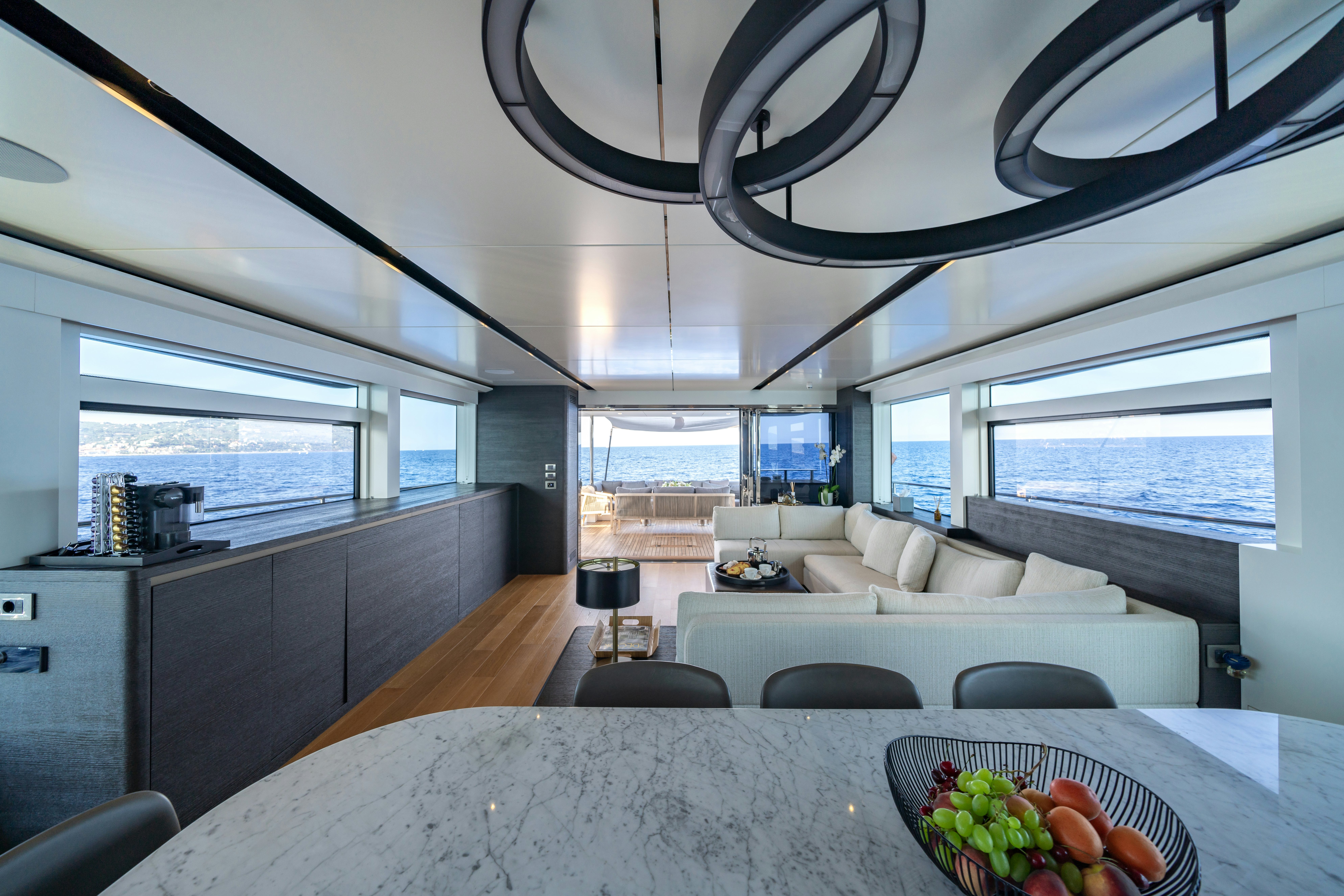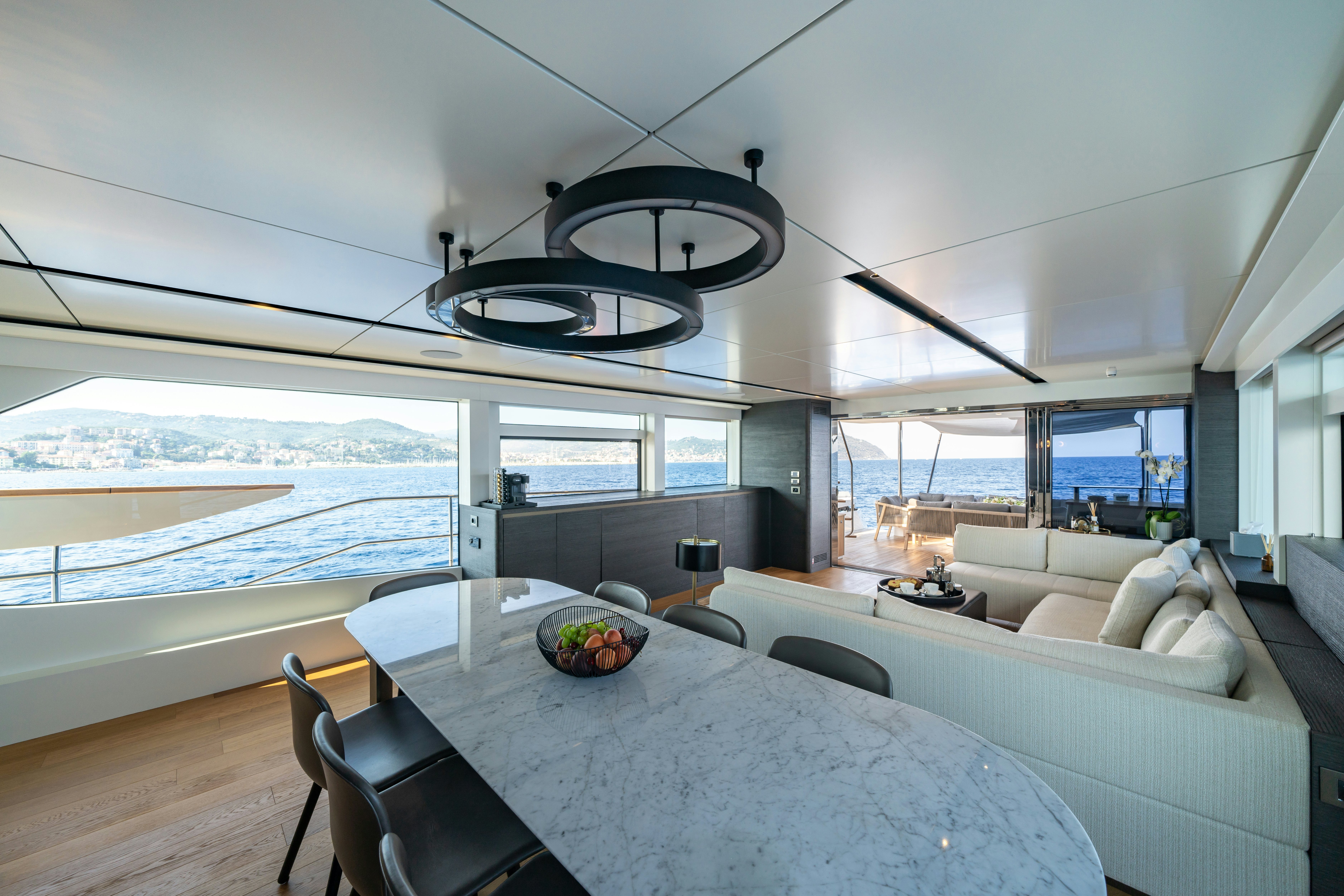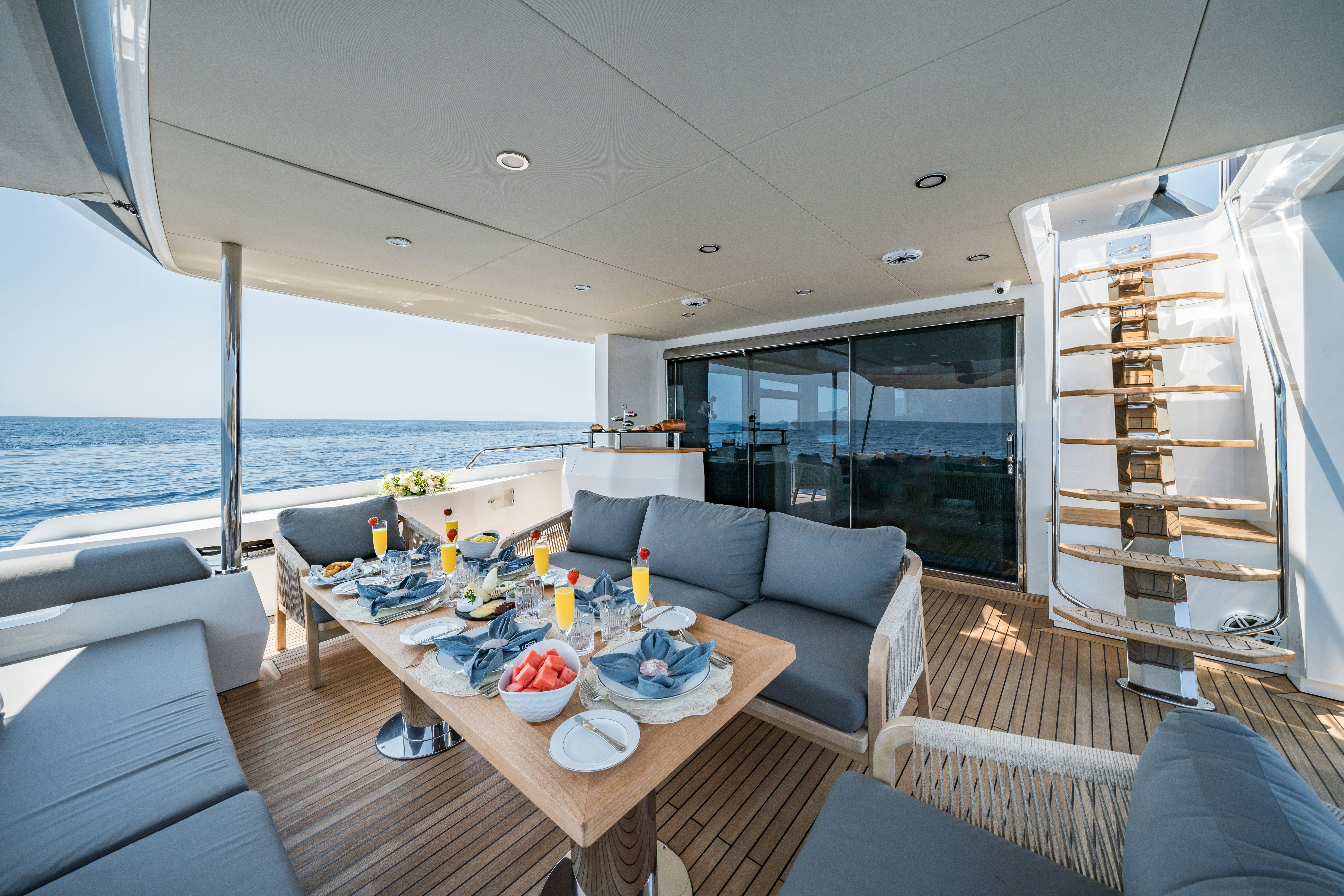Boarding from the aft deck, guests will find comfortable seating for eight and adjustable tables that can be raised or lowered depending on their needs. The aft deck also boasts a small bar with a fridge, perfect for refreshing drinks on hot summer days. From here, guests can step inside the main salon, which features a large sofa that easily seats six people and a dining table that comfortably accommodates eight guests. The salon is flooded with natural light thanks to floor-to-ceiling windows, providing breathtaking views of the surrounding scenery.
