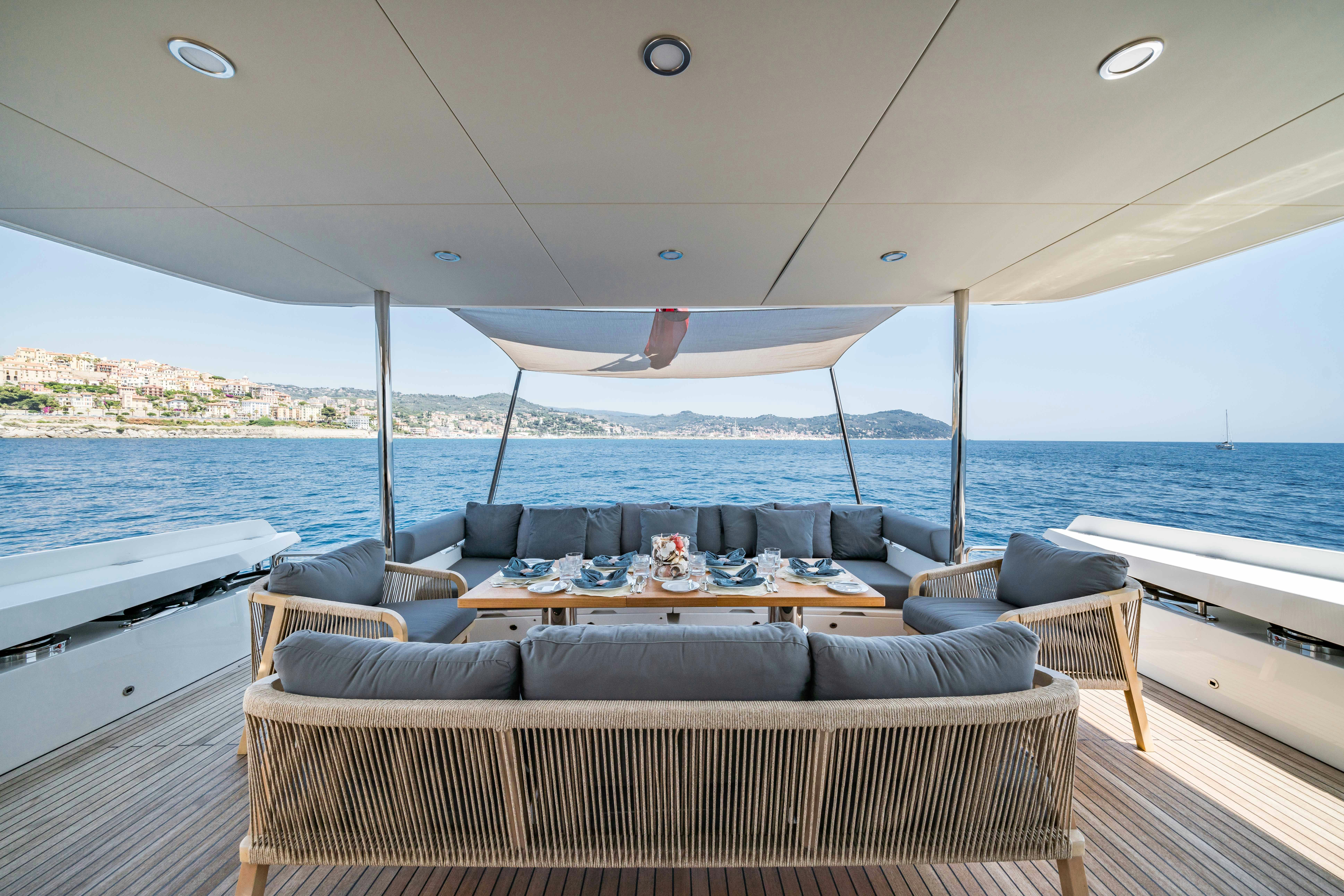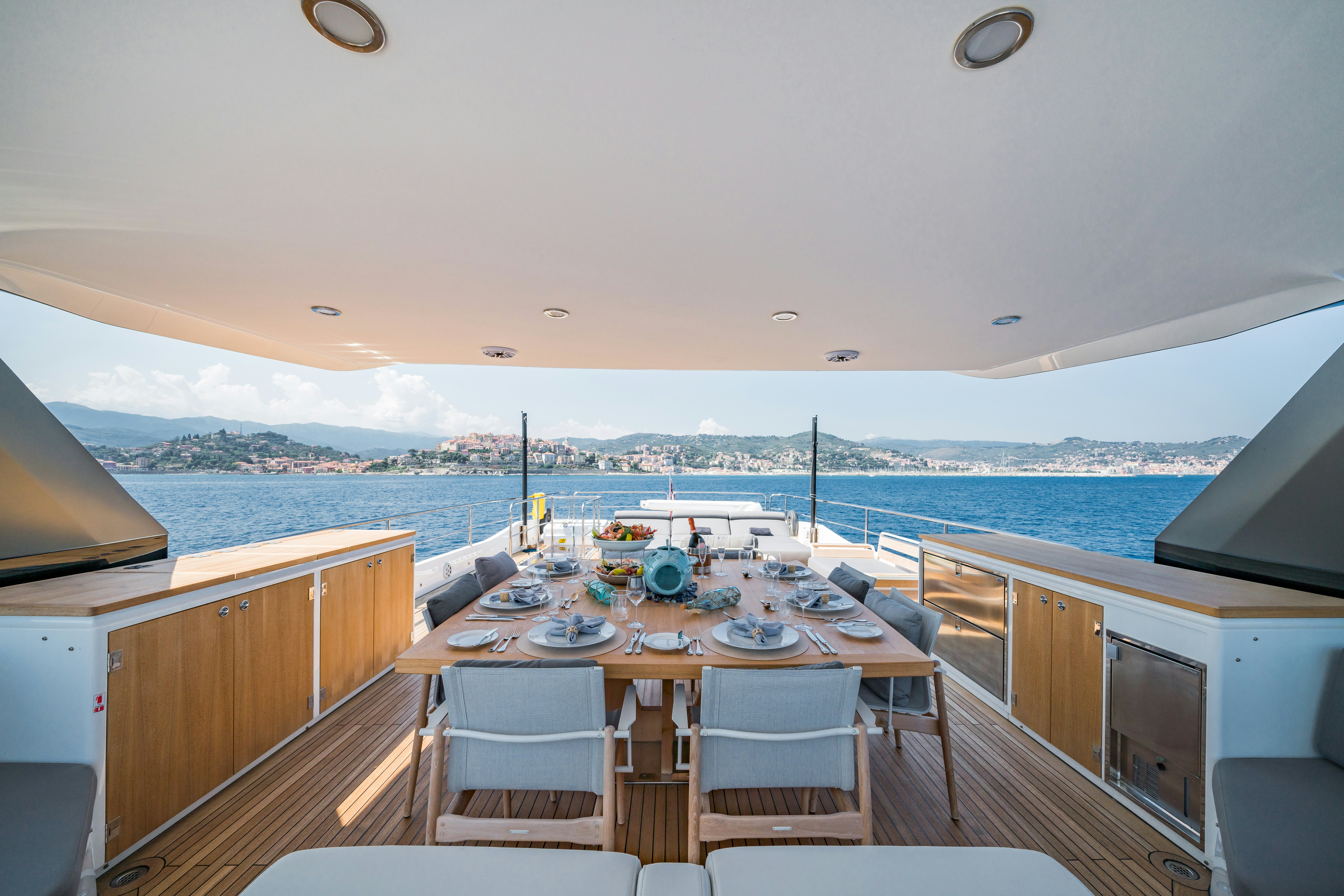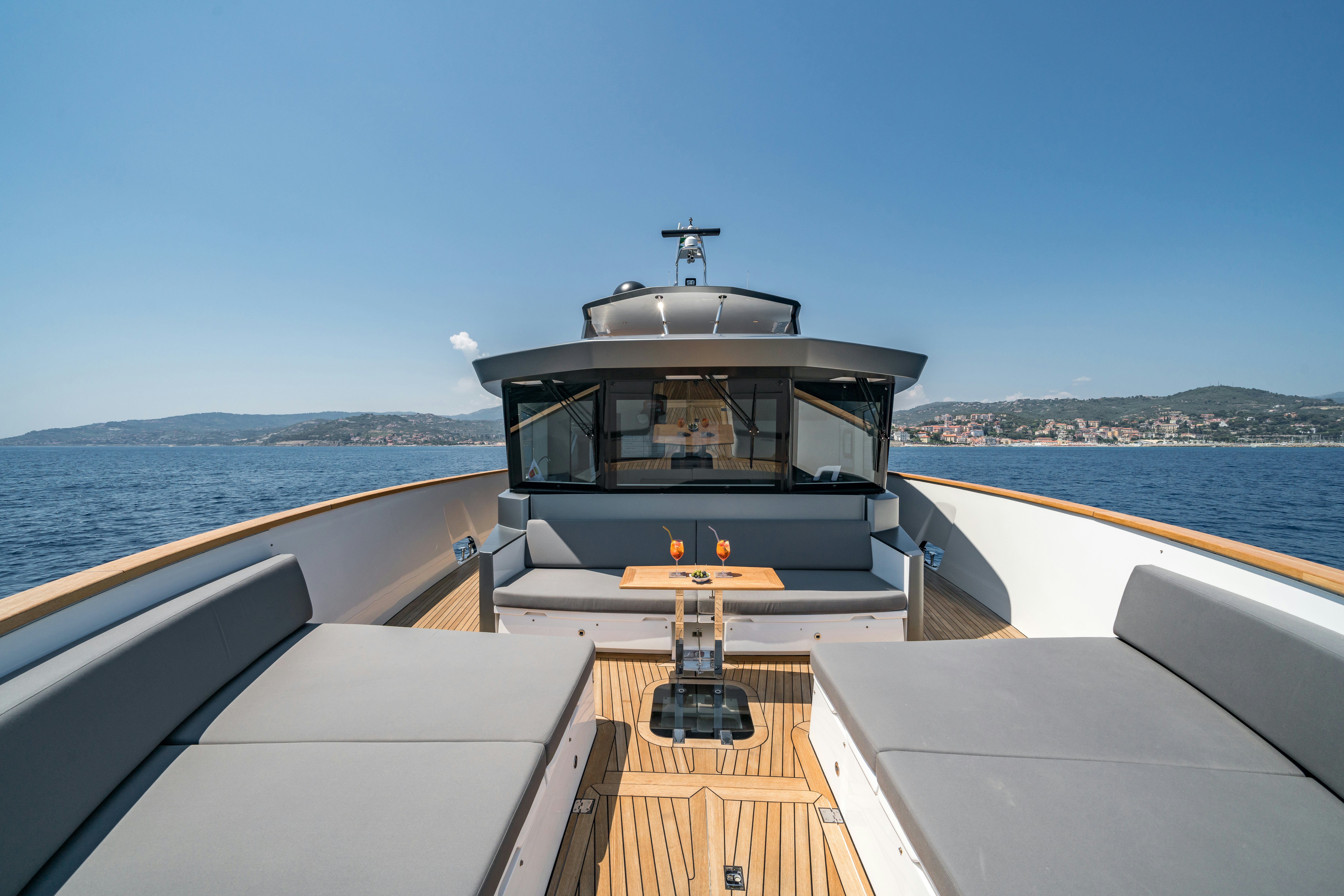 Boarding from the aft deck, guests will find comfortable seating for eight and adjustable tables that can be raised or lowered depending on their needs. The aft deck also boasts a small bar with a fridge, perfect for refreshing drinks on hot summer days. From here, guests can step inside the main salon, which features a large sofa that easily seats six people and a dining table that comfortably accommodates eight guests. The salon is flooded with natural light thanks to floor-to-ceiling windows, providing breathtaking views of the surrounding scenery.