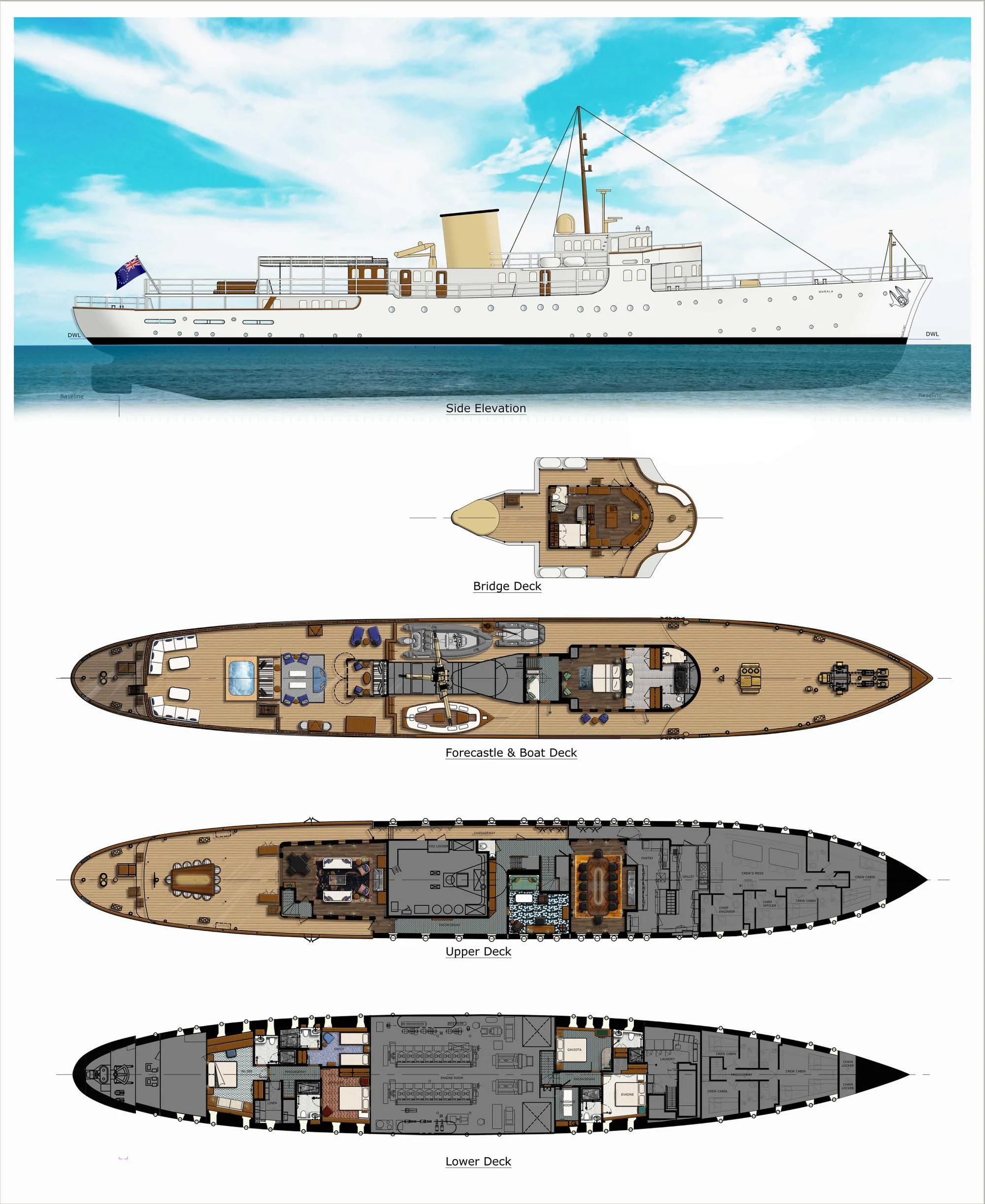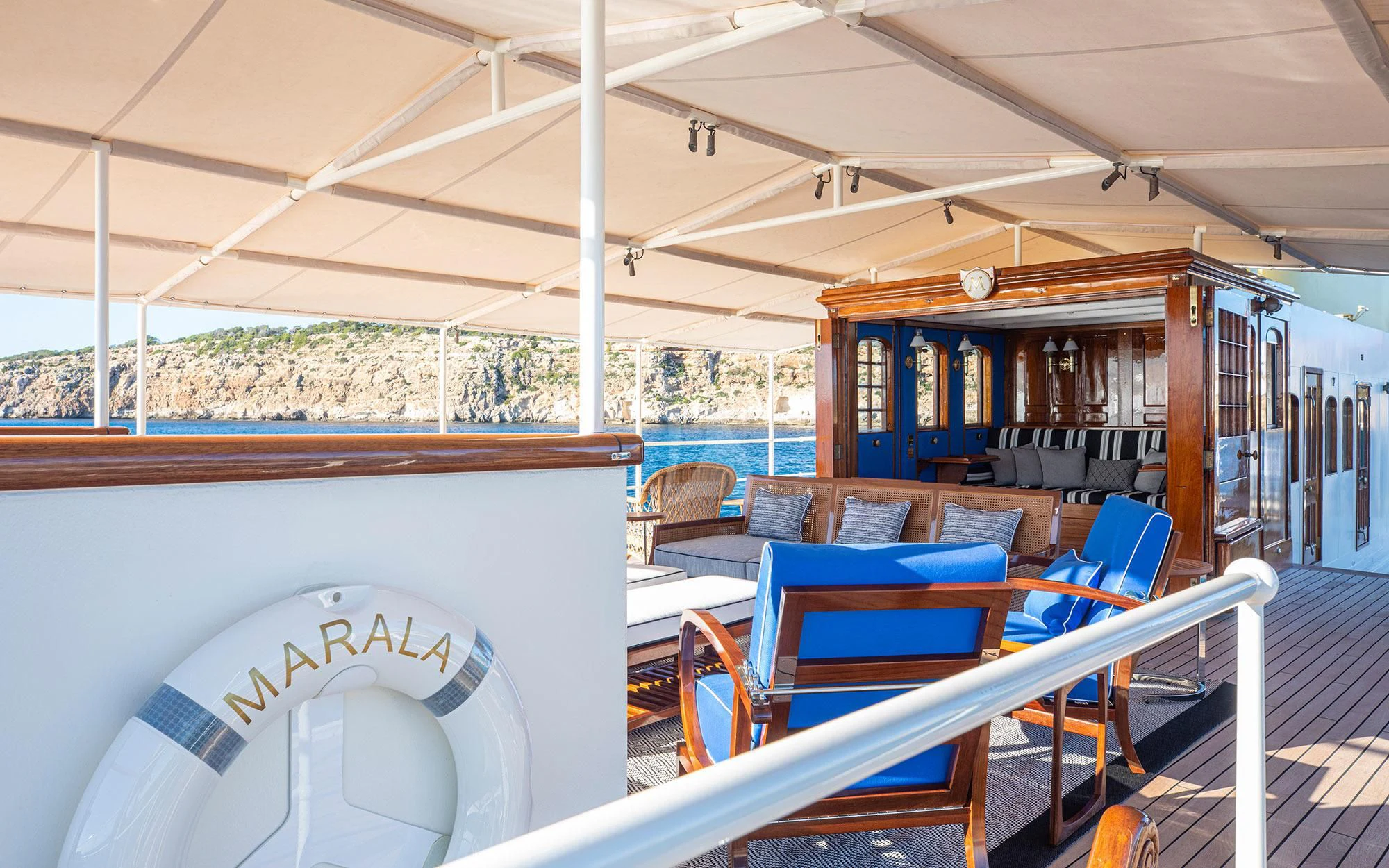 Thanks to her excellent refit, MARALA was nominated for the Refitted/Rebuilt/Converted Yachts category of The World Superyacht Awards 2023. An expert and friendly crew of 19 is on hand at all times on board MARALA. They keep the yacht in top condition and create and deliver a captivating charter for each set of guests to step on board. The guests sleep in six elegant staterooms comprising a master, a VIP, two double staterooms, and two twin cabins. The impressive shared social areas are designed for world-class relaxation and entertainment, and the outside deck areas are generously sized and well-appointed. Attractions include a deck Jacuzzi. MARALA cruises comfortably at 11 knots and reaches a top speed of 13 knots.