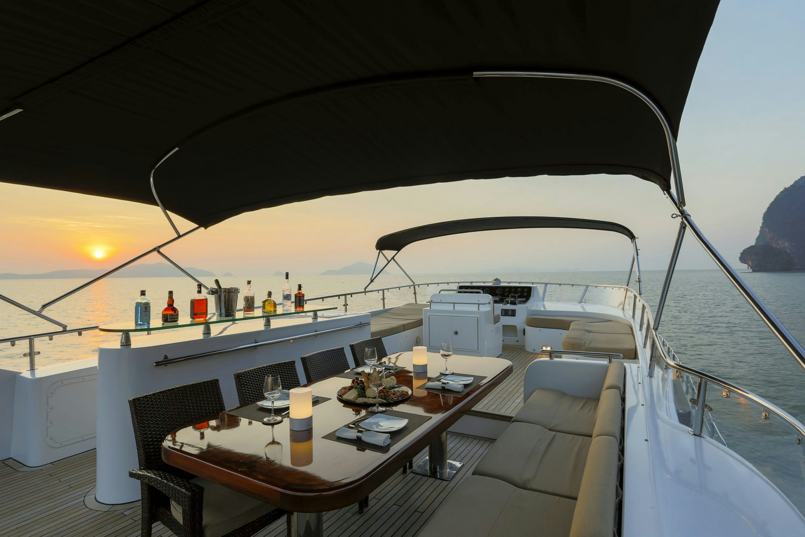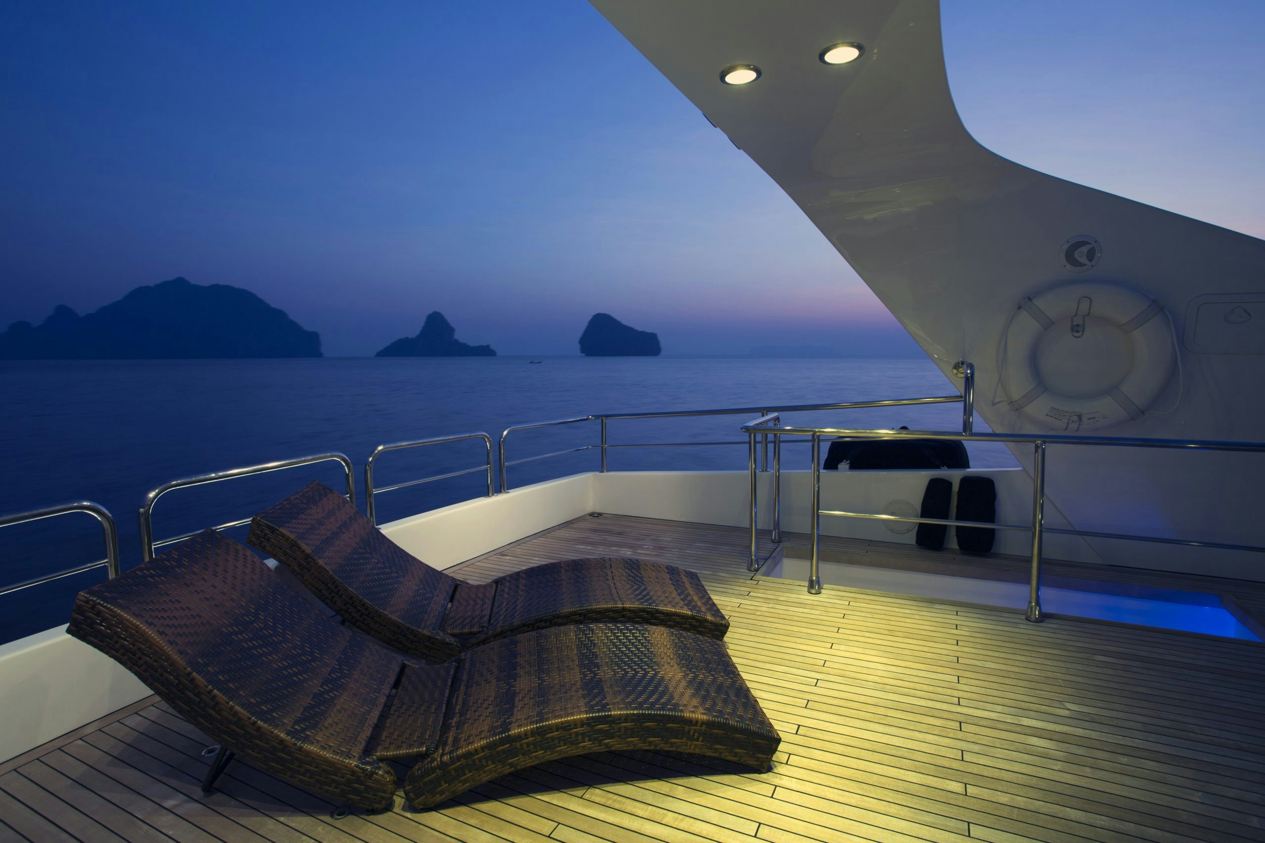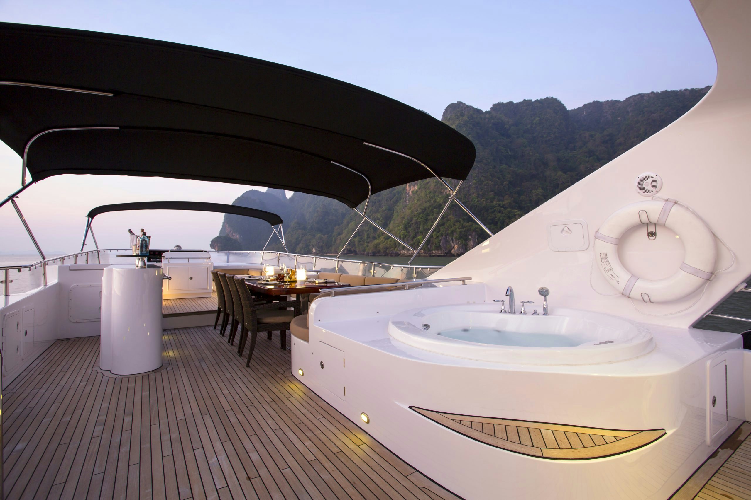Motor yacht MIA KAI has a variety of spaces ideal for enjoying alfresco living. Guests can sit back and cast their worries aside while soaking in the Jacuzzi or perhaps lounging with a drink in hand on the flybridge. To set the mood, MIA KAI has a high-tech sound system to provide ambient music. The luxury charter yacht offers guests the option to dine alfresco on the flybridge or main deck aft. Whichever you choose, the yacht’s chef will delight your palette with an impressive meal. The charter yacht’s foredeck is a sunbather’s dream with sunpads and a charming seating area. Giving guests the ultimate fun in the sun, MIA KAI has a variety of water toys for exploring above and below the water’s surface.