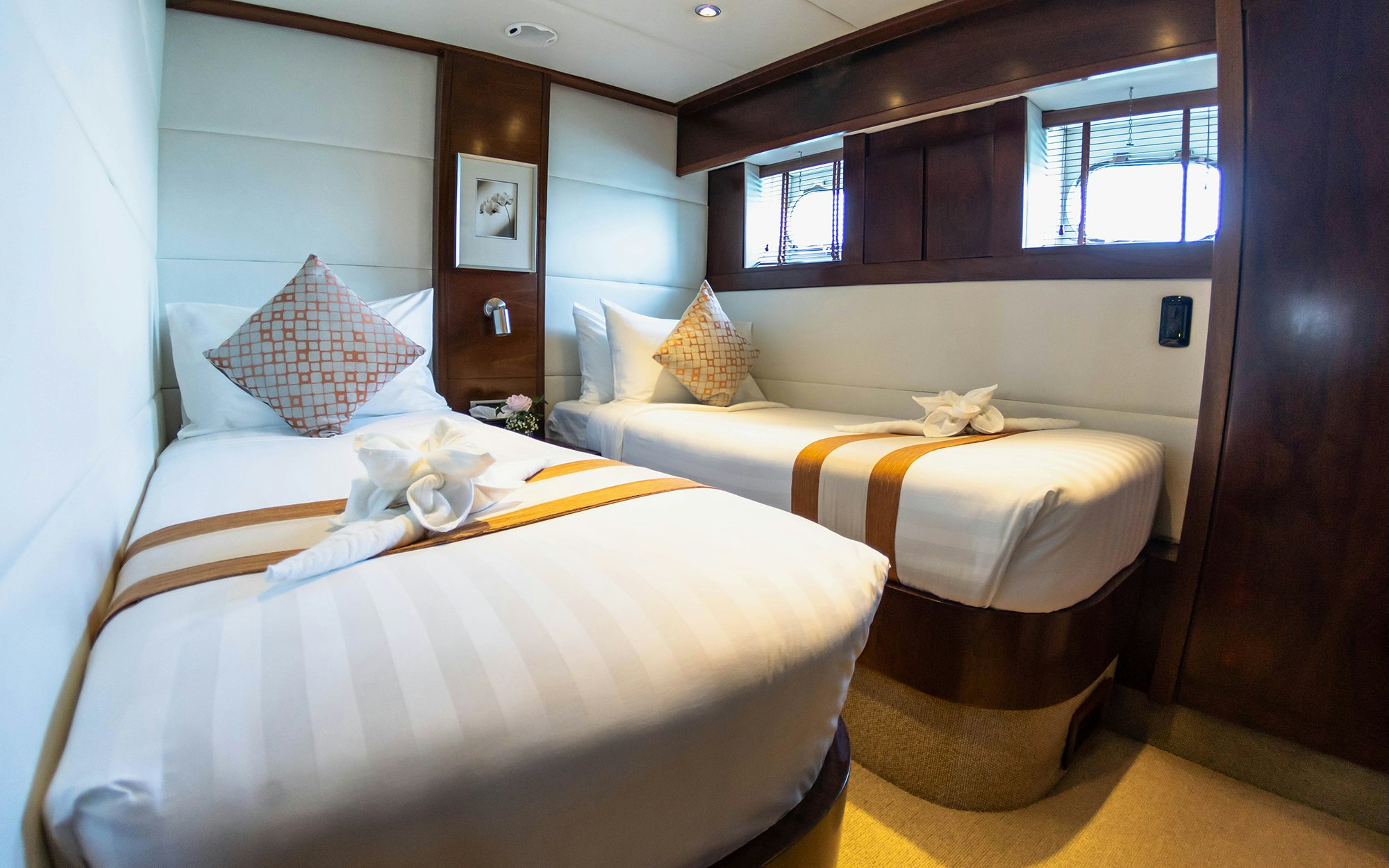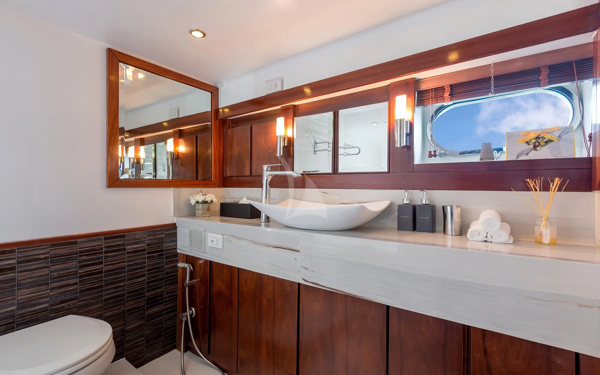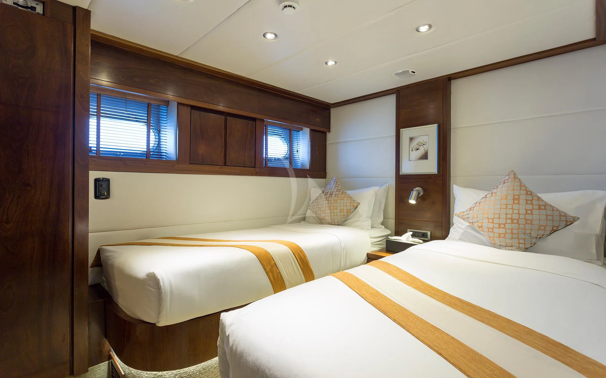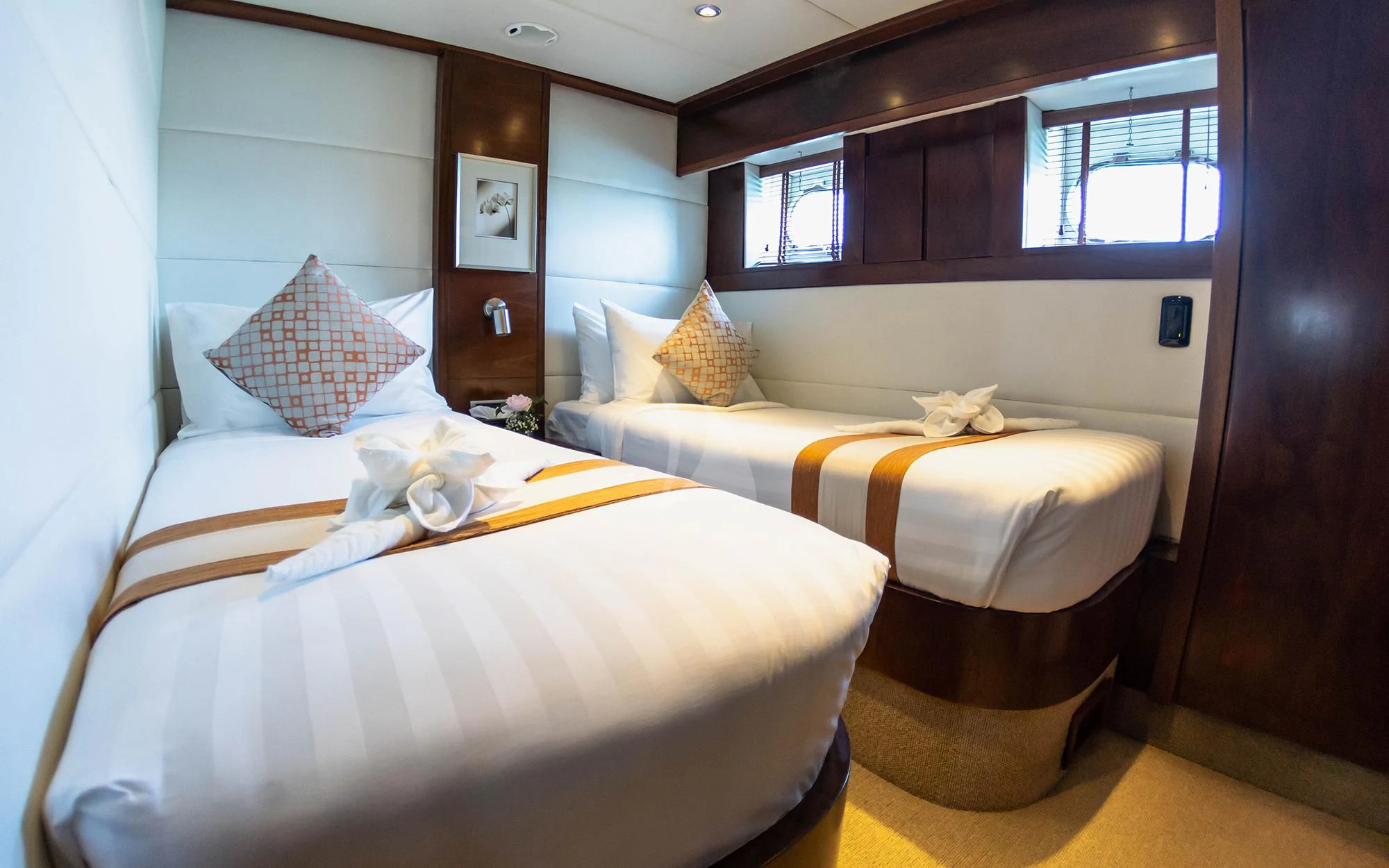 Charter yacht MIA KAI offers sumptuous accommodations for eight guests in four modern-style staterooms. The yacht’s stateroom arrangement offers guest versatility and makes her perfect for mixed groups and families. MIA KAI staterooms include two equal-sized, full-beam master staterooms and two twin-bed staterooms. Each stateroom is equipped with air-conditioning, TVs and private en-suite marble bathrooms.