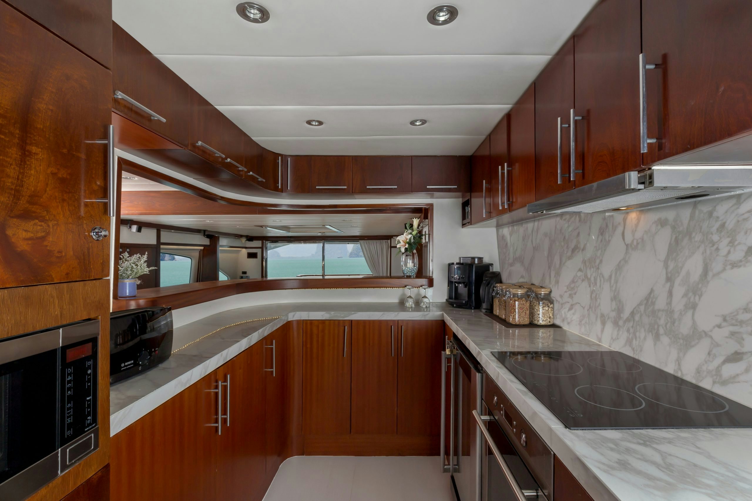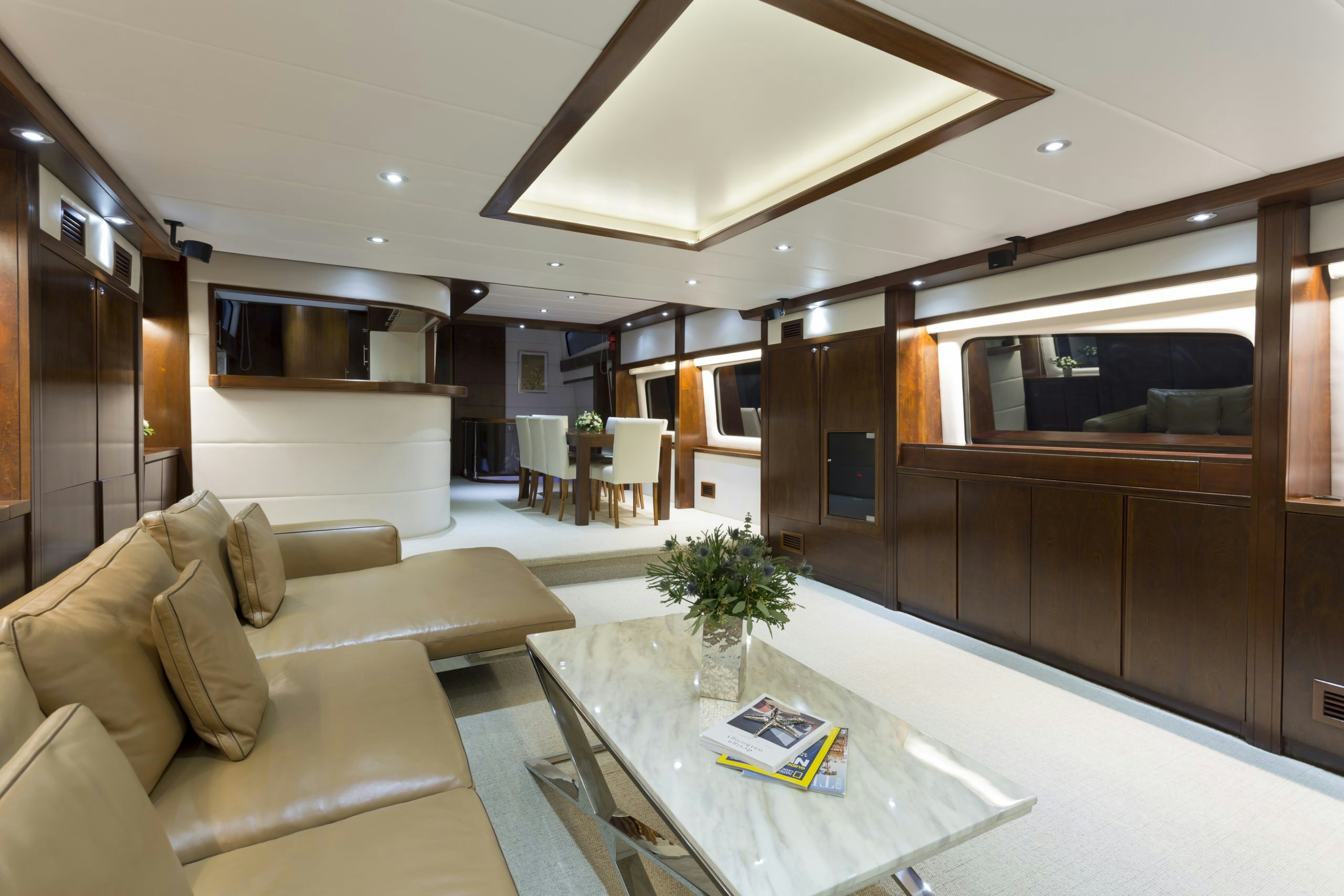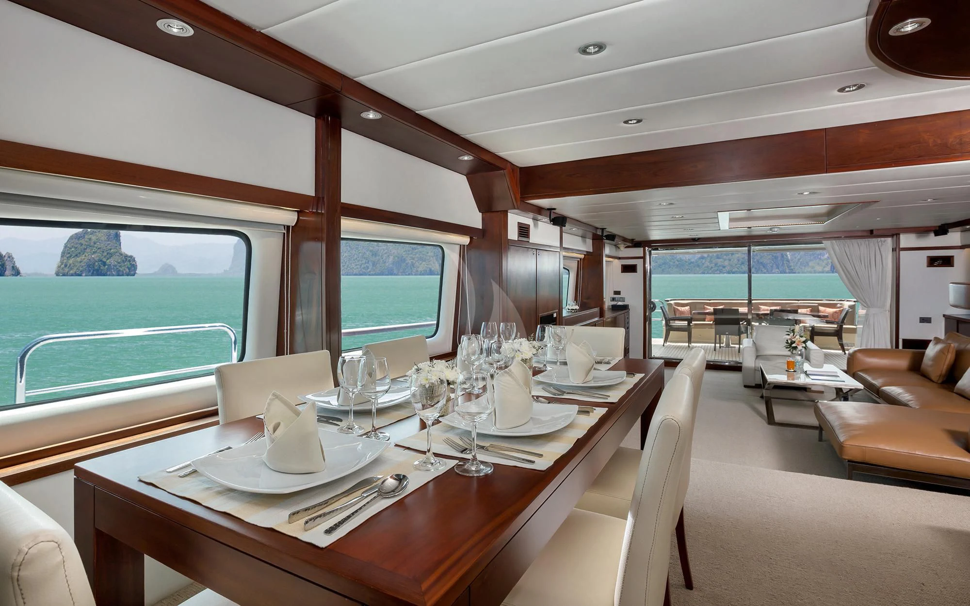 Luxury motor yacht MIA KAI’s stylish interior is light and bright with natural décor. It features large, comfortable leather sofas, a salon table and rich, mahogany wood paneling. Her main salon has an open layout and contemporary furnishings, making it an ideal space for entertaining or relaxing after a fun day on the water. Further forward on the main deck is a formal dining table and a fully outfitted bar.