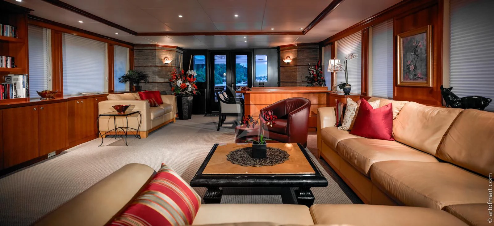 Delta’s 124-foot (37.8m) MURPHY’S LAW has a thoughtfully designed layout and includes many gathering spots from a sit-down bar in the main salon to a game table in the skylounge.