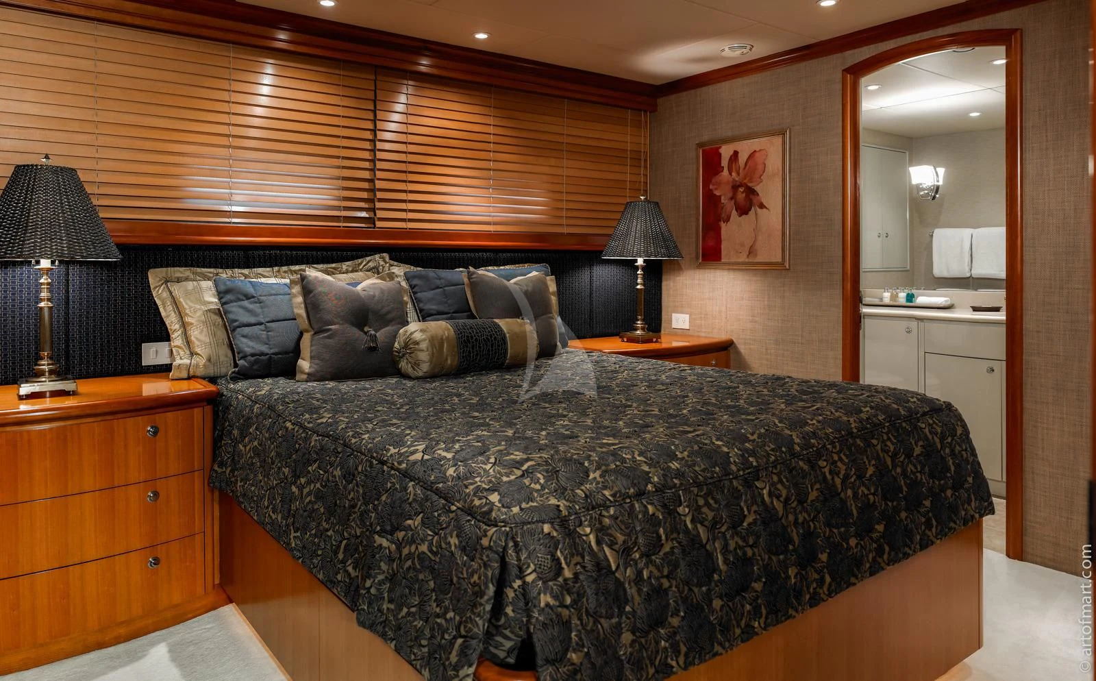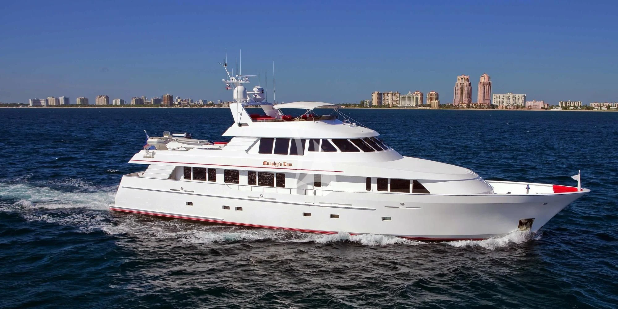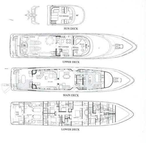 “Anything that can go right will go right,” is Murphy’s Law on this yacht. The antithesis of ordinary life, MURPHY’S LAW is a paradisaical self-contained world, catering to those desiring attentive service and a good time. Guests have the choice of dining alfresco on any of the three decks, or inside in formal elegance. Soft muted tones and cheerful light cherry joinery offer a soothing ambiance for eight guests on the lower deck. The master suite is advantageously located amidships at the point of least motion. It features a California king bed and a generous his-and-hers bath lavished in stunning marble. A VIP queen suite and two twin staterooms complete the accommodations. All rooms have LCD televisions with Direct TV and DVD/CD systems.