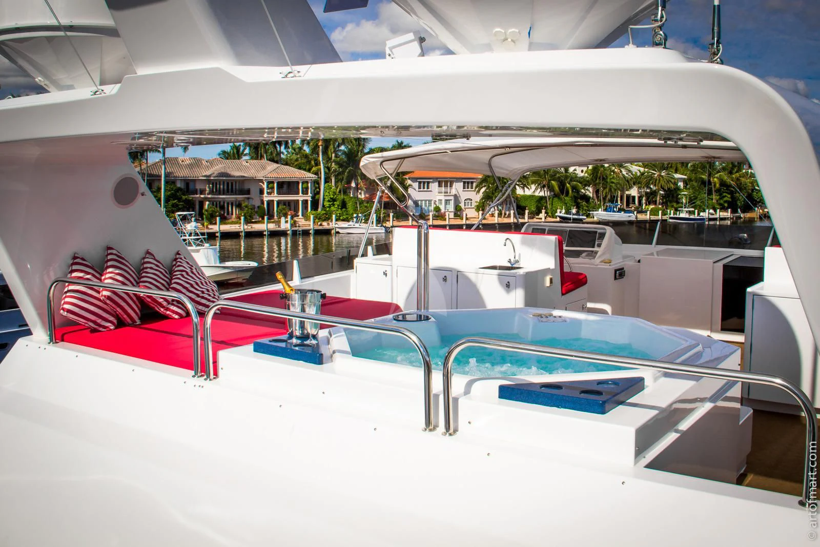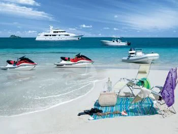 MURPHY’S LAW’s spacious interior opens to equally tremendous deck spaces. The sun-drenched flybridge is equipped with a stereo system to accompany the Jacuzzi dips and barbecues. Put the two four stroke Honda wave runners and the 15- foot Novurania in the water and the upper aft deck is ready for parties or afternoons under an optional sunshade. In addition, MURPHY’S LAW has a full complement of tenders and toys.