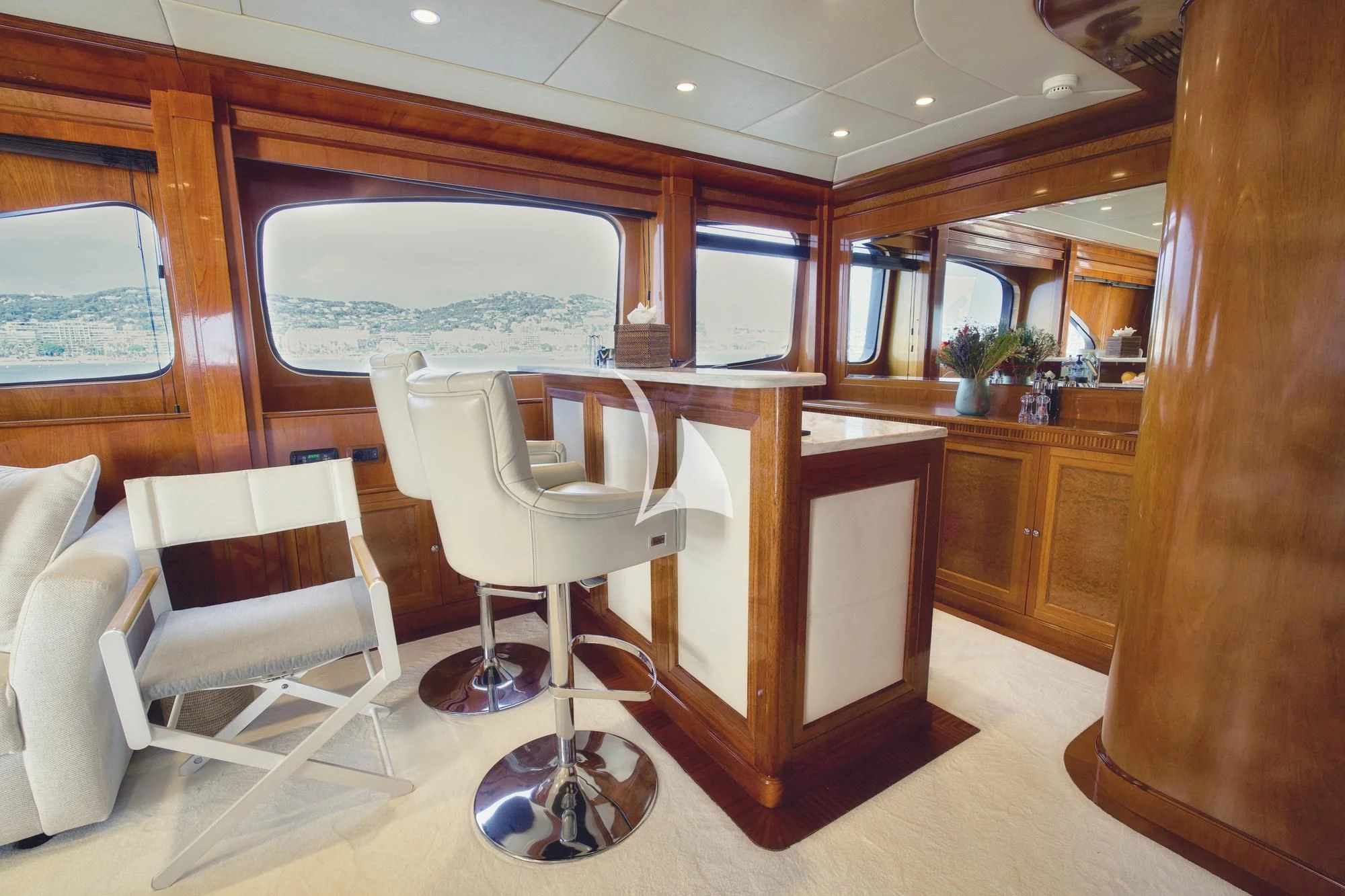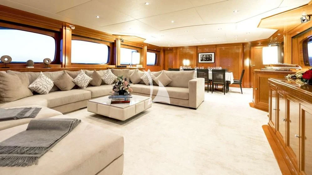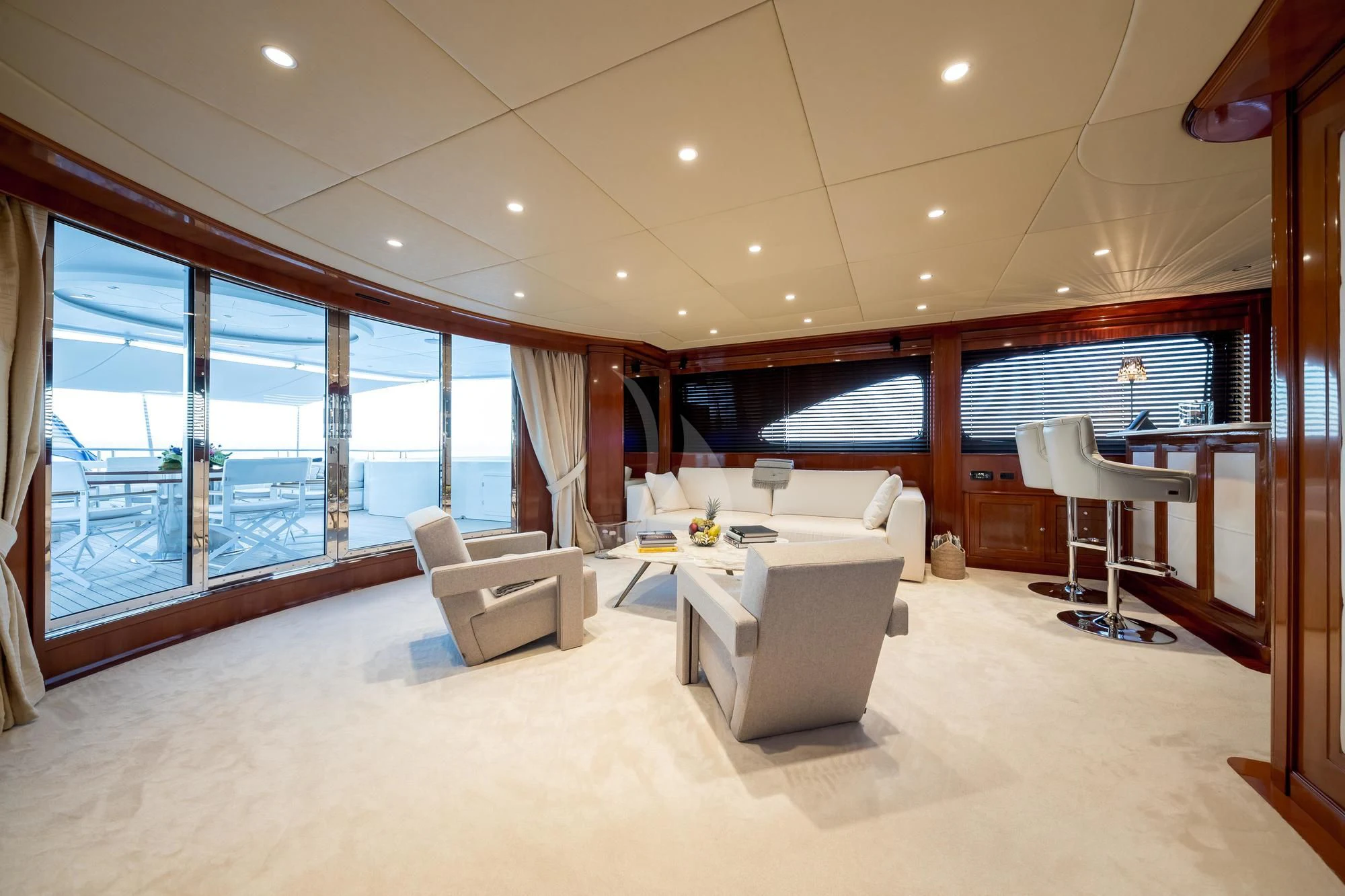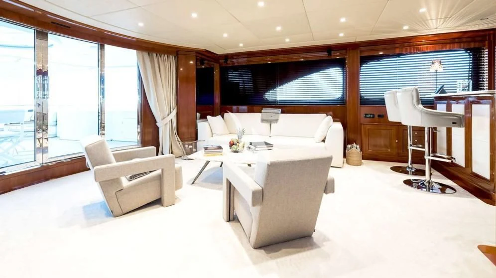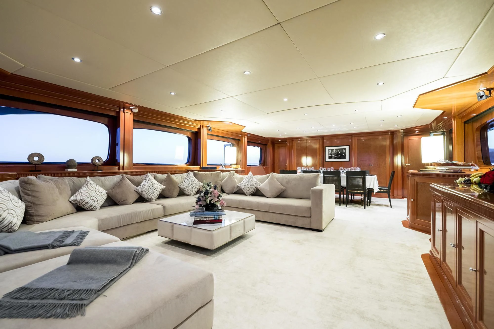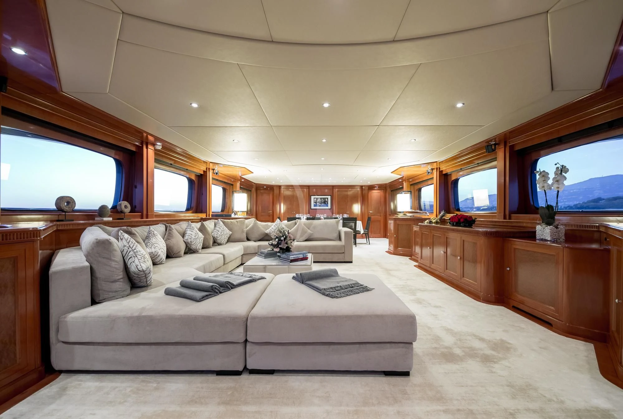 The interior spaces of MY WAY V are classically styled. The main salon is comfortable with rich wood walls, plush cream carpeting and sumptuous furnishings that allow guests to relax and socialize with ease. Forward of the yacht’s main salon is a beautiful black dining table where guests can enjoy exceptional meals prepared by the yacht’s five-star chef. The main salon is the perfect space to entertain while aboard with its lounge seating and a full bar.