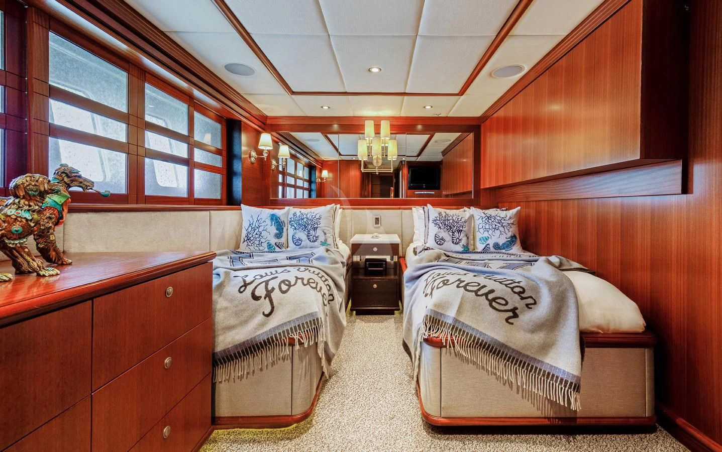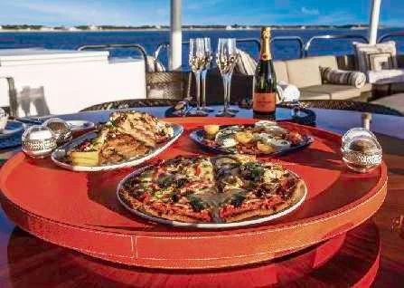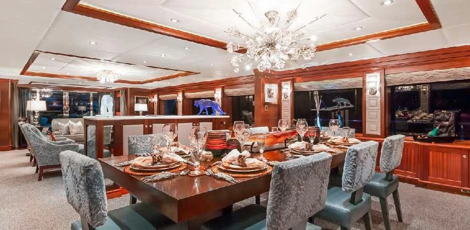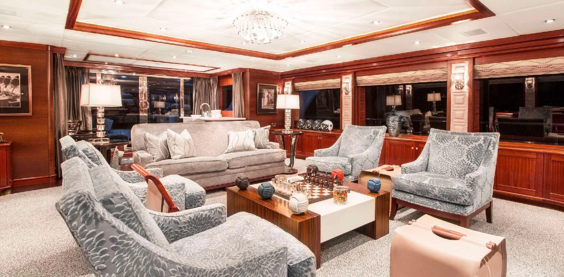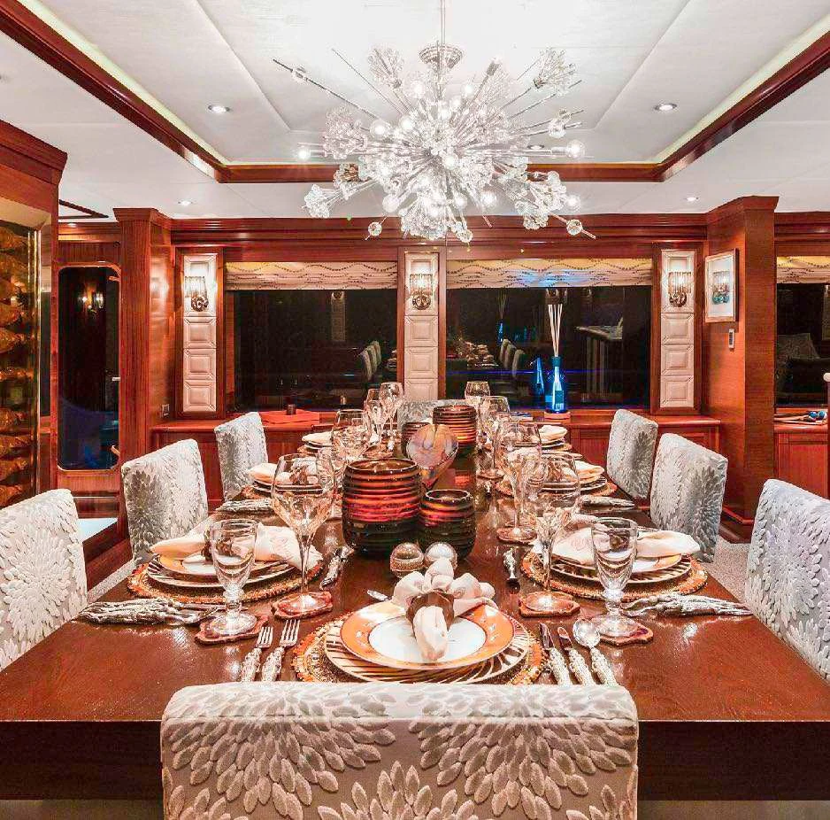 OCEAN CLUB’s interior will make charter guests feel right at home. Throughout the luxury yacht is a soothing grey and cream color palette with splashes of color that provide a sophisticated yet playful ambiance. Dazzling light fixtures enhance the perfectly designed spaces.
