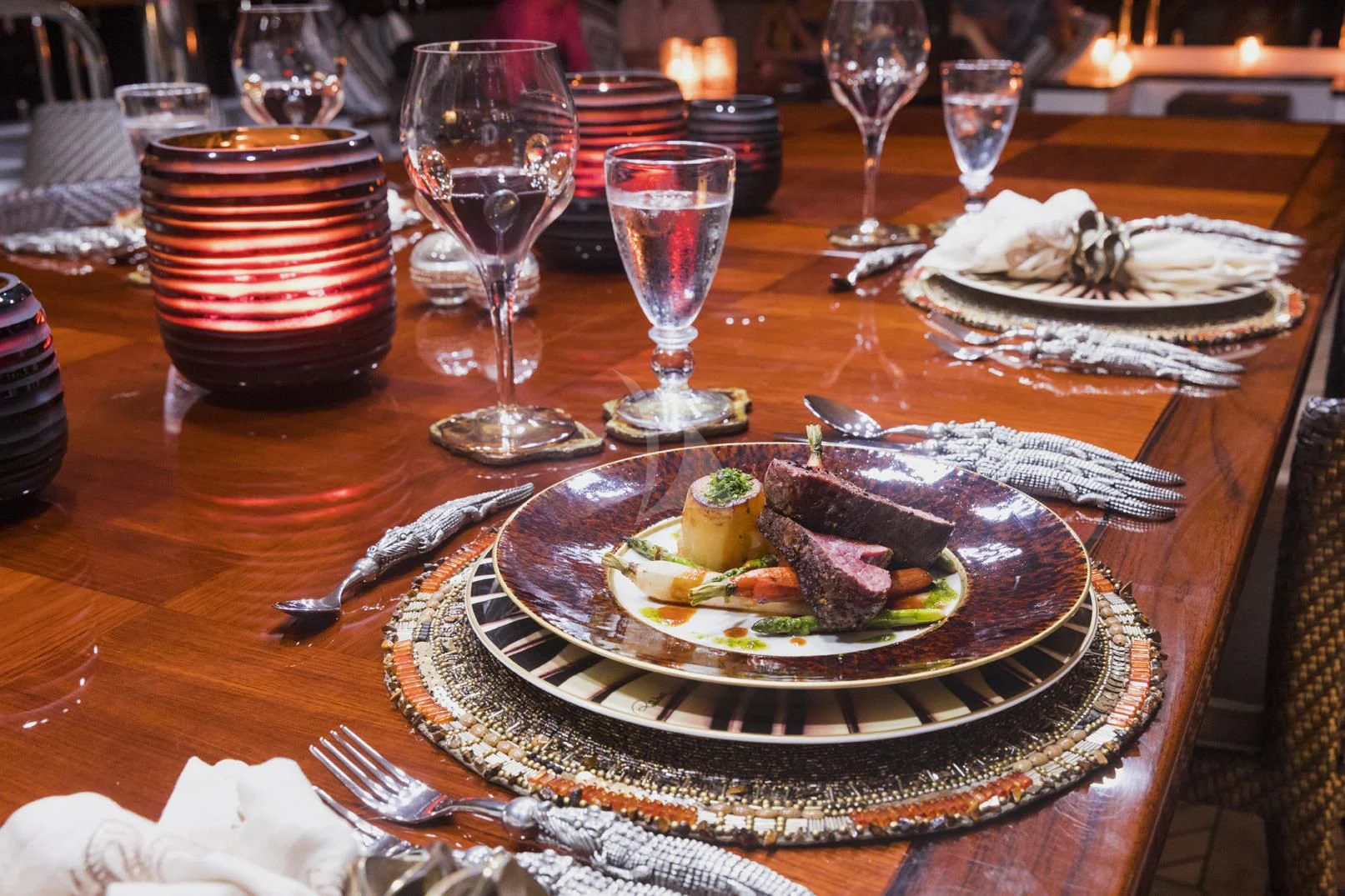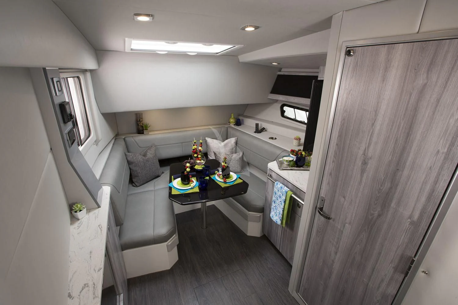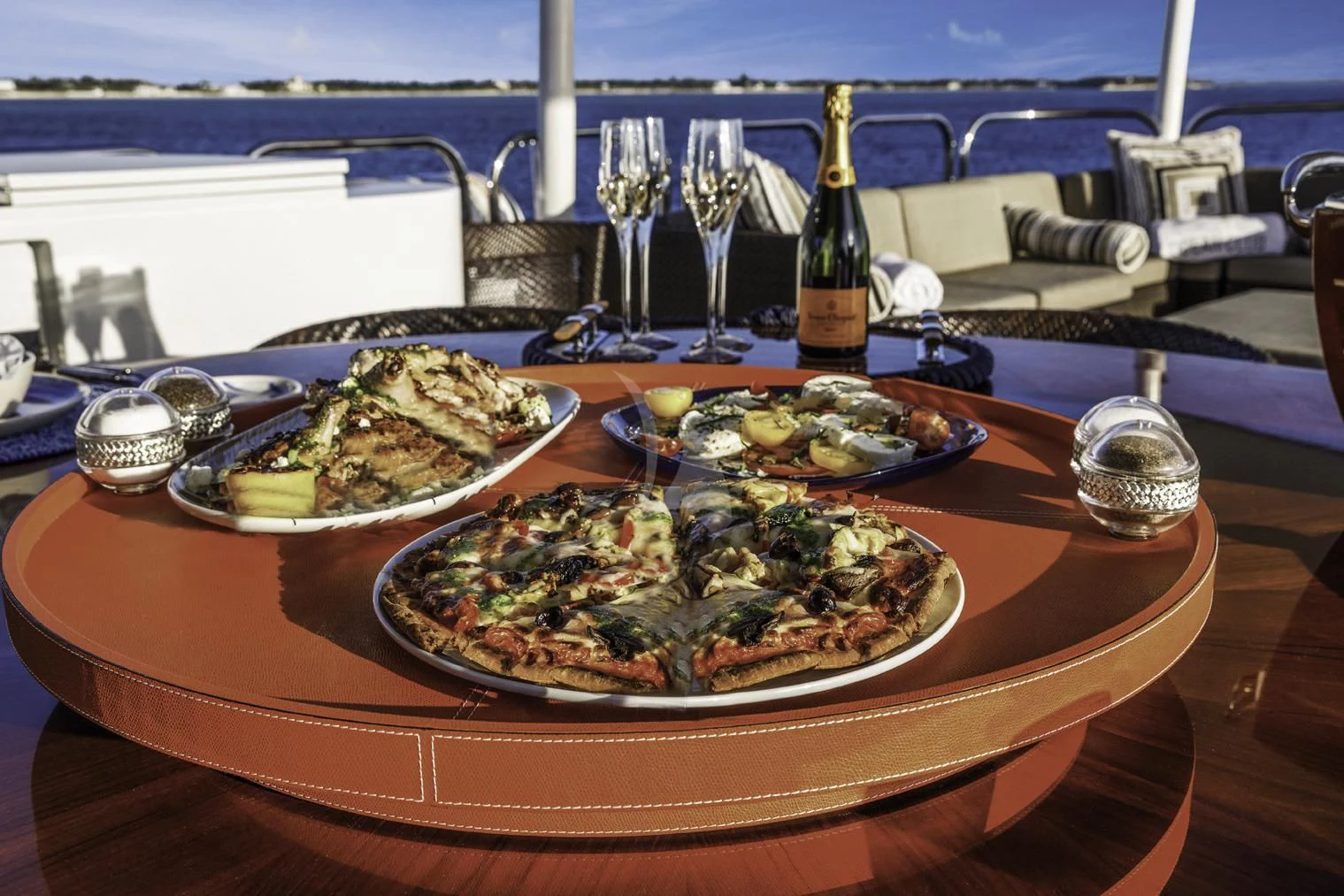 OCEAN CLUB’s interior will make charter guests feel right at home. Throughout the luxury yacht is a soothing grey and cream color palette with splashes of color that provide a sophisticated yet playful ambiance. Dazzling light fixtures enhance the perfectly designed spaces.