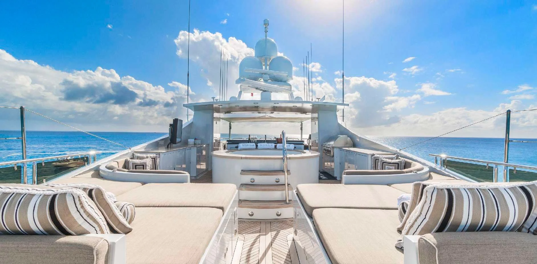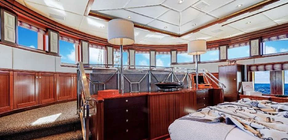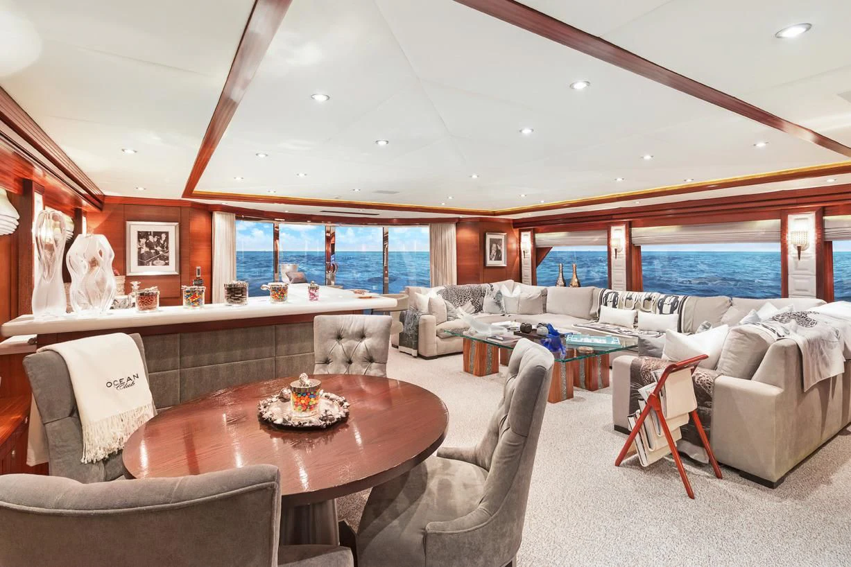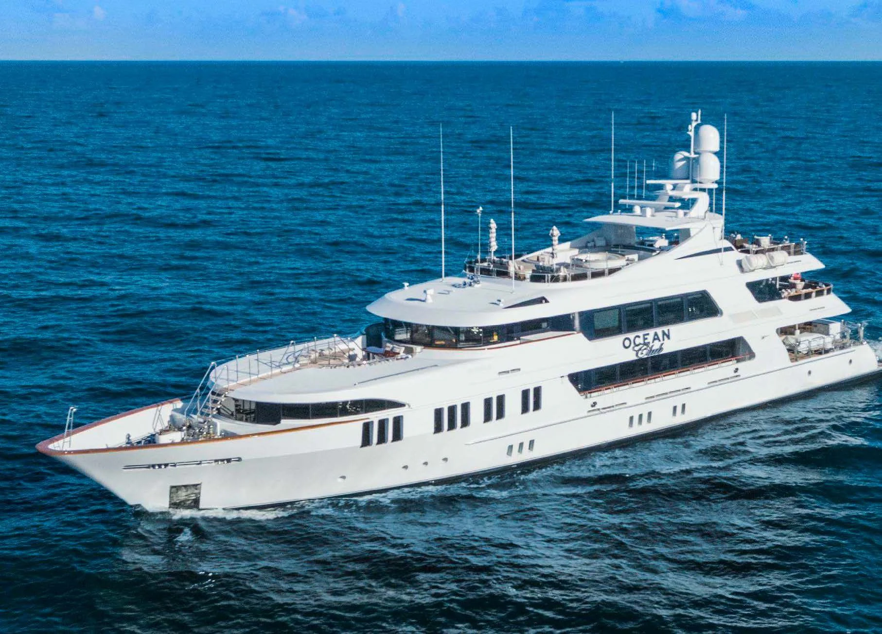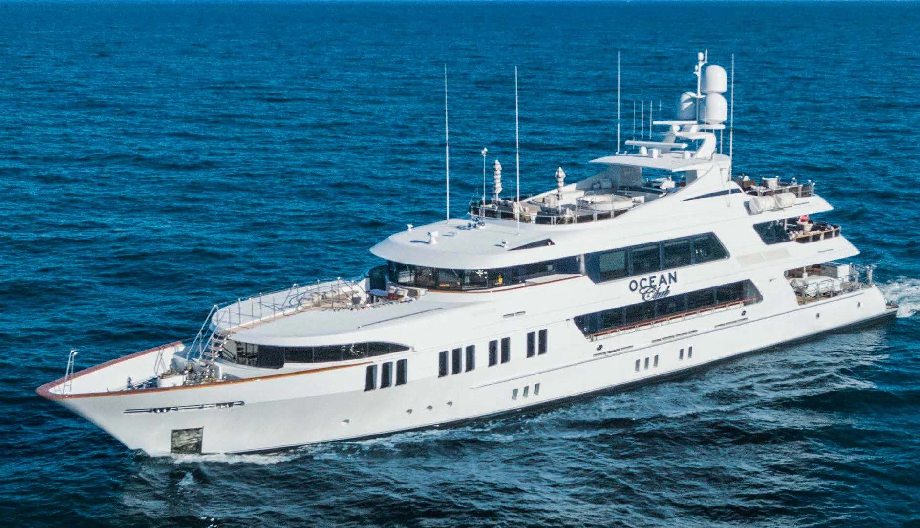 The luxury charter yacht welcomes 12 guests in the superior comfort of five beautifully appointed staterooms. The superyacht showcases a unique split-level master suite with a raised forward lounge that has awe-inspiring 270-degree views of the cruising destination.The master stateroom also features a plush king-size bed and his-and-hers en-suite baths with a shower and Jacuzzi tub. The additional staterooms aboard OCEAN CLUB include four double-bed staterooms and one twin-bed stateroom with two Pullmans.