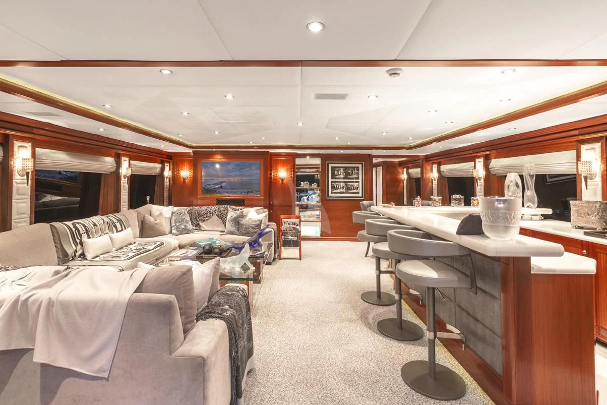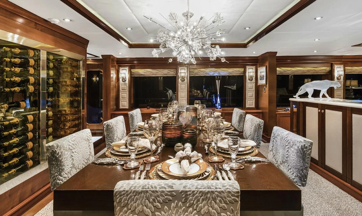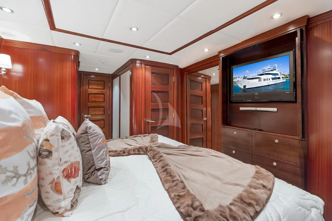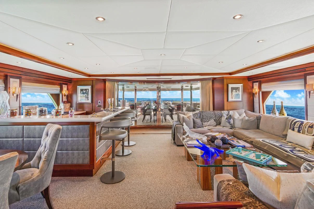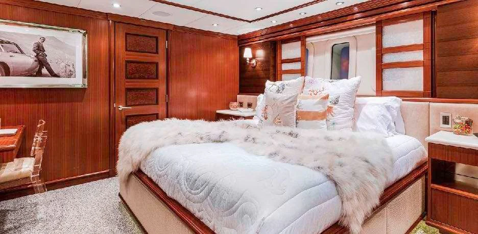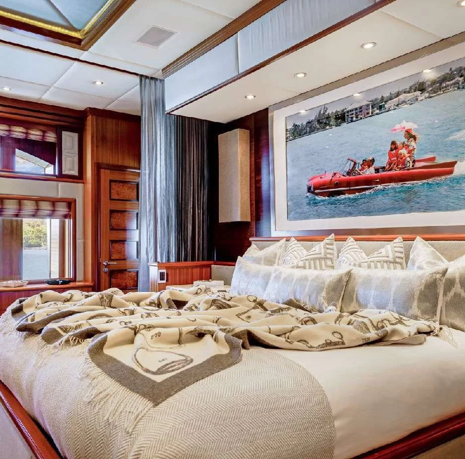 The luxury charter yacht welcomes 12 guests in the superior comfort of five beautifully appointed staterooms. The superyacht showcases a unique split-level master suite with a raised forward lounge that has awe-inspiring 270-degree views of the cruising destination.The master stateroom also features a plush king-size bed and his-and-hers en-suite baths with a shower and Jacuzzi tub. The additional staterooms aboard OCEAN CLUB include four double-bed staterooms and one twin-bed stateroom with two Pullmans.
