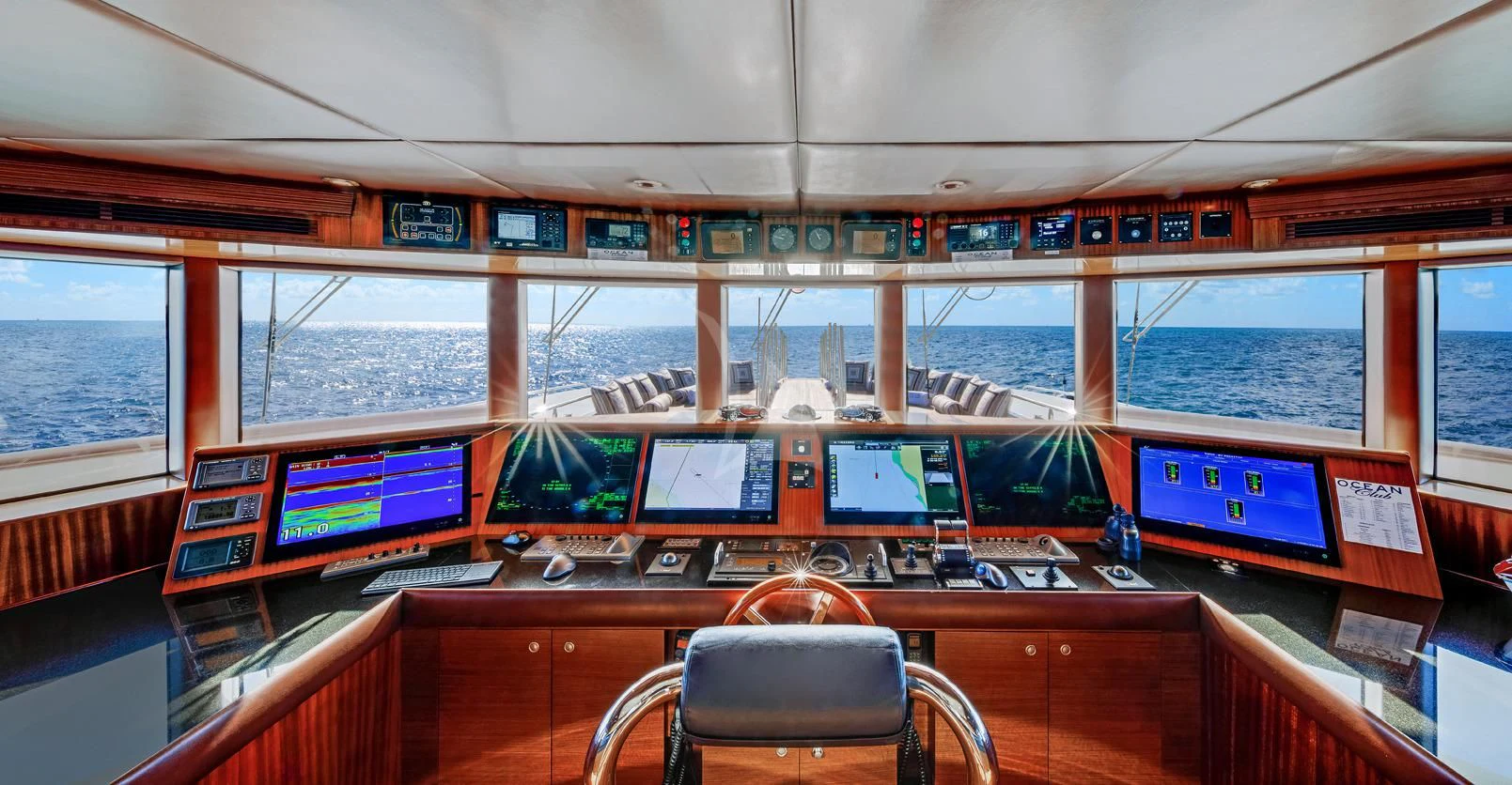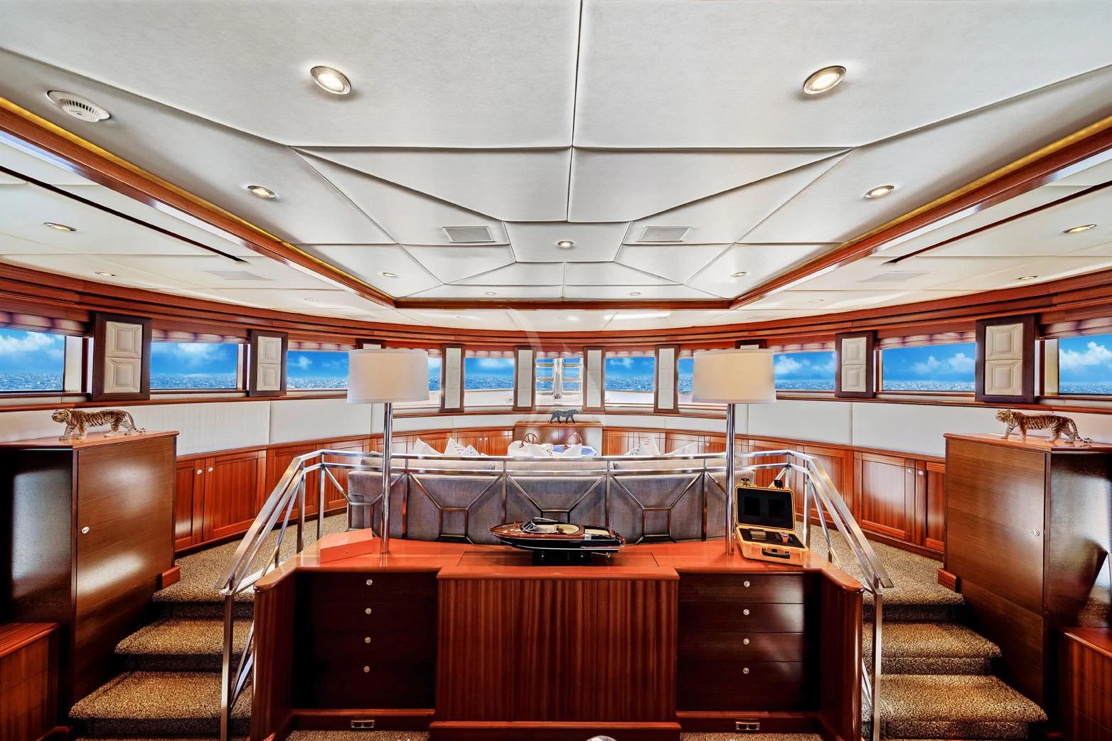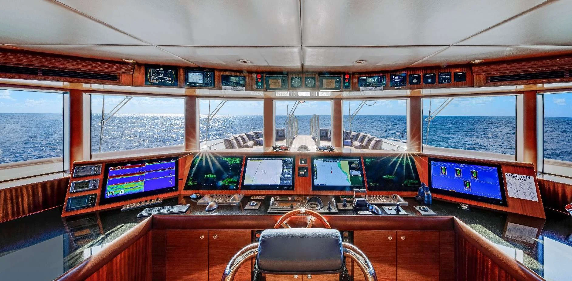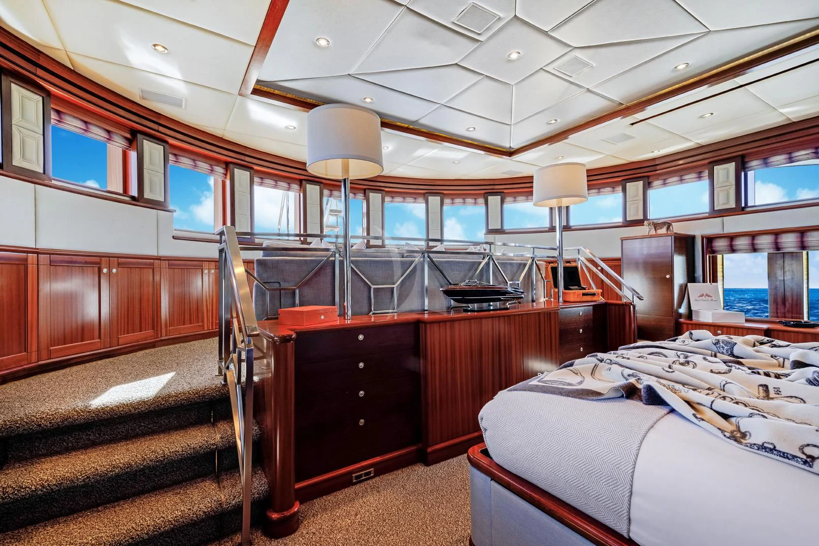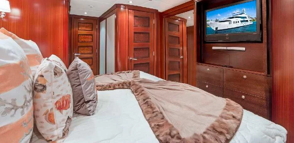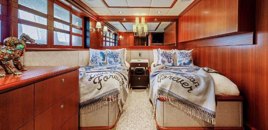 The luxury charter yacht welcomes 12 guests in the superior comfort of five beautifully appointed staterooms. The superyacht showcases a unique split-level master suite with a raised forward lounge that has awe-inspiring 270-degree views of the cruising destination.The master stateroom also features a plush king-size bed and his-and-hers en-suite baths with a shower and Jacuzzi tub. The additional staterooms aboard OCEAN CLUB include four double-bed staterooms and one twin-bed stateroom with two Pullmans.