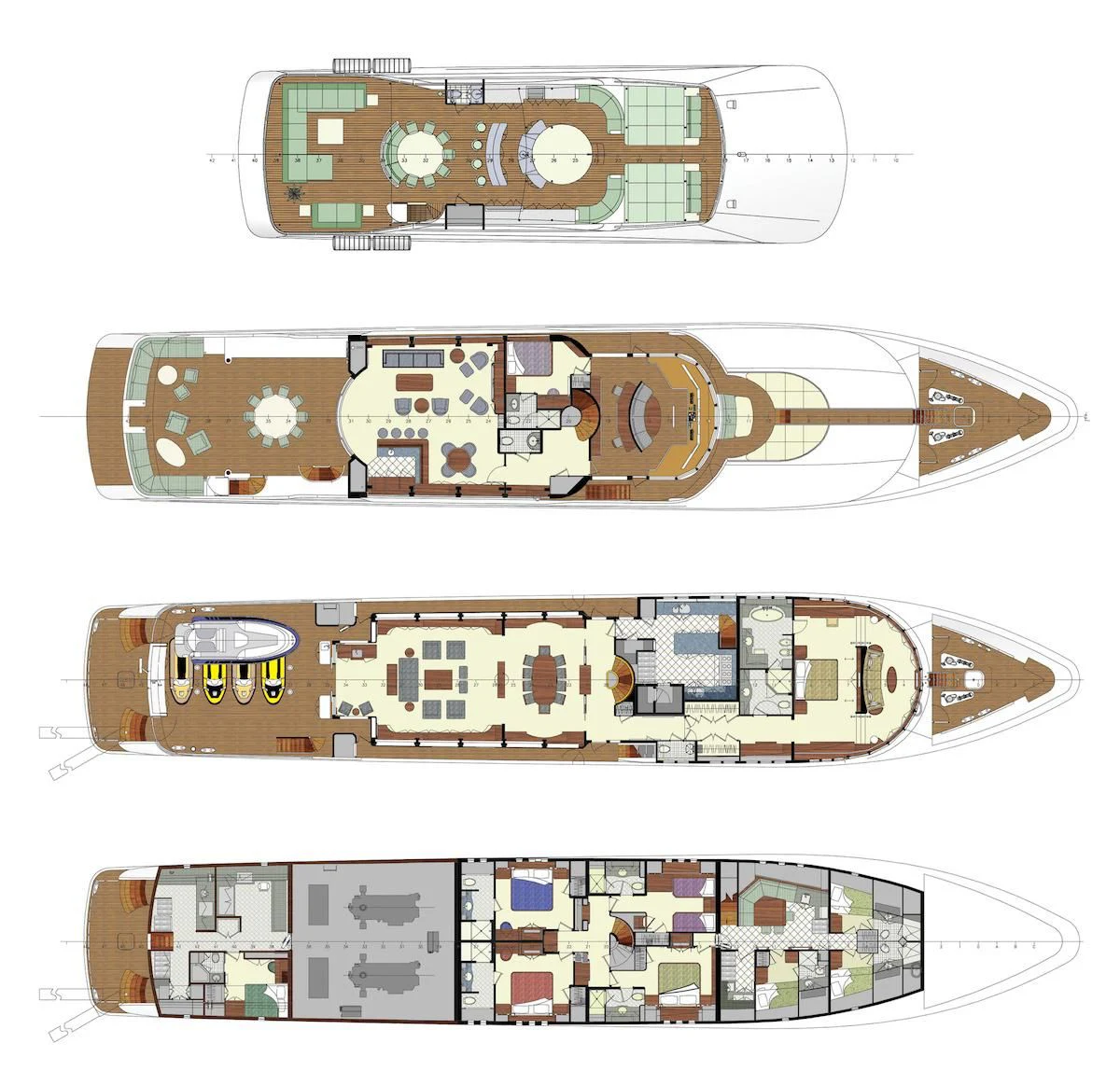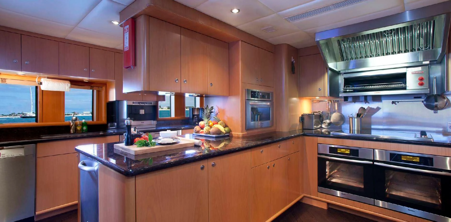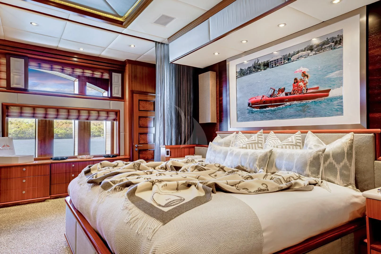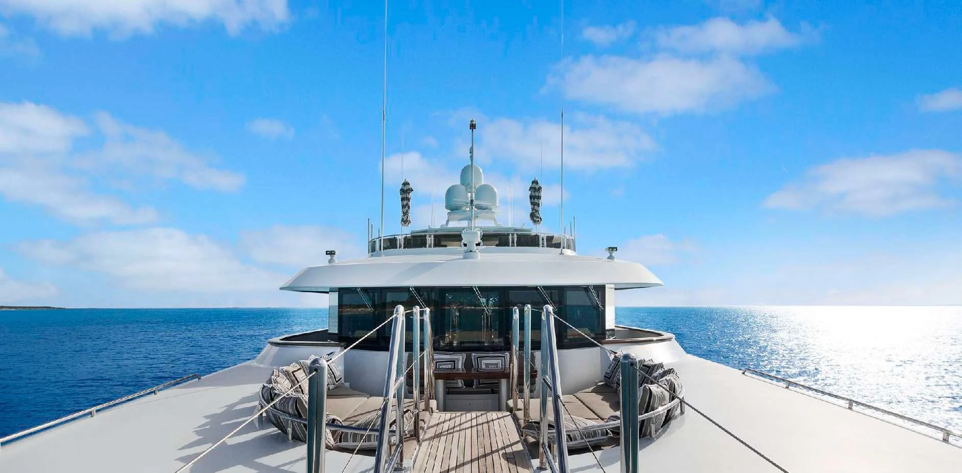 The luxury charter yacht welcomes 12 guests in the superior comfort of five beautifully appointed staterooms. The superyacht showcases a unique split-level master suite with a raised forward lounge that has awe-inspiring 270-degree views of the cruising destination.The master stateroom also features a plush king-size bed and his-and-hers en-suite baths with a shower and Jacuzzi tub. The additional staterooms aboard OCEAN CLUB include four double-bed staterooms and one twin-bed stateroom with two Pullmans.