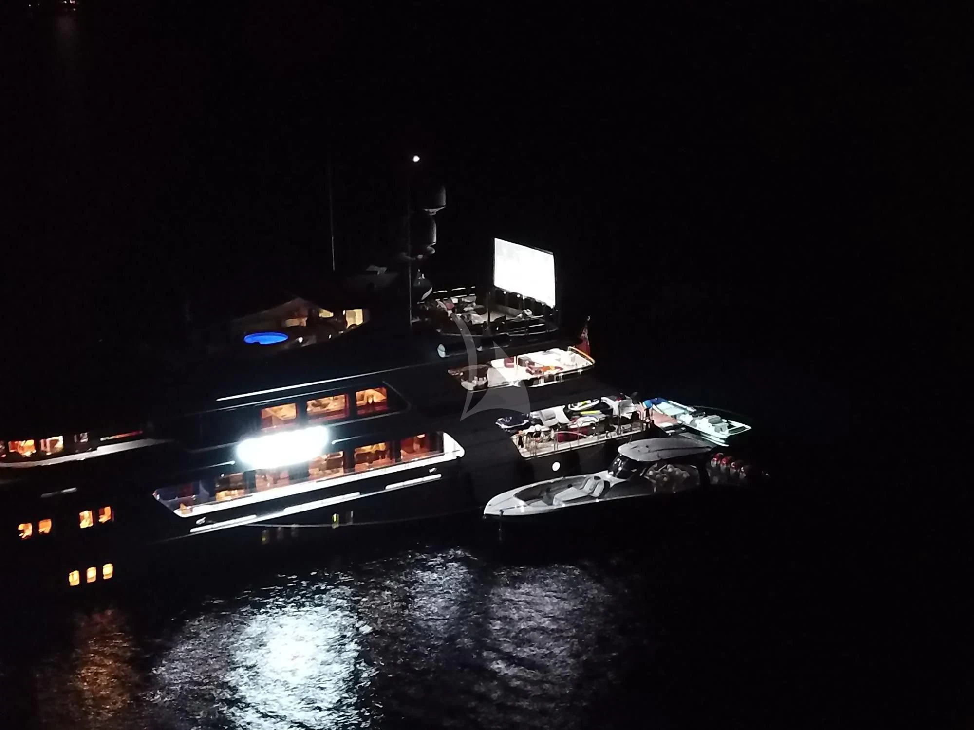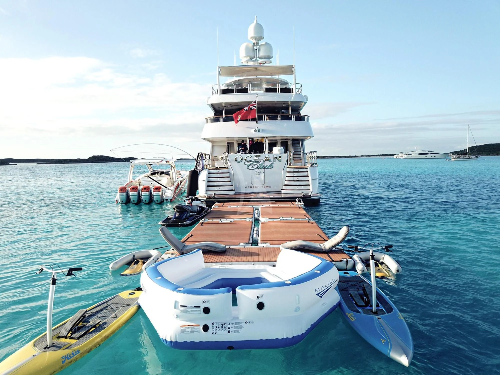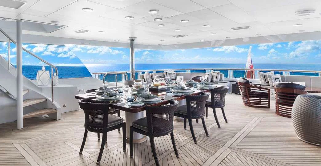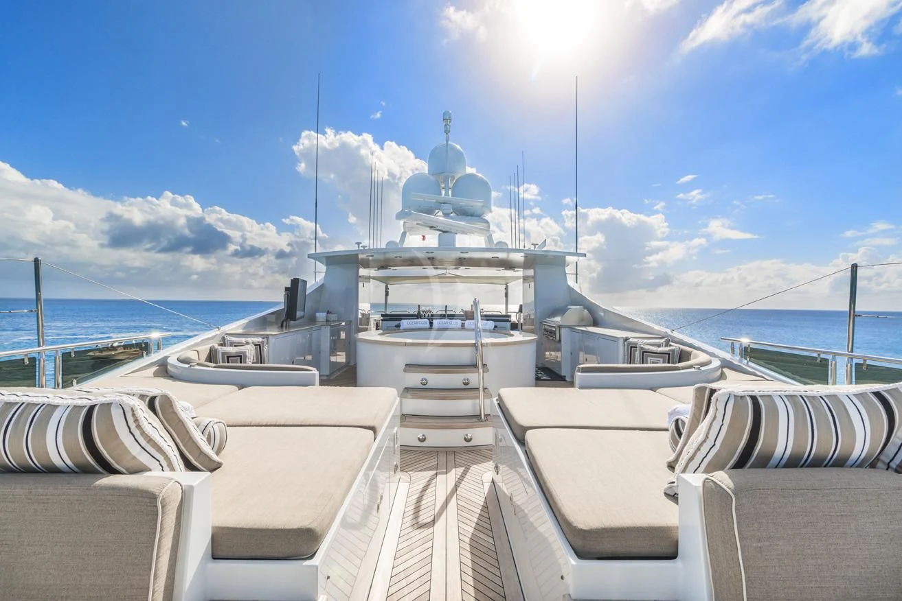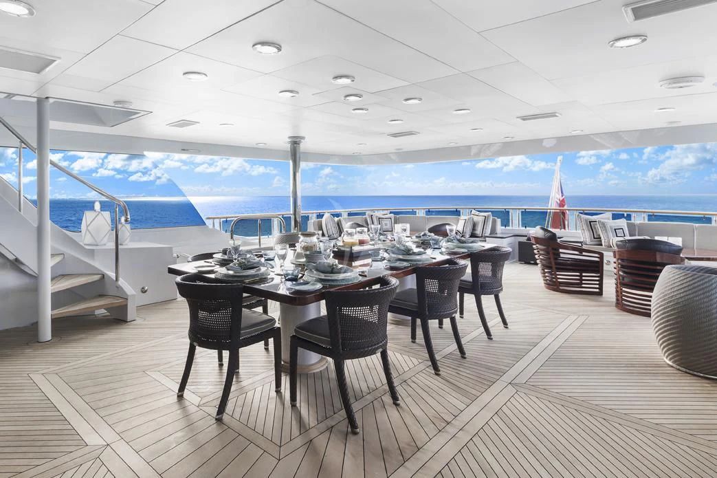 The superyacht features multiple outdoor living areas for guest enjoyment. The sundeck is the social hub of the yacht — it showcases a Jacuzzi, large sunpads and casual alfresco dining. When the sunsets, an over-sized movie screen allows guests to enjoy a movie under the stars. On the upper deck aft, the charter yacht offers alfresco dining. A highlight for guests is her 80-foot (24.3m) floating beach club that will allow for days to be spent right by the water’s edge enjoying OCEAN CLUB’s plethora of water toys.