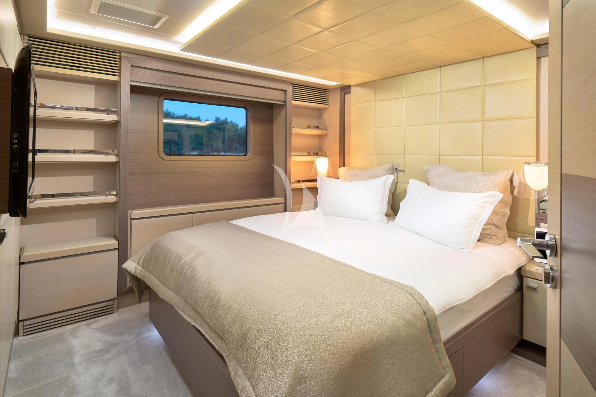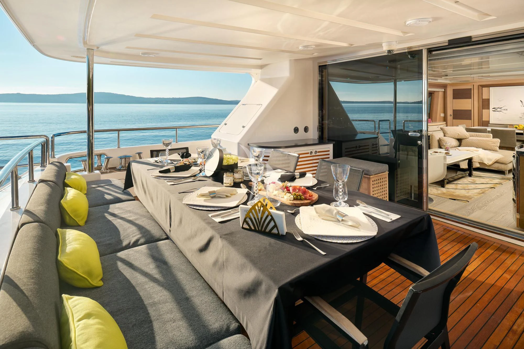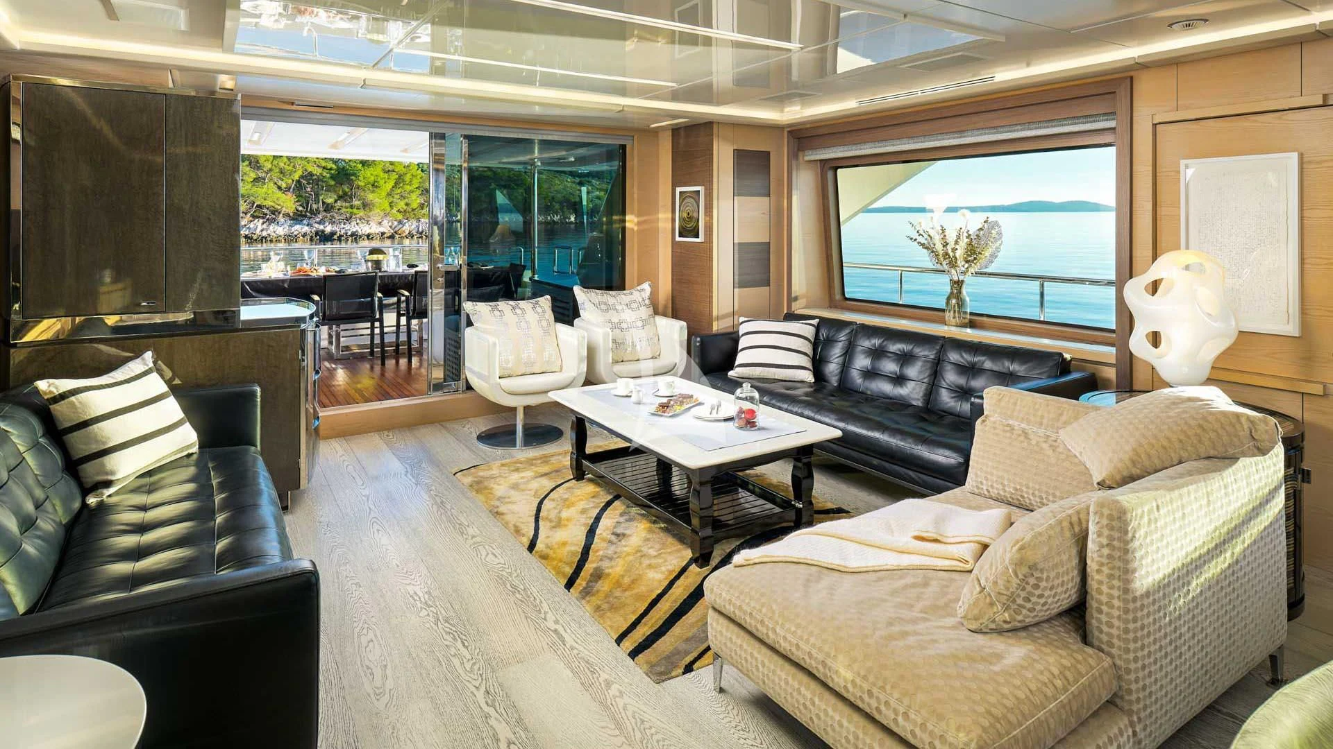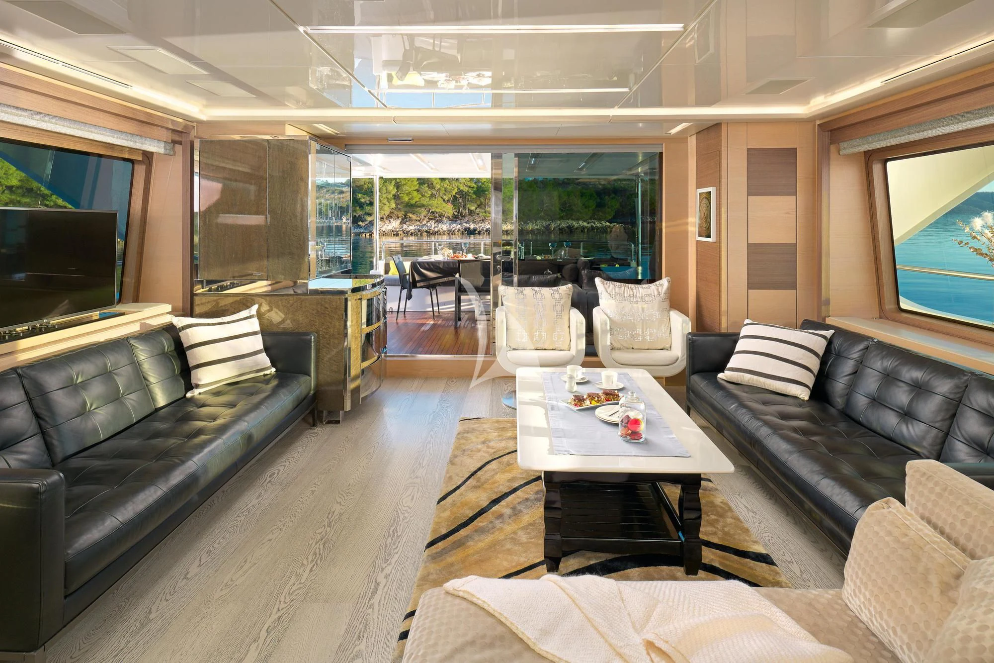 - Large continuous glass panels throughout the main salon and master cabin