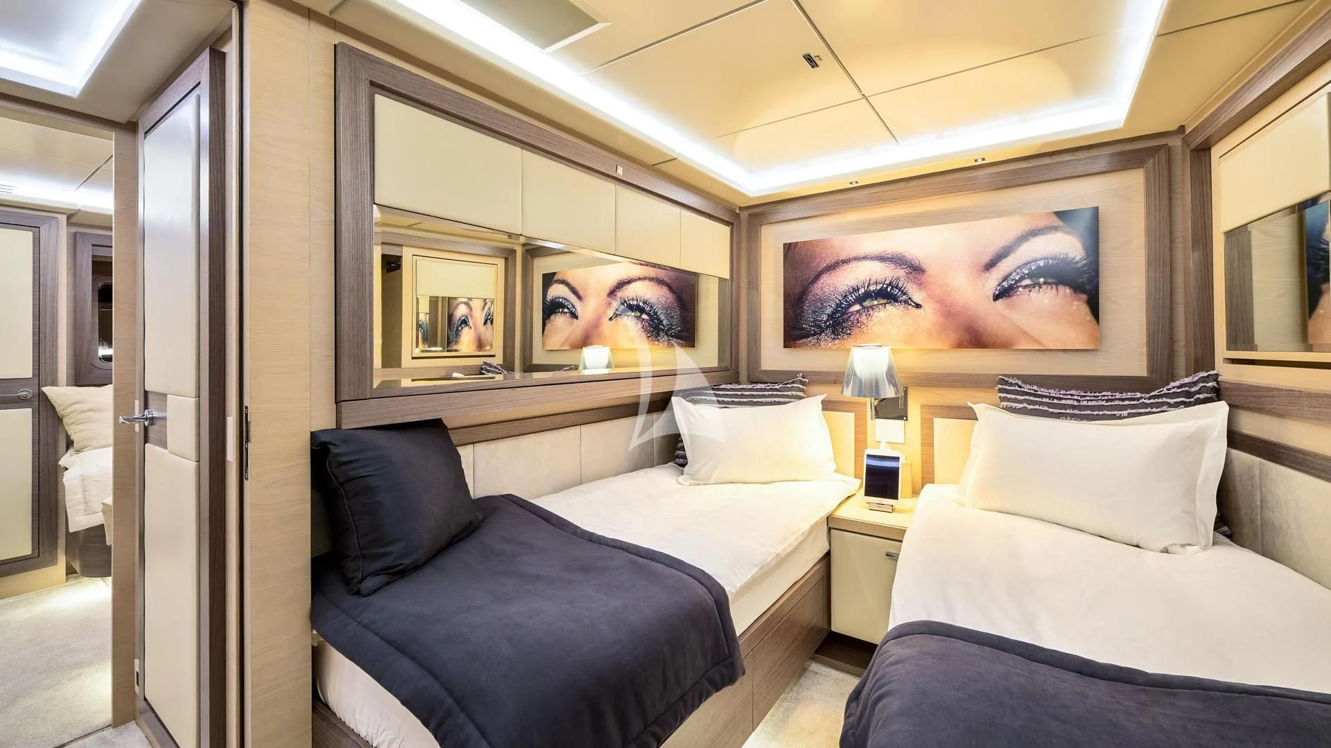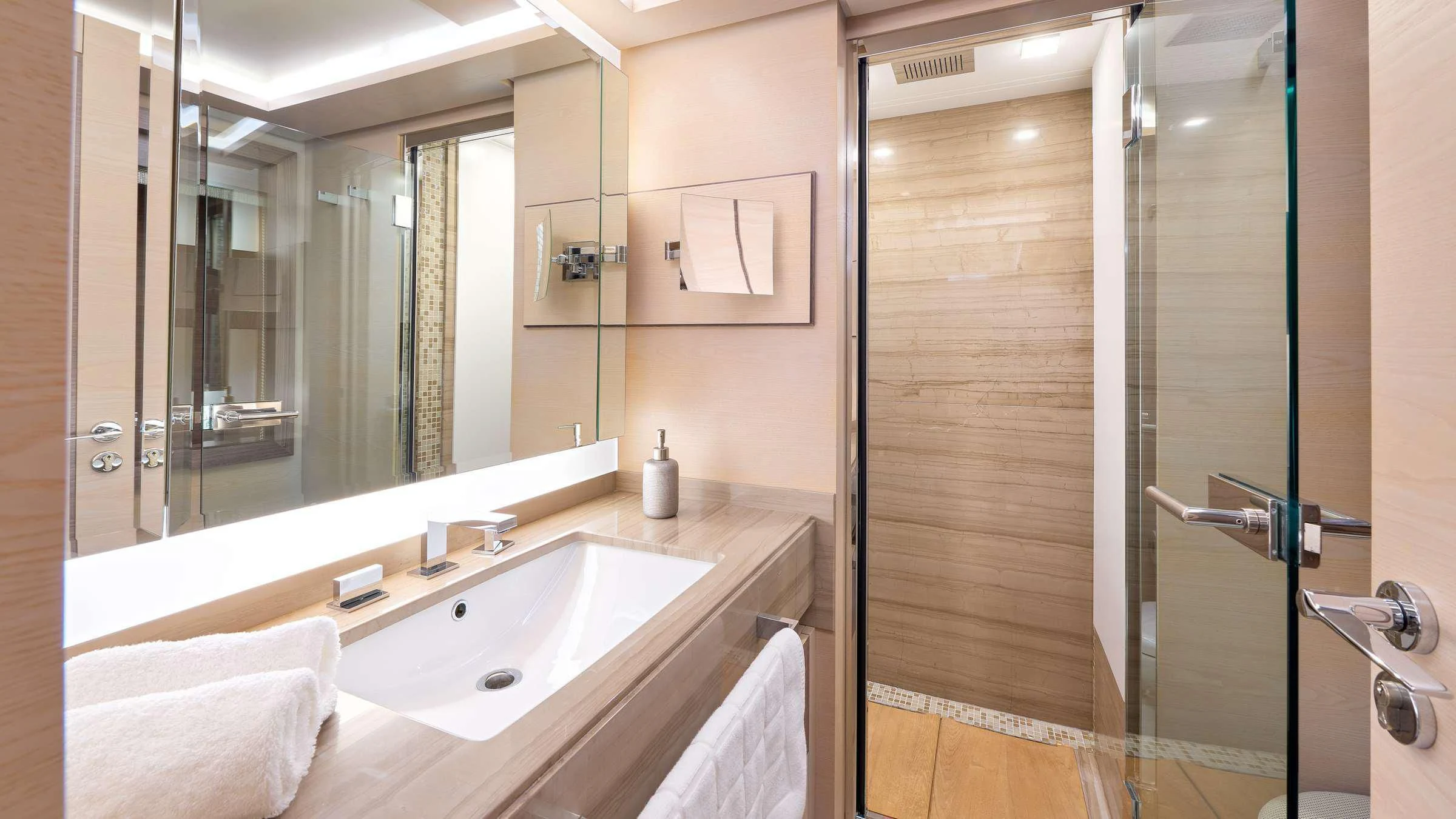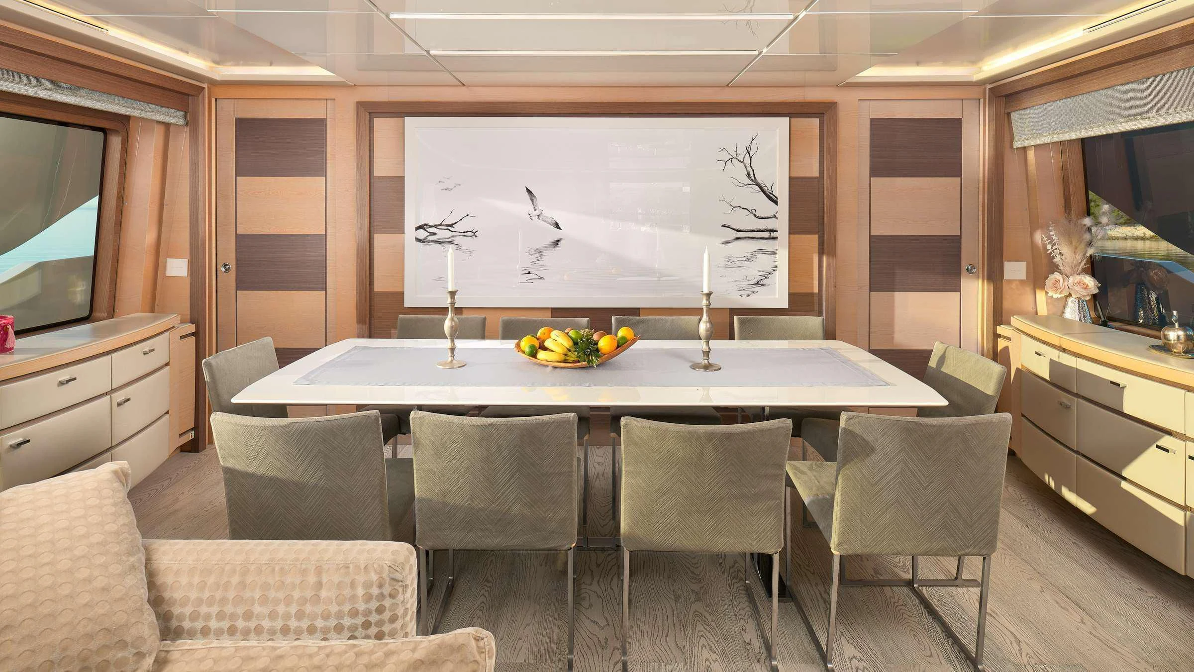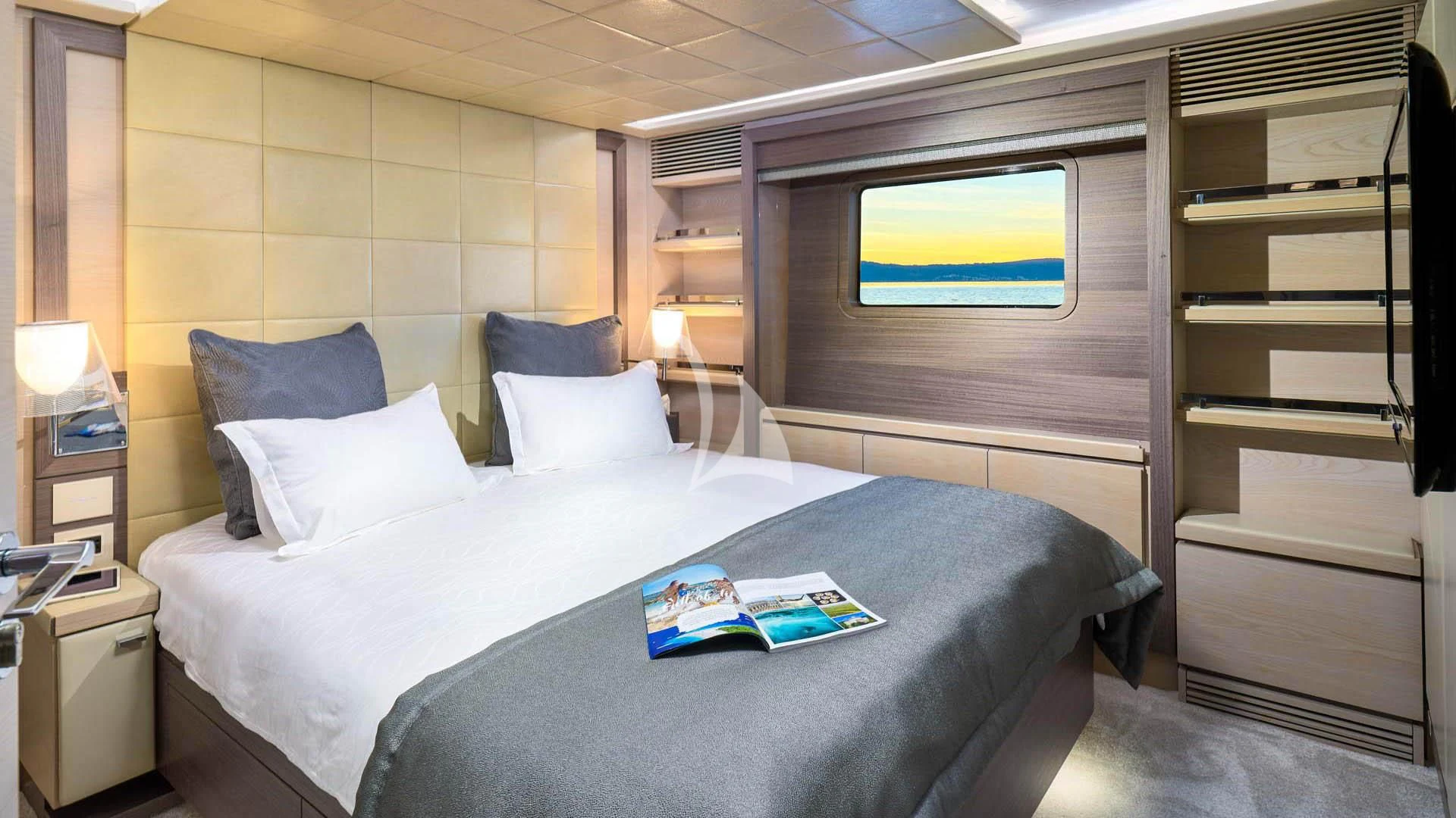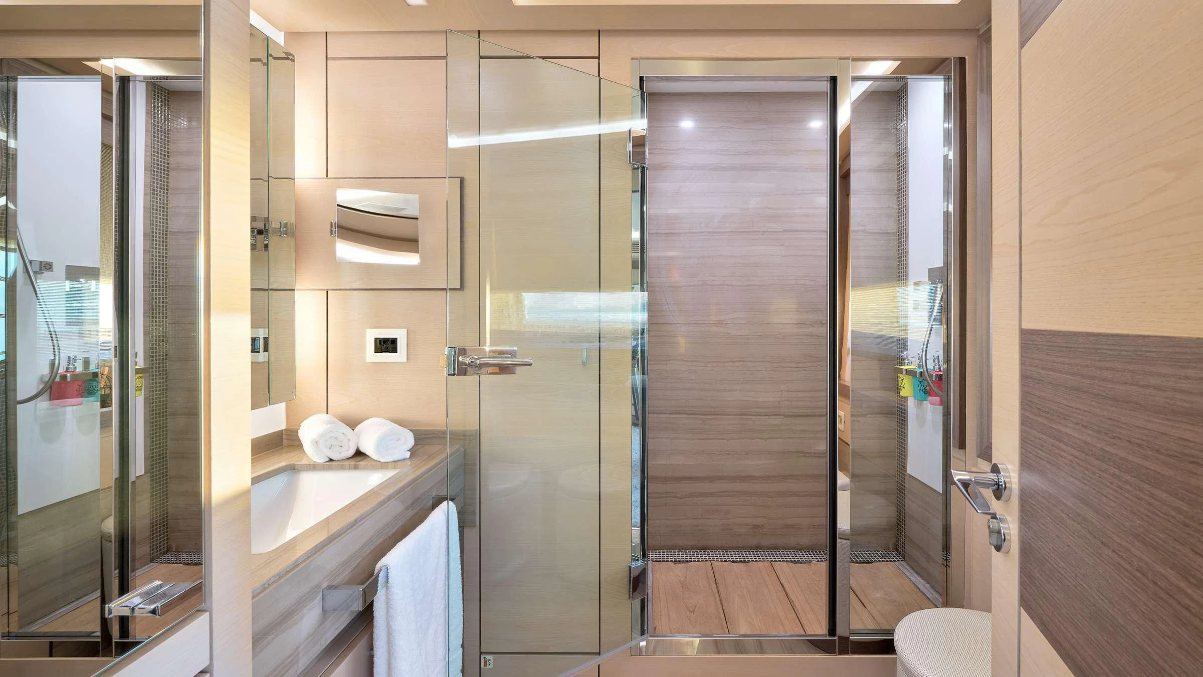 - Large continuous glass panels throughout the main salon and master cabin