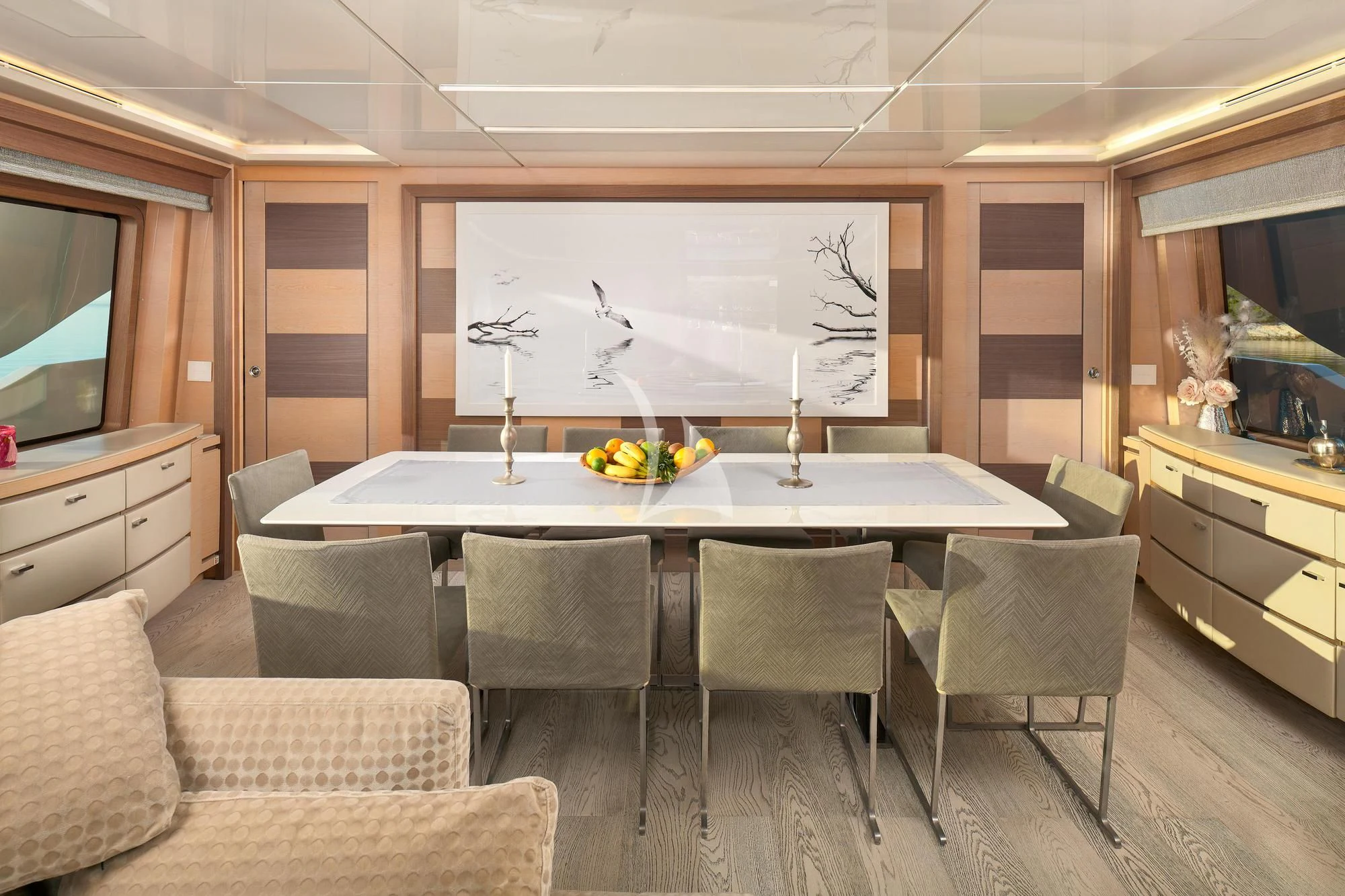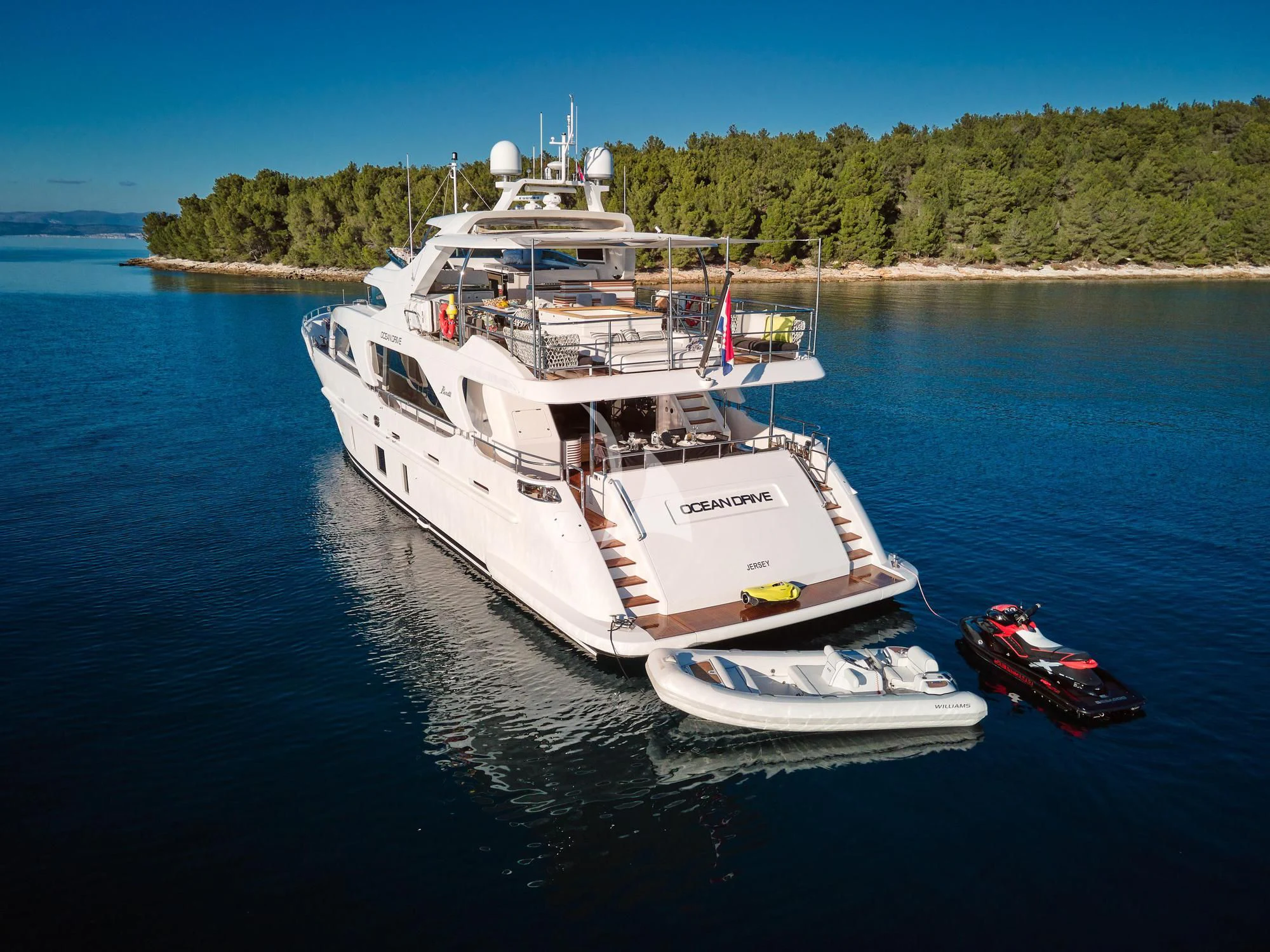 OCEAN DRIVE’s main salon features ultra-contemporary décor to create a refined and well-balanced ambiance. The large, tinted glass panels add to the elegant atmosphere and make the area more comfortable for guests. This modern motor yacht was built with entertainment in mind. OCEAN DRIVE is well-suited for charters with both family and friends.