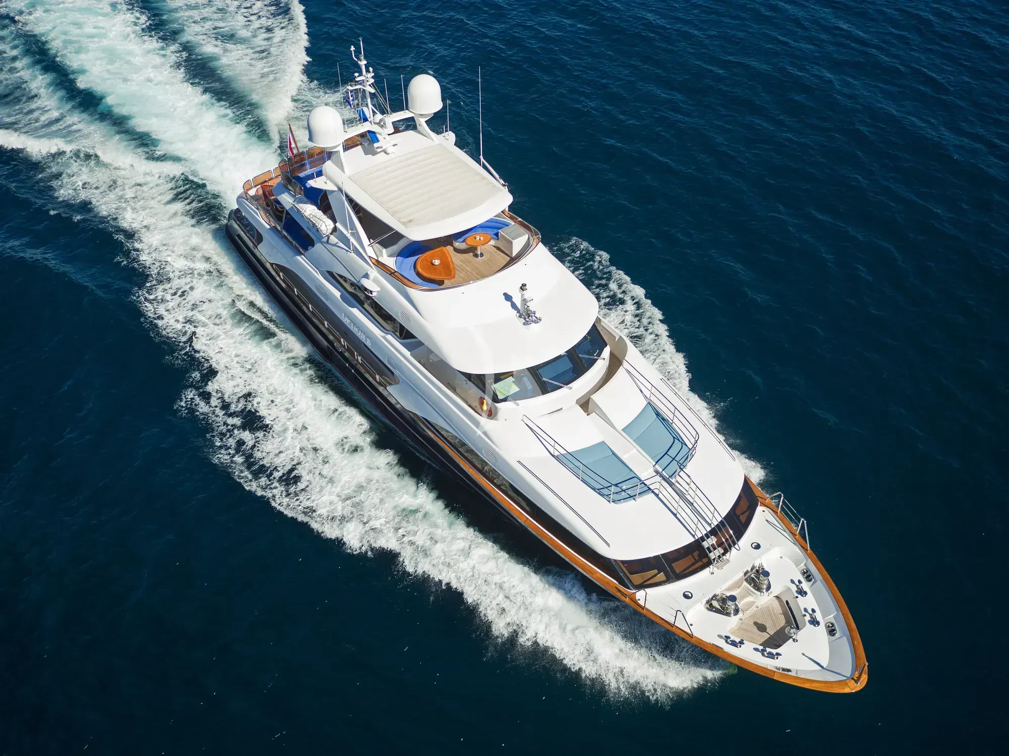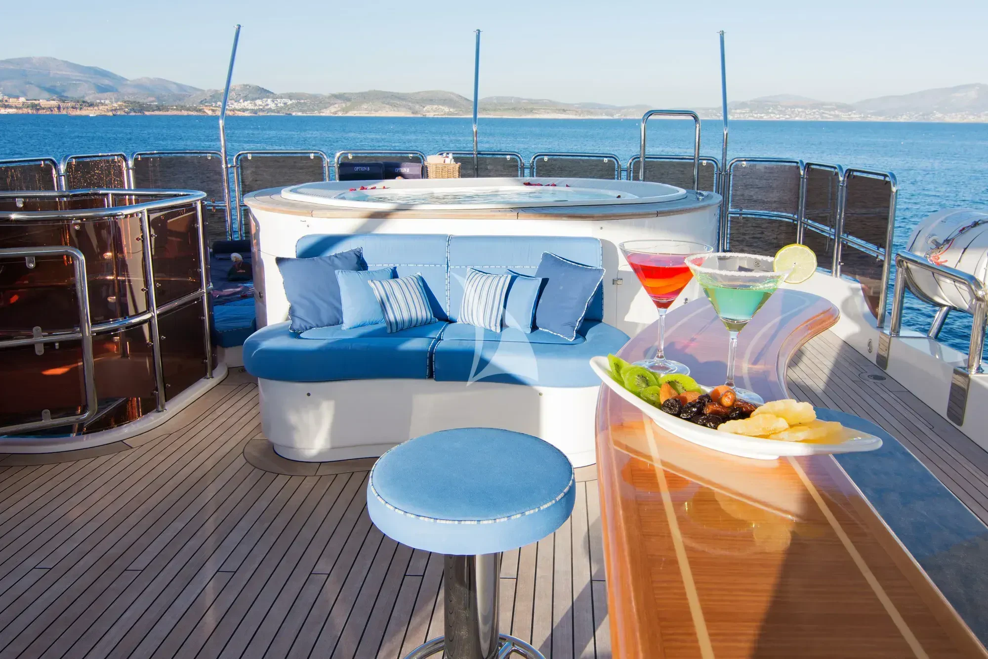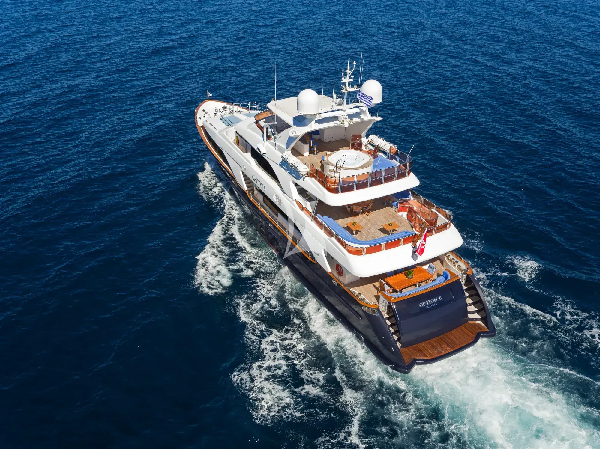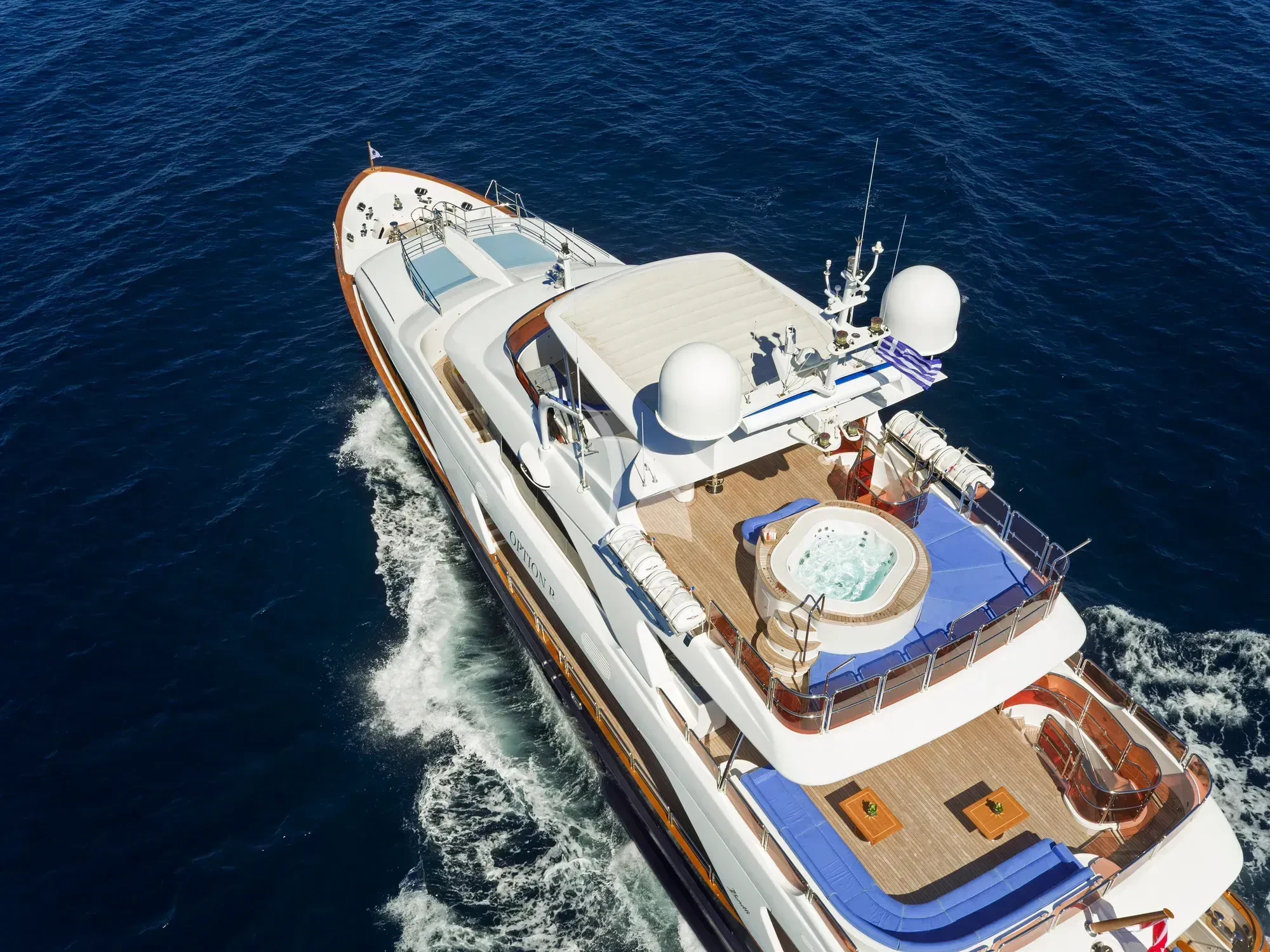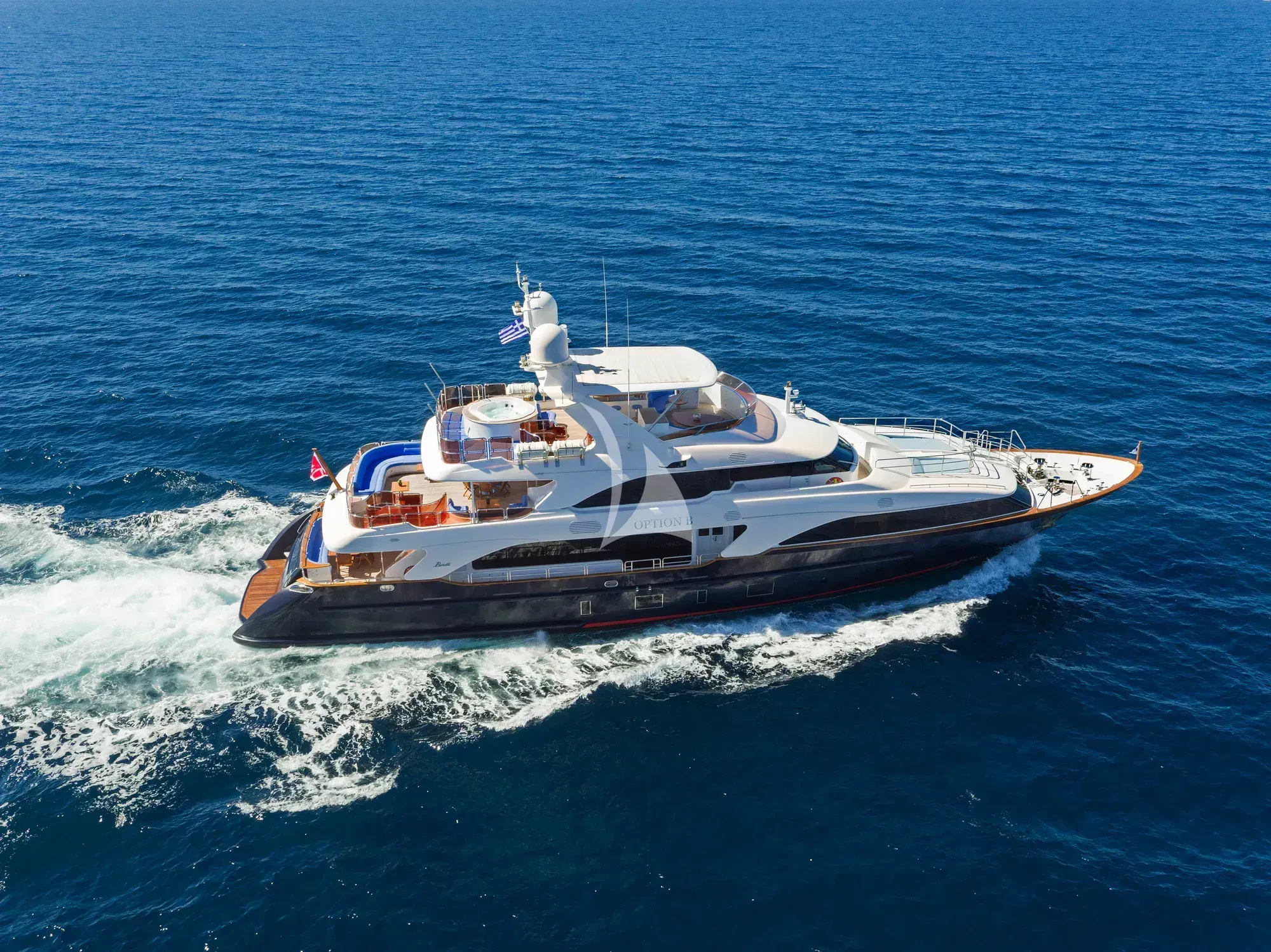 Every effort has been made to ensure guests can enjoy a luxury charter experience. OPTION B's interior features elegant styling and large windows. Guests can enjoy the utmost comfort while lounging in the plush comfort of the main salon and skylounge. There is also formal dining in the main salon. Out on deck, the generous, well-designed spaces continue. Attractions include the Jacuzzi on the sun deck, gym equipment, and plenty of space to dine and relax.