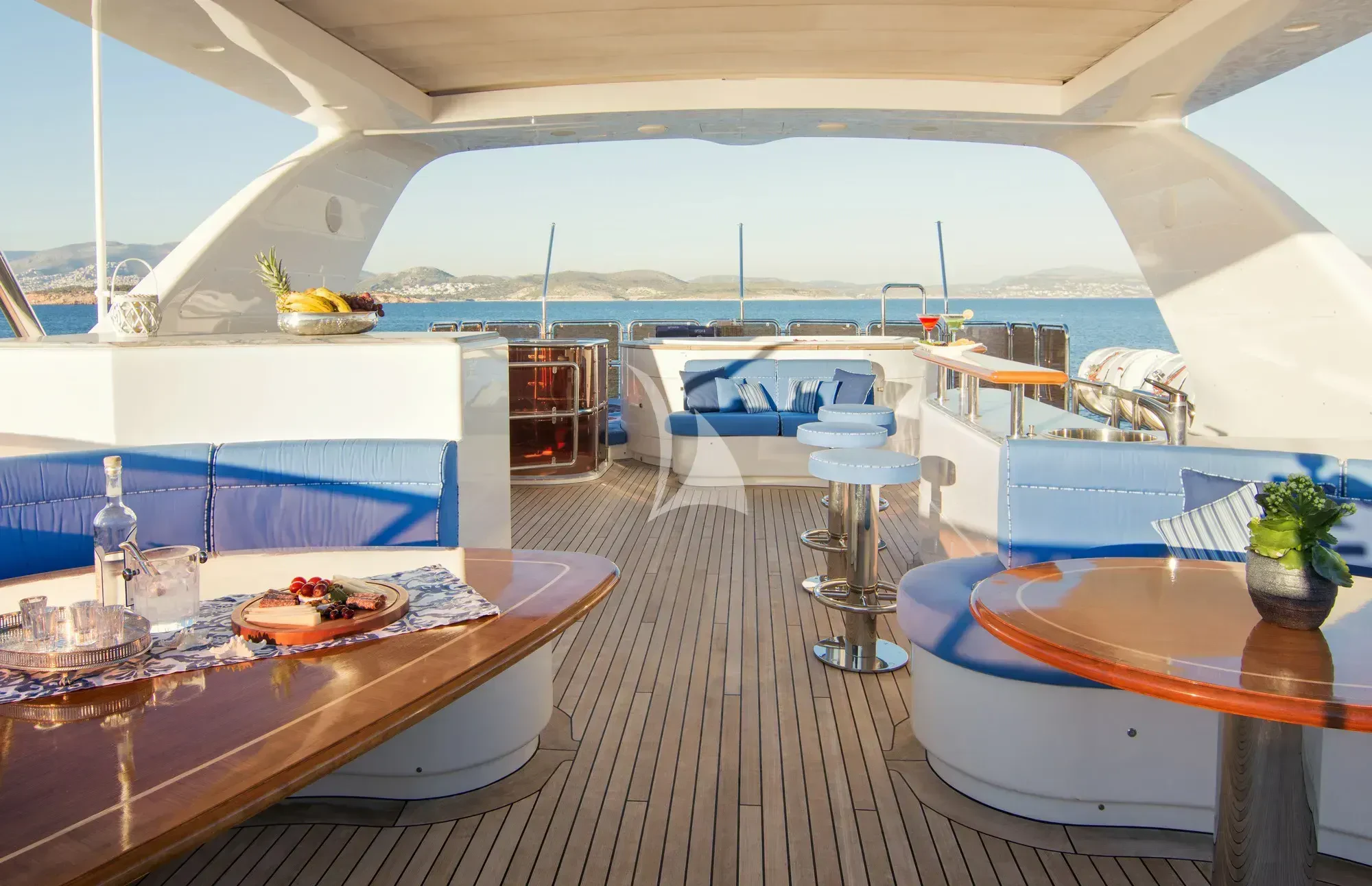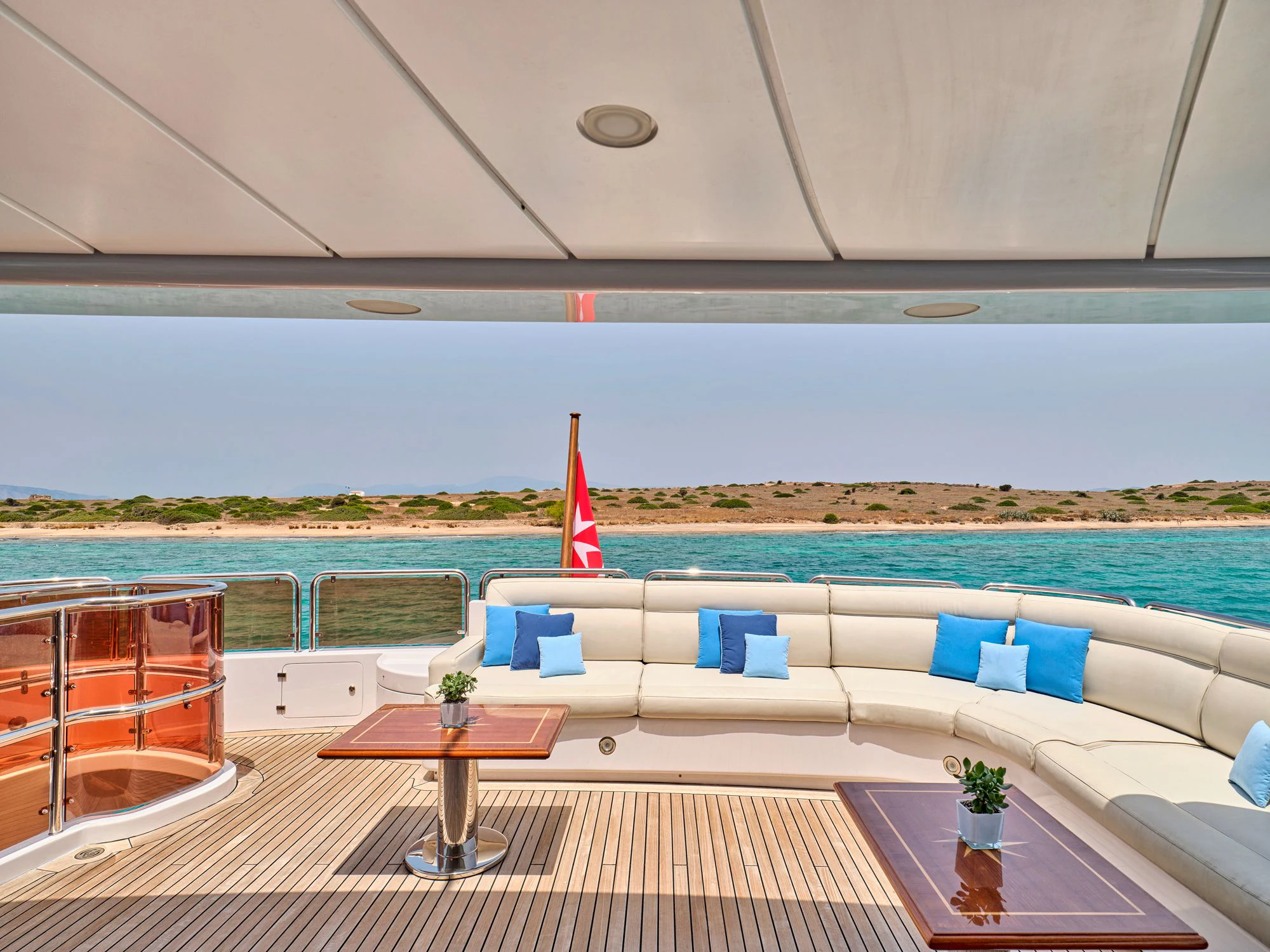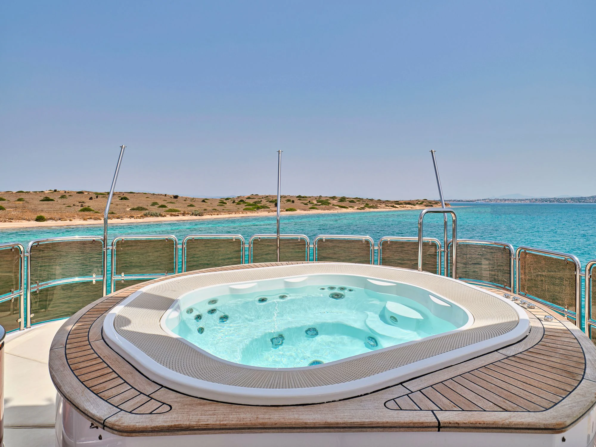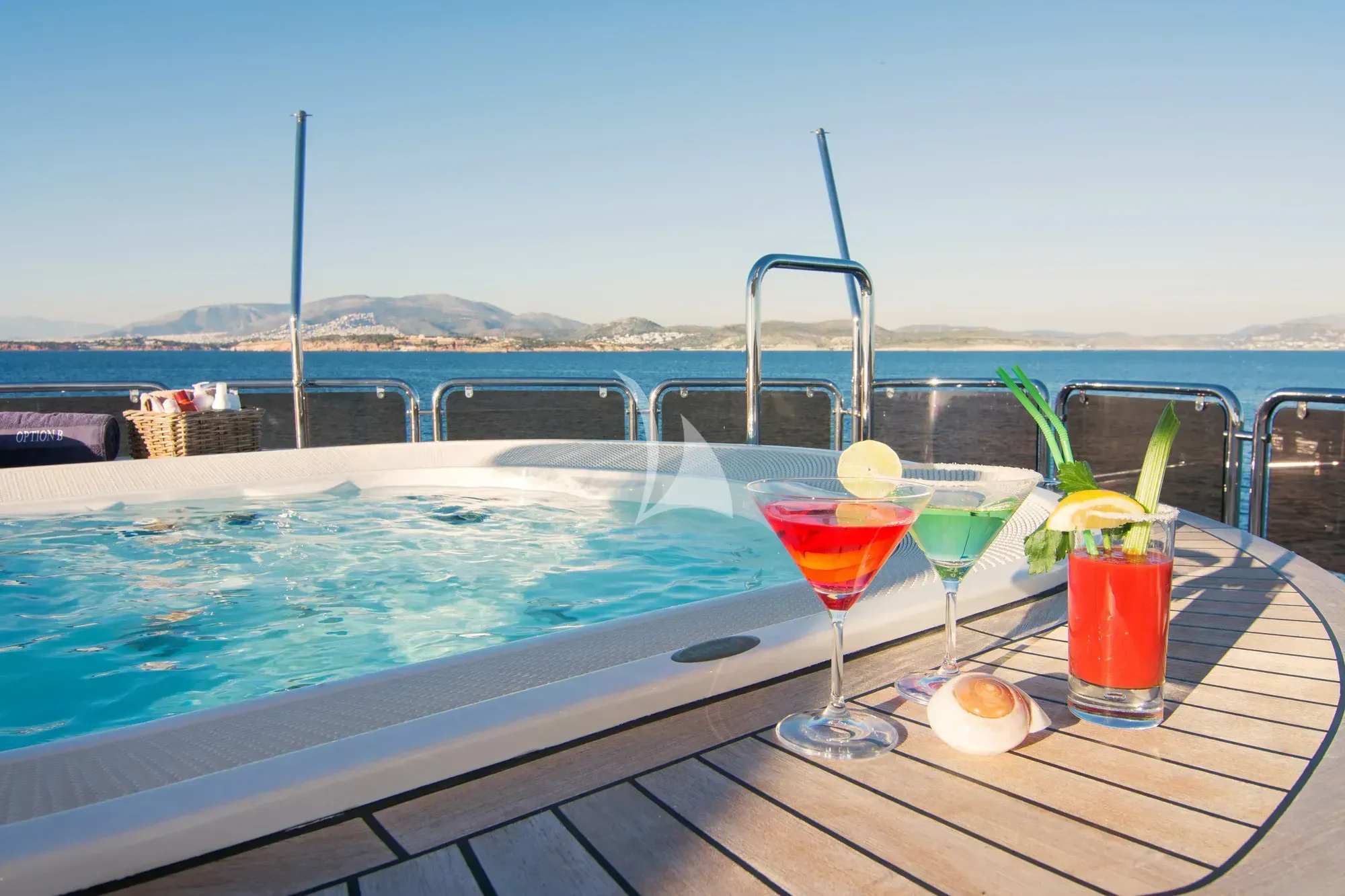 Every effort has been made to ensure guests can enjoy a luxury charter experience. OPTION B's interior features elegant styling and large windows. Guests can enjoy the utmost comfort while lounging in the plush comfort of the main salon and skylounge. There is also formal dining in the main salon. Out on deck, the generous, well-designed spaces continue. Attractions include the Jacuzzi on the sun deck, gym equipment, and plenty of space to dine and relax.