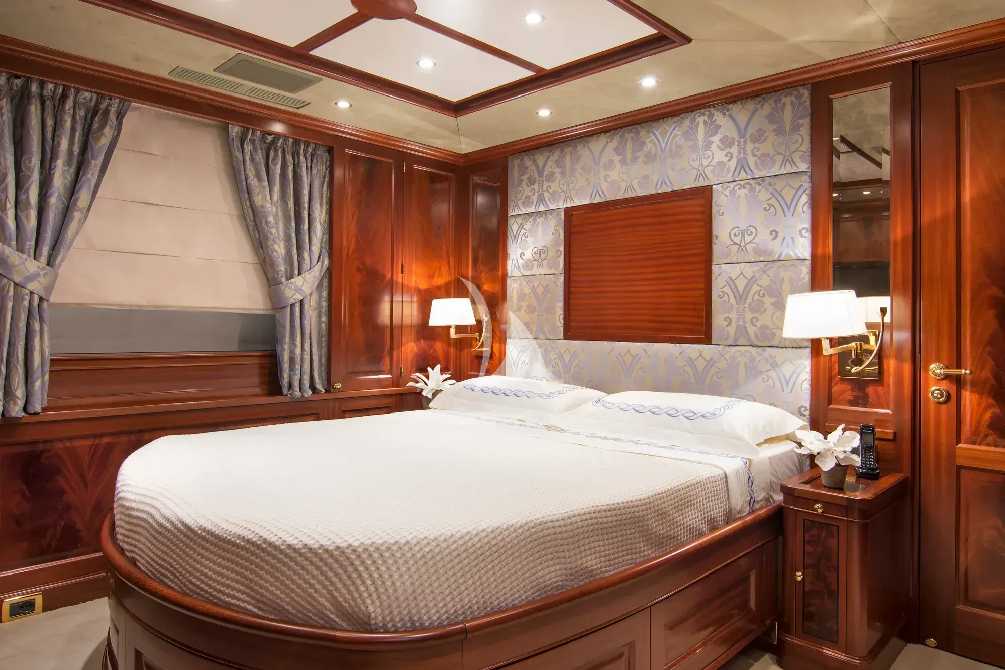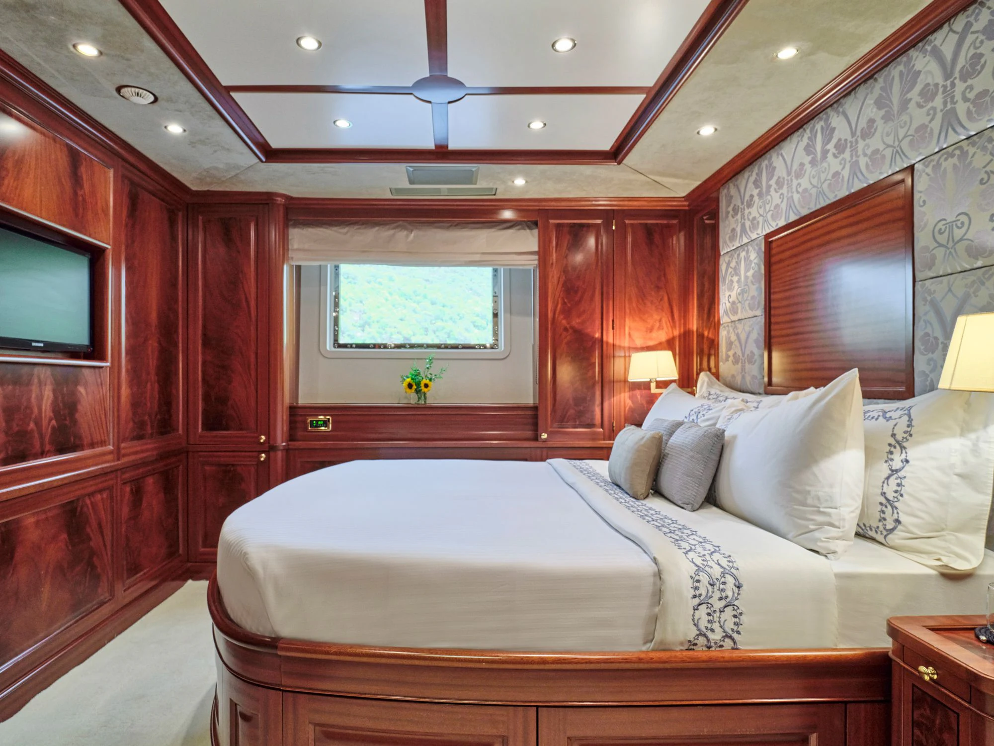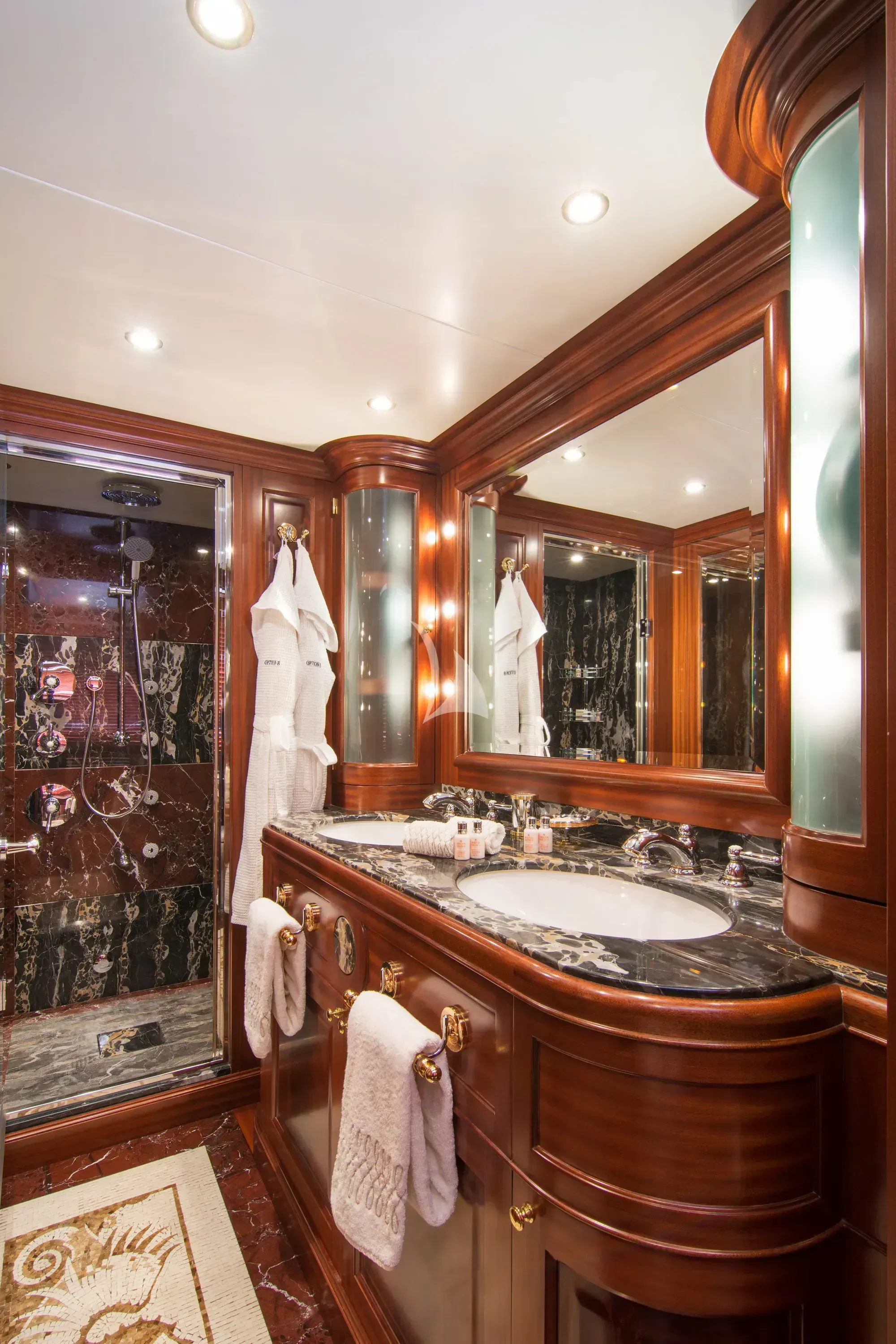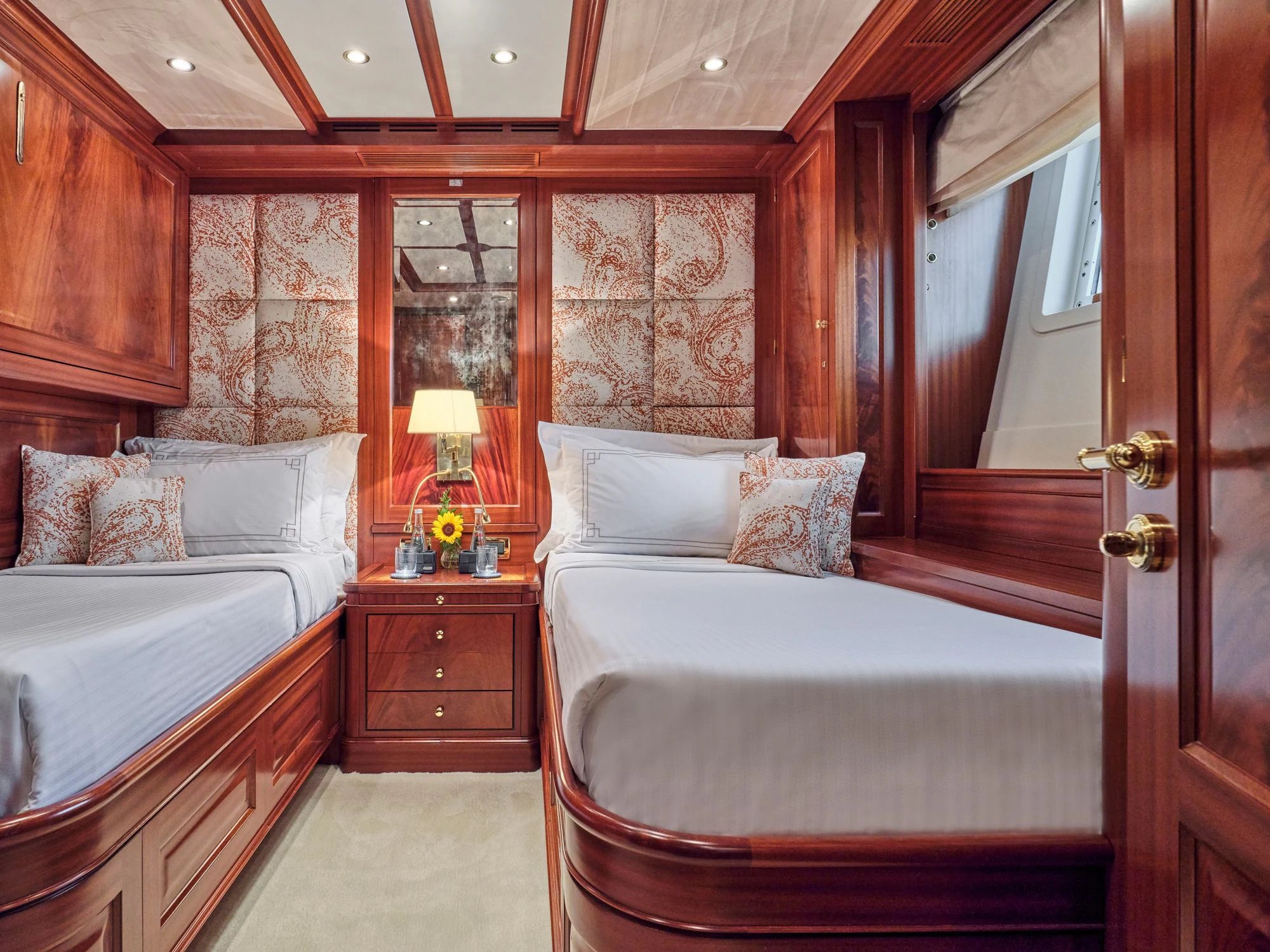 Luxury charter yacht OPTION B's six guest staterooms include a king-sized master on the main deck, complete with an en-suite and a sauna. On the upper deck, an en-suite VIP stateroom is similarly appointed with a sauna and a queen-sized bed. There are also two double and two twin cabins on the lower deck.